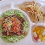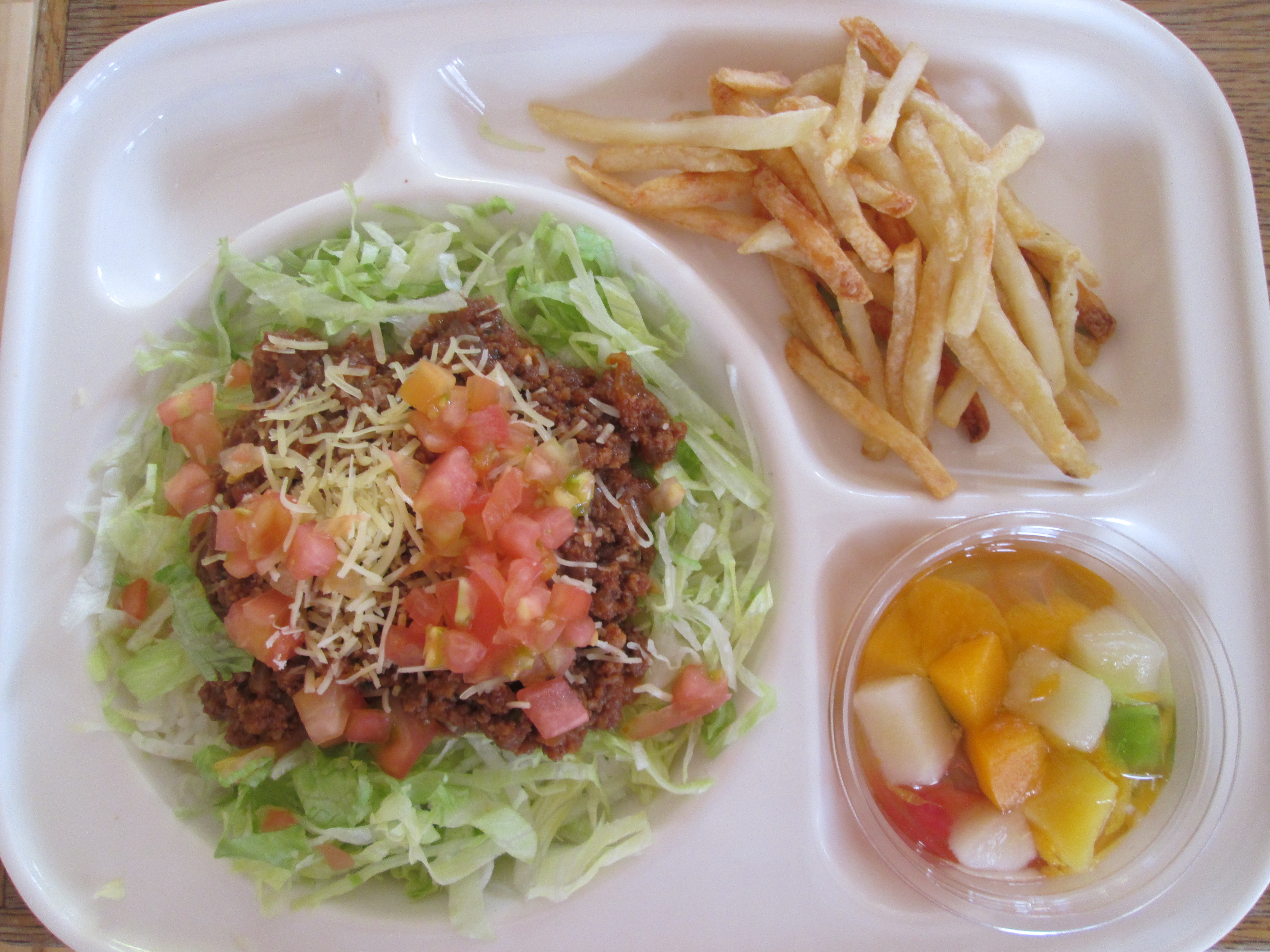 楽しみにしていた給食は、タコライス、フライドポテト、コンソメスープ、フルーツカクテルと子ども達の大好きなメニューでした。お腹一杯いただきました。