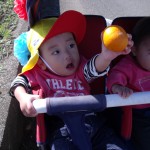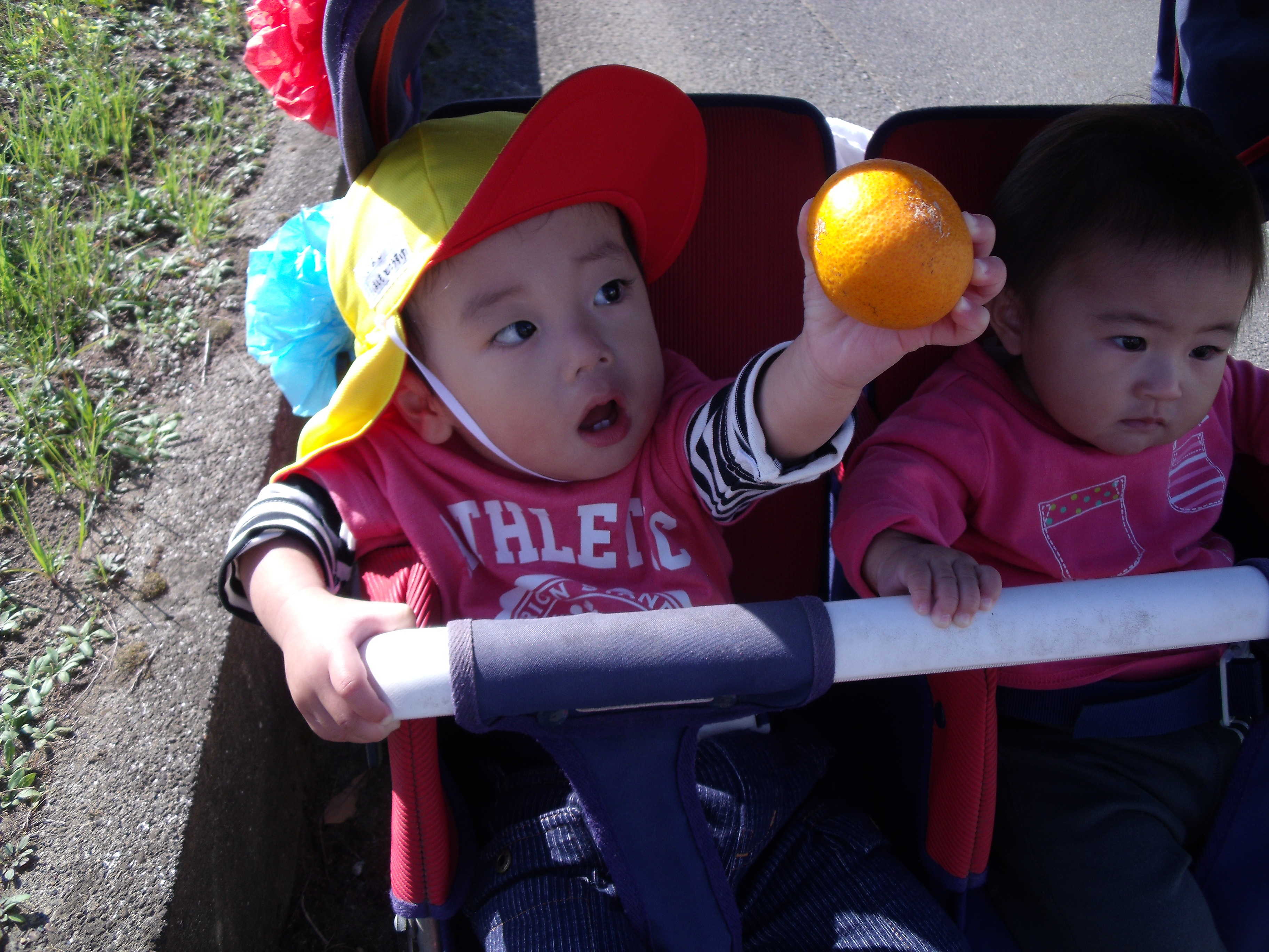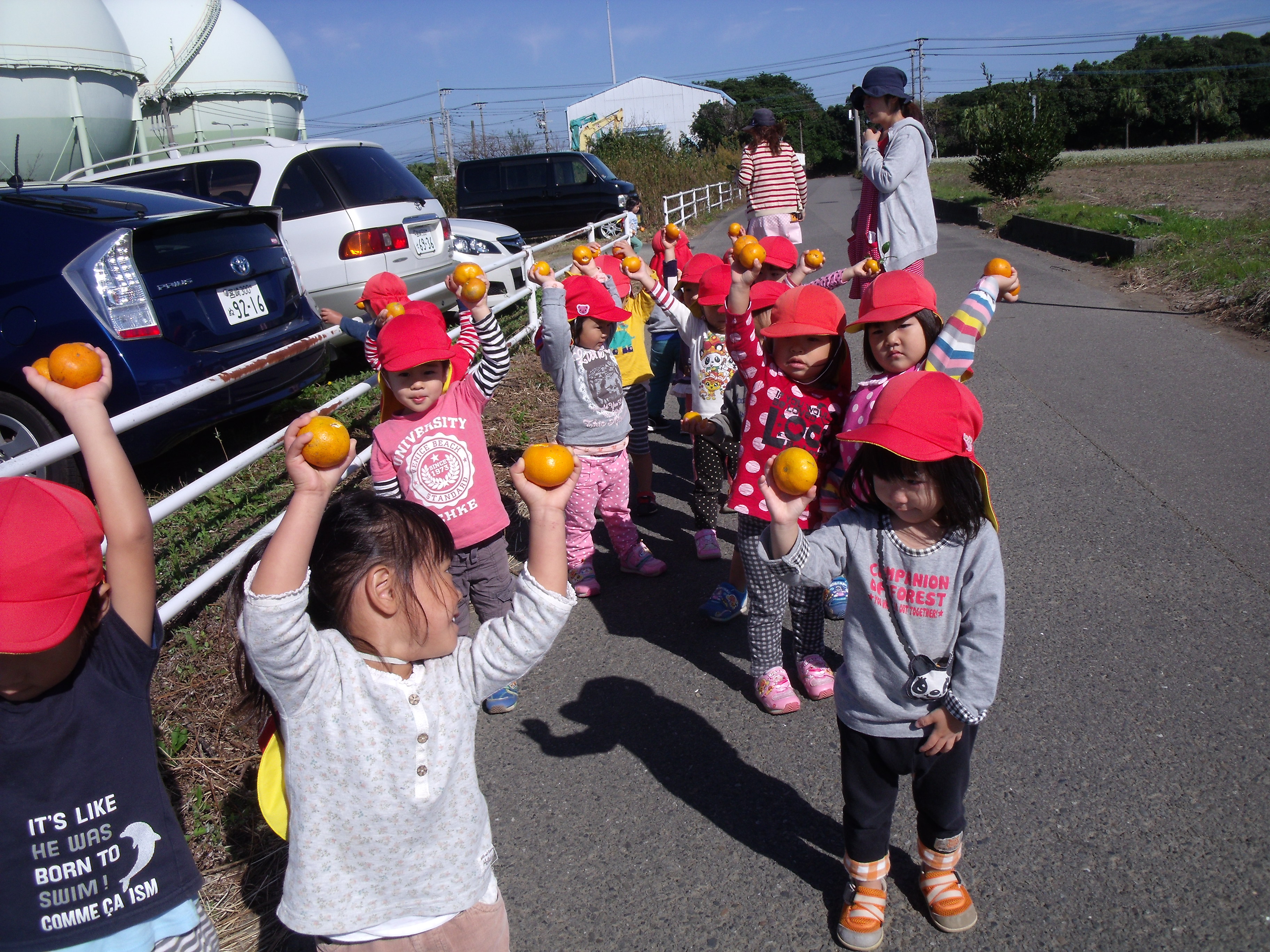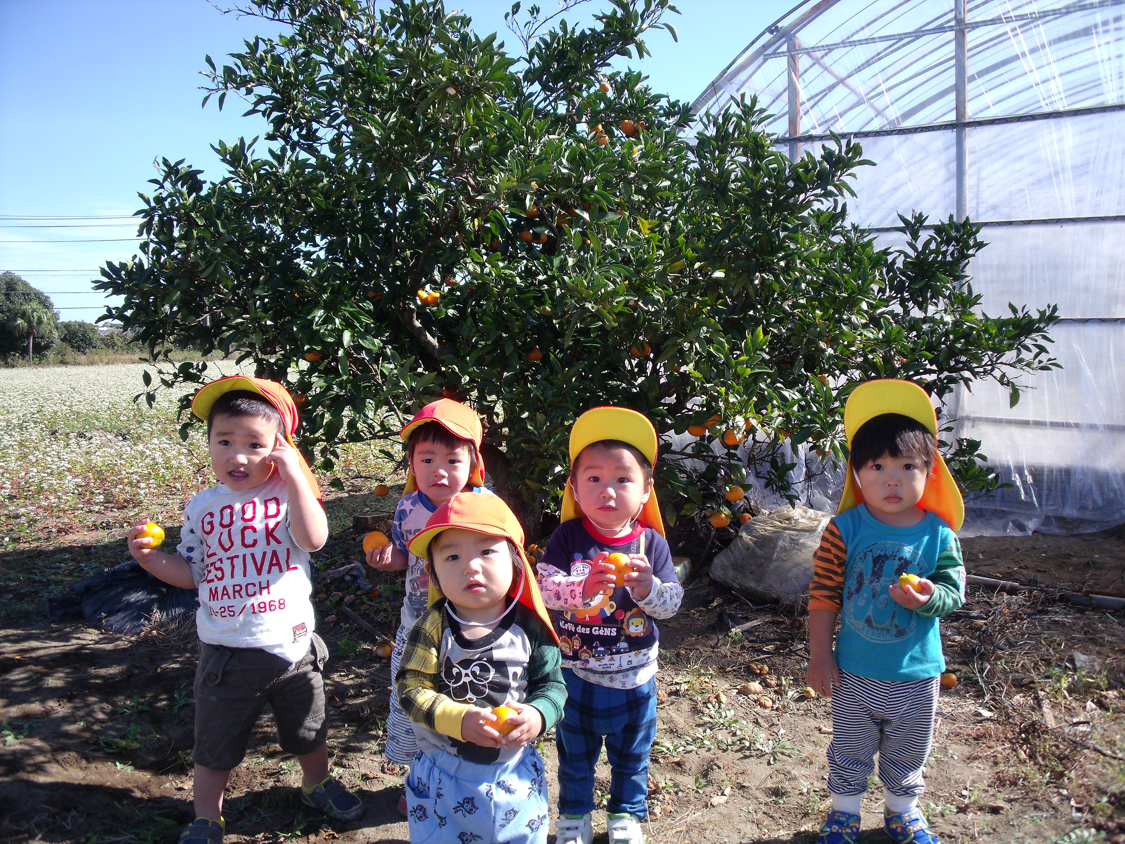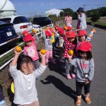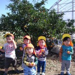 みかん狩り 10月23日(木) 未満児さんが、園周辺にお散歩へ出かけました。 ハウスの前を通りかかったら、「みかんをちぎっていきなさ~い」と誘われ、急遽みかん狩り体験をさせていただきました。 たわわに実ったみかんは、あっという間に子ども達の手の中へ・・・「とったど~!」大喜びで持って帰り、秋の味覚を口いっぱいにほおばりました。とっても甘くて美味しいみかんでした。