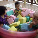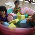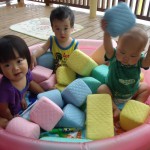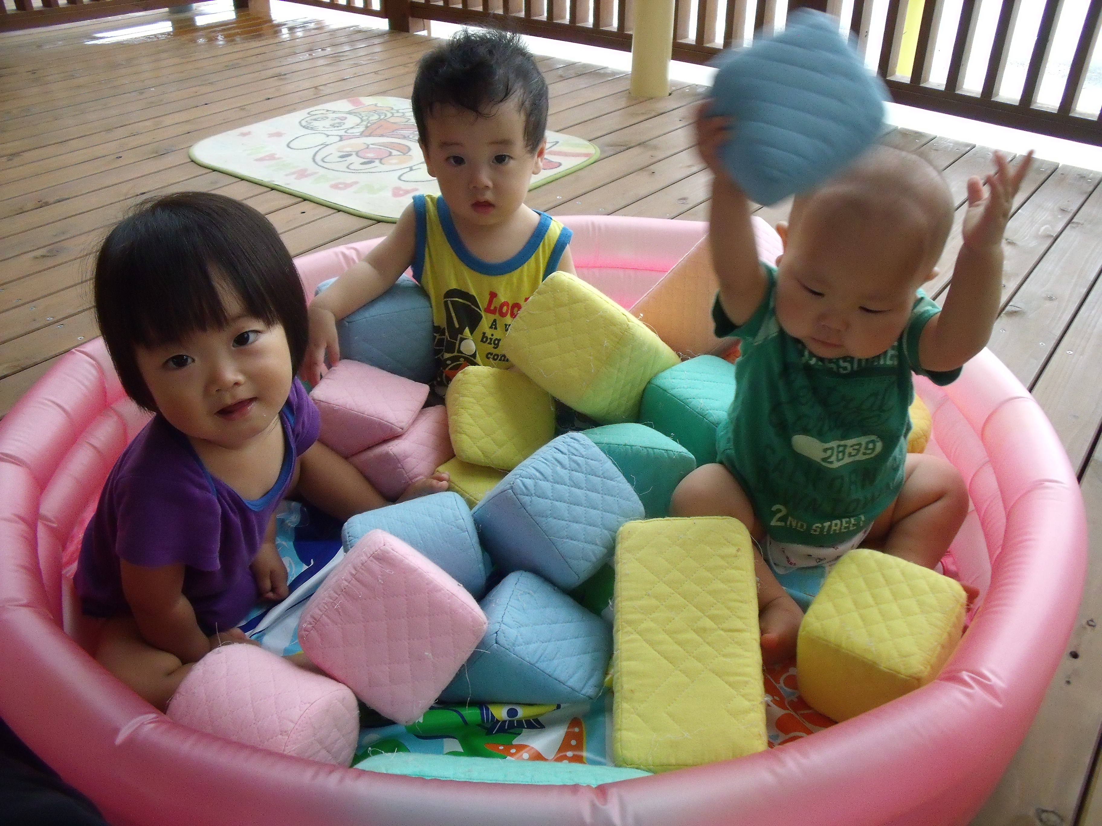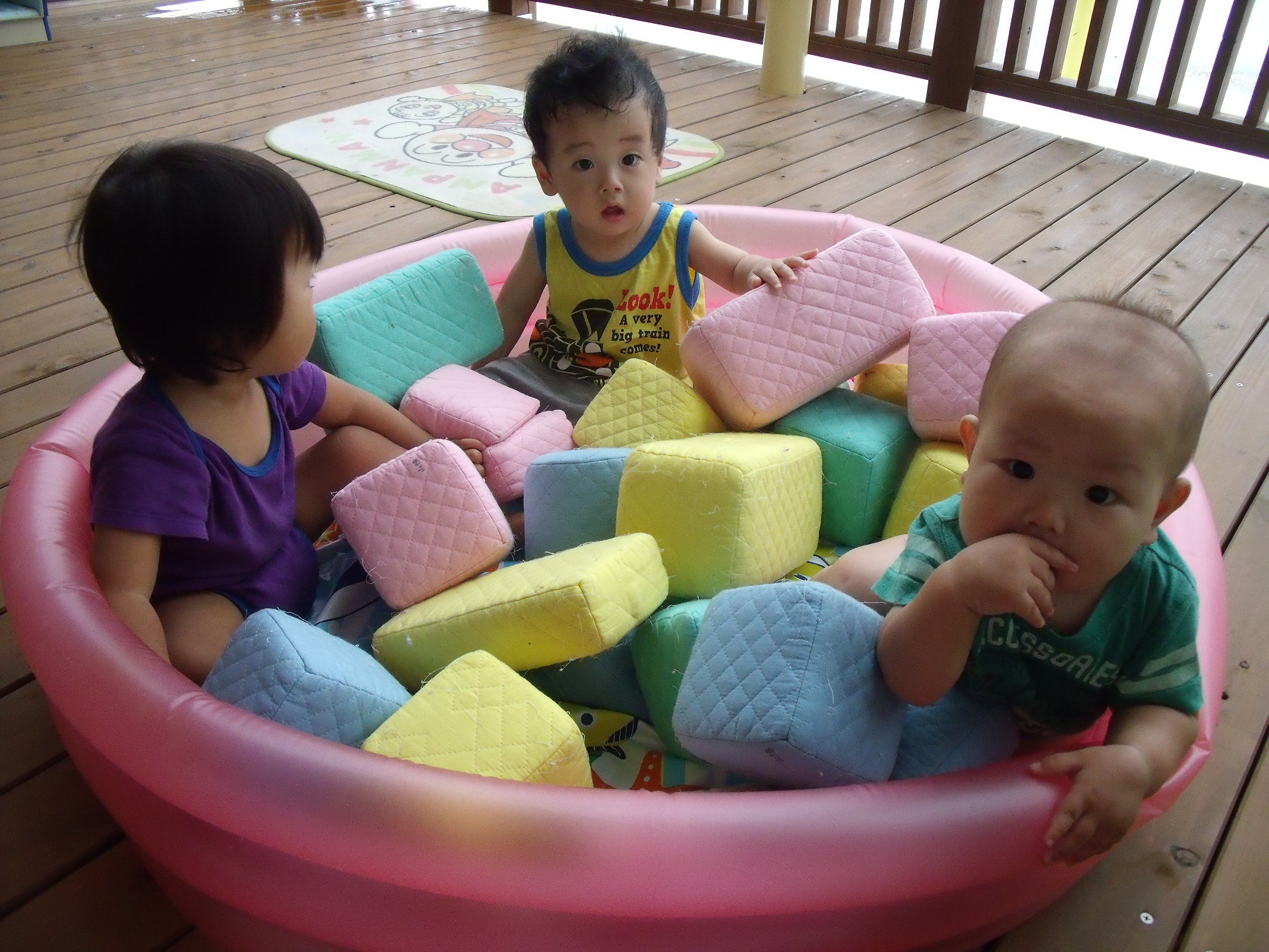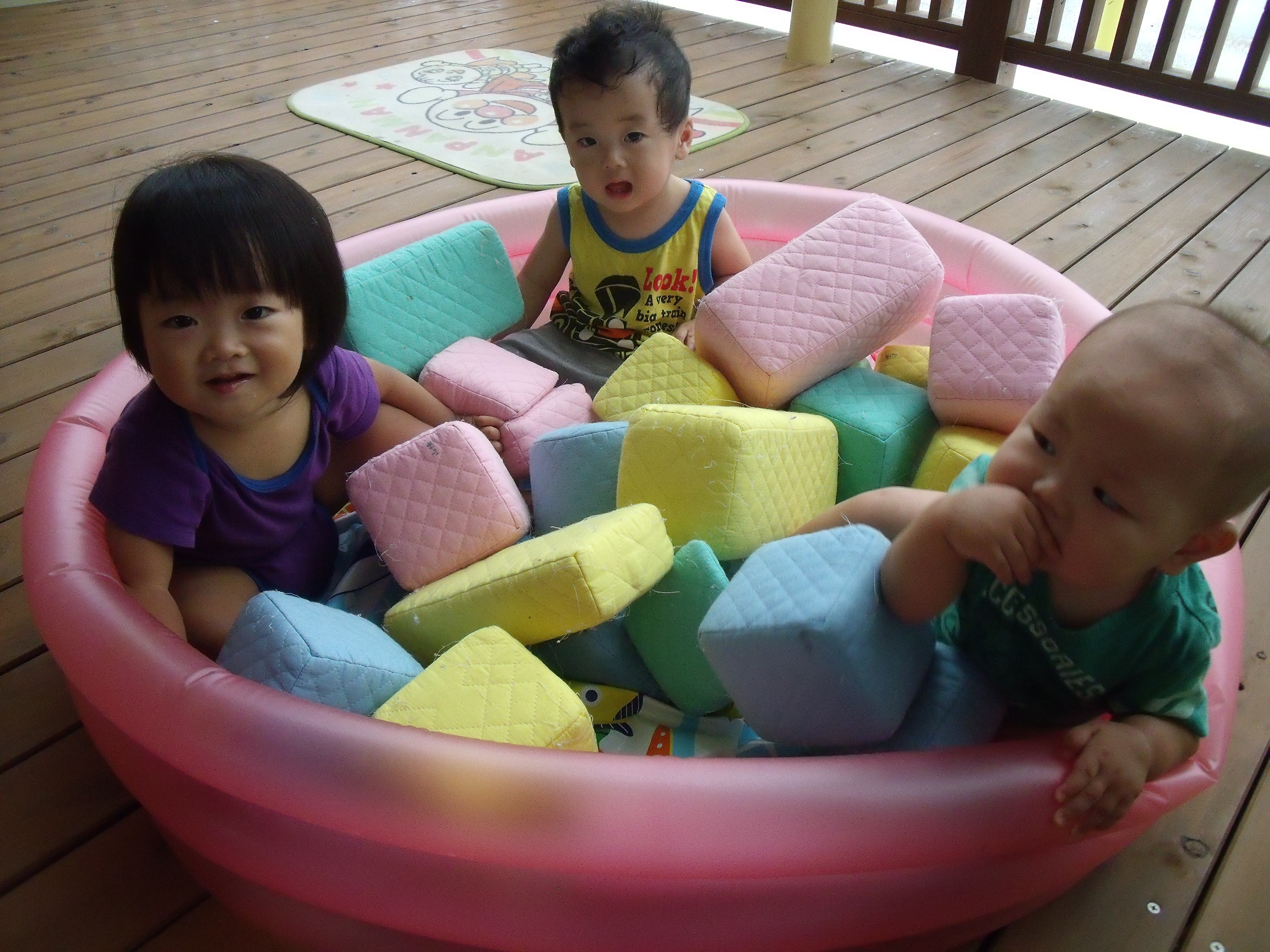 ひよこ組さんは体調不良の子どもが多かったので水遊びができず、ソフト積み木を水にみたてエアプールあそびを行いました。