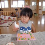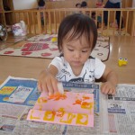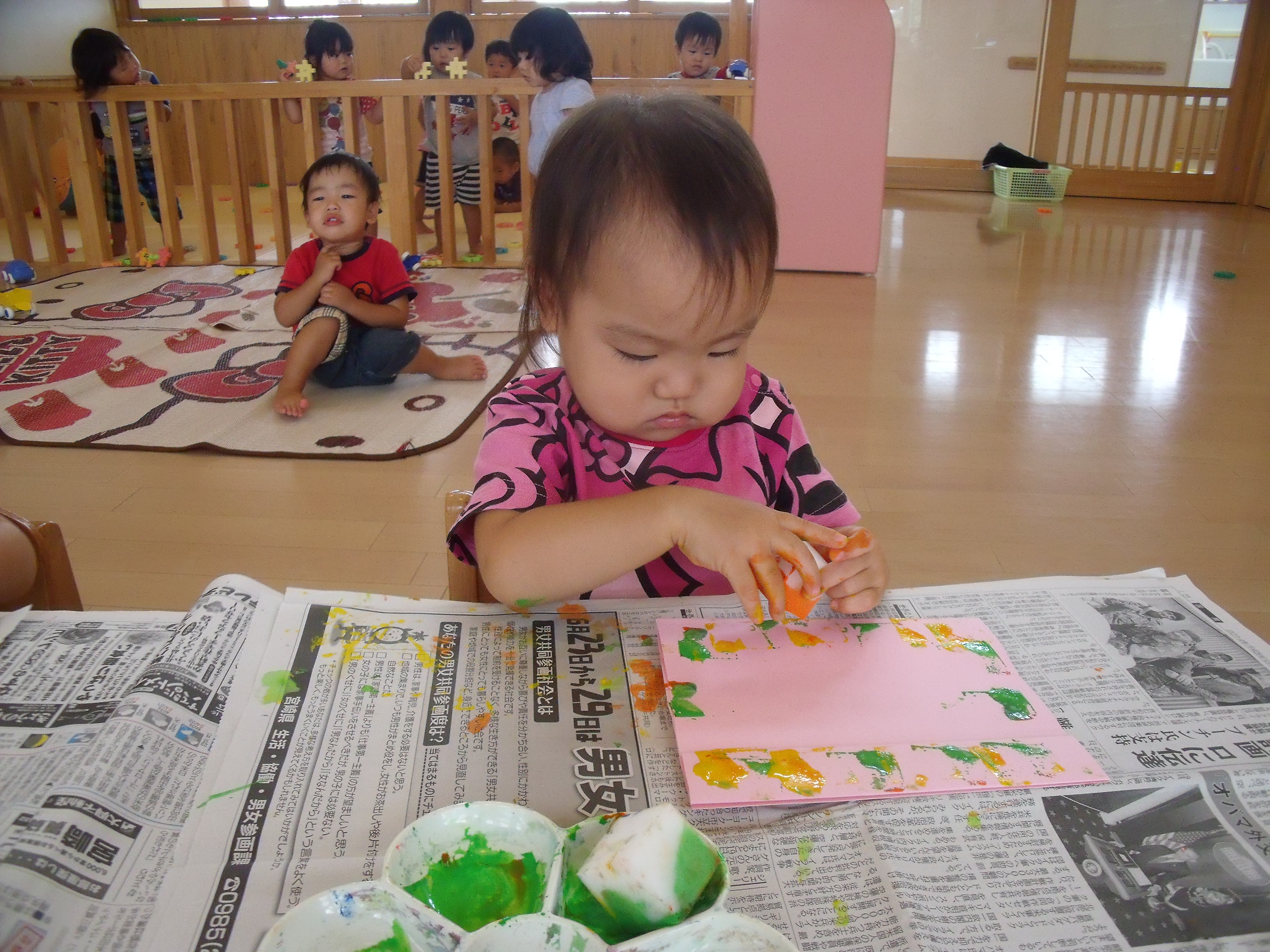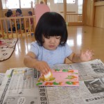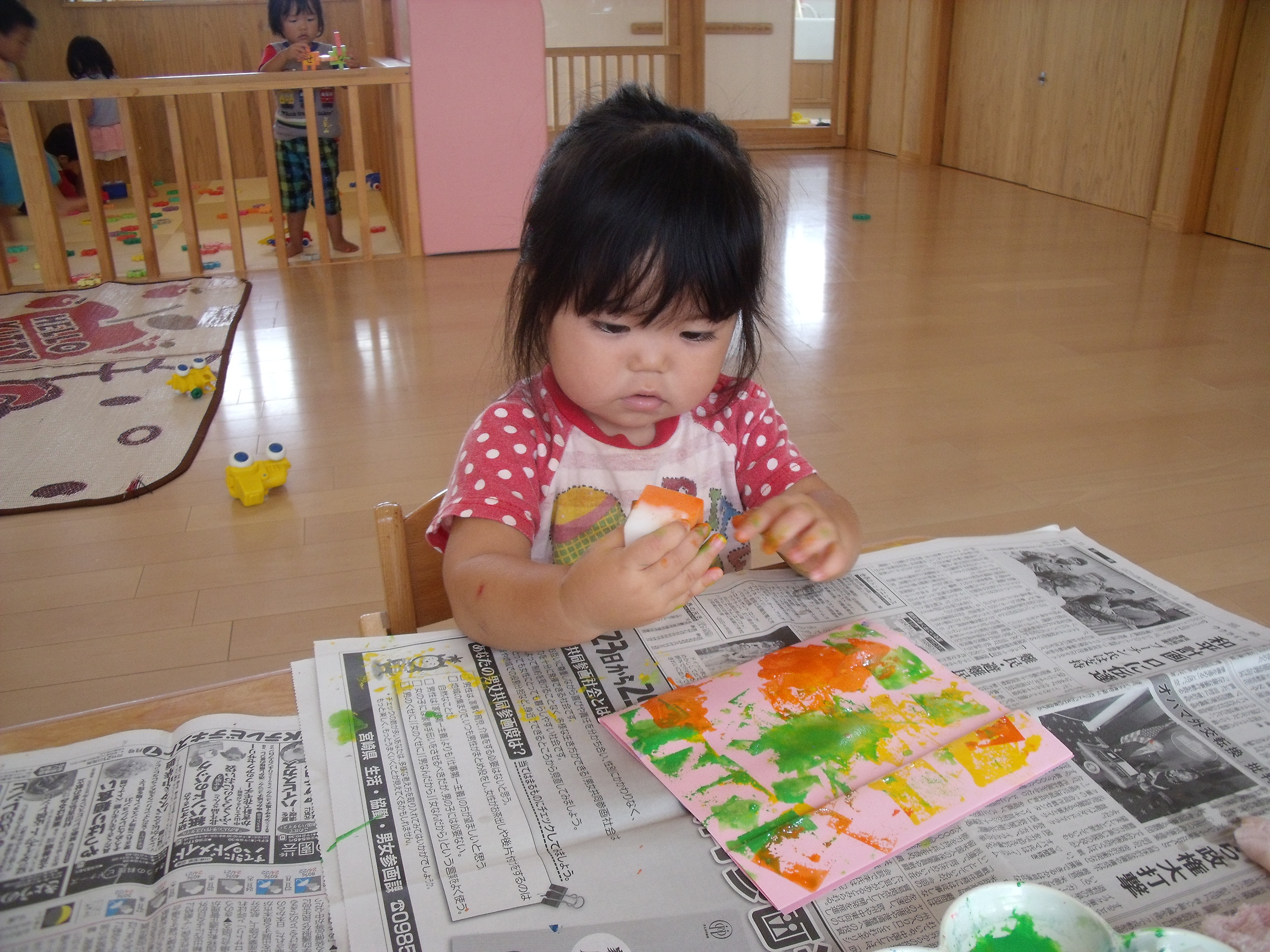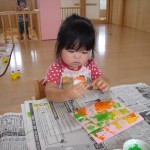 色々な絵の具をつけて、カラフルな作品が出来上がりました。