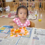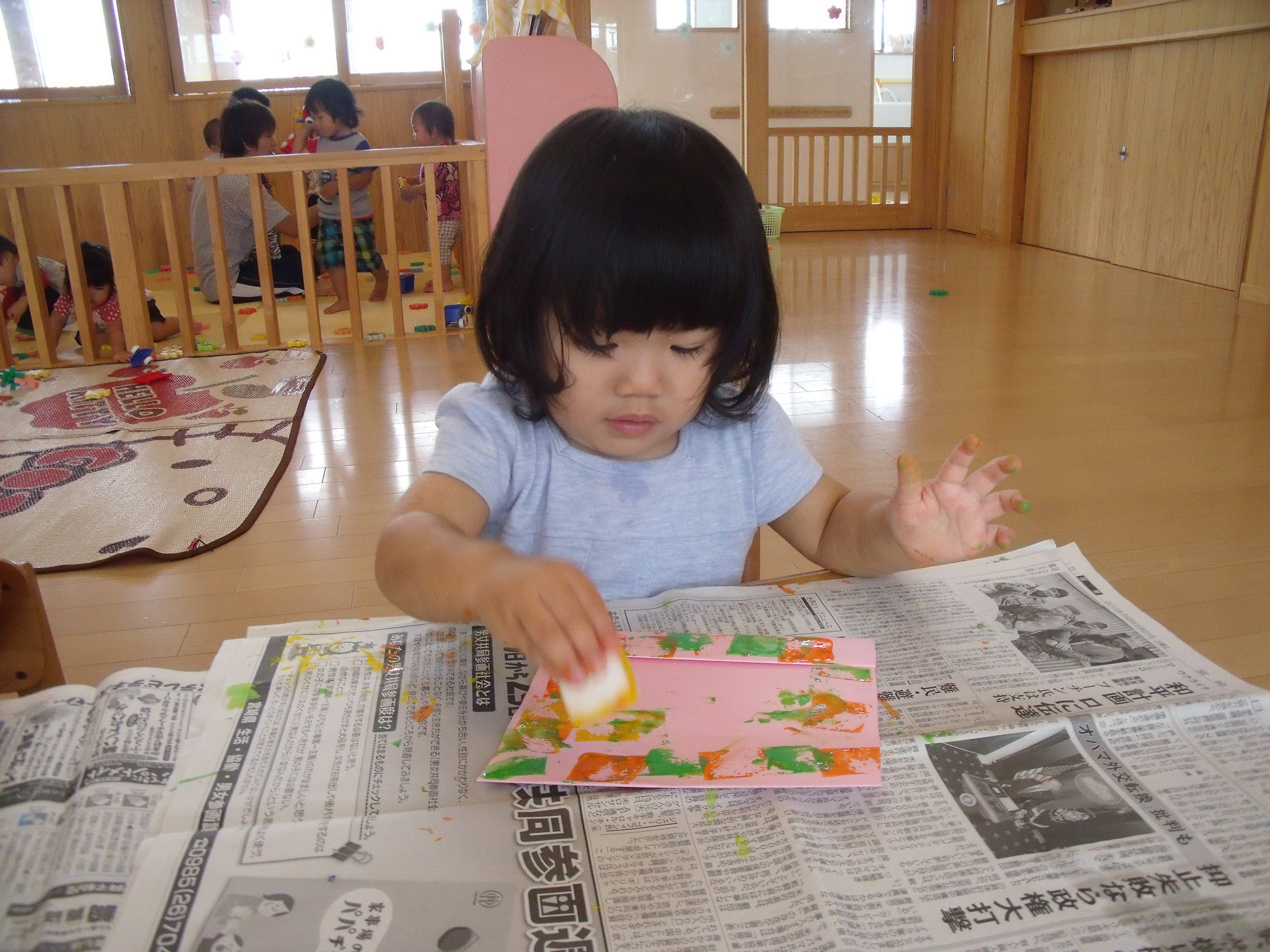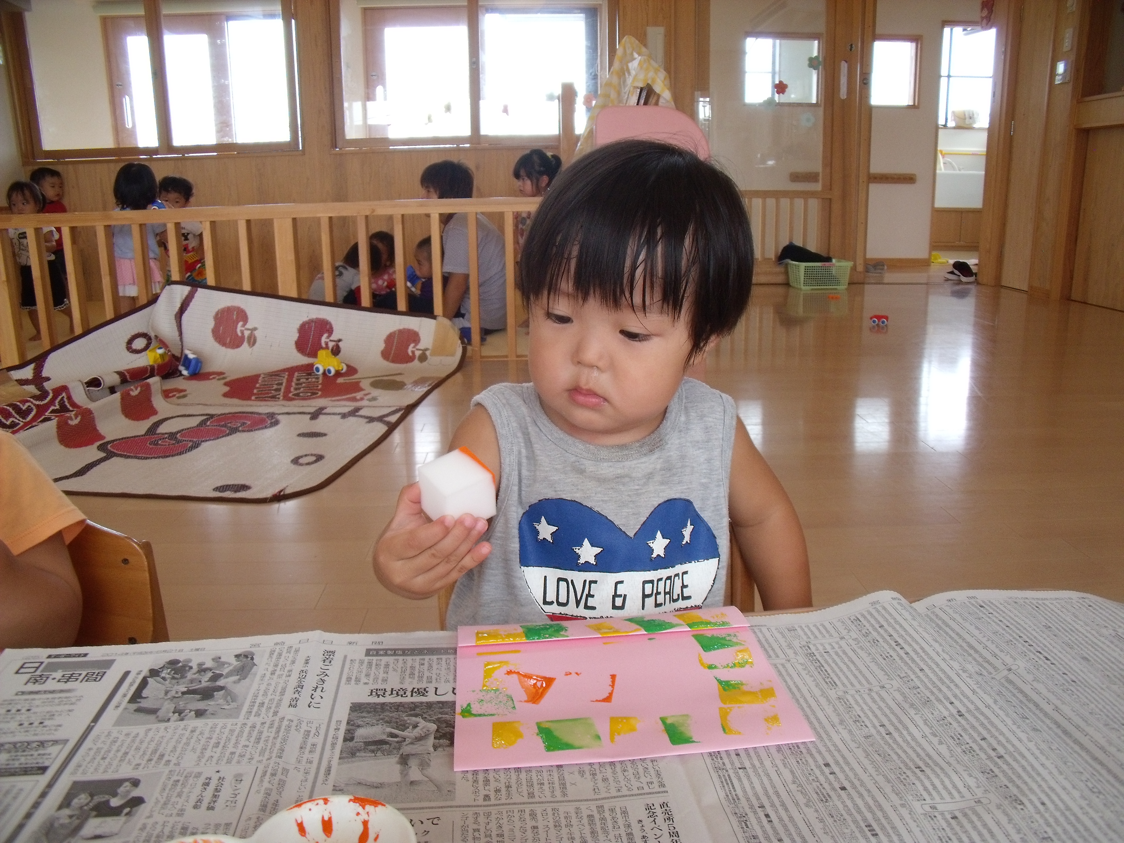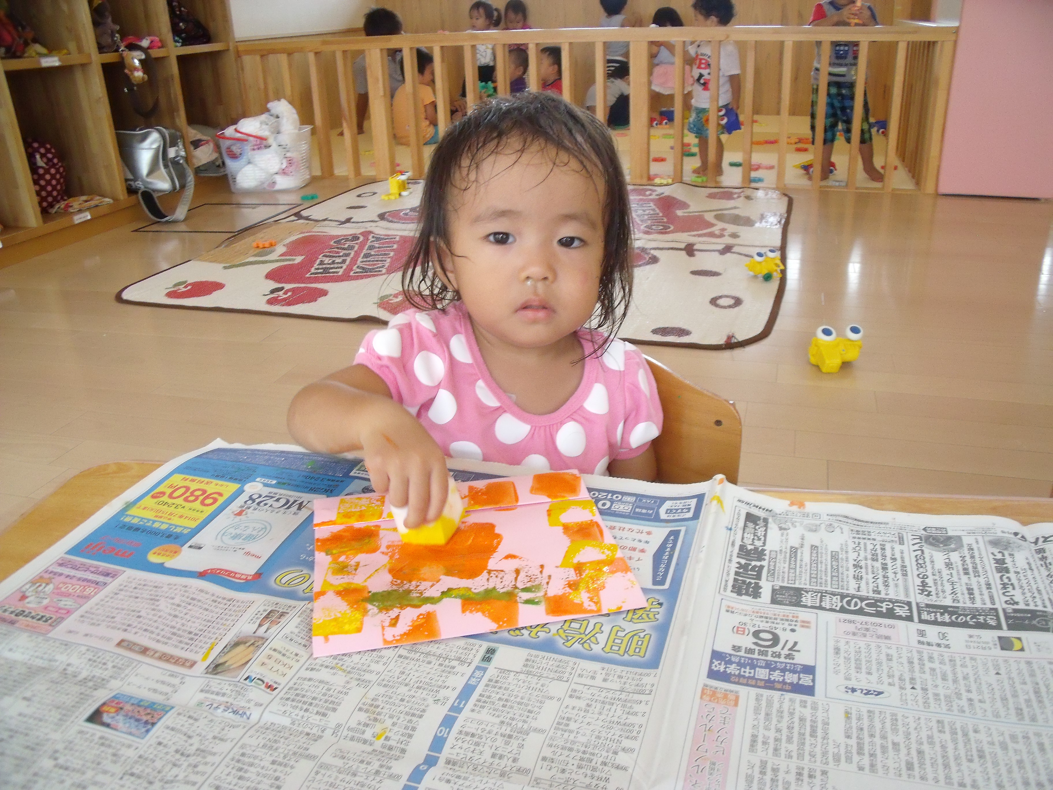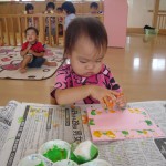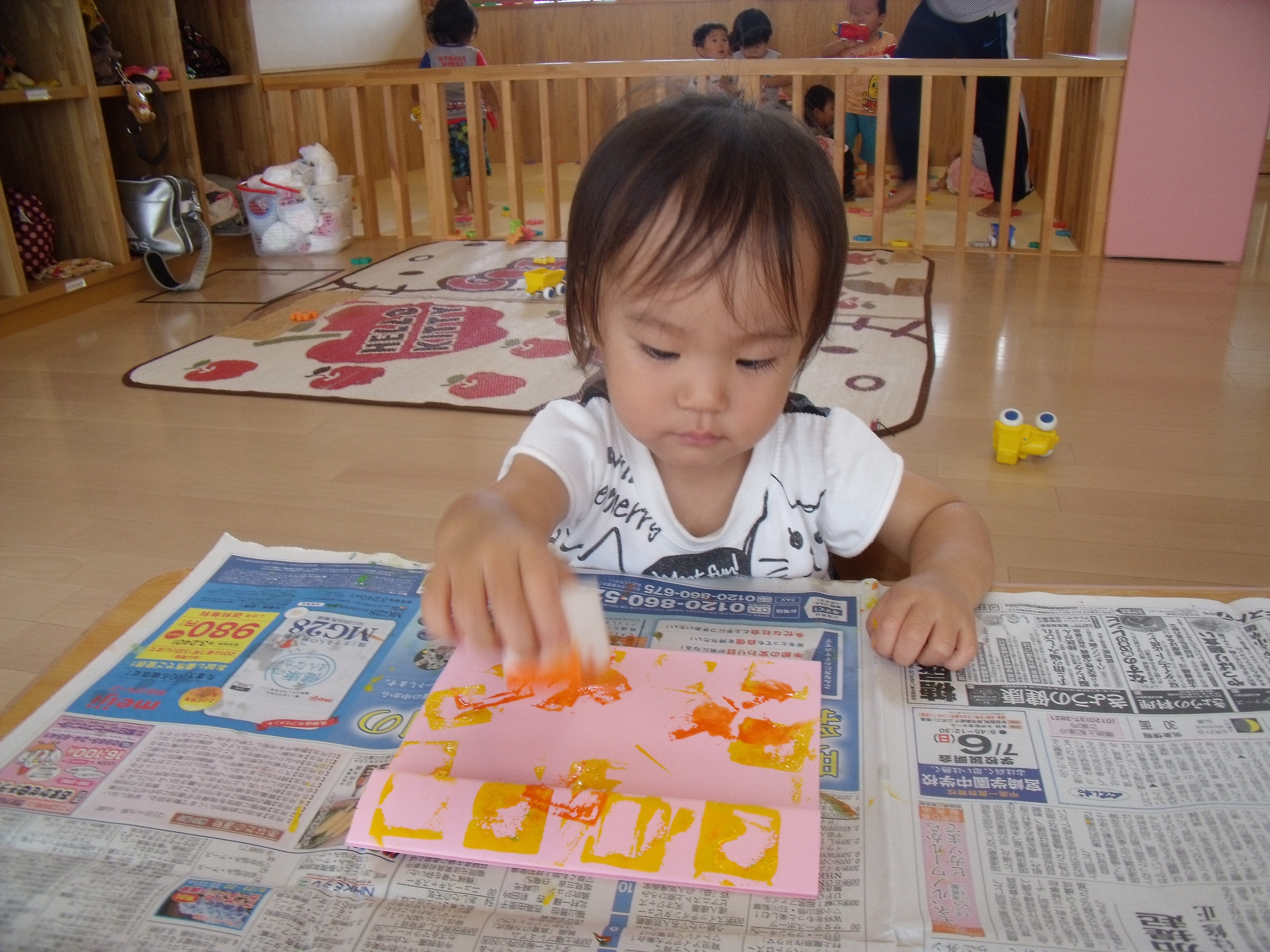 スポンジに絵の具をつけて・・・ポンポンポン。