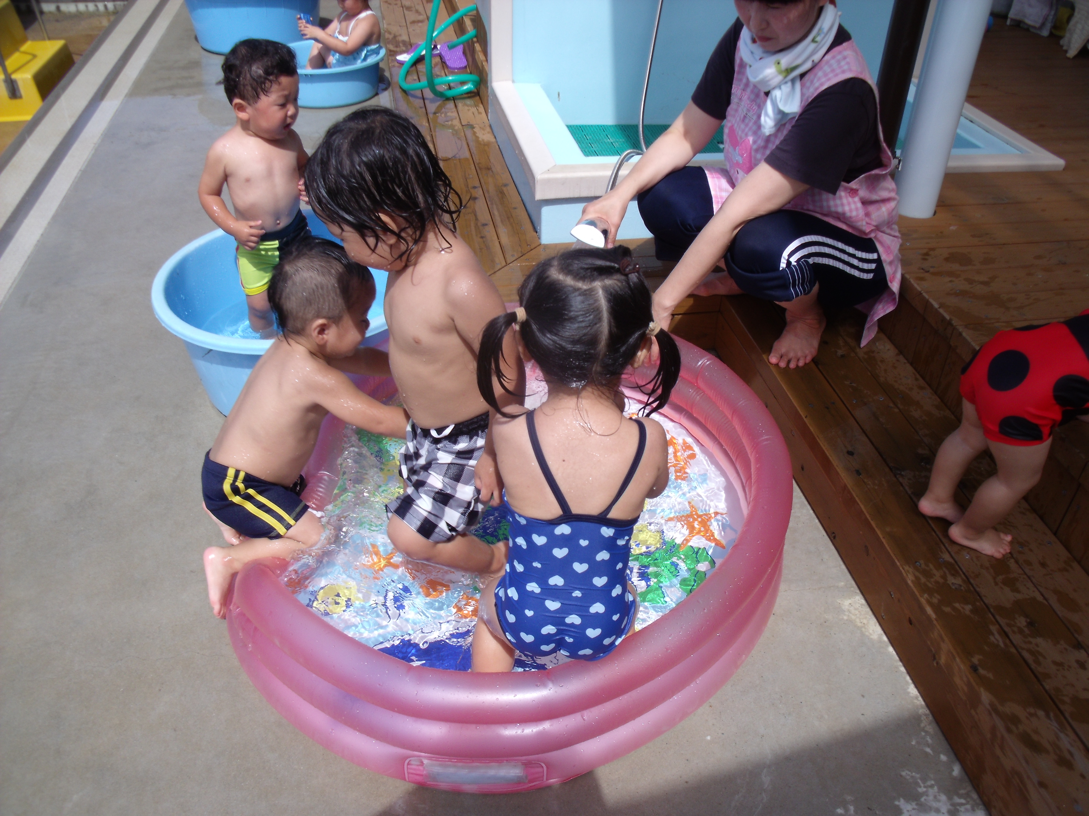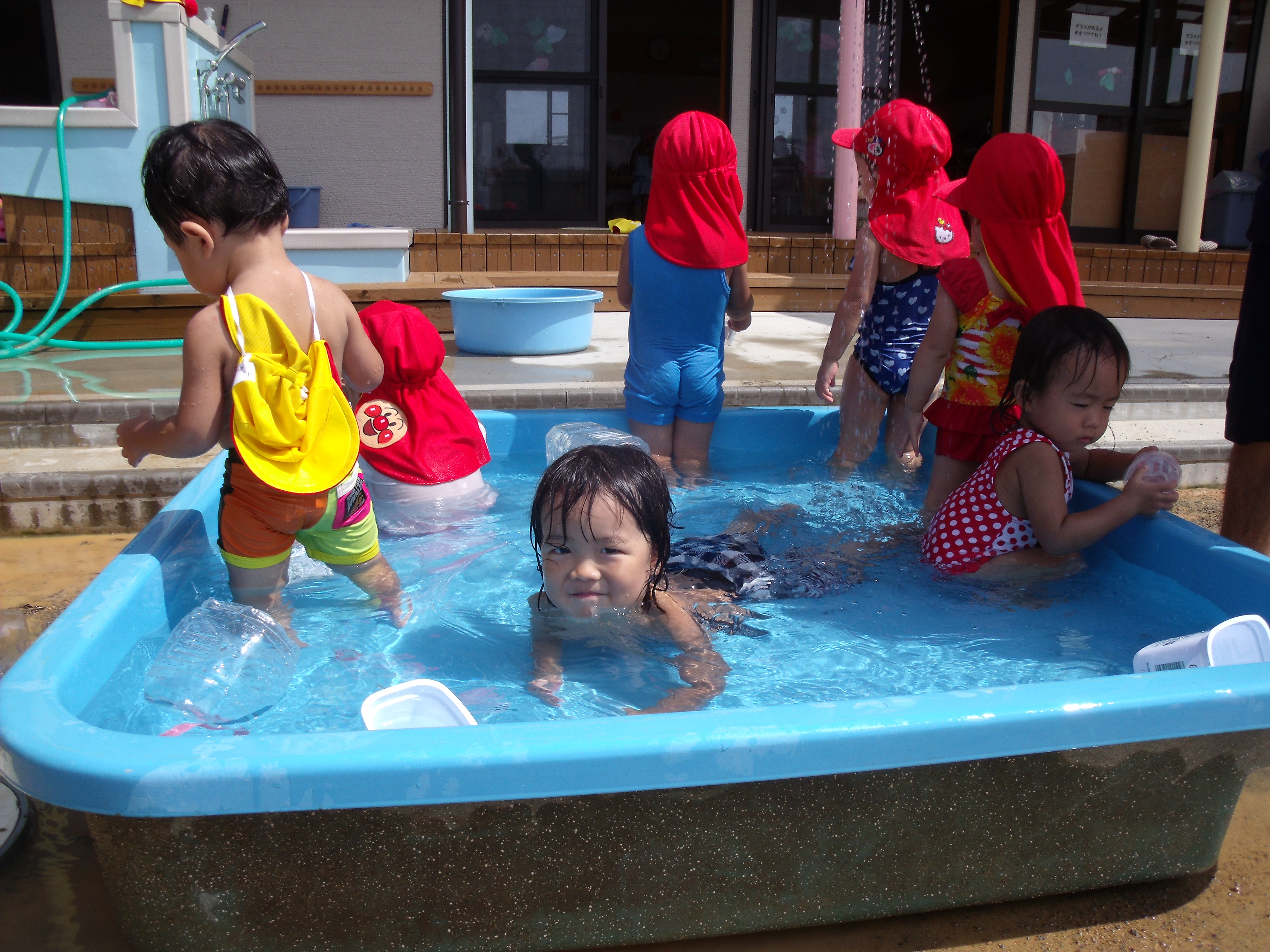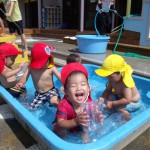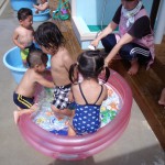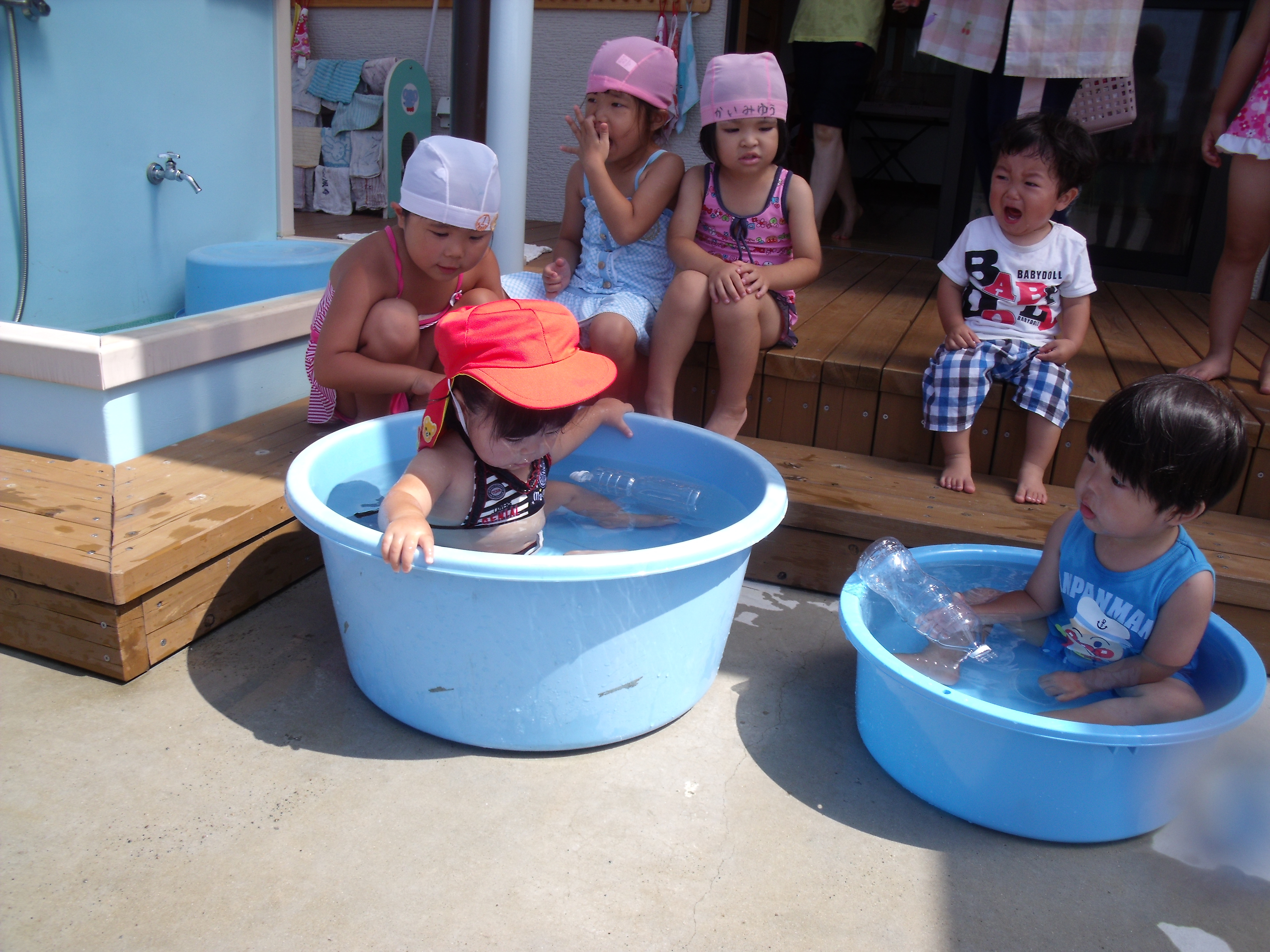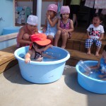 ちょっと狭いから、ビニールプールやタライの中にも入っちゃえ~! 水遊びは楽しいね♪