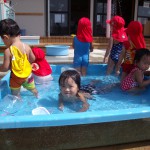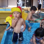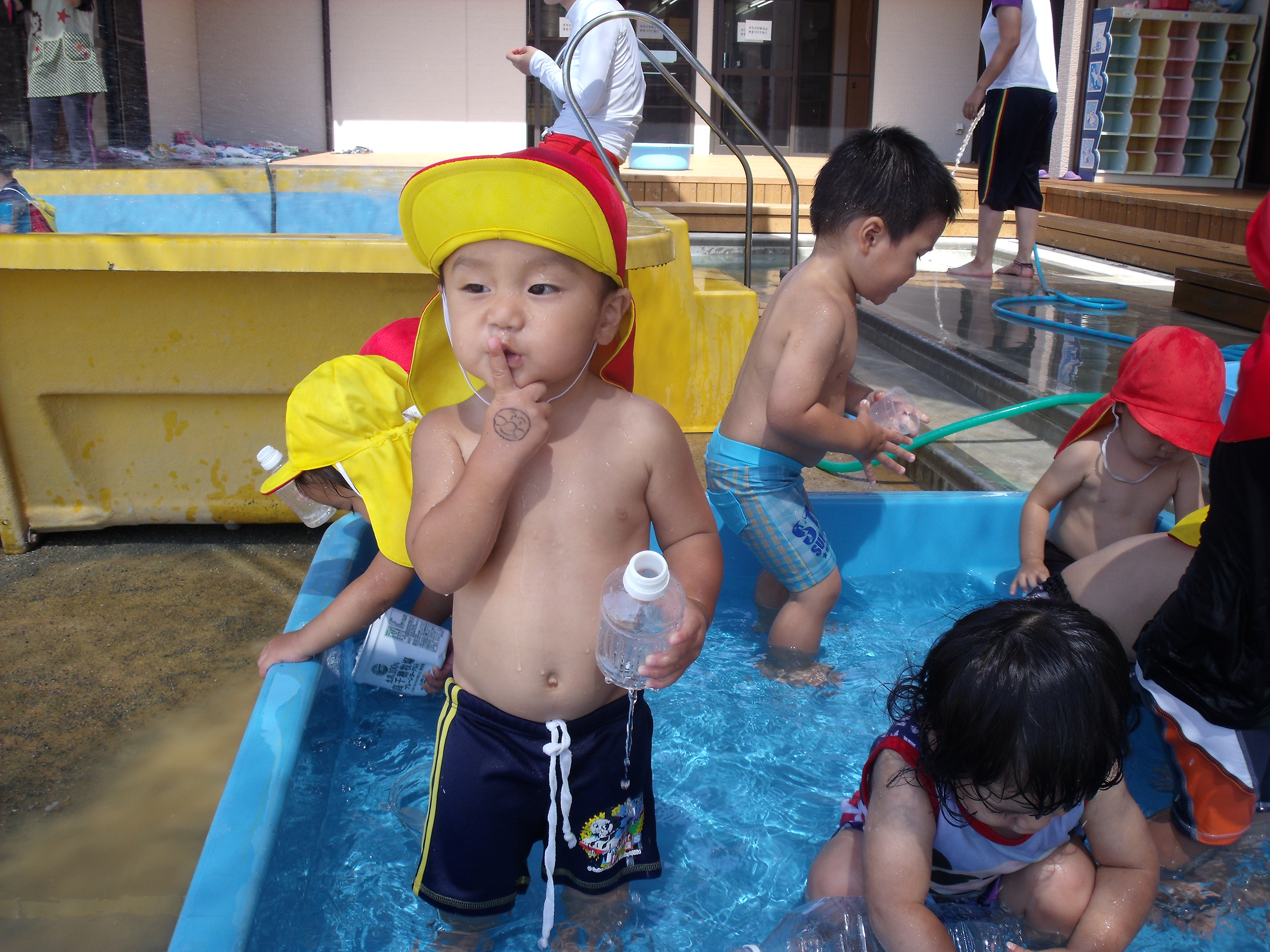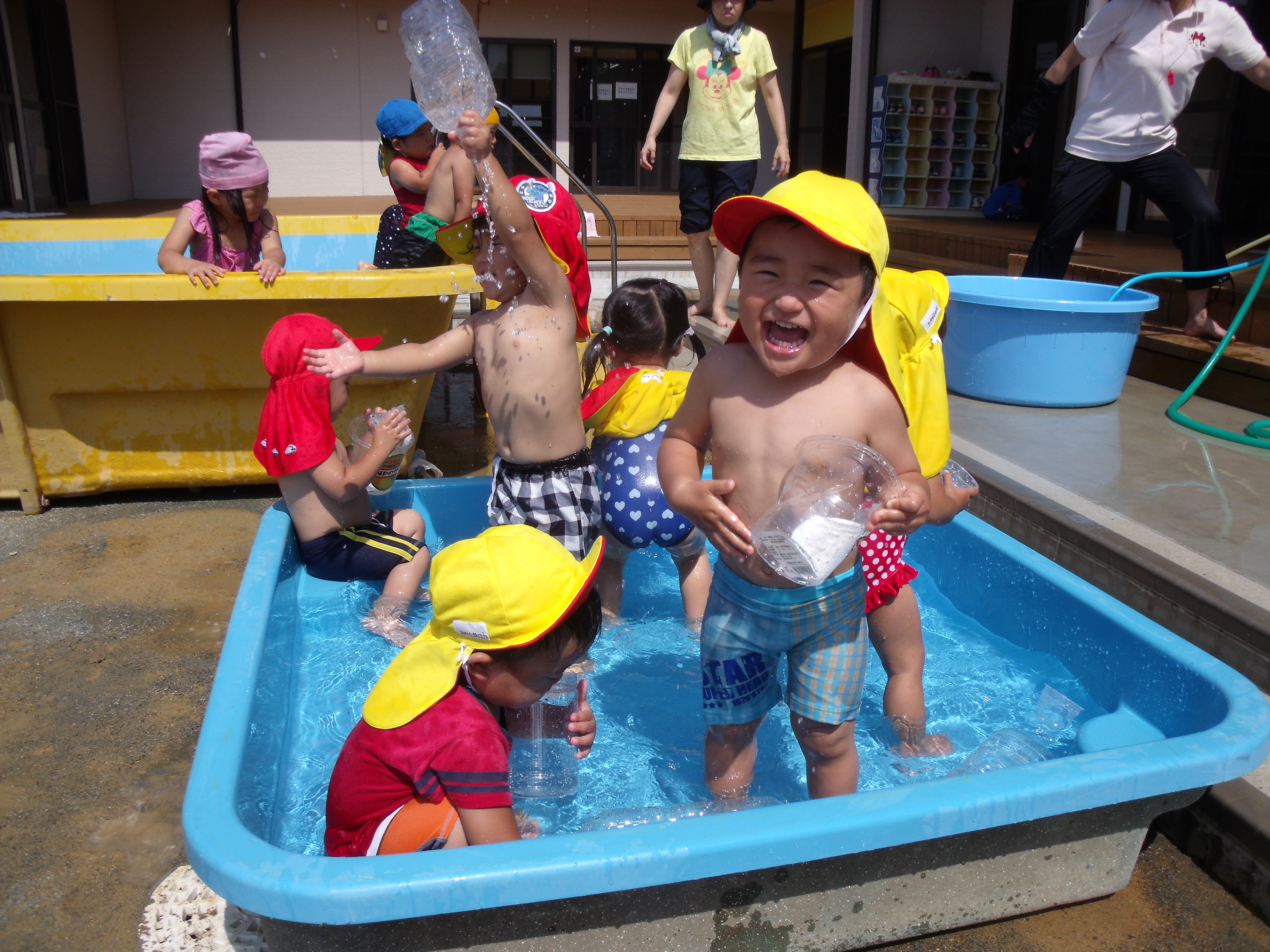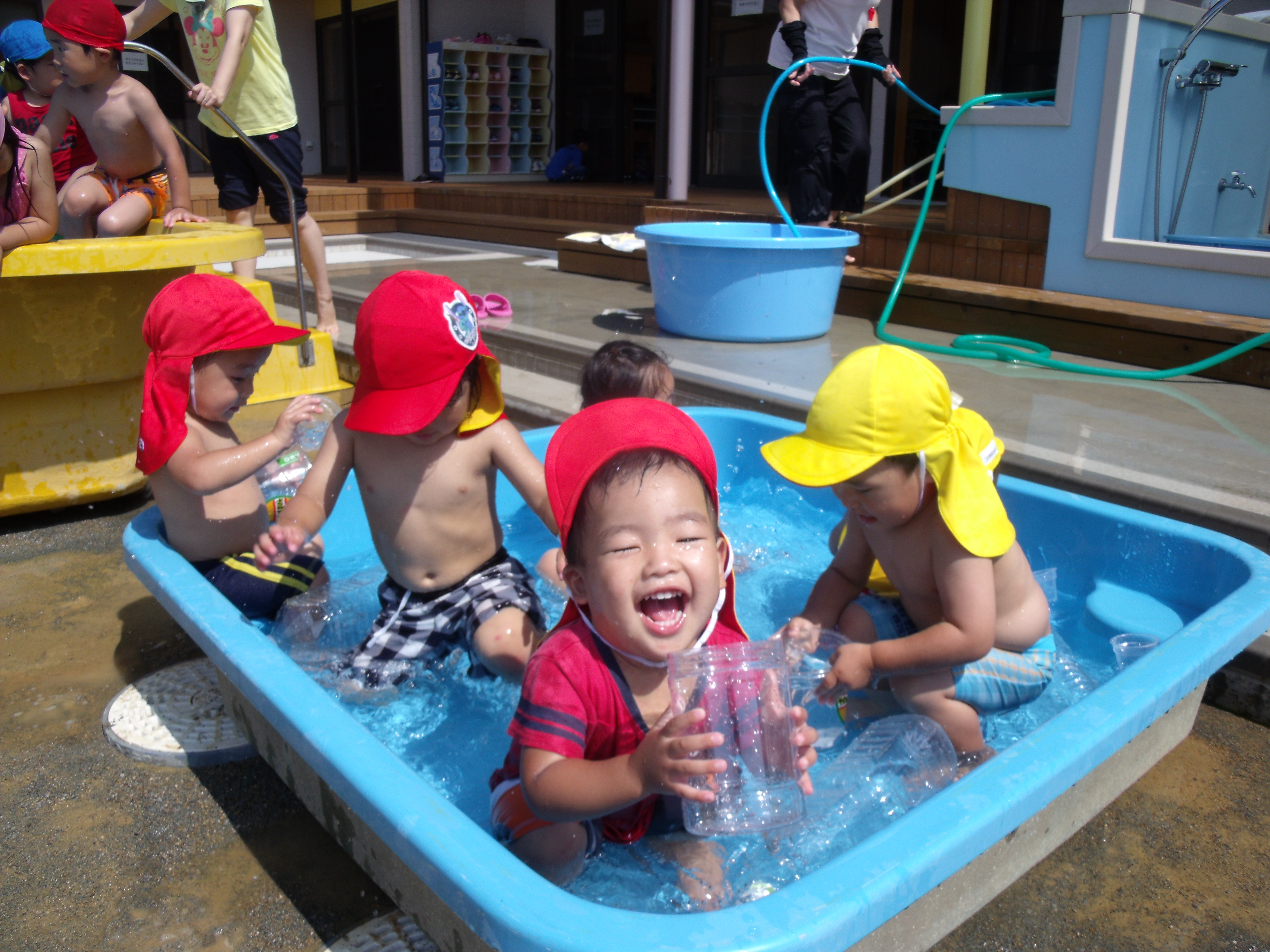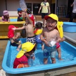 ちょっと狭いから、ビニールプールやタライの中にも入っちゃえ~! 水遊びは楽しいね♪