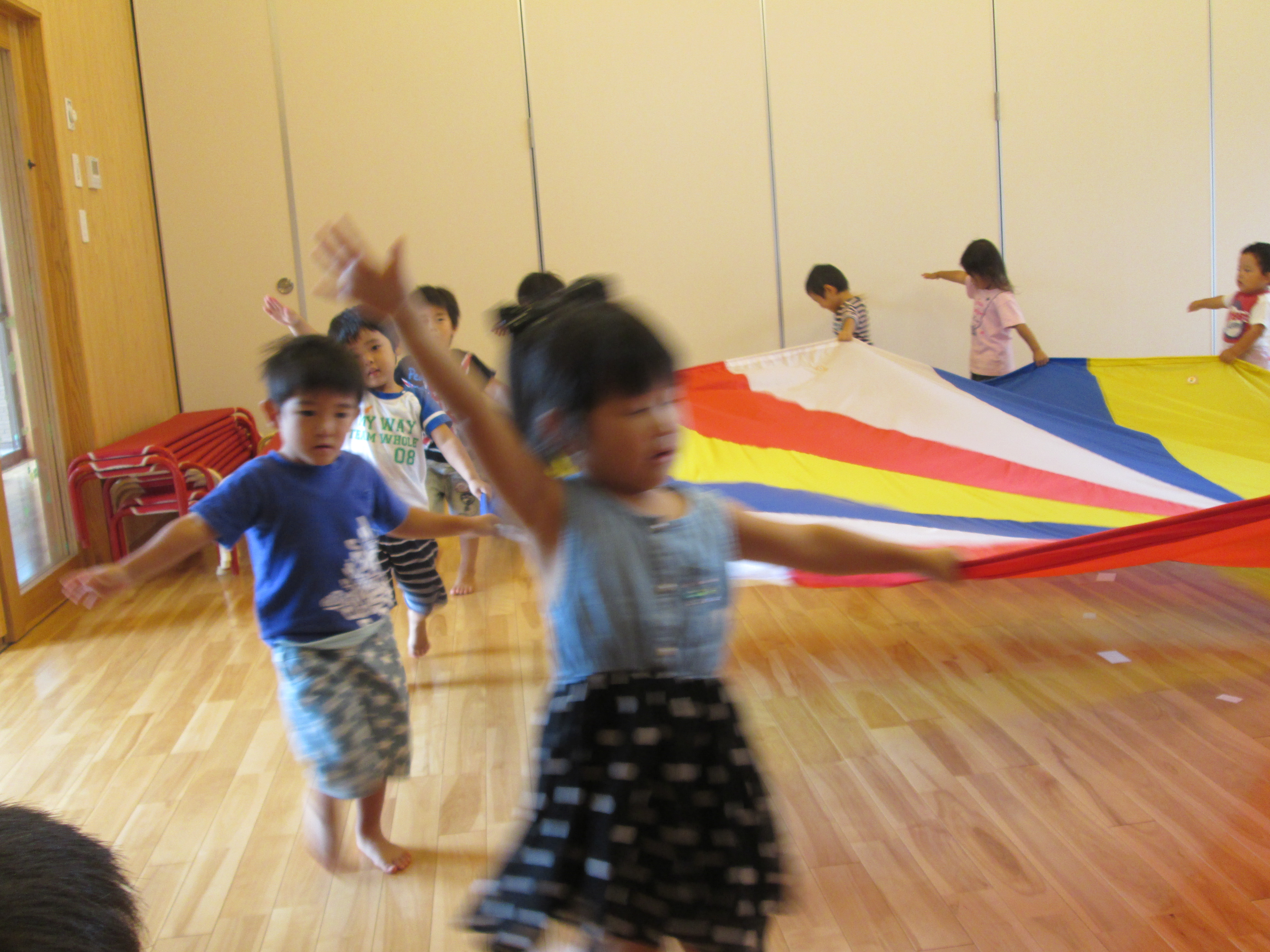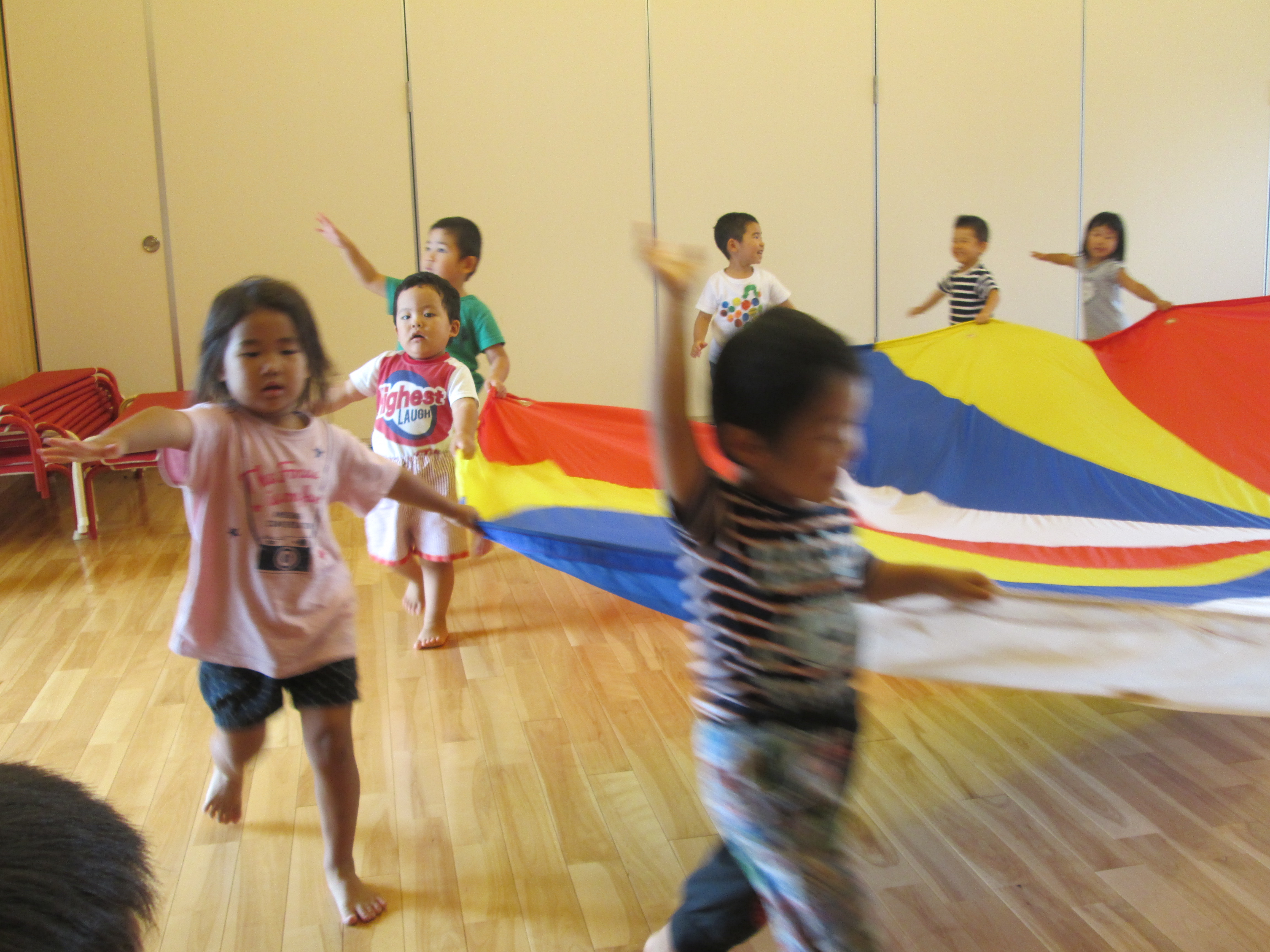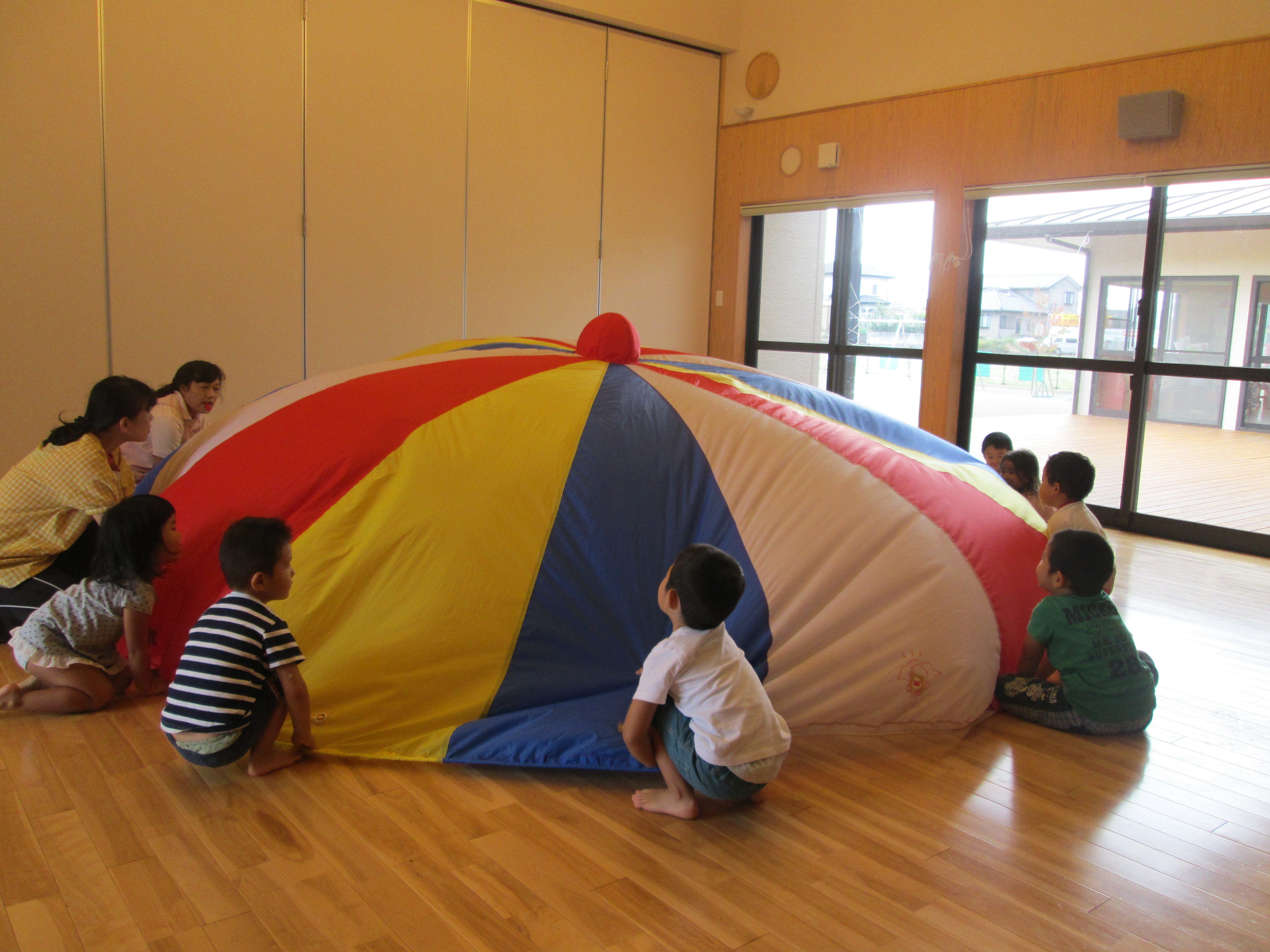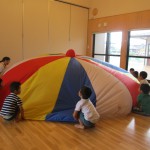 パラバルーン 10月10日(金) ぱんだ組さんは、運動会で披露するパラバルーンの練習に取り組んでいます。 笛の合図で回ったり、上下に揺らしたり、中に入ったり・・・みんなの息がそろってきましたね。 運動会が楽しみです。