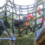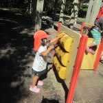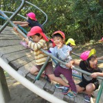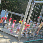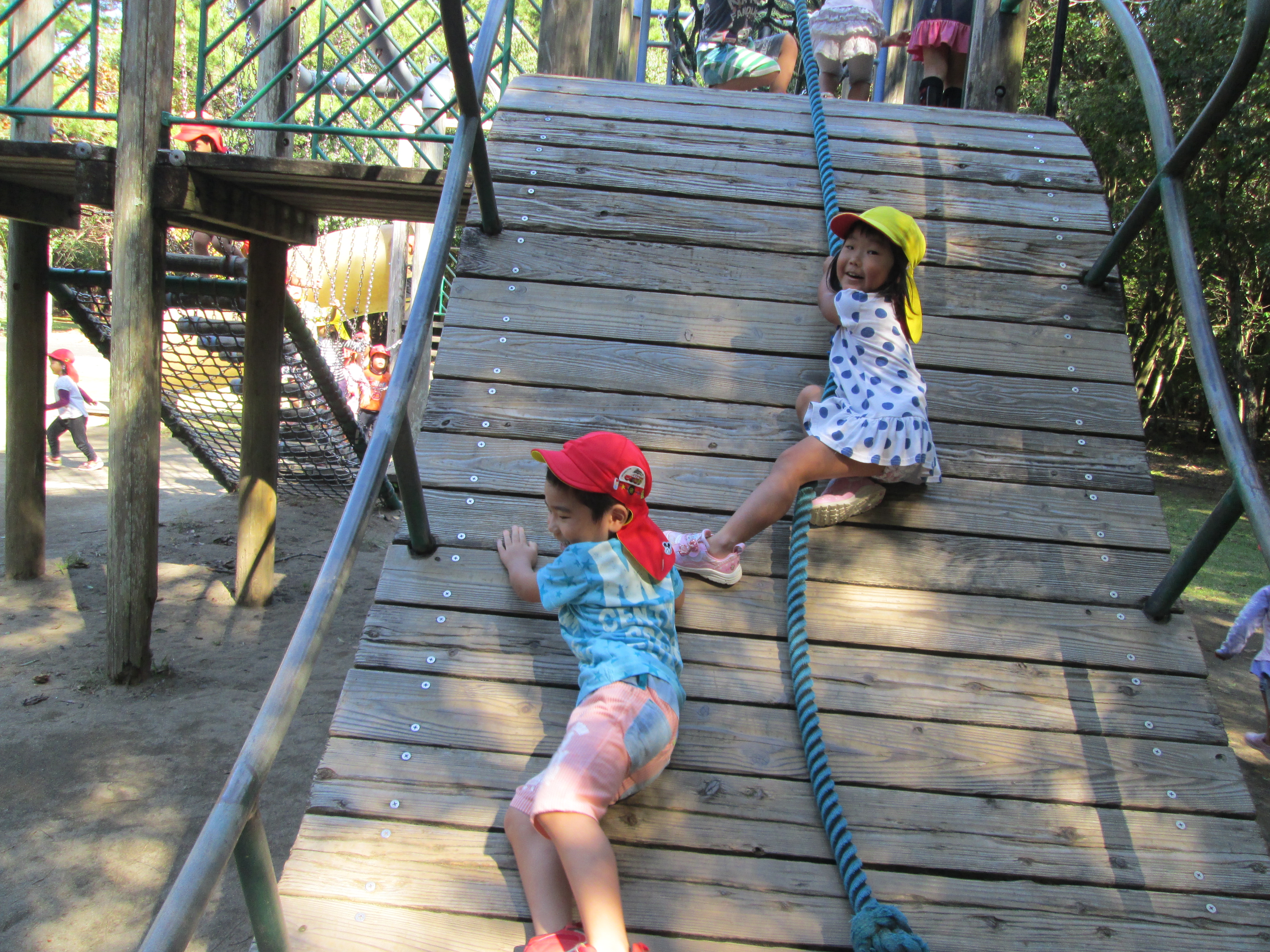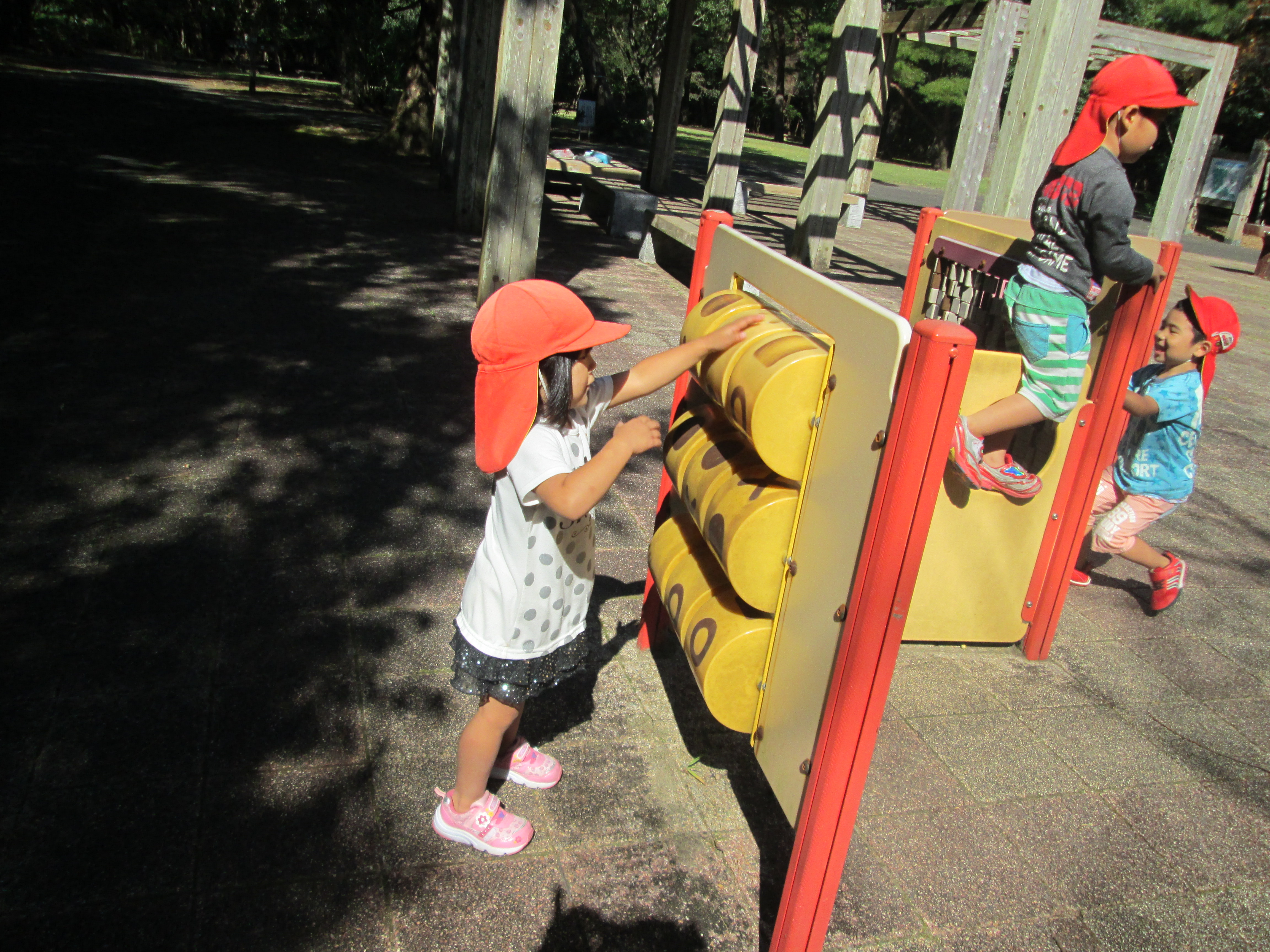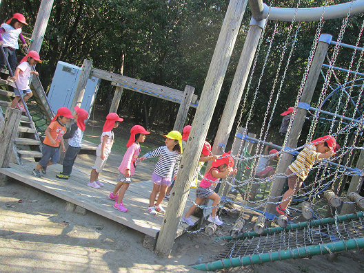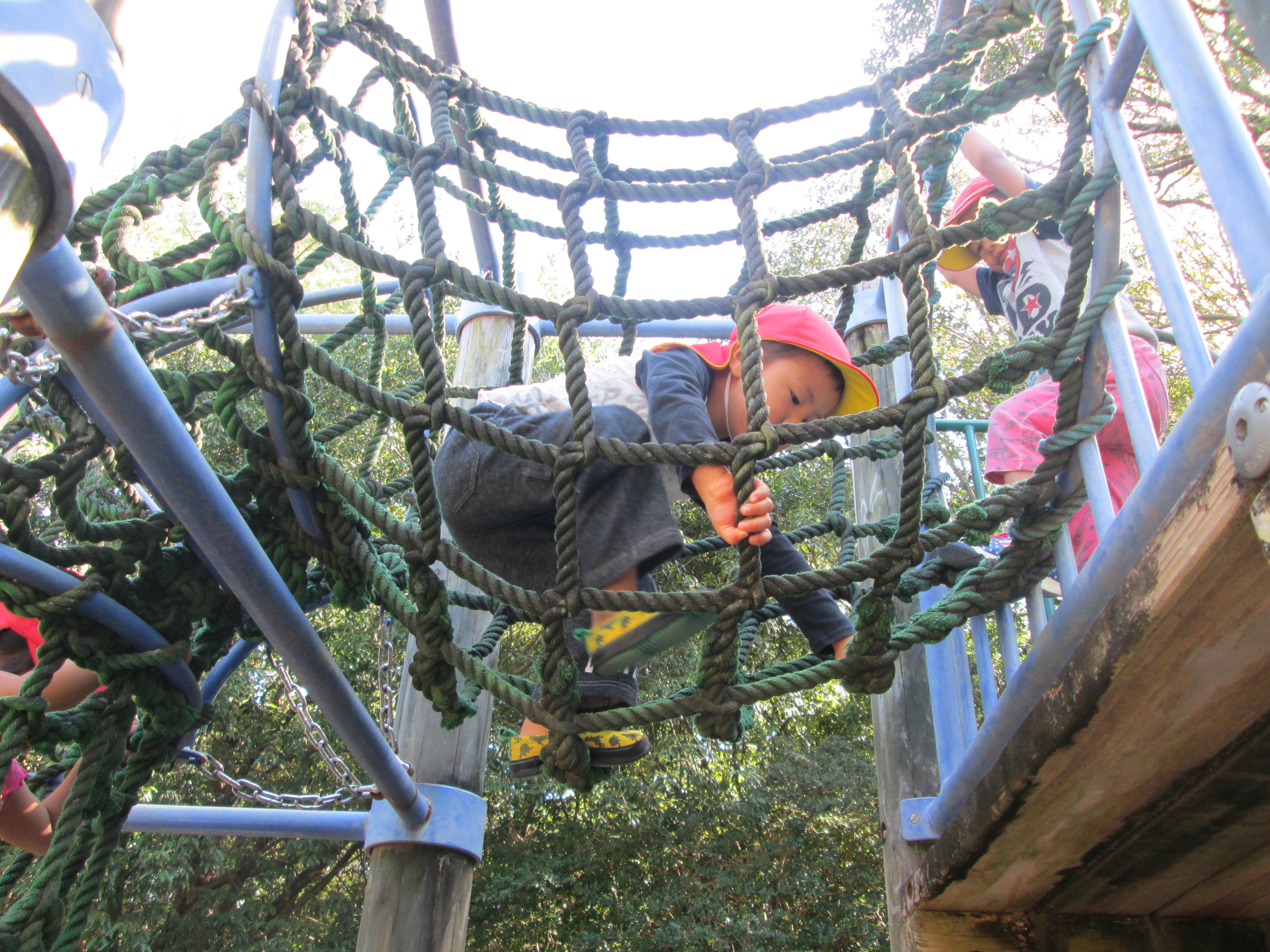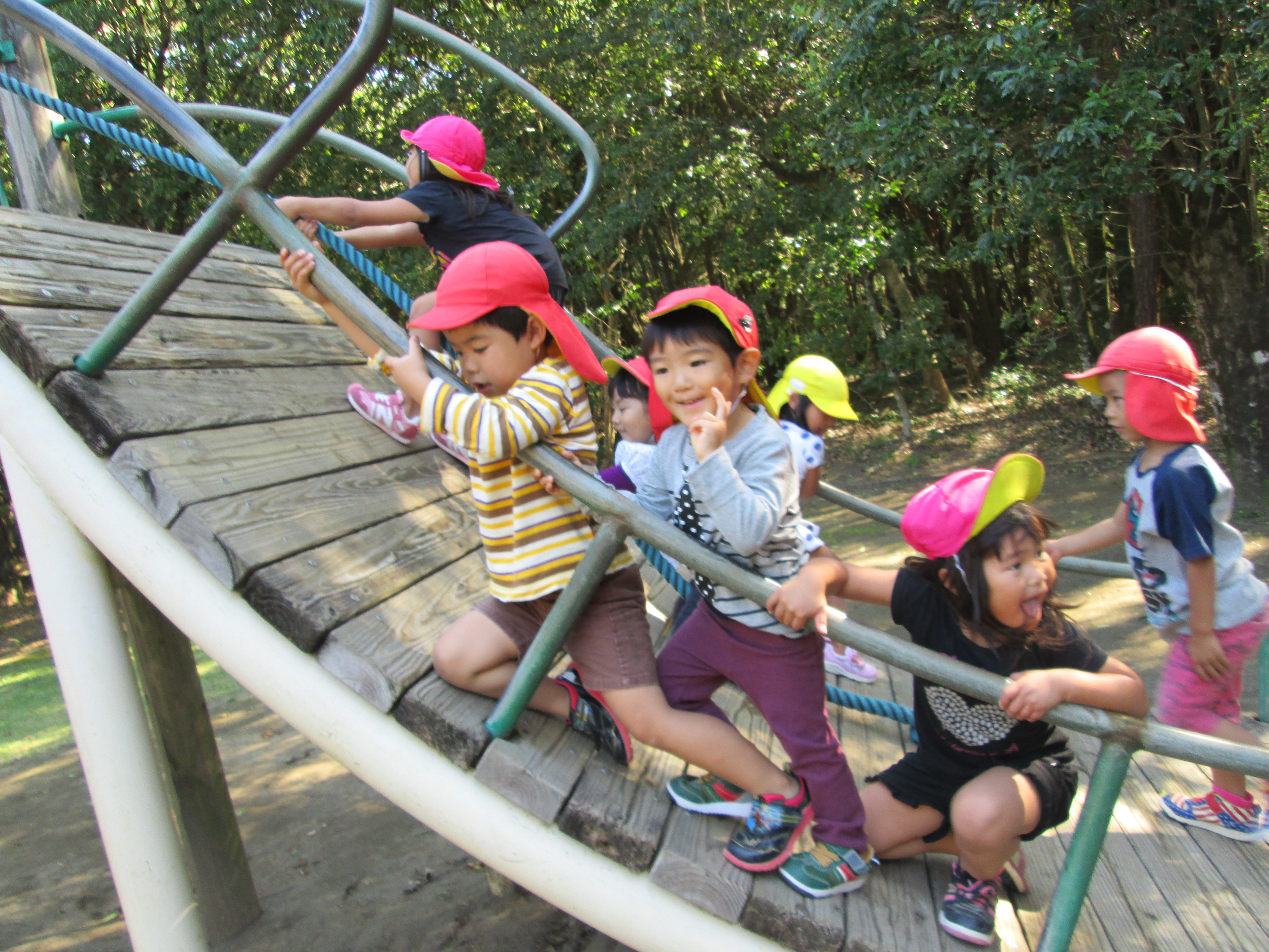 市民の森(ぱんだ) 10月23日(木) 秋晴れの良い天気ですね。ぱんだ組さんも、市民の森までお散歩です。 公園に着くとアスレチック遊具に挑戦! 「登れるかな?」 「高くて怖いね」 色々な遊具で元気一杯遊びました。