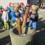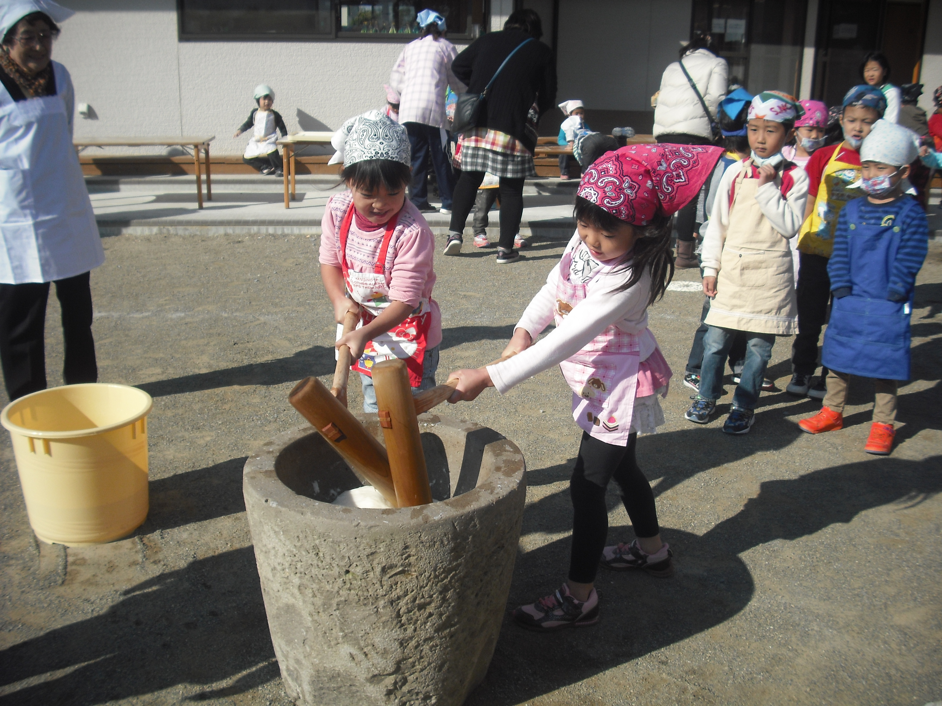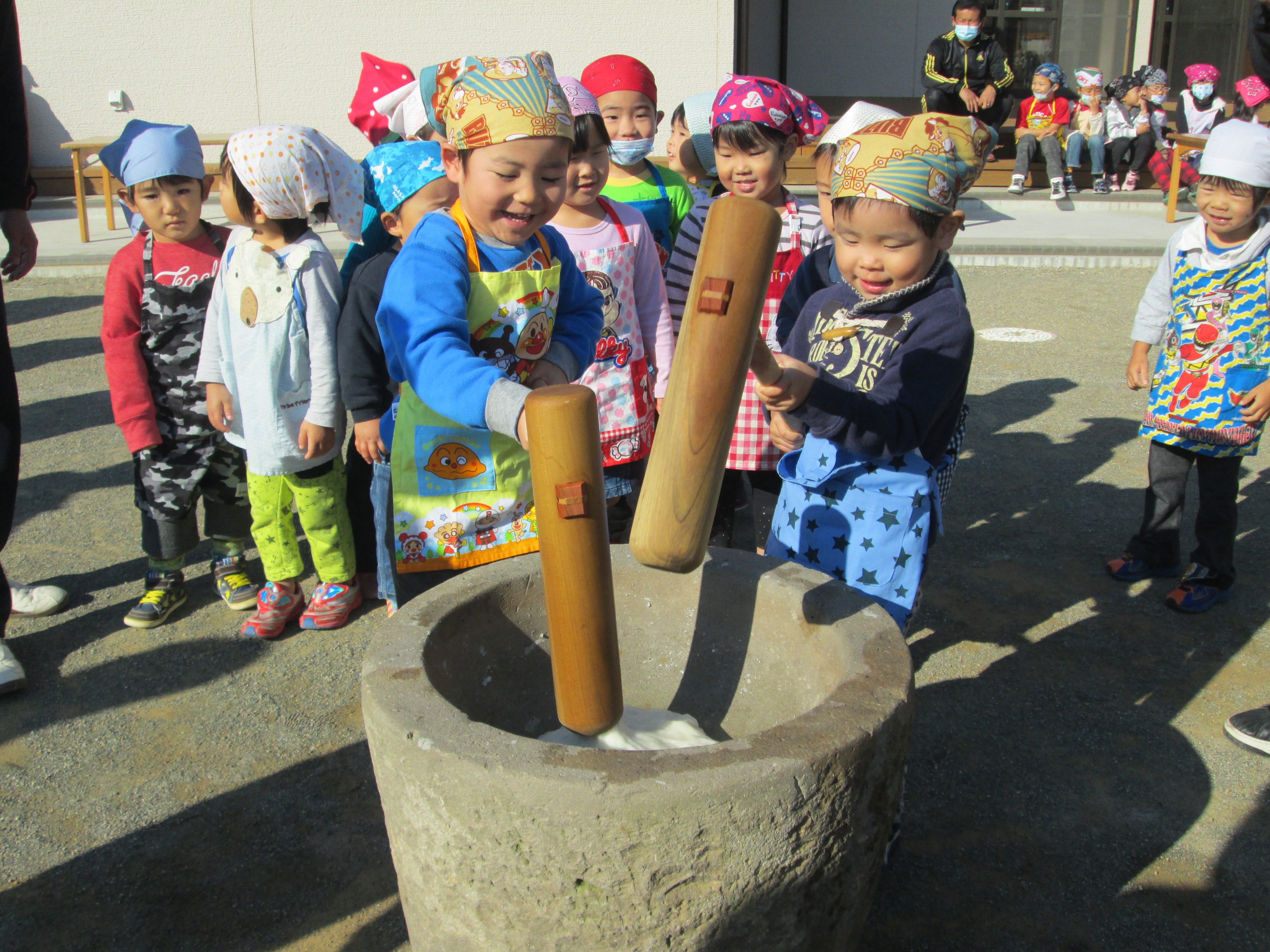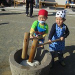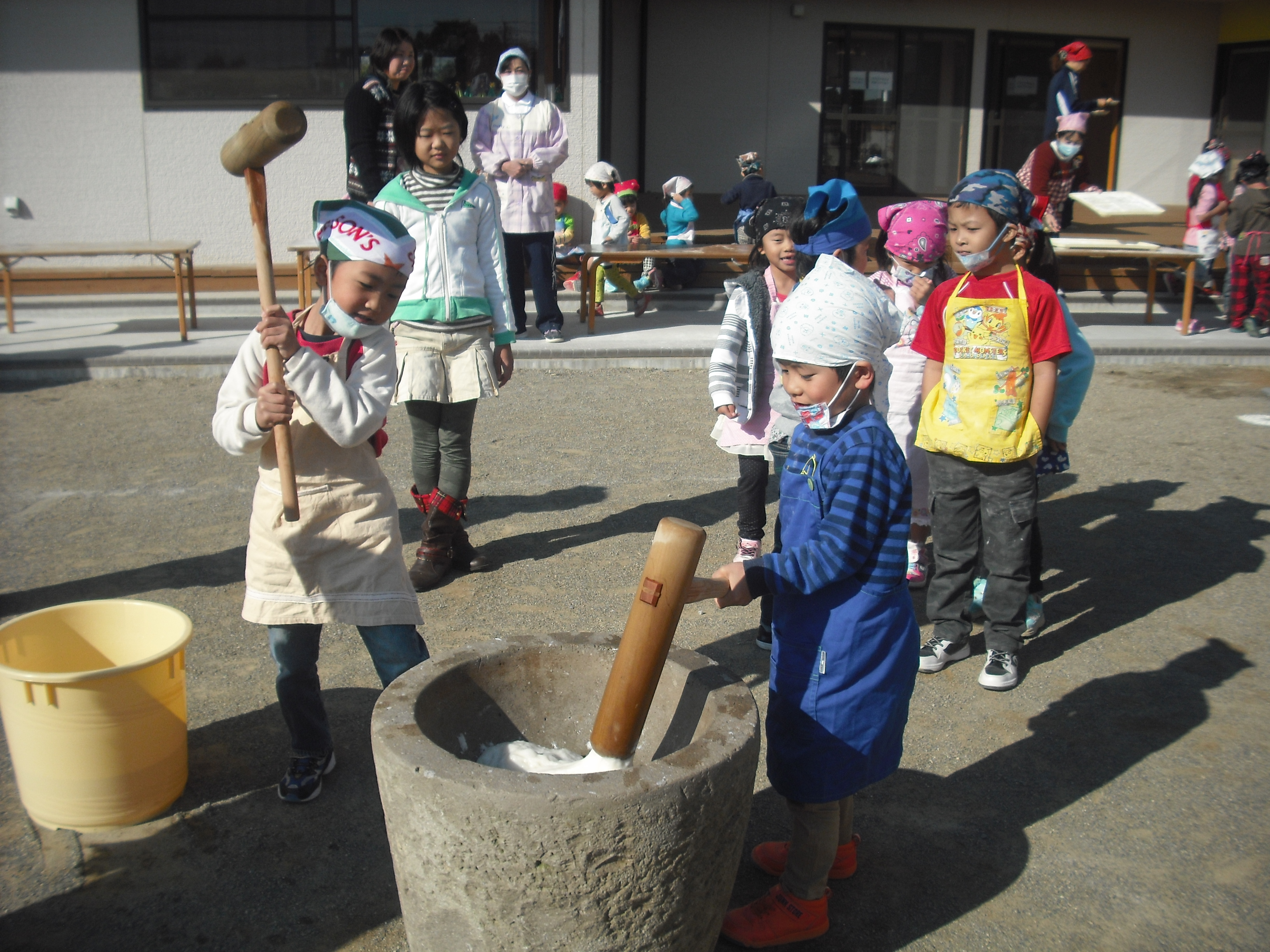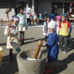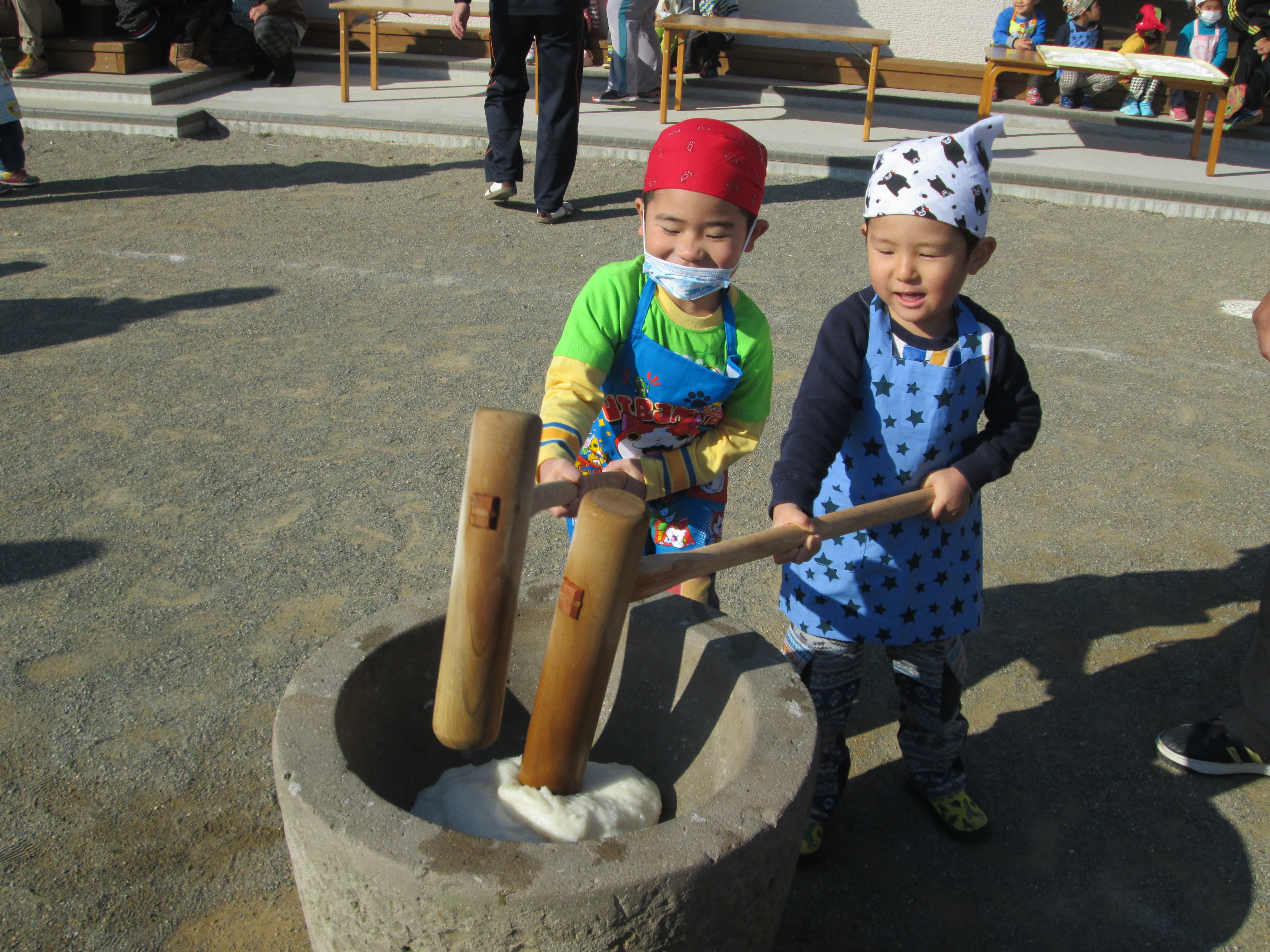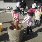 もちつき大会 12月13日(土) 楽しみにしていた『もちつき大会』です。 ぺったんぺったんぺったんこ~♪ みんな上手に杵を持ち上げ餅をついてます。 こねこね・・・お顔もおてても真っ白です。 つきたての餅は美味しいね。みんなでお腹一杯食べました。