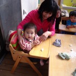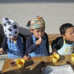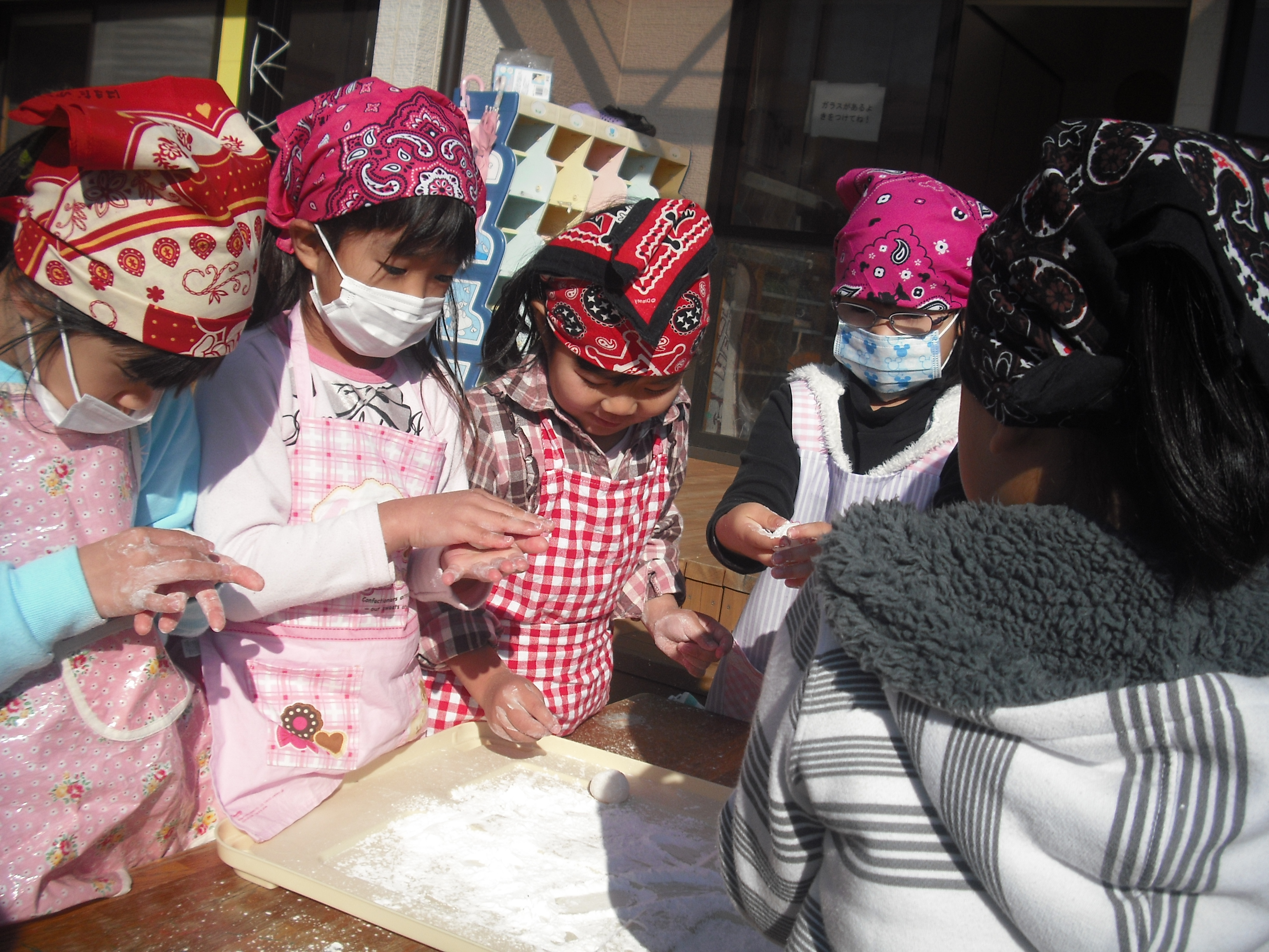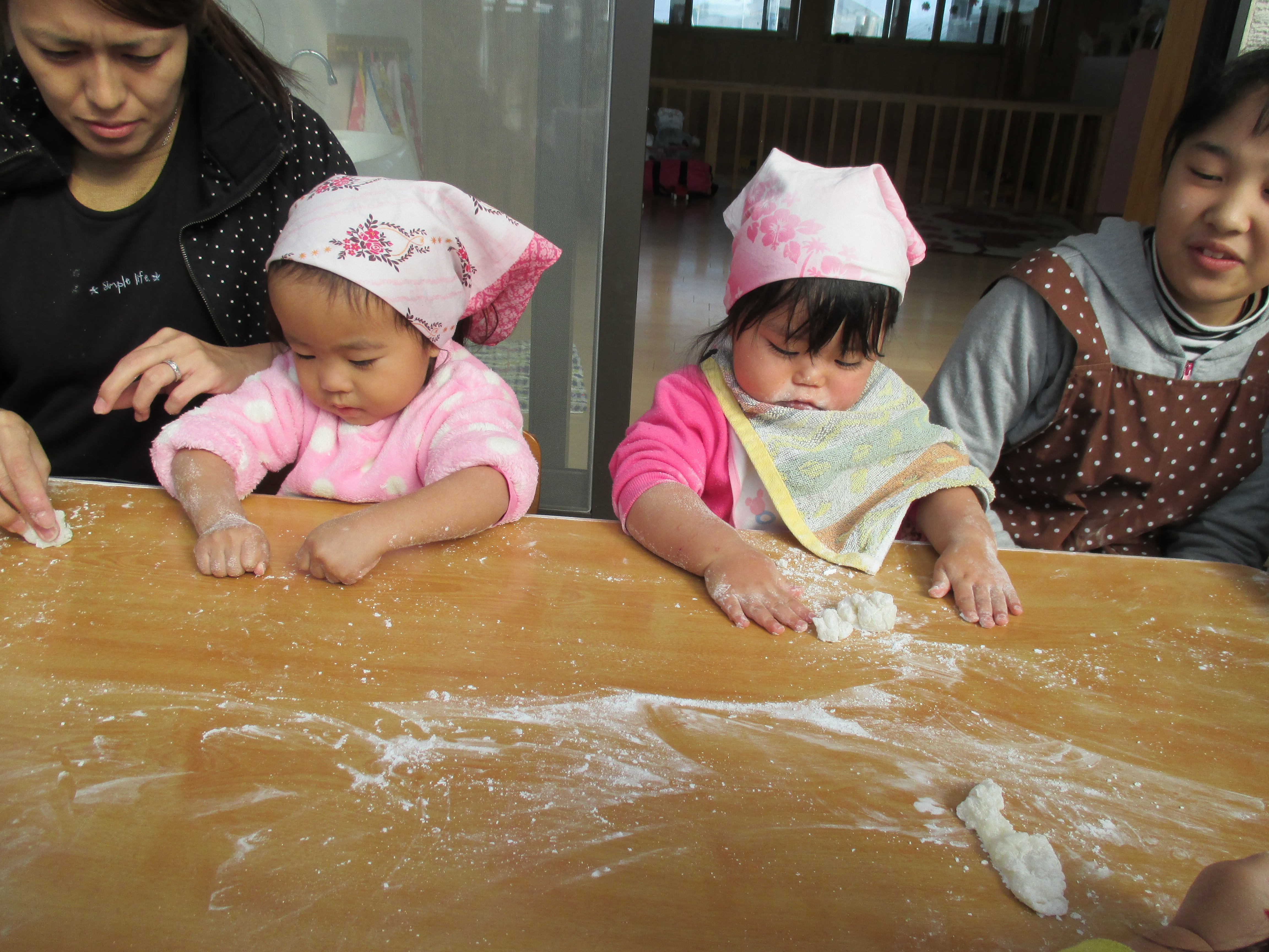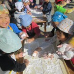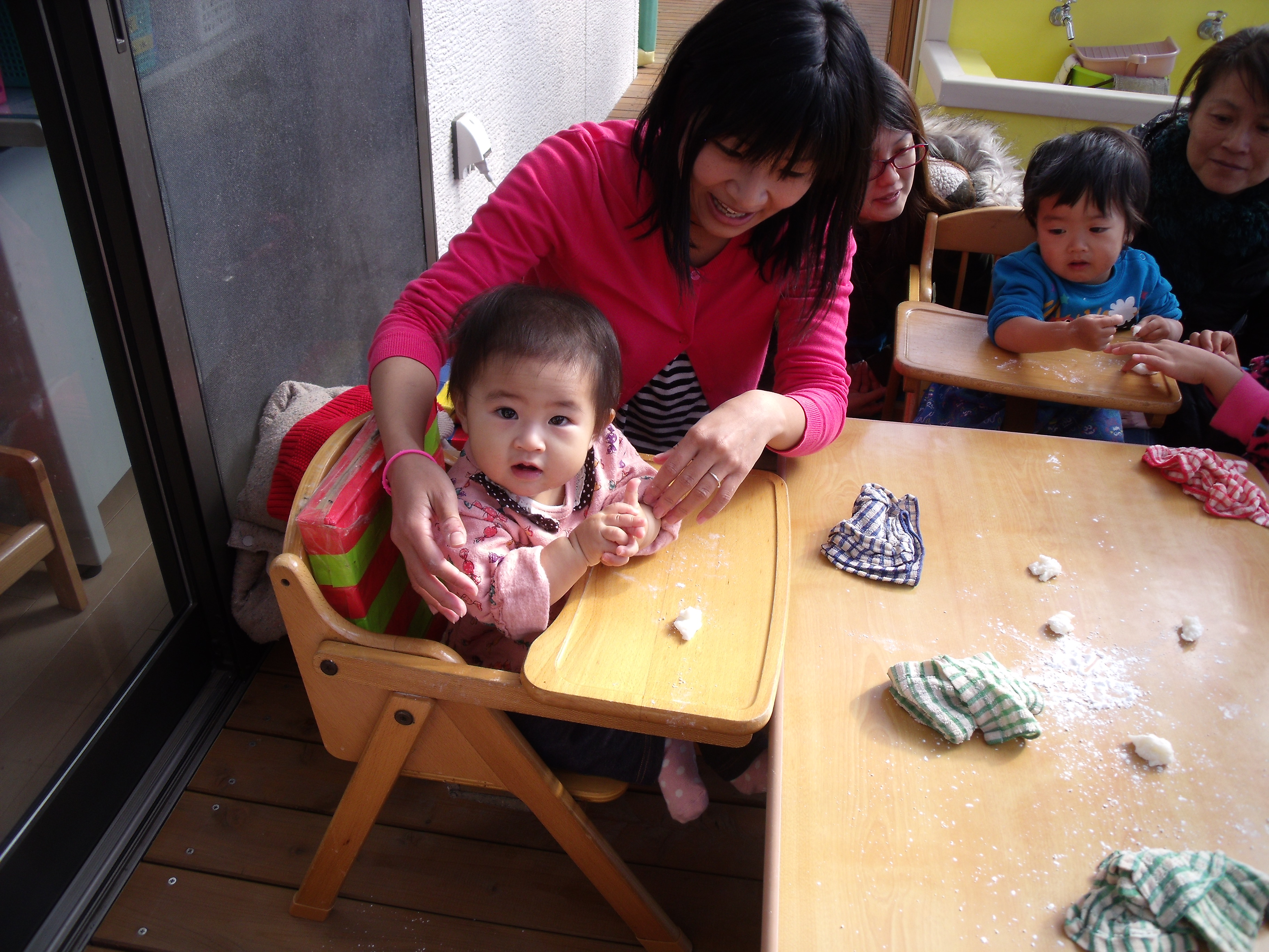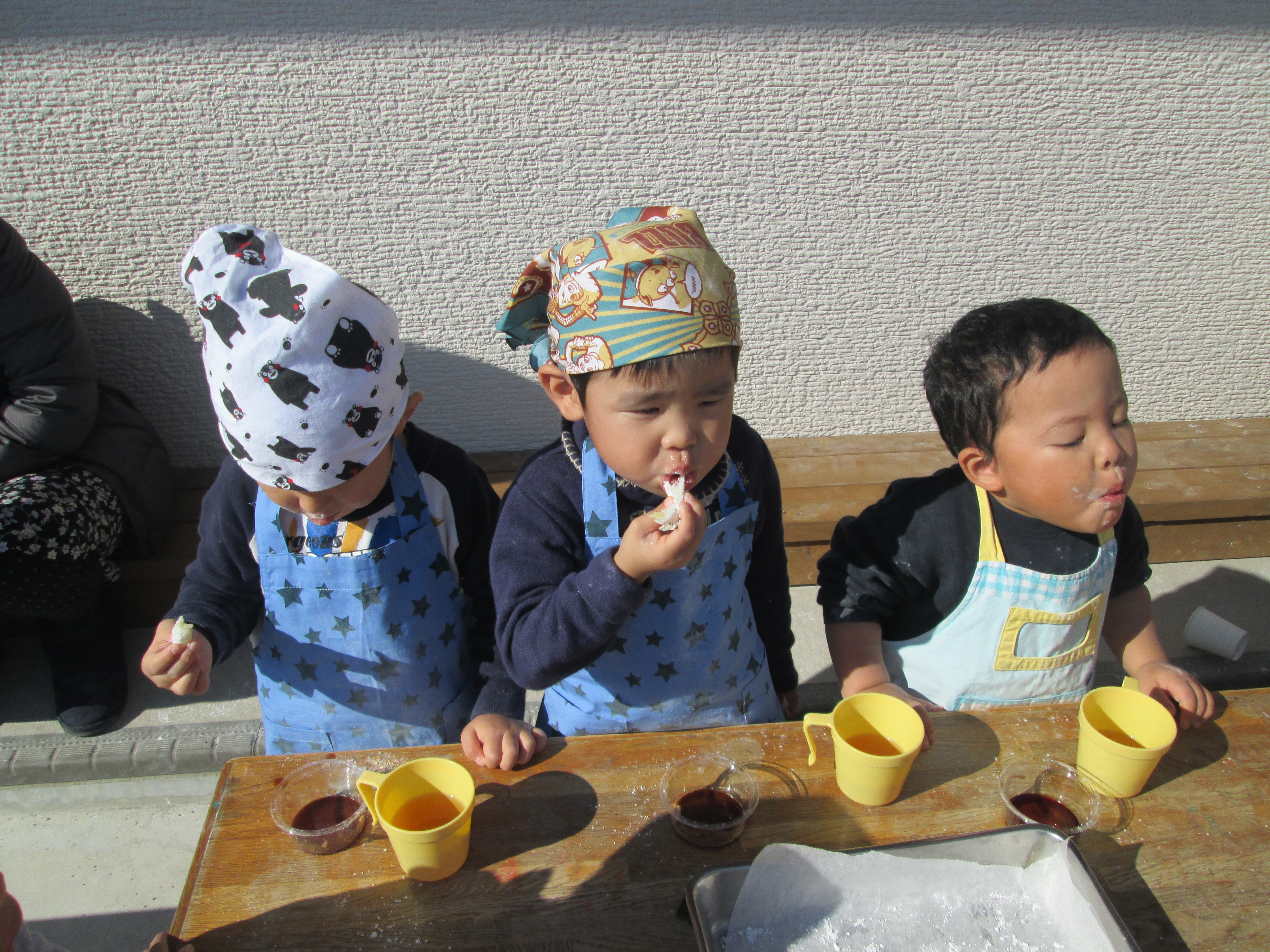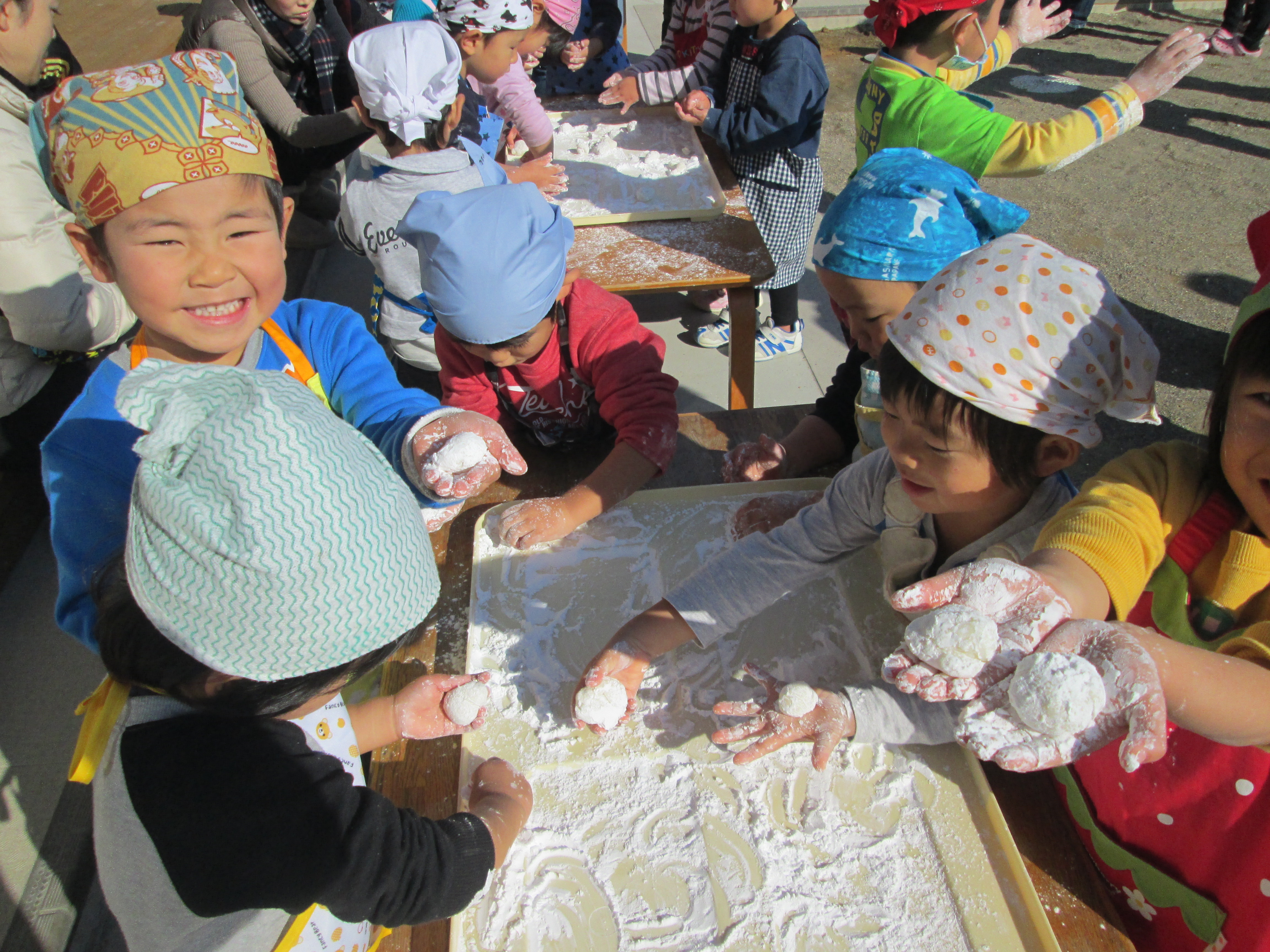 もちつき大会 12月13日(土) 楽しみにしていた『もちつき大会』です。 ぺったんぺったんぺったんこ~♪ みんな上手に杵を持ち上げ餅をついてます。 こねこね・・・お顔もおてても真っ白です。 つきたての餅は美味しいね。みんなでお腹一杯食べました。