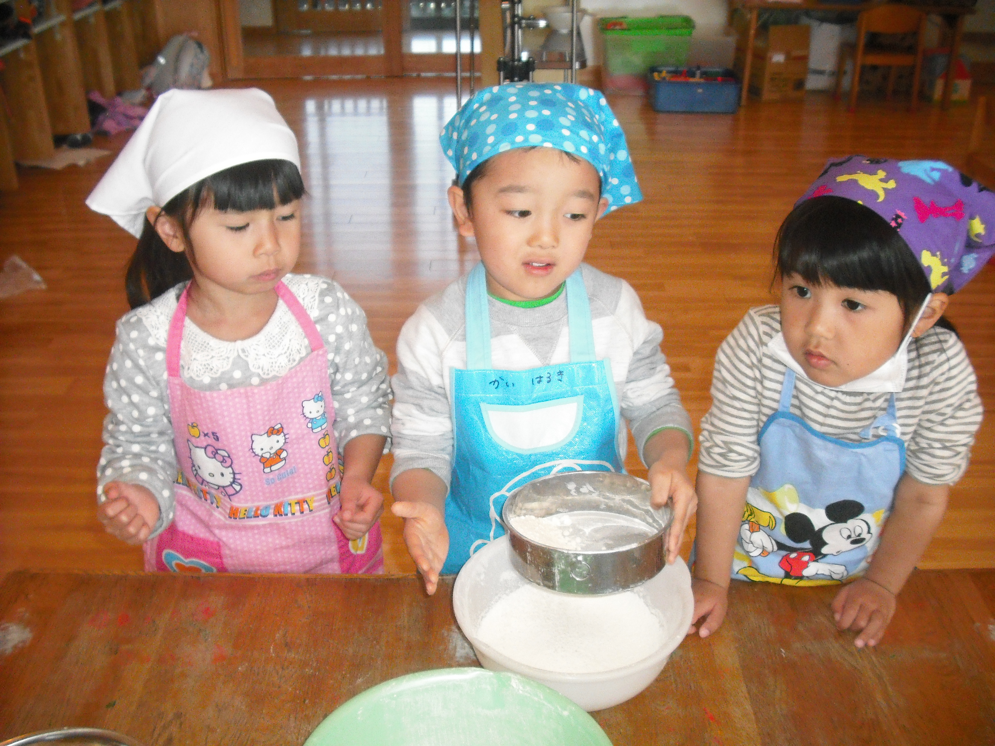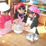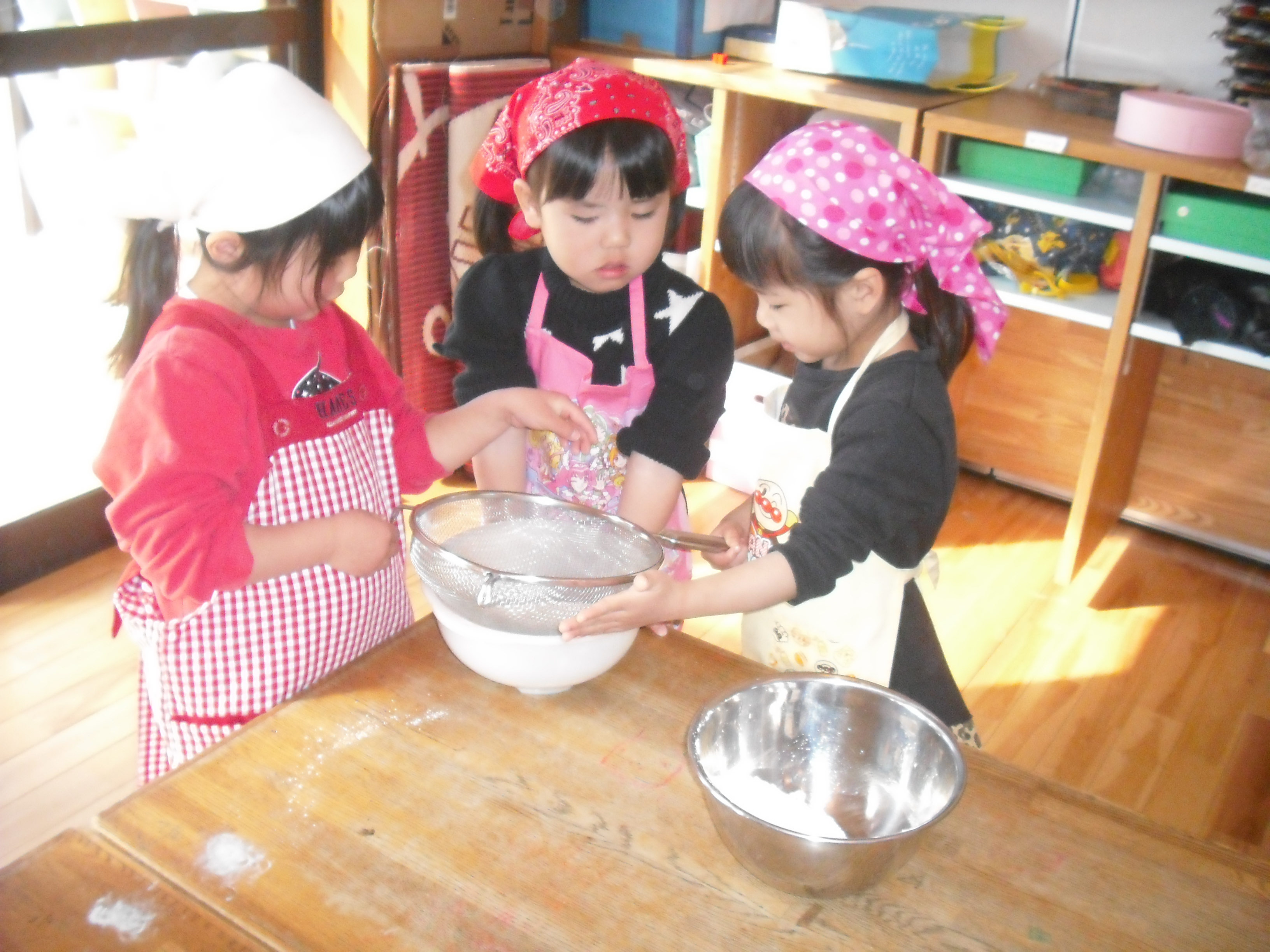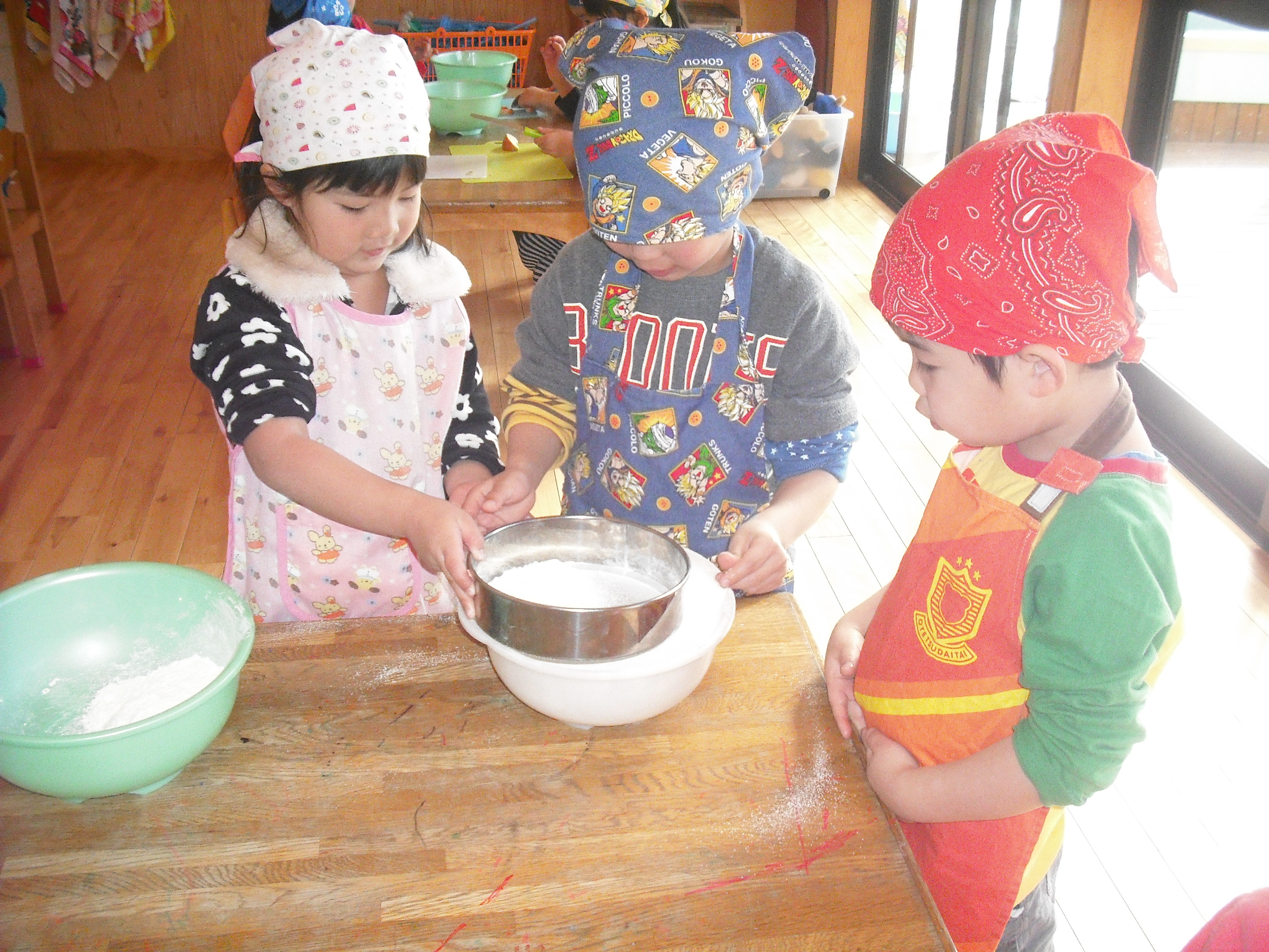 ドロップクッキー作り 2月6日(金) ぞう組さんときりん組さんが合同でクッキングを行いました。 きりん組さんがリンゴを切って、ぞう組さんが粉をふるいます。 一緒に混ぜて・・・オーブンで焼き上げたら、『リンゴのドロップクッキー』の出来上がり! 美味しいクッキーを頬張り、大満足の子ども達でした。