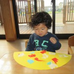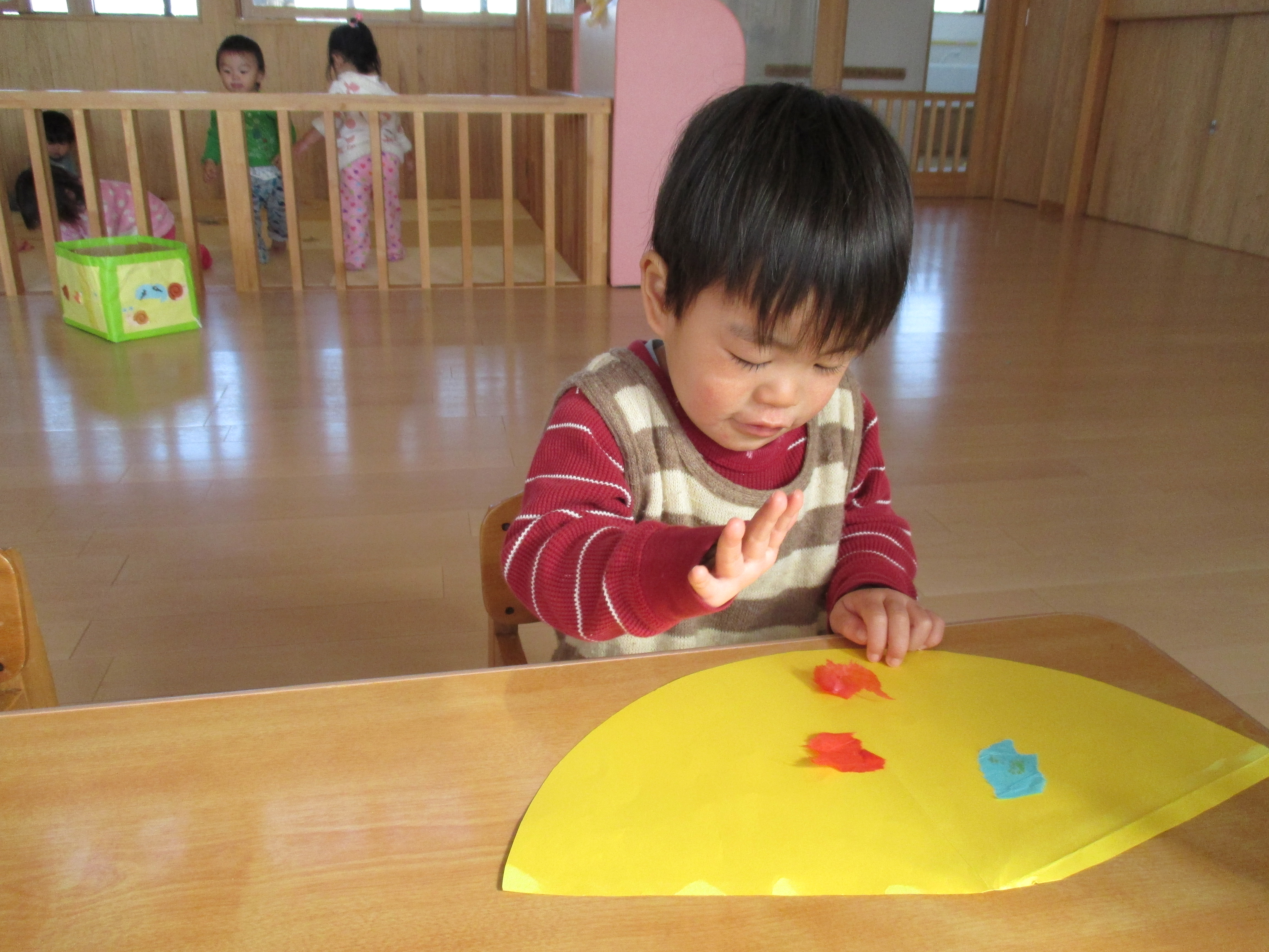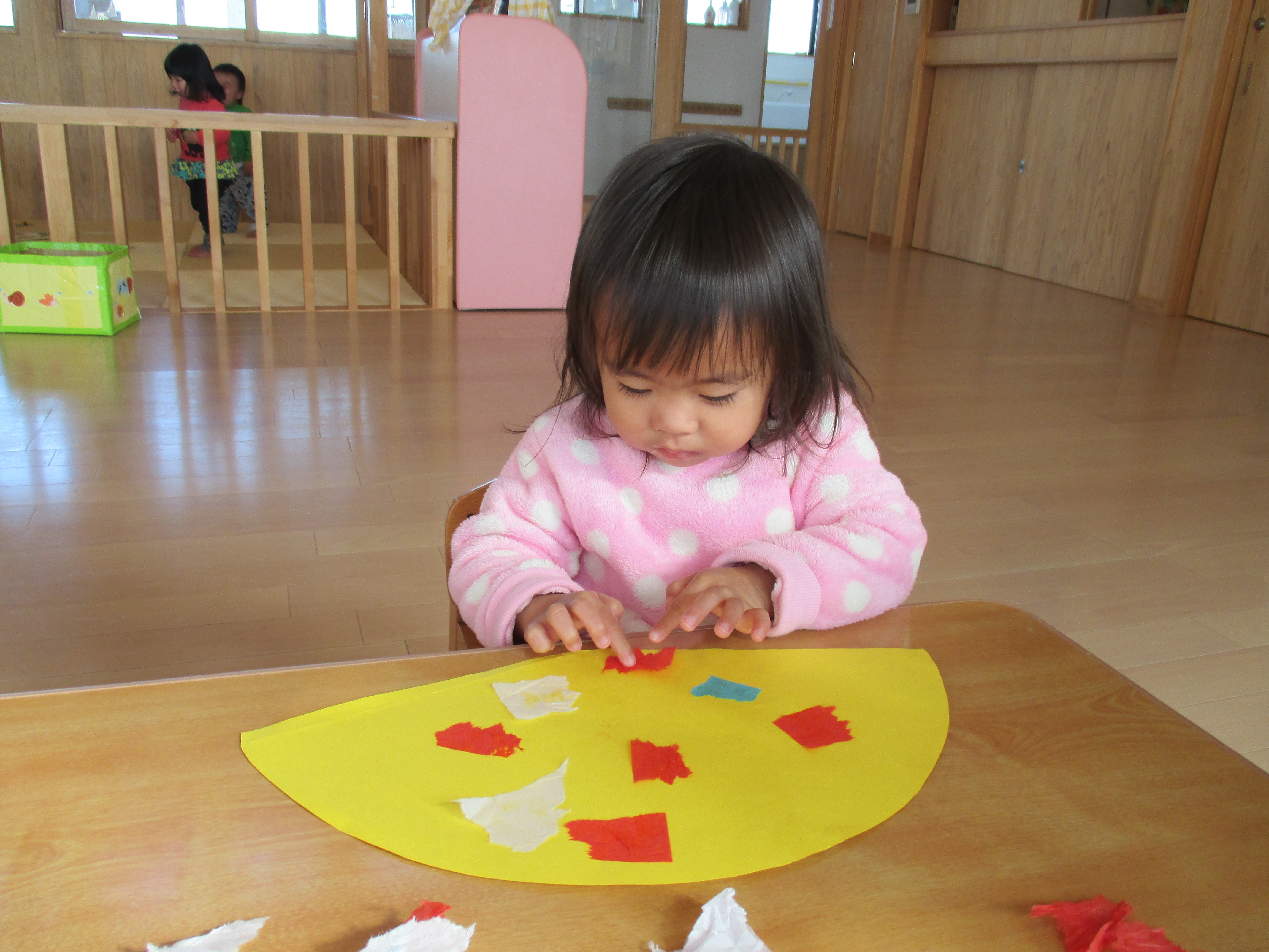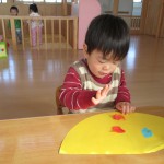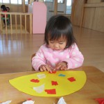 りす組さんは、豆まきで使う鬼の角帽子を製作中です。