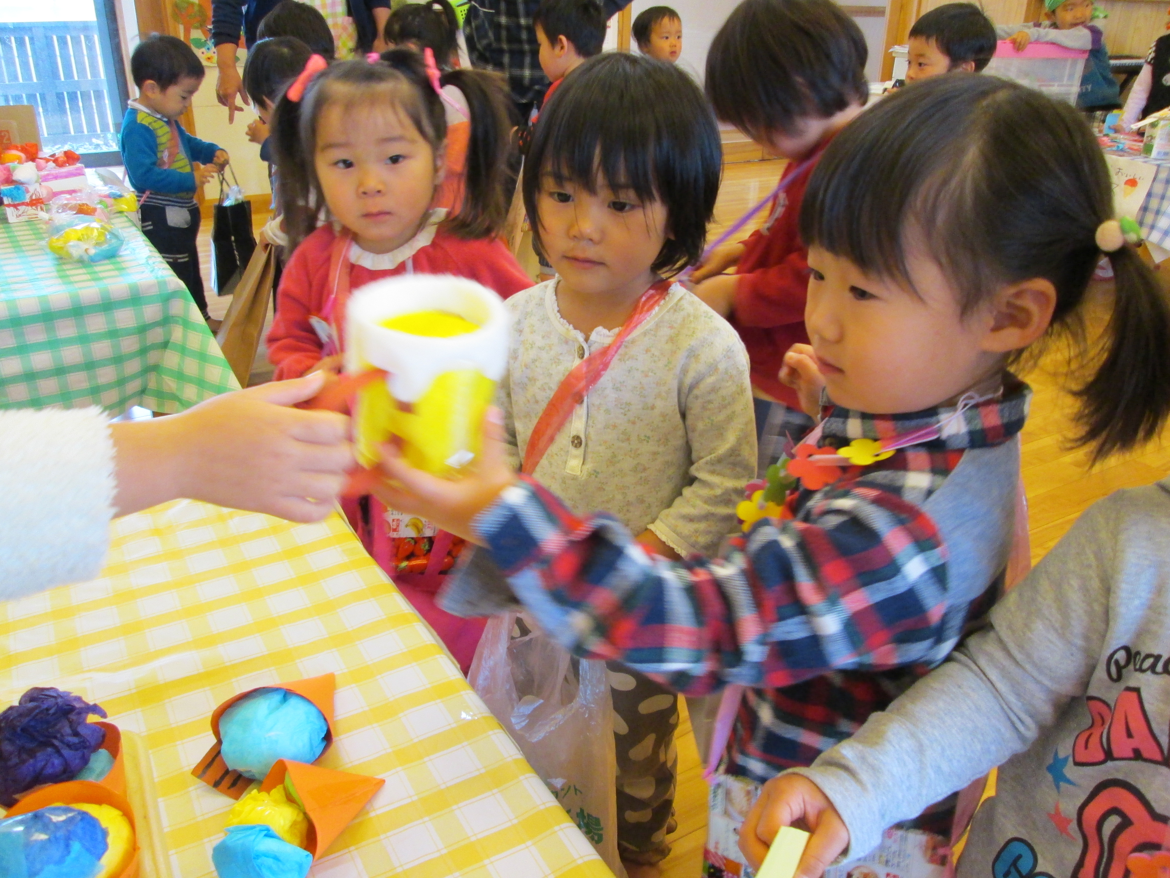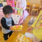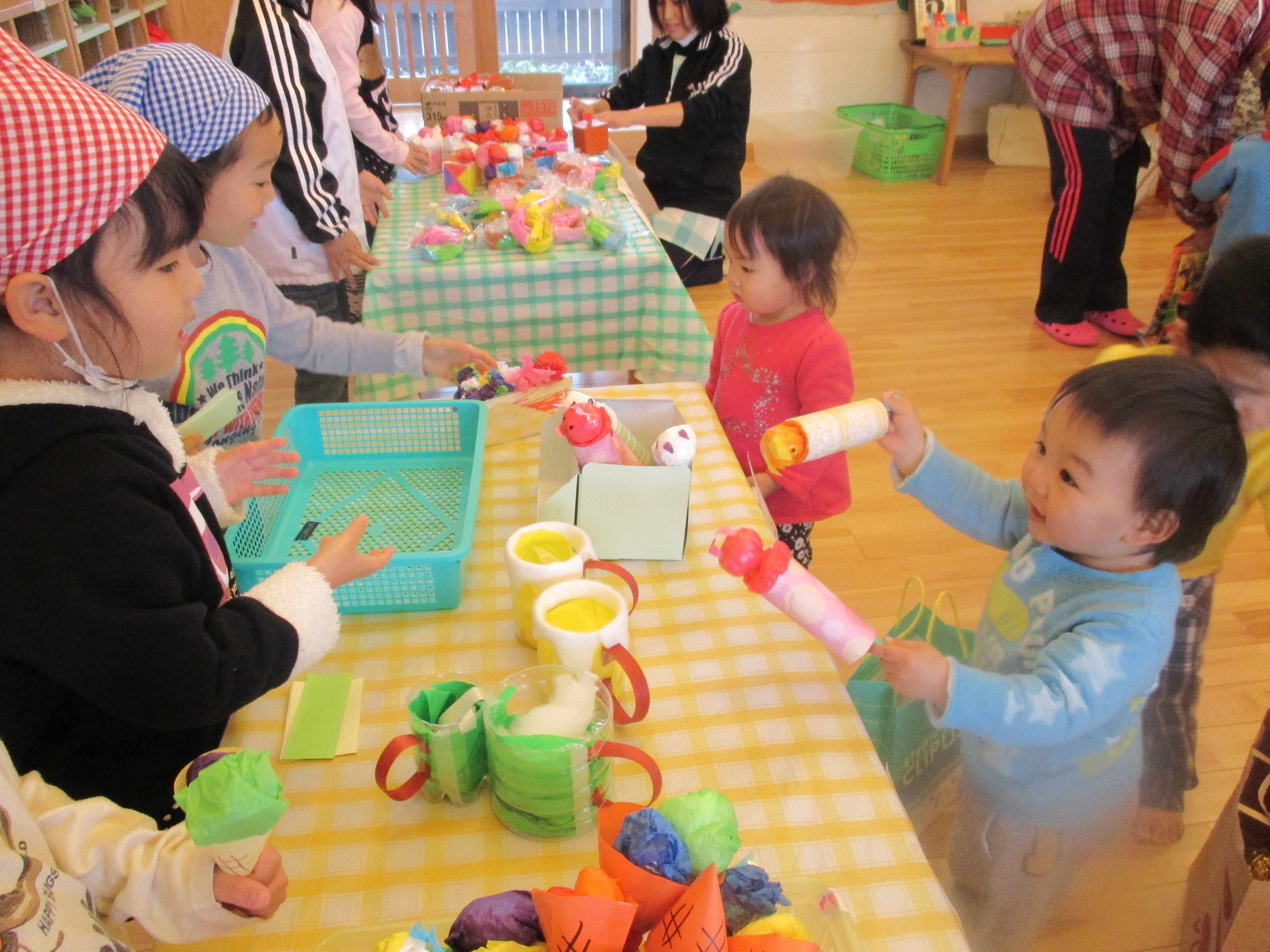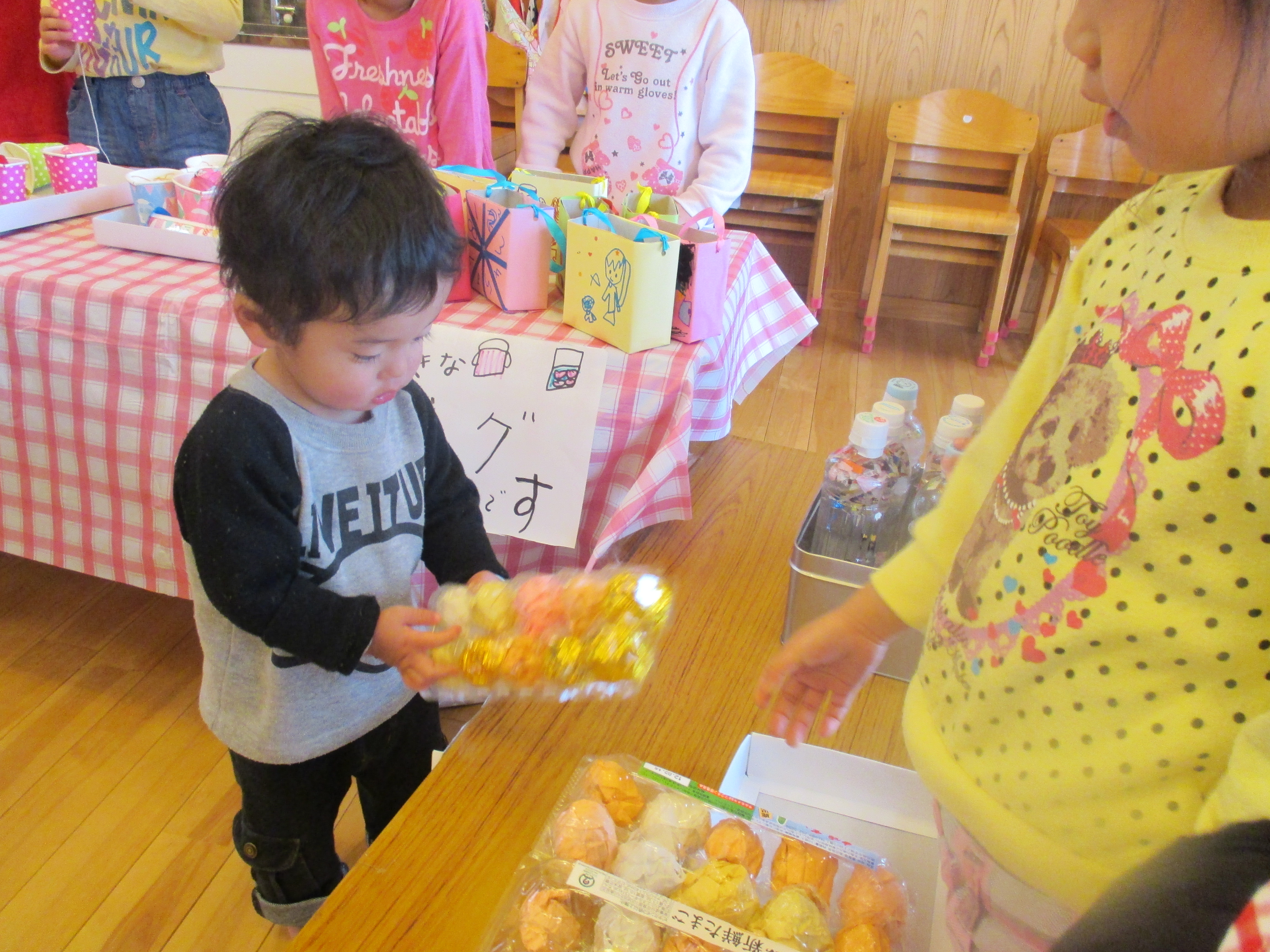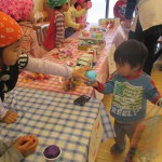 お買いものごっこ 3月6日(金) 今日は楽しみにしていた『お買いものごっこ』の日です。 ぞう組さんやきりん組さんは、みんなが喜びそうなおもちゃを沢山作ってくれました。 早速お客様がやってきましたよ。『いらっしゃいませ~♪』店員さんも張り切っています。 『どれにしようかな~』欲しい物が沢山あって迷いますね。買い物袋いっぱいお買い物を楽しみました。