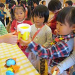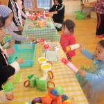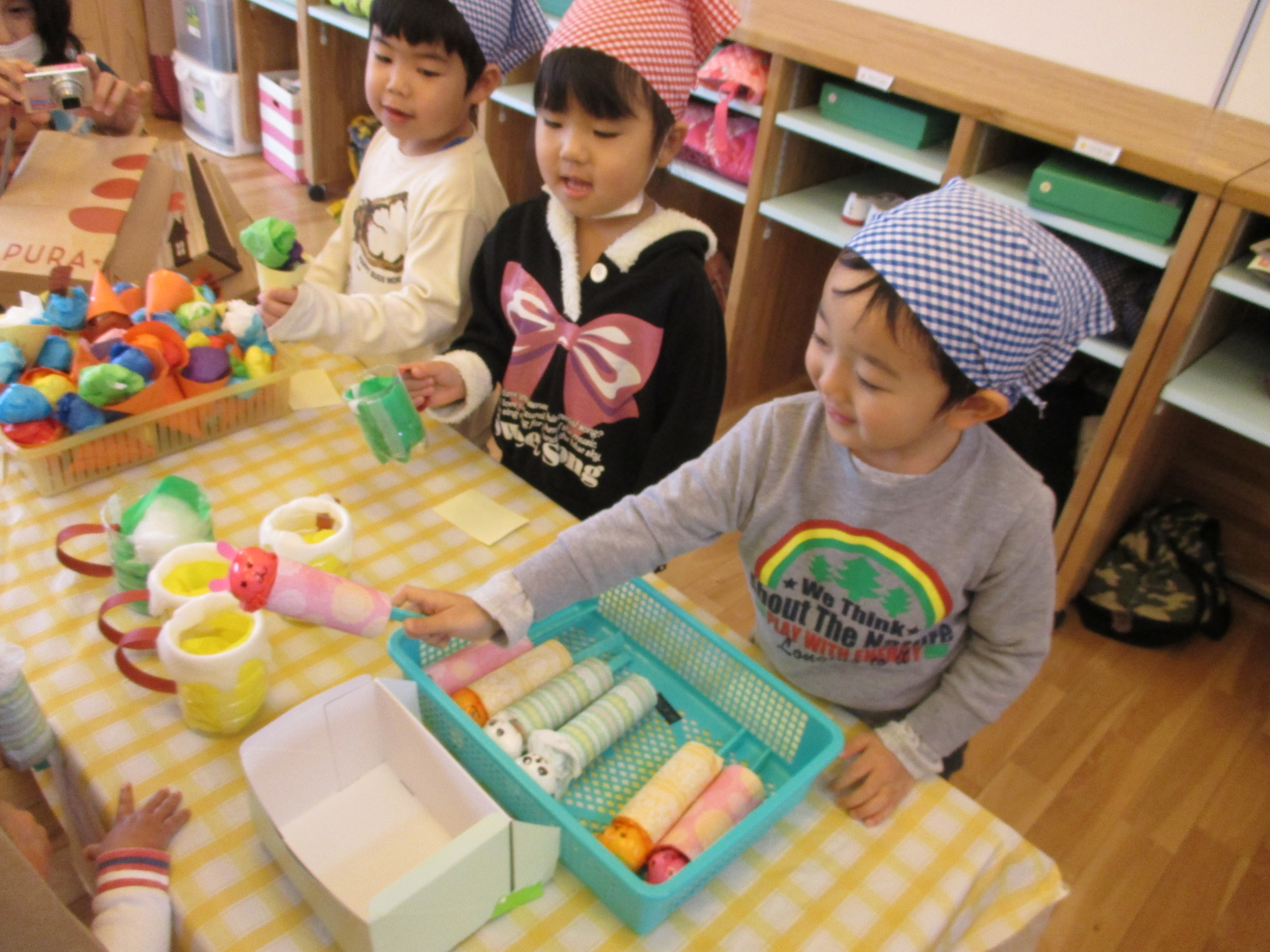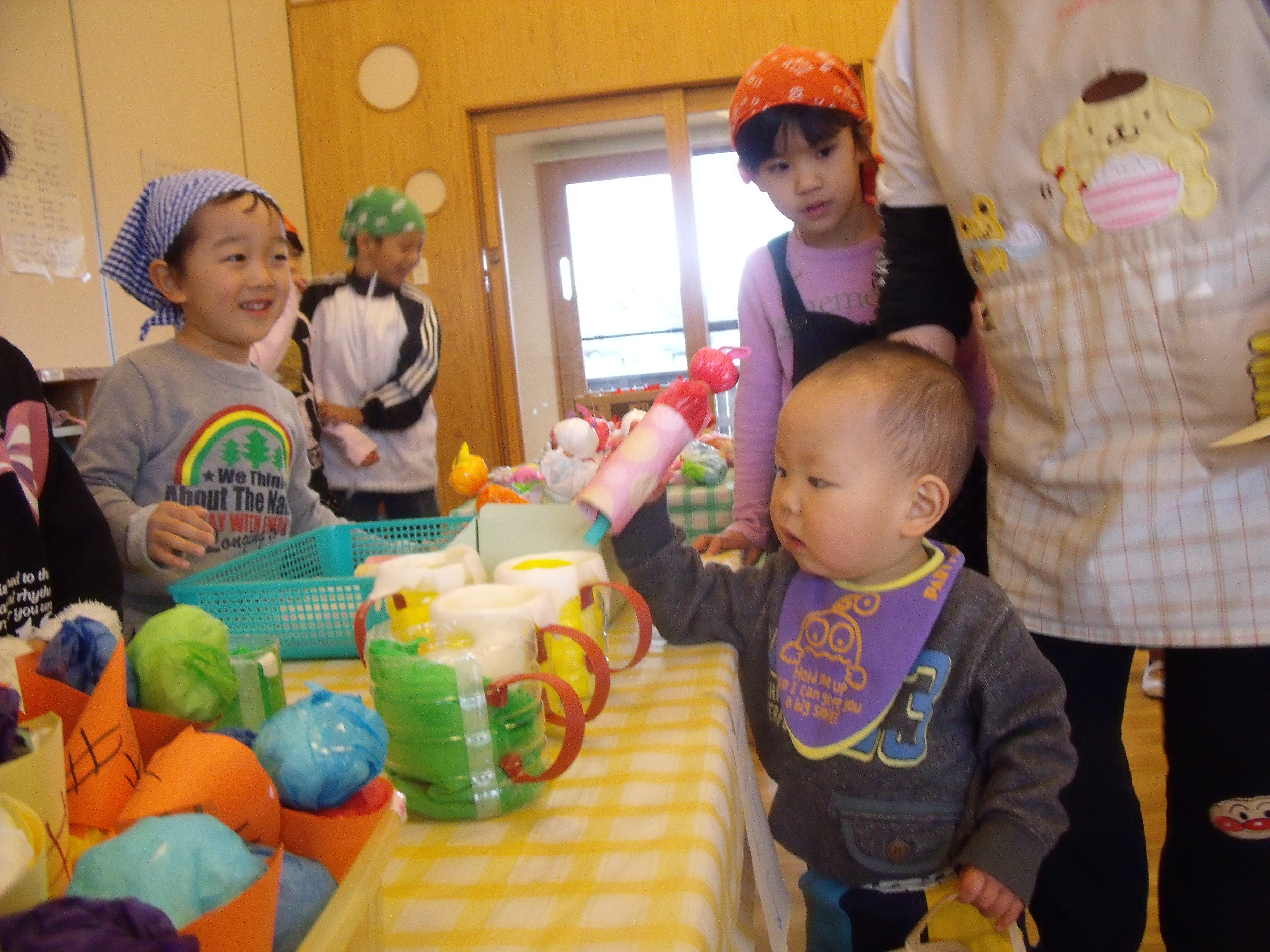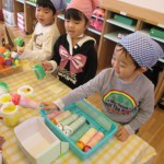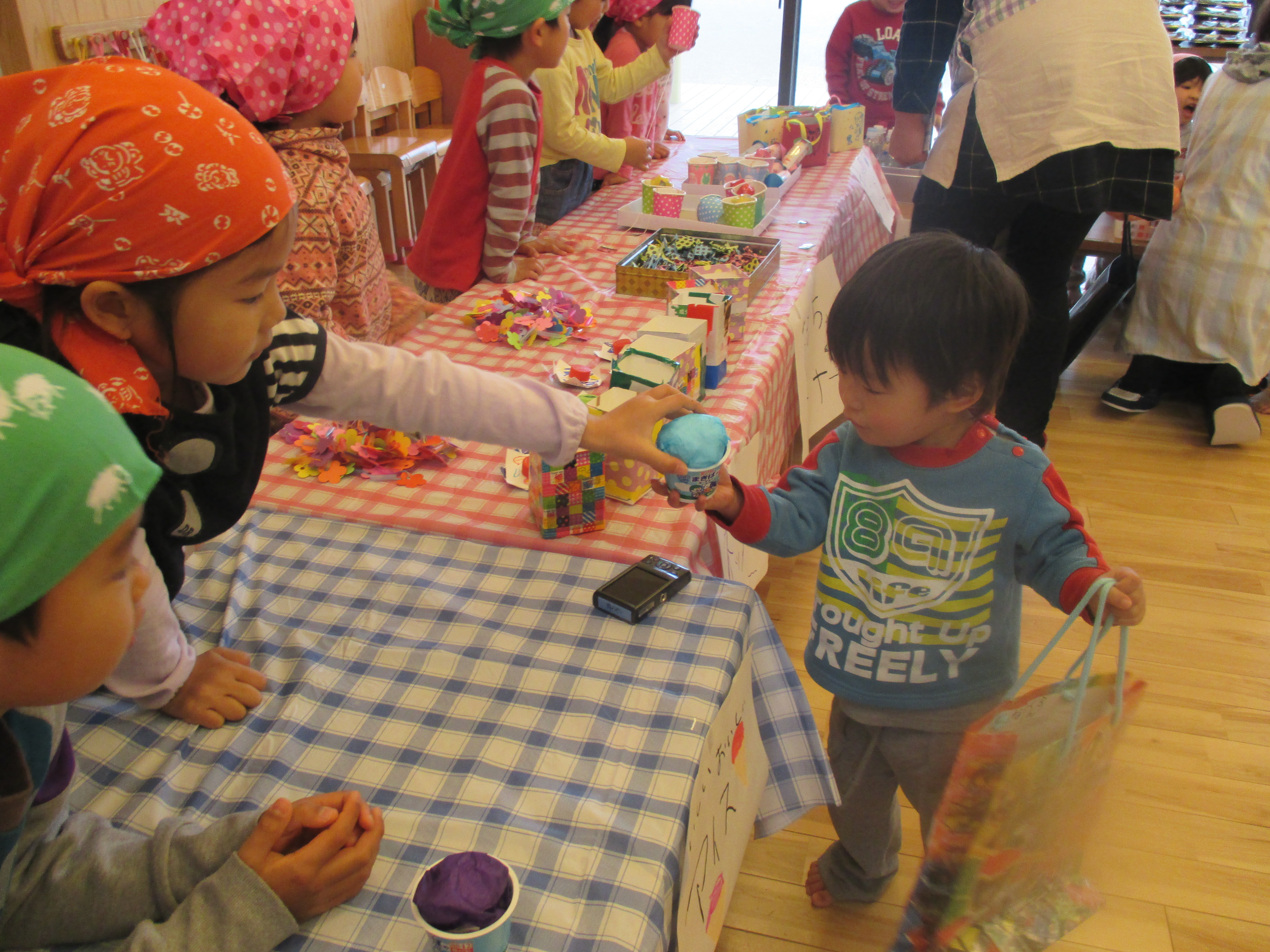 お買いものごっこ 3月6日(金) 今日は楽しみにしていた『お買いものごっこ』の日です。 ぞう組さんやきりん組さんは、みんなが喜びそうなおもちゃを沢山作ってくれました。 早速お客様がやってきましたよ。『いらっしゃいませ~♪』店員さんも張り切っています。 『どれにしようかな~』欲しい物が沢山あって迷いますね。買い物袋いっぱいお買い物を楽しみました。