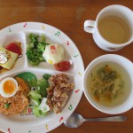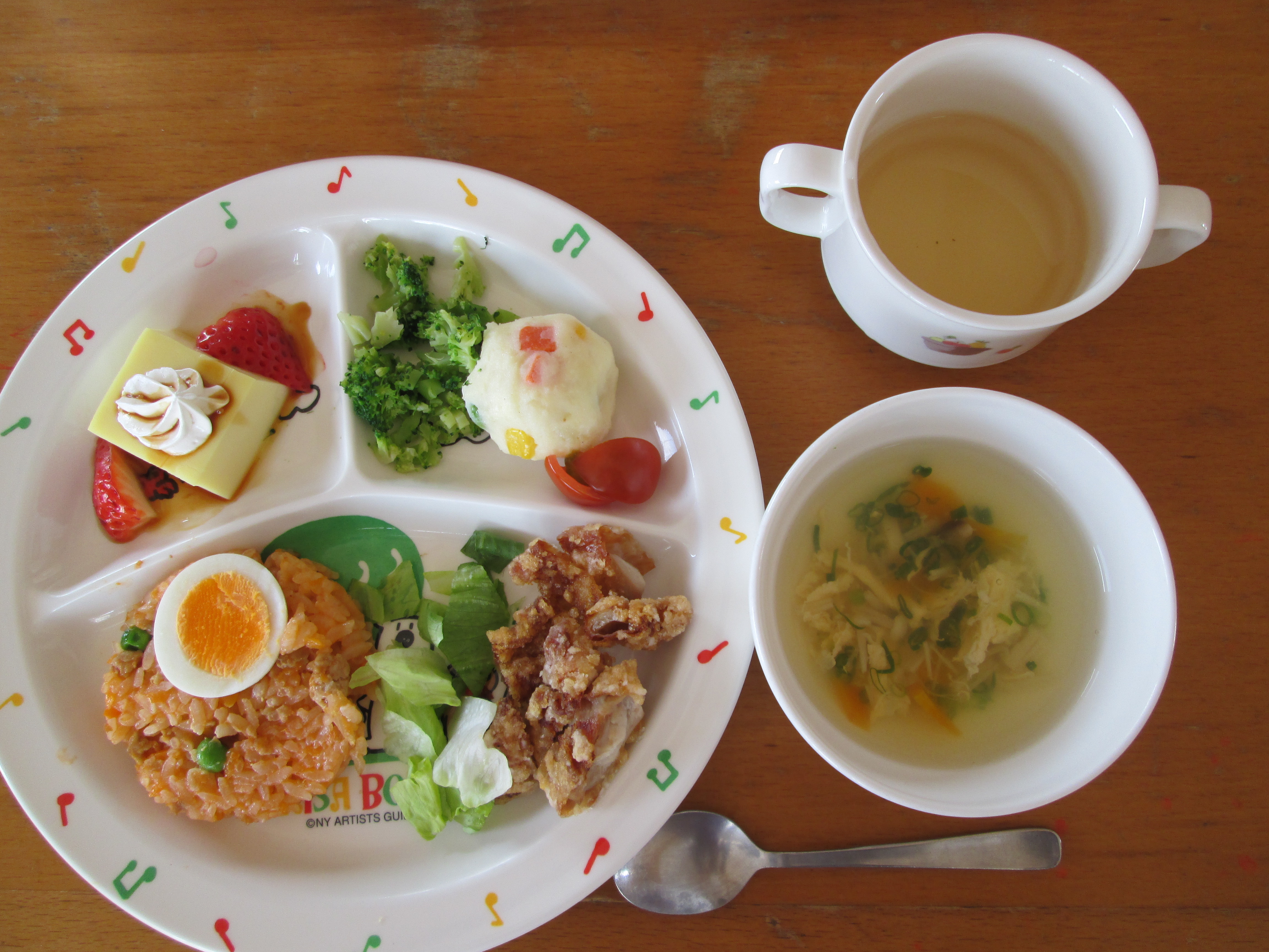 4月誕生会 4月15日(水) 4月生まれのお友達は、女の子ばかりの3名でした。 先生達の出し物を楽しんだ後は、毎月楽しみにしているご馳走です。 『チキンライス・から揚げ・マッシュポテト・きのこスープ・プリンアラモード』子ども達の大好きなメニューでした。