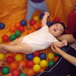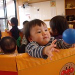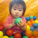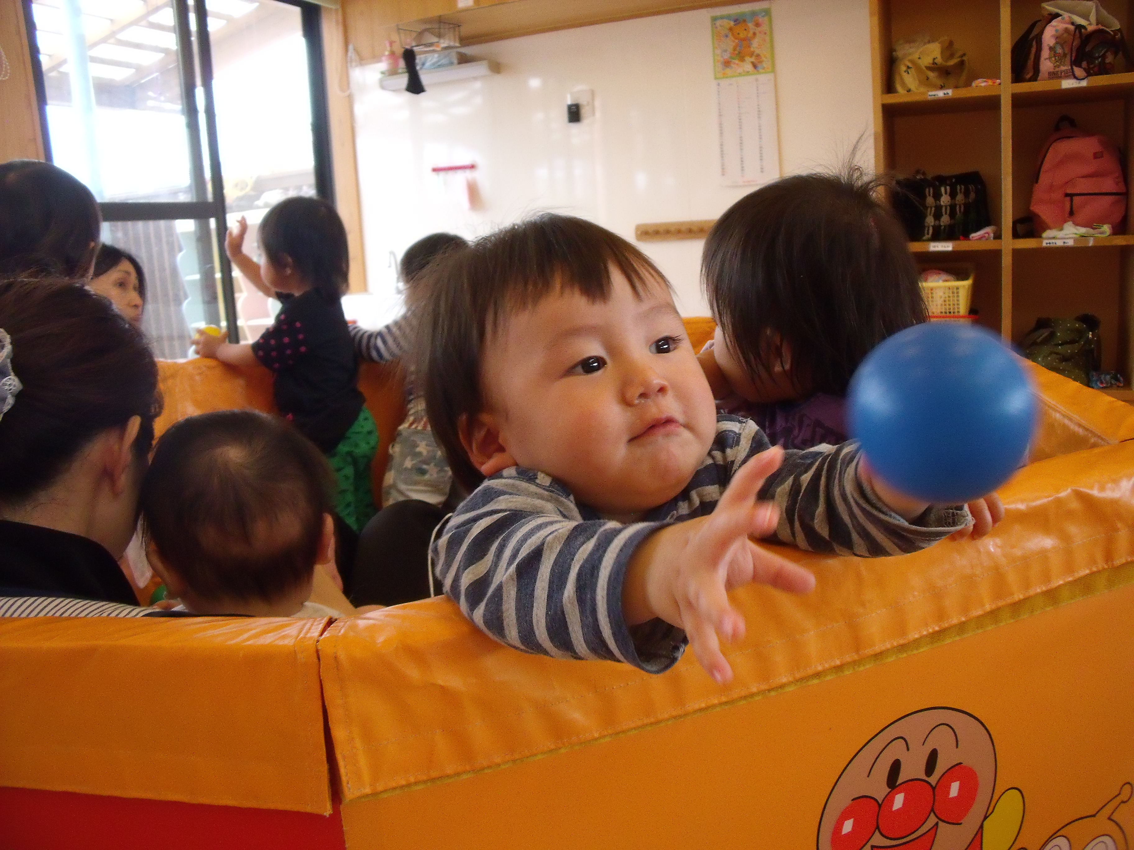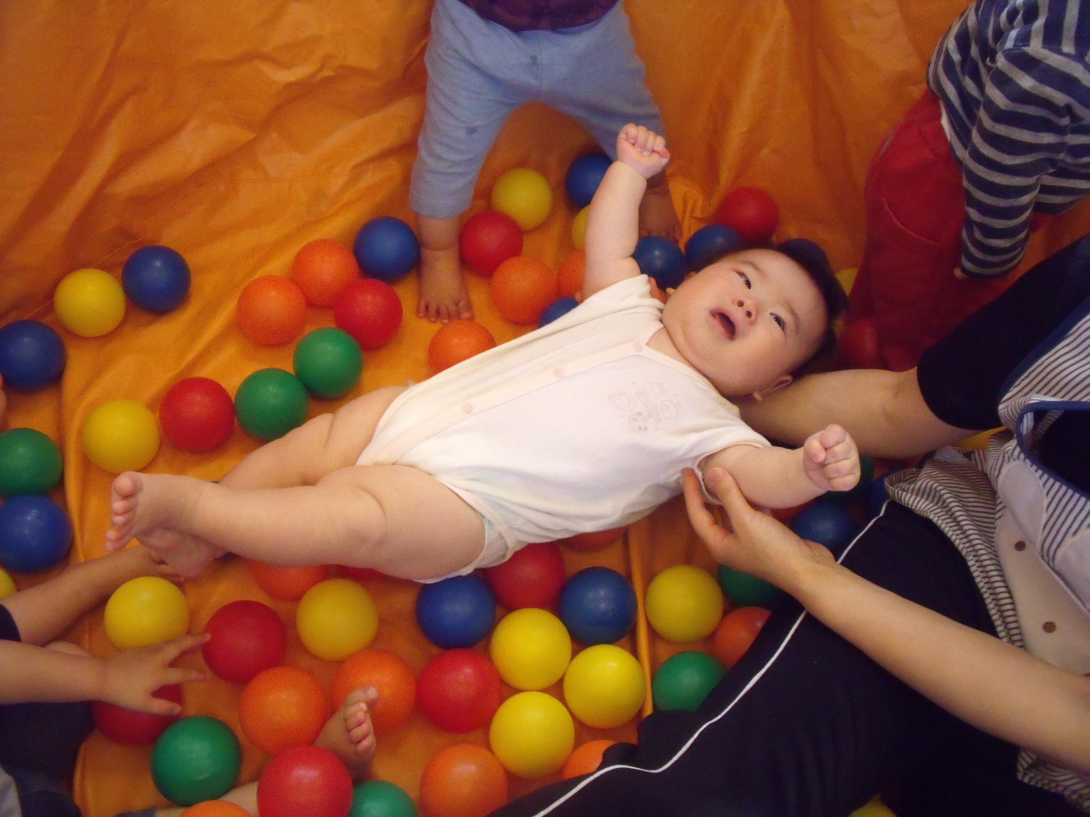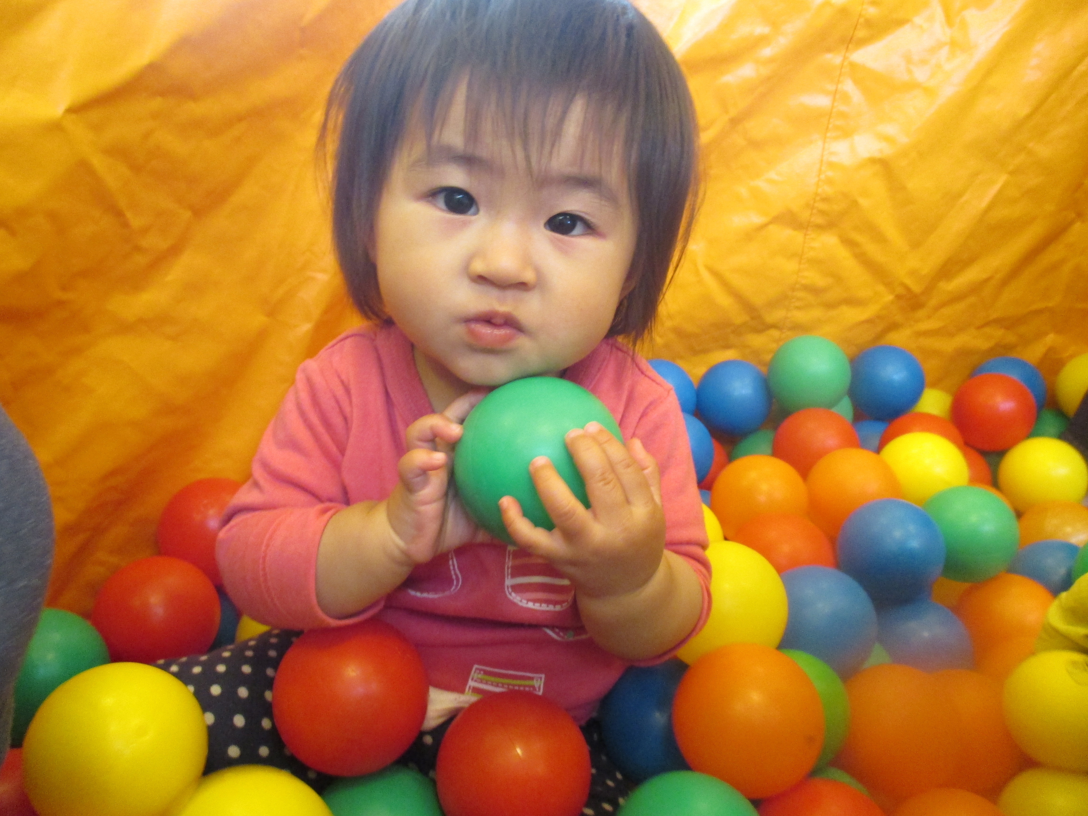 りす組さんとひよこ組さんが一緒に『ボールプールあそび』を行っています。
