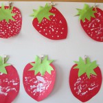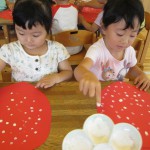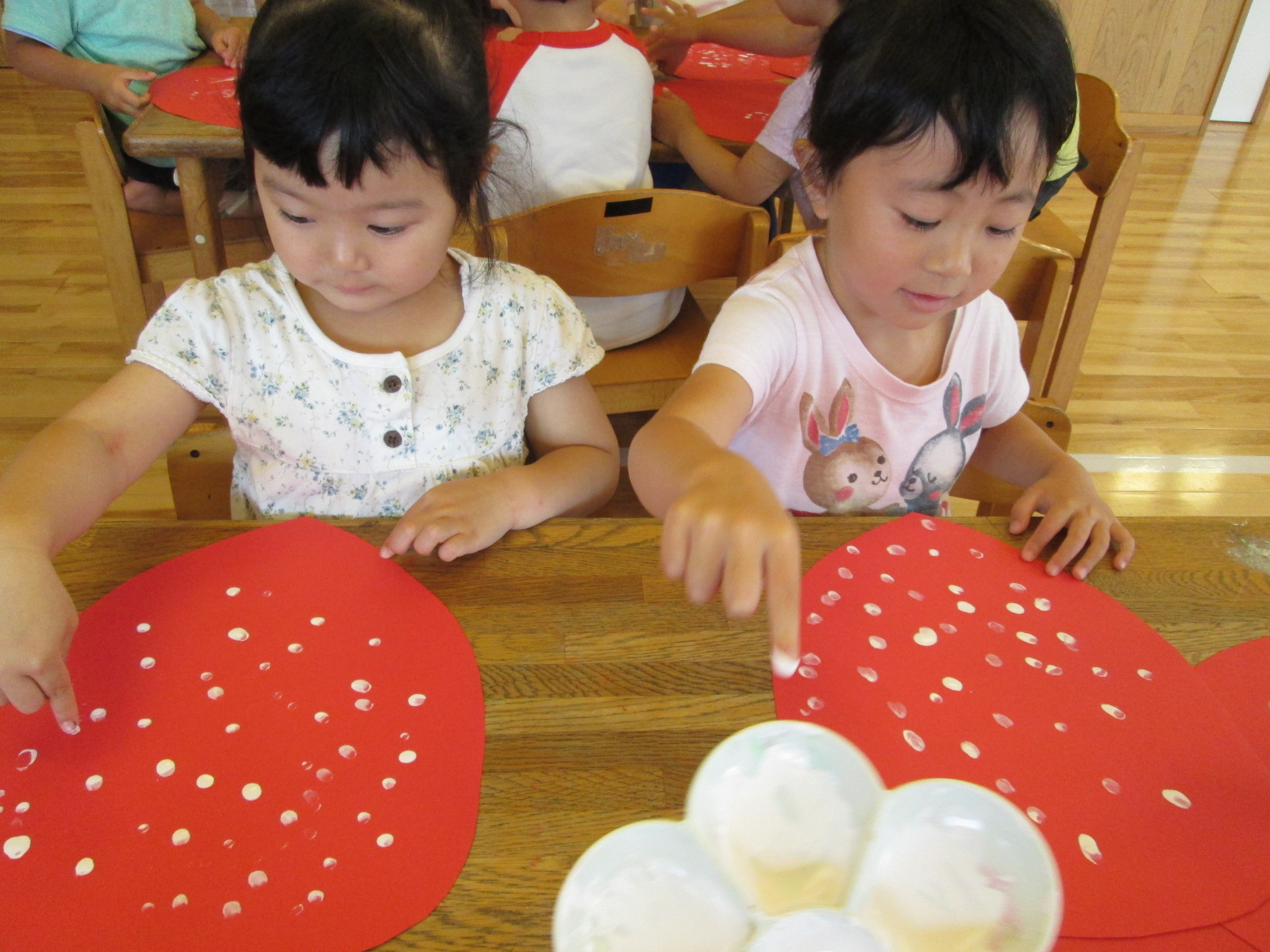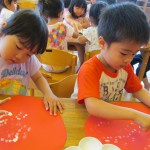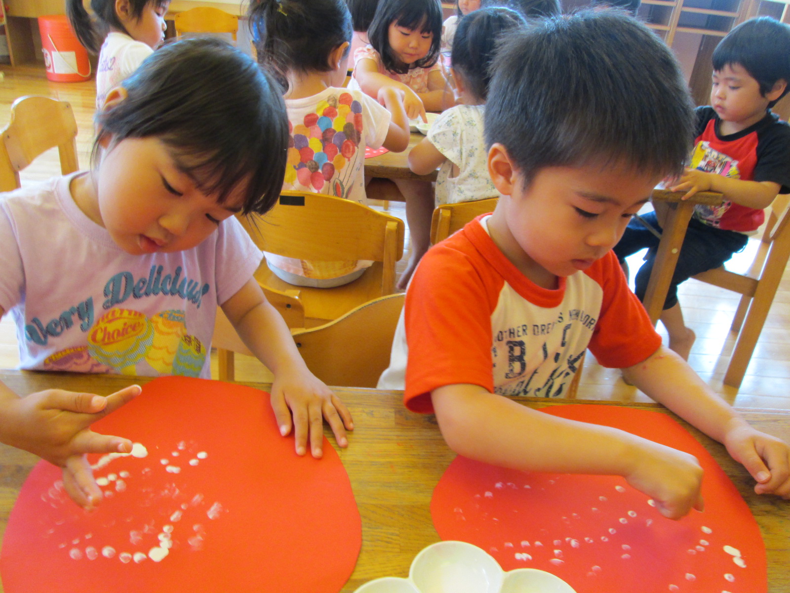 ぱんだ組さんは、筆のかわりに指先を使って絵の具あそび。