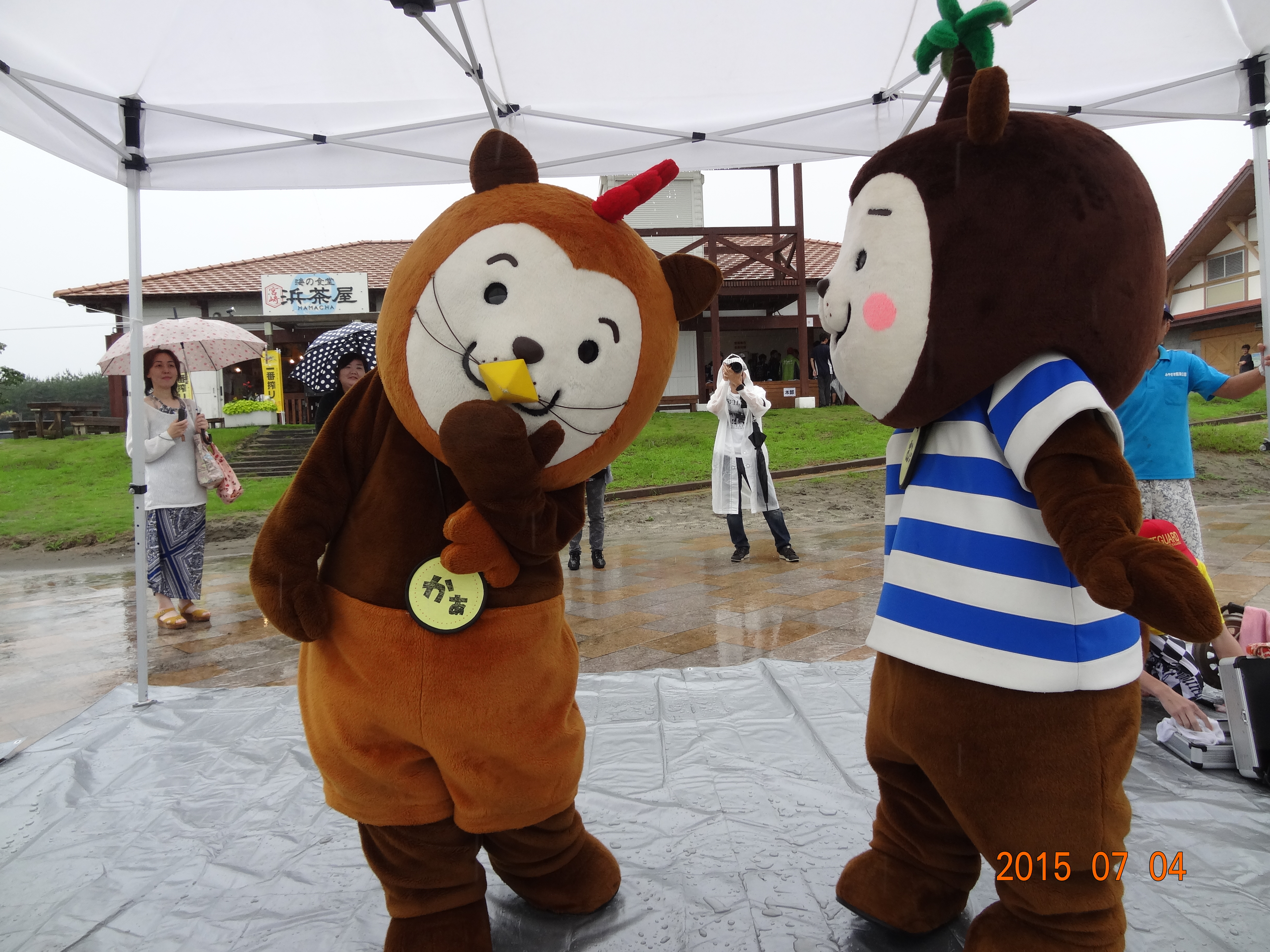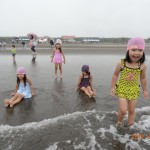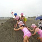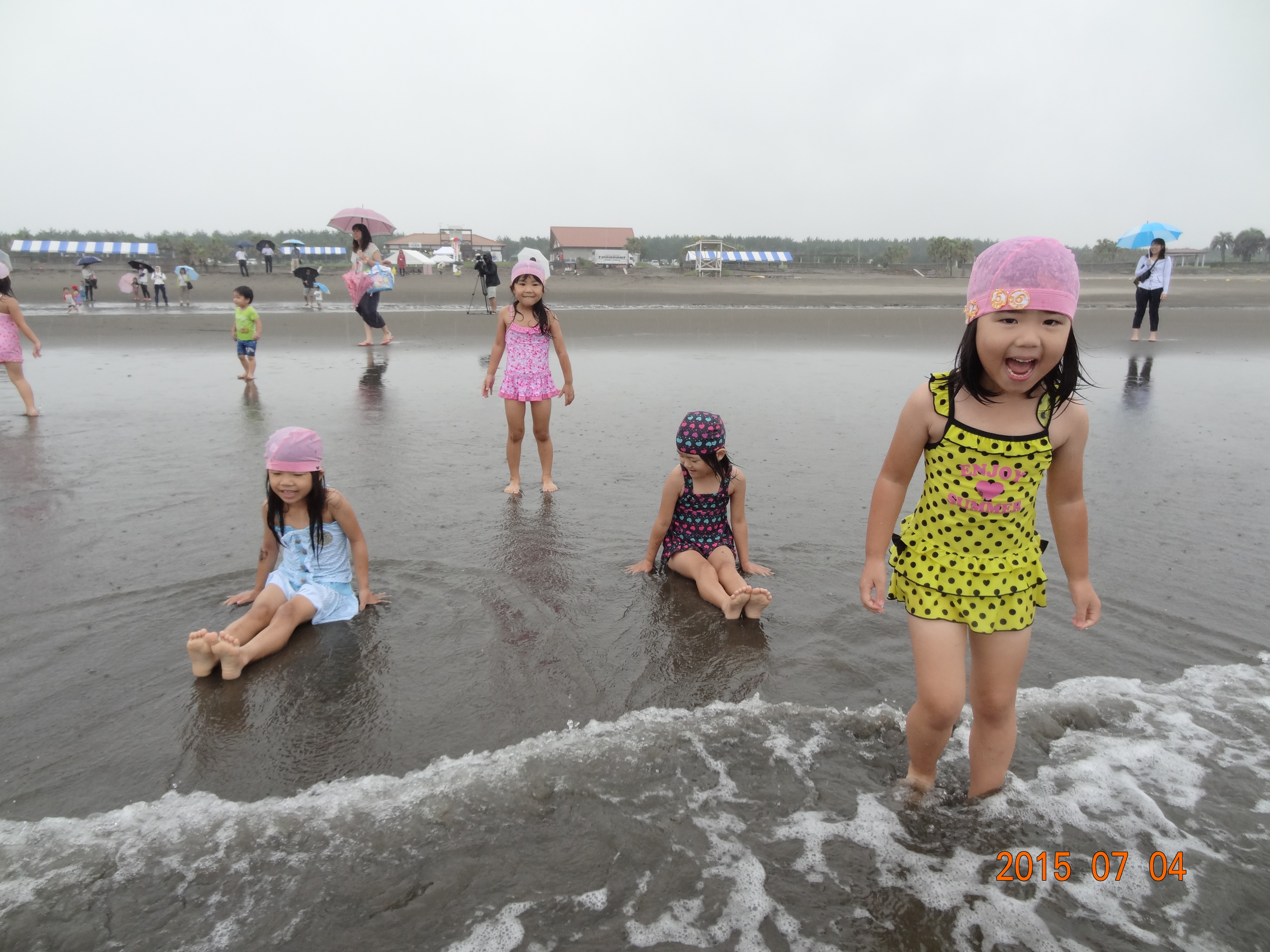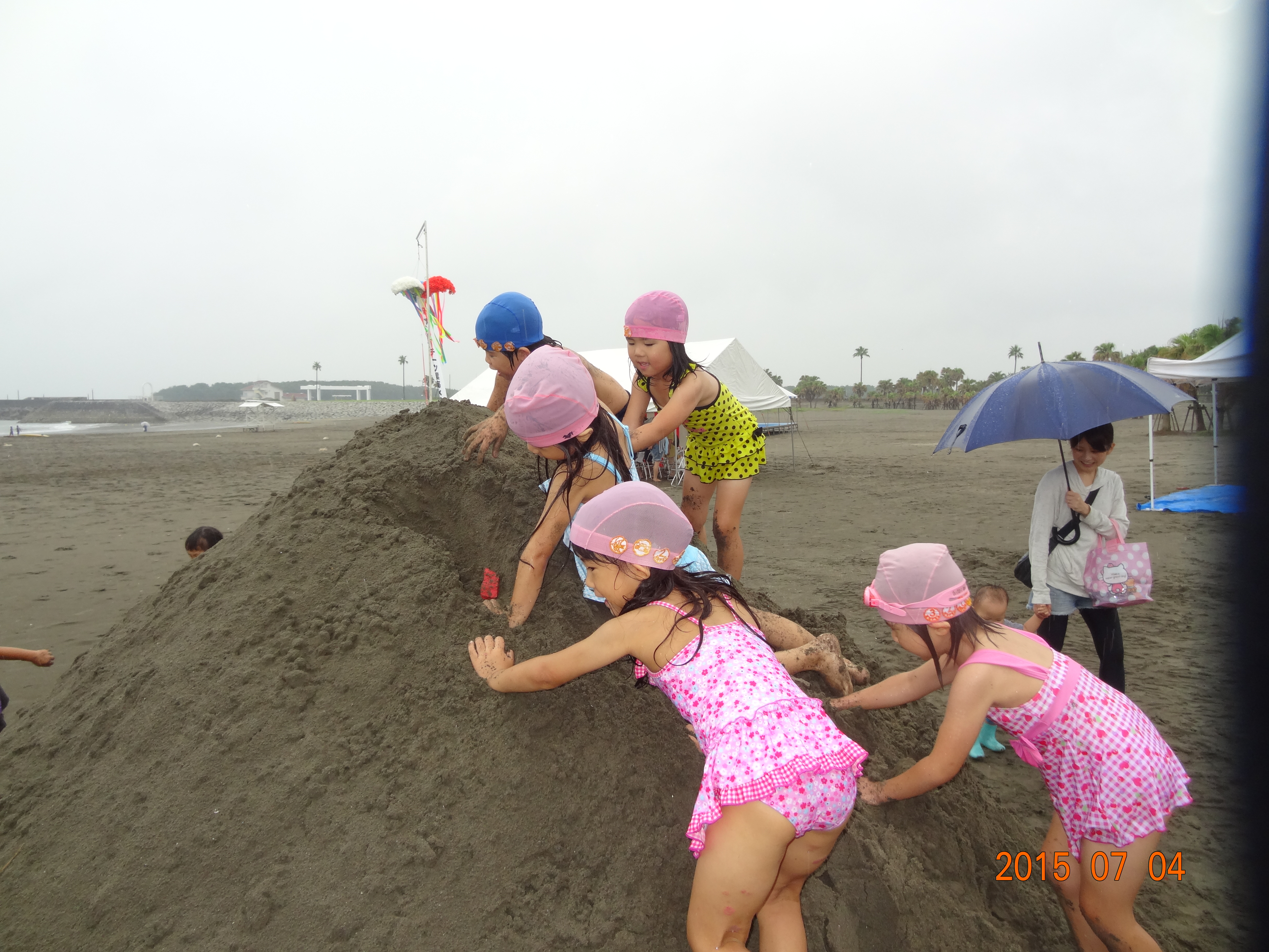海開き 7月4日(土) 今年もサンビーチ一ツ葉の海開きに招待され、きりん組さんが参加してきました。 小雨のパラつく中でしたが、みやざき犬のダンスショーや轟太鼓の演奏を楽しんだり、砂の山や波打ち際で歓声をあげながら思う存分遊んできましたよ。