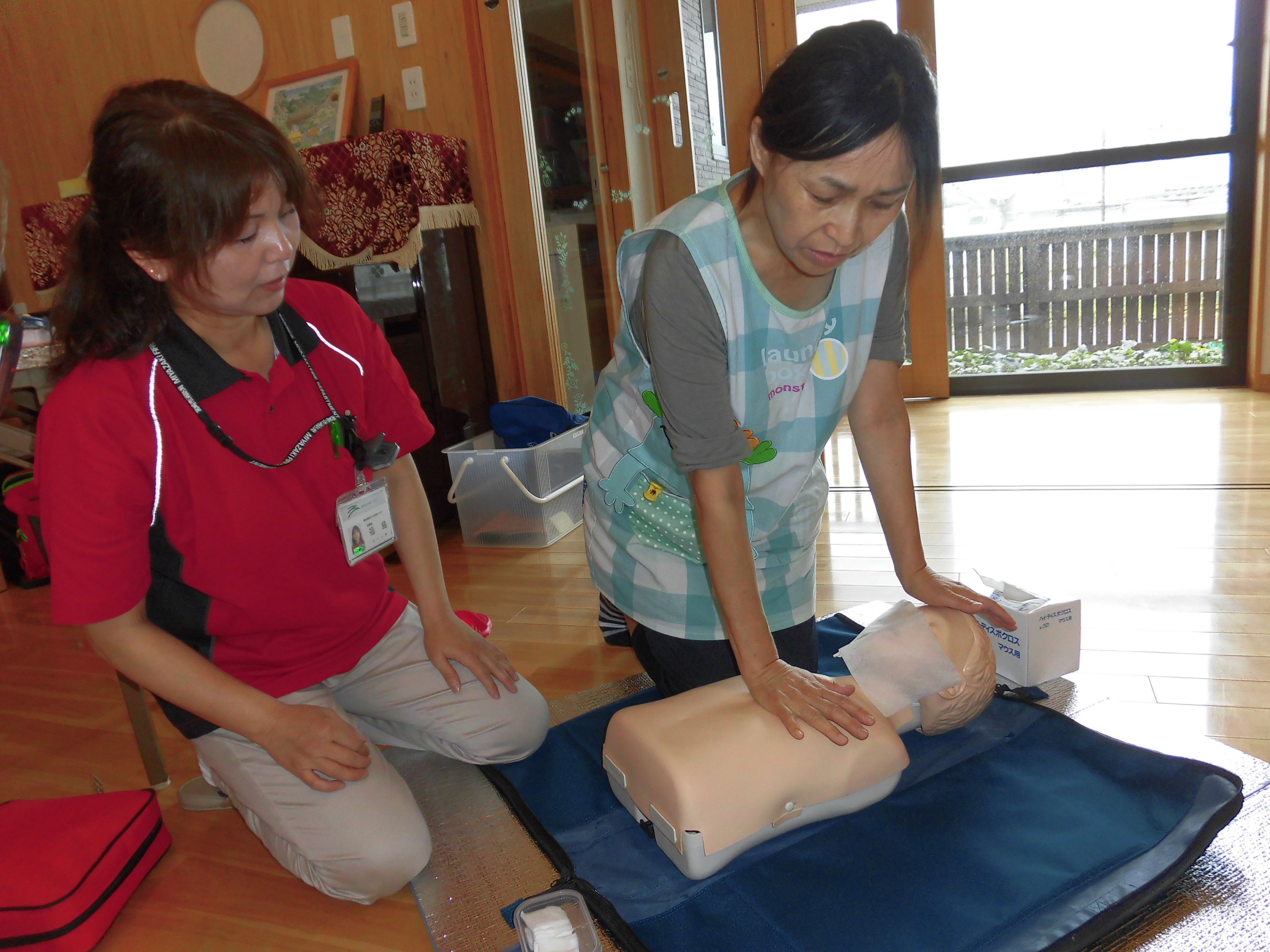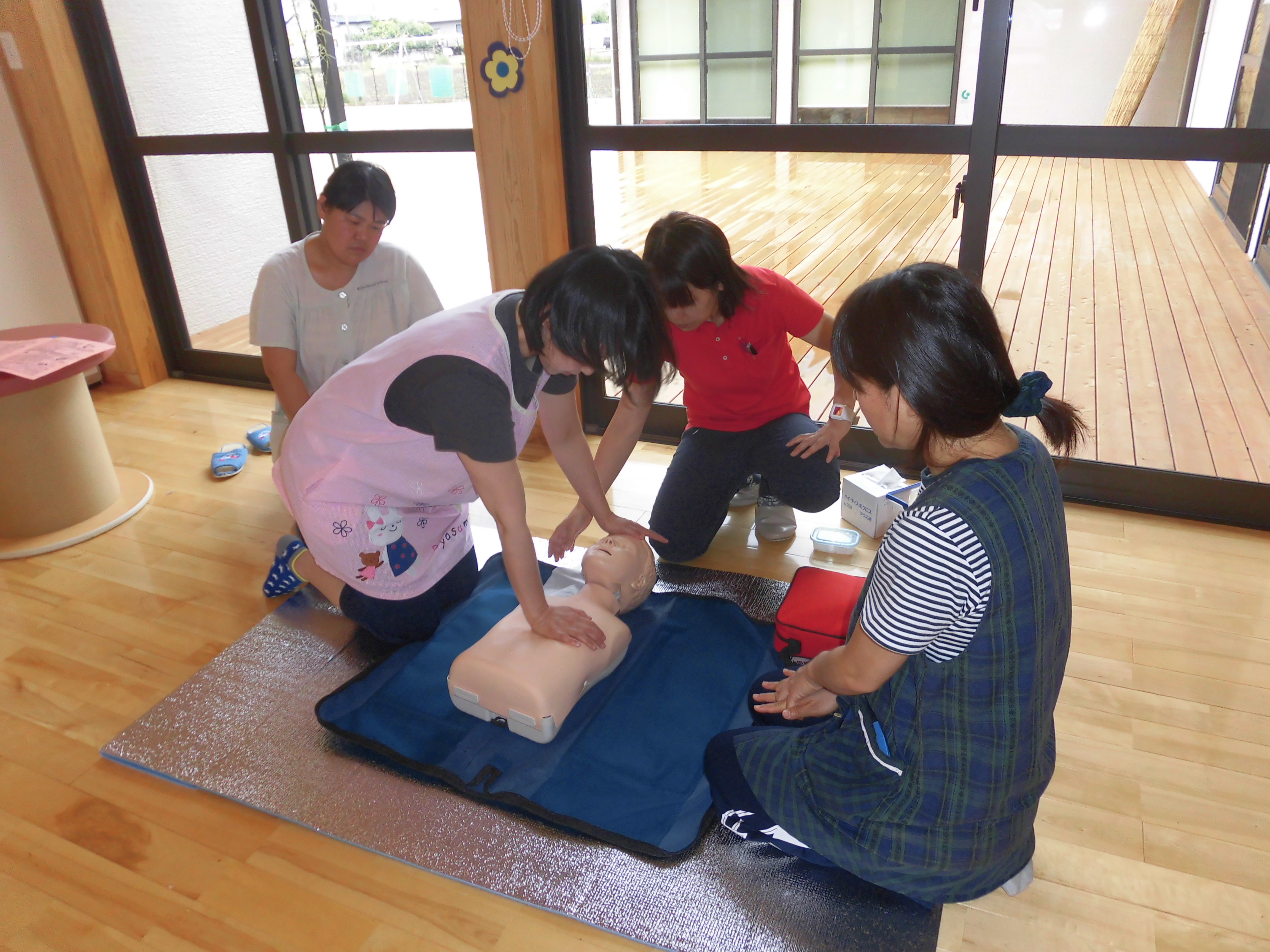 救急講座 7月1日(水) 水遊びが始まる前に、心肺蘇生法の勉強会を行いました。 人工呼吸やAEDの操作方法を学びましたよ。 講習を受けることで、いざというときに園内だけに限らず大事な命を守ることができますね。 知識と技術の再確認の為にも、毎年受講していきたいと思いました。