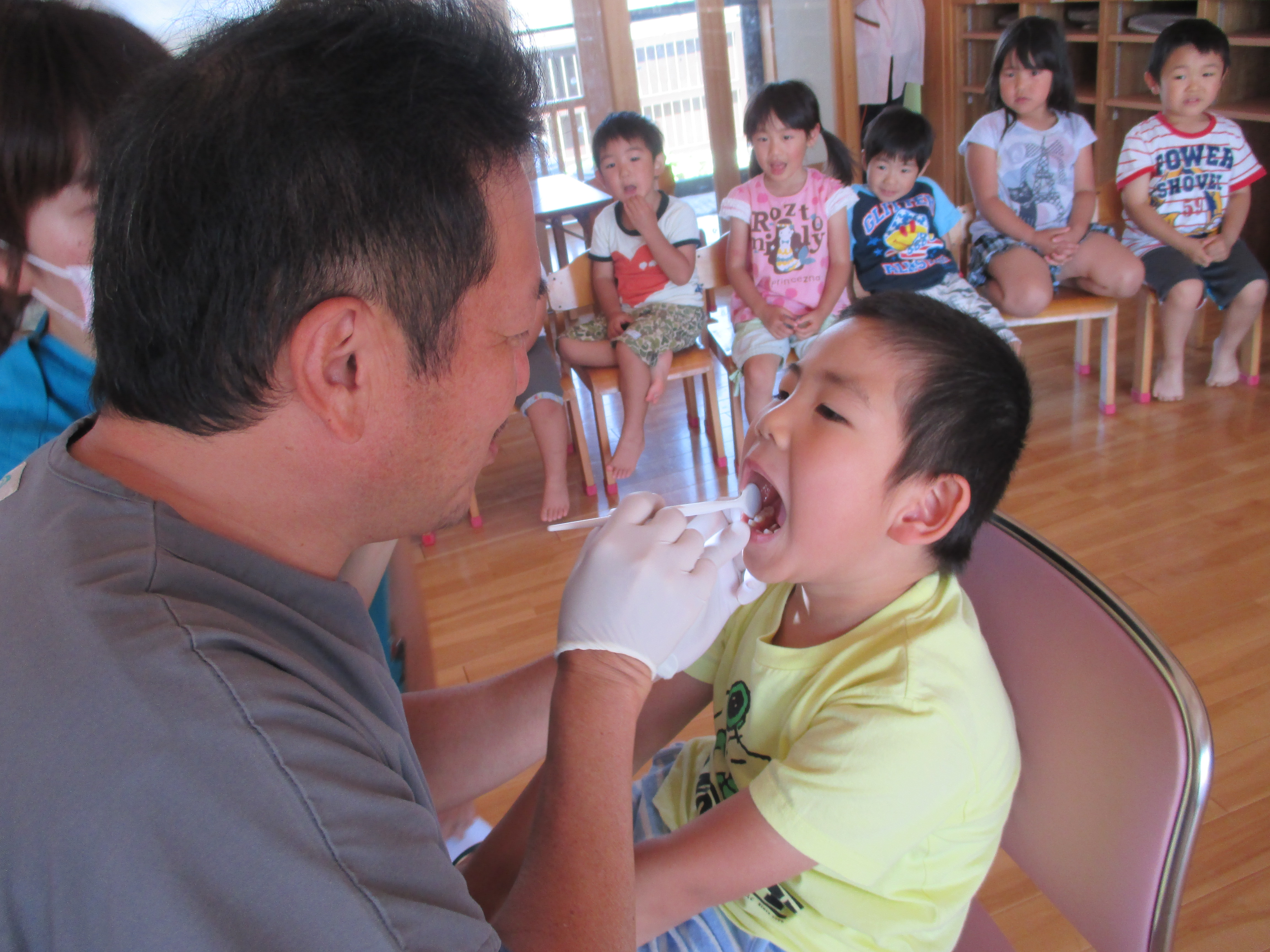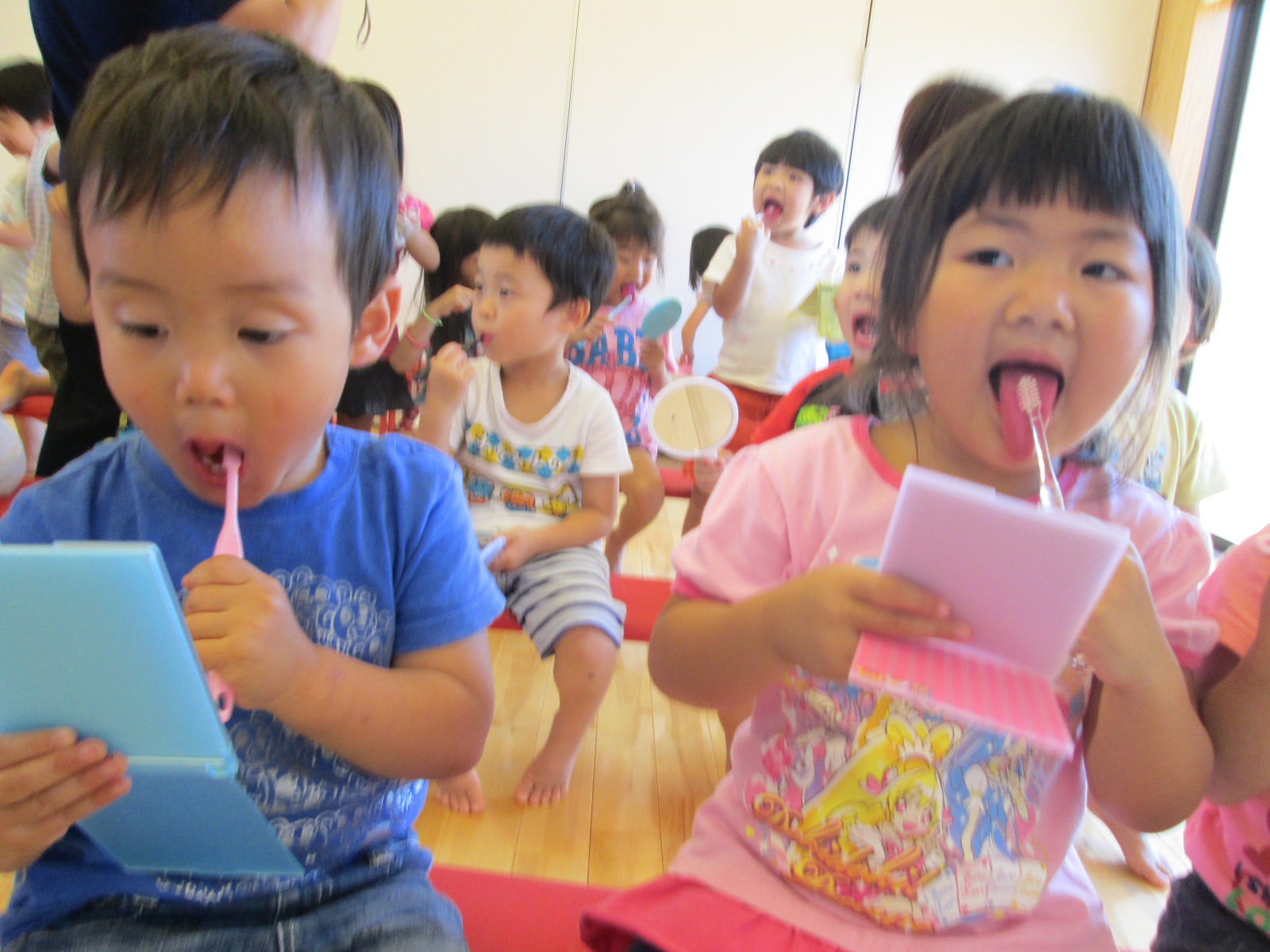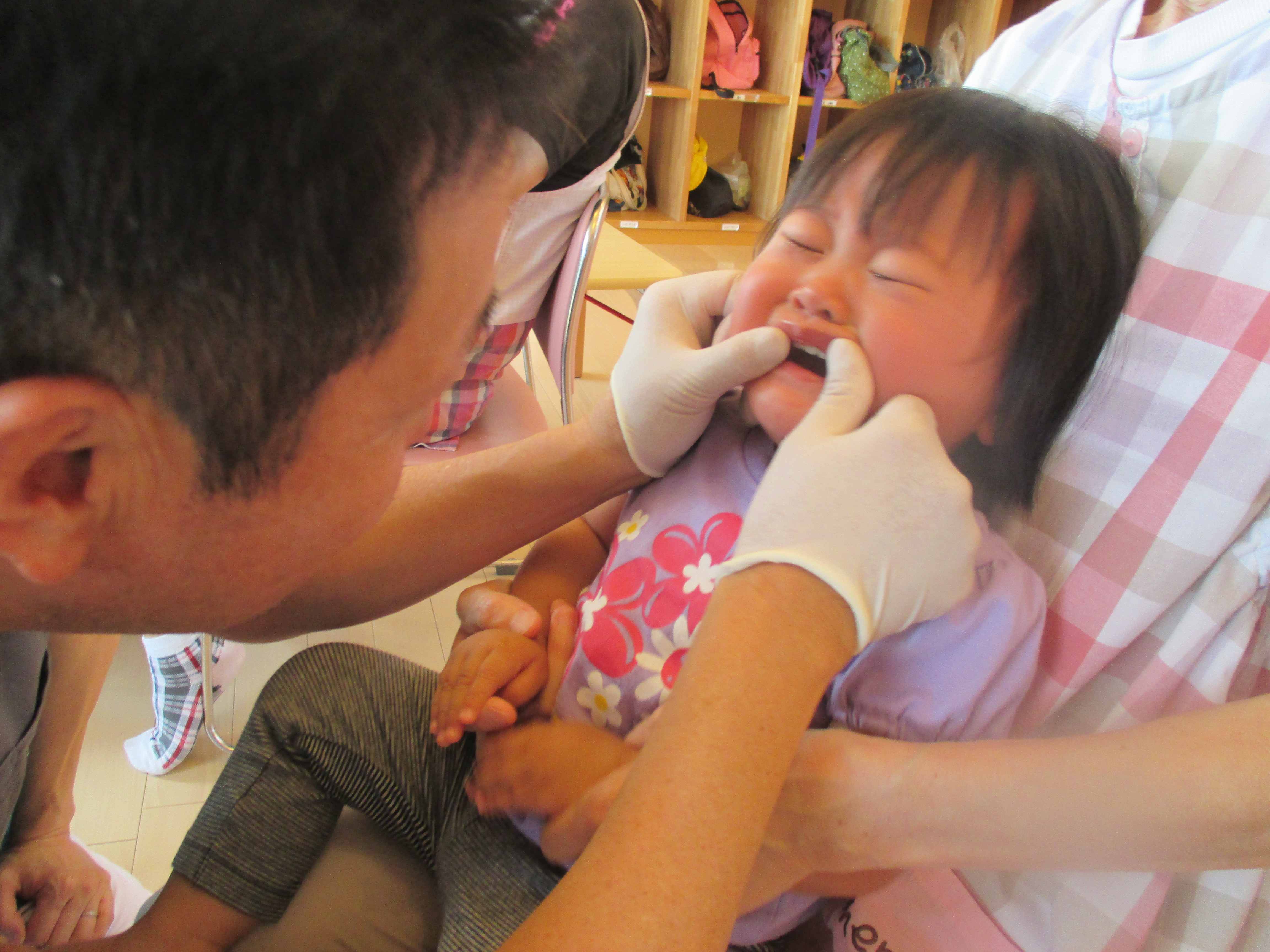 歯科検診 6月4日(木) 歯科検診を行いました。『どれどれ~虫歯はないかな?』未満児さんは大泣きです。 以上児さん達は、検診後にブラッシング指導を行いましたよ。 染め出しを行った後、鏡を見ながらピンクに染まった部分を歯ブラシで綺麗に磨きます。みんな上手に磨けたかな?