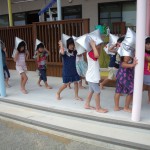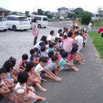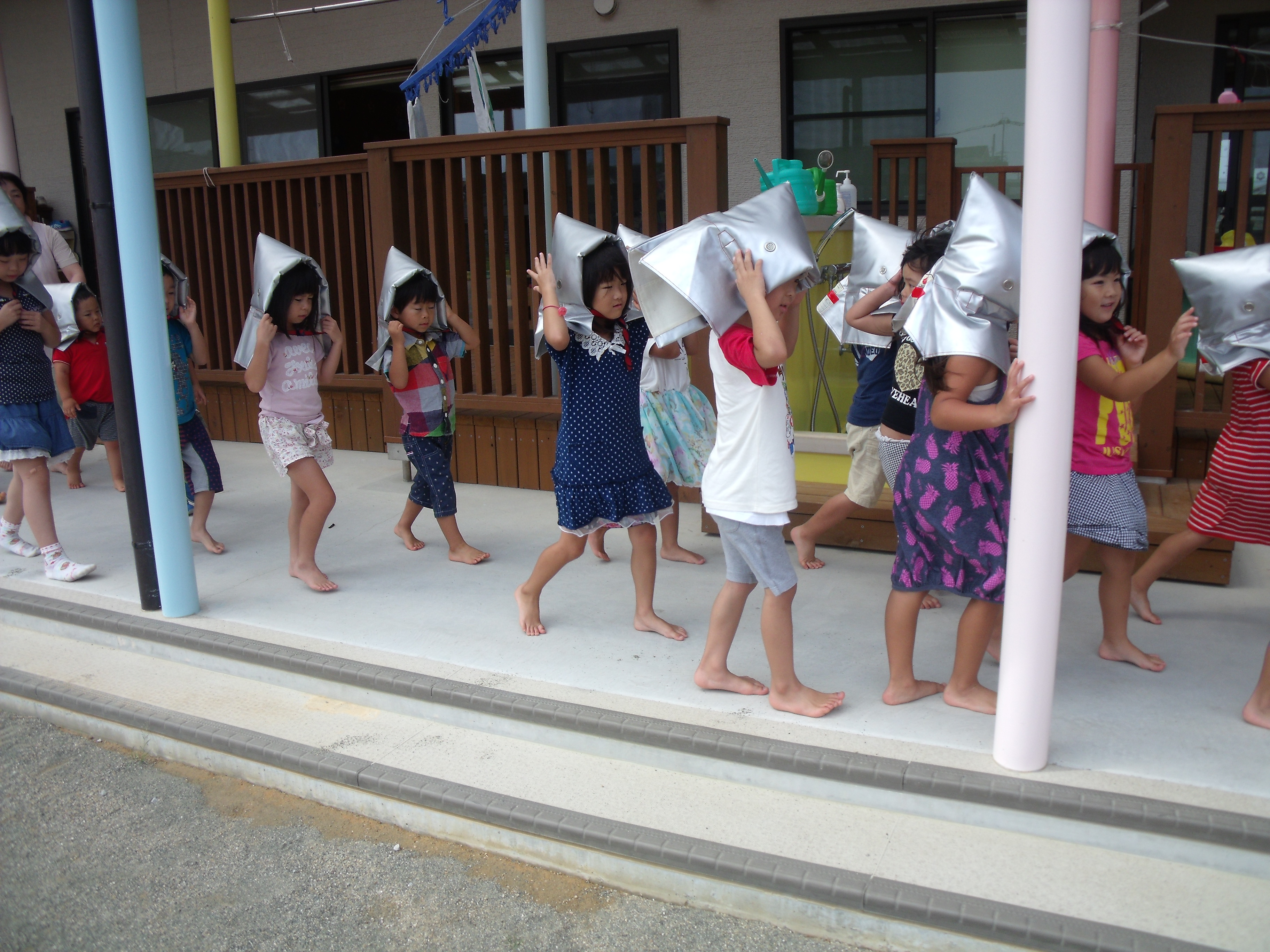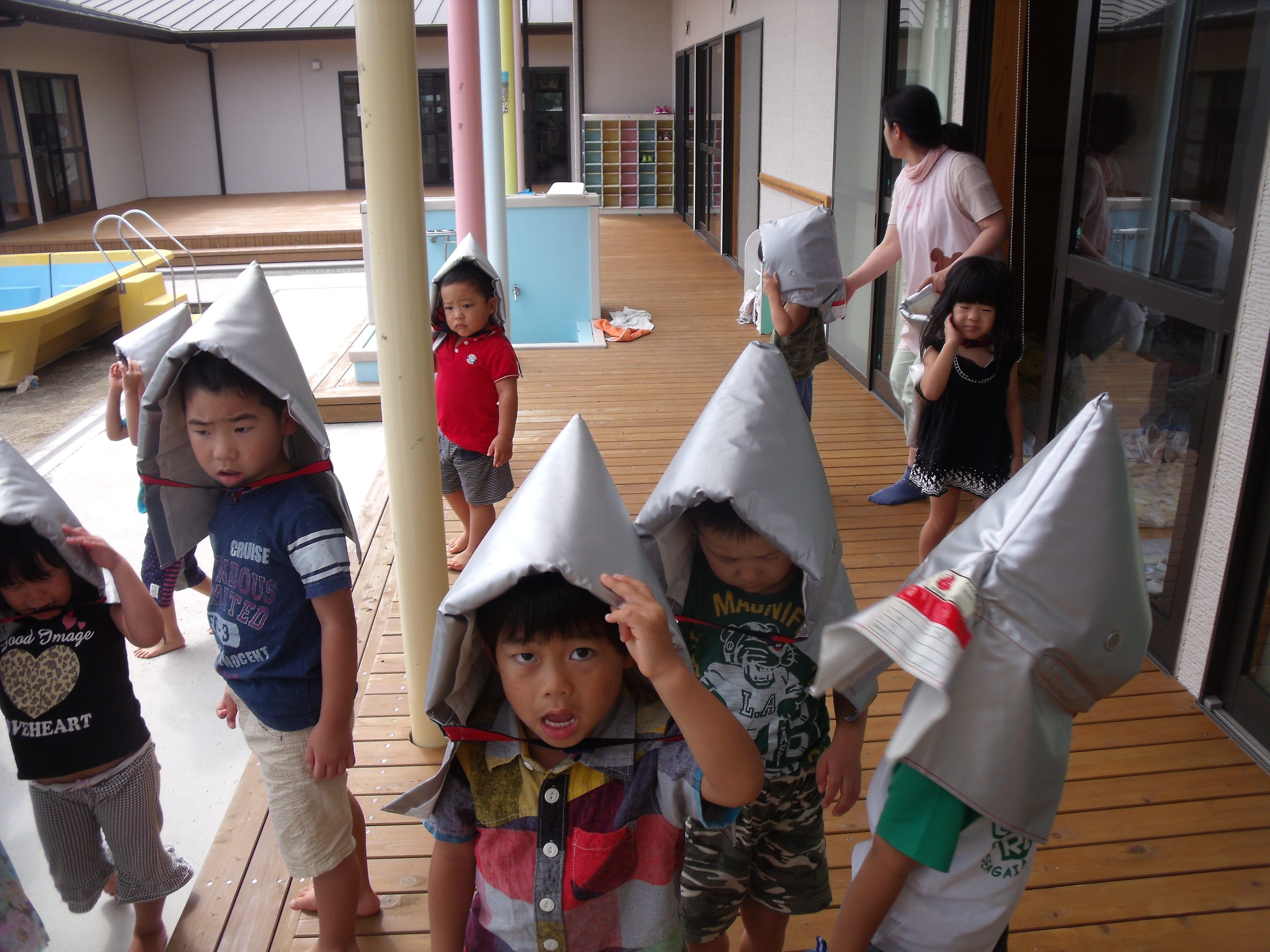 7月避難訓練 7月27日(月) 今月の避難訓練は、皆がスヤスヤ眠る時間帯に地震が発生したとの想定で実施しました。 おやつ前の時間帯で既に起きている子どももいましたが、熟睡している子どもも・・・。ベルの音に驚いて目覚め、防災頭巾を被って避難します。 地震はいつ起こるかわからないので、日頃からの訓練が大事ですね。