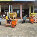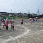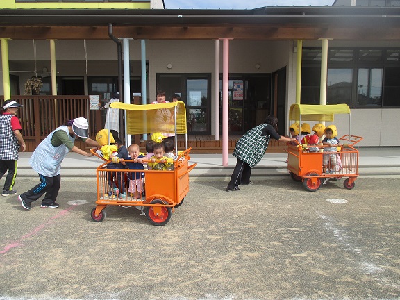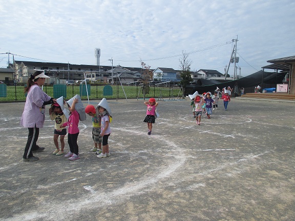 10月避難訓練 10月15日(木) 今回は近所の団地から火災が発生し、延焼のおそれがあるとの想定で訓練を行いました。 みんな素早い動きで避難しています。一連の流れが身についてきたようで、ベルが鳴ったら静かに放送を聞いて防災頭巾を被り避難することができるようになってきました。