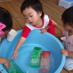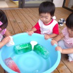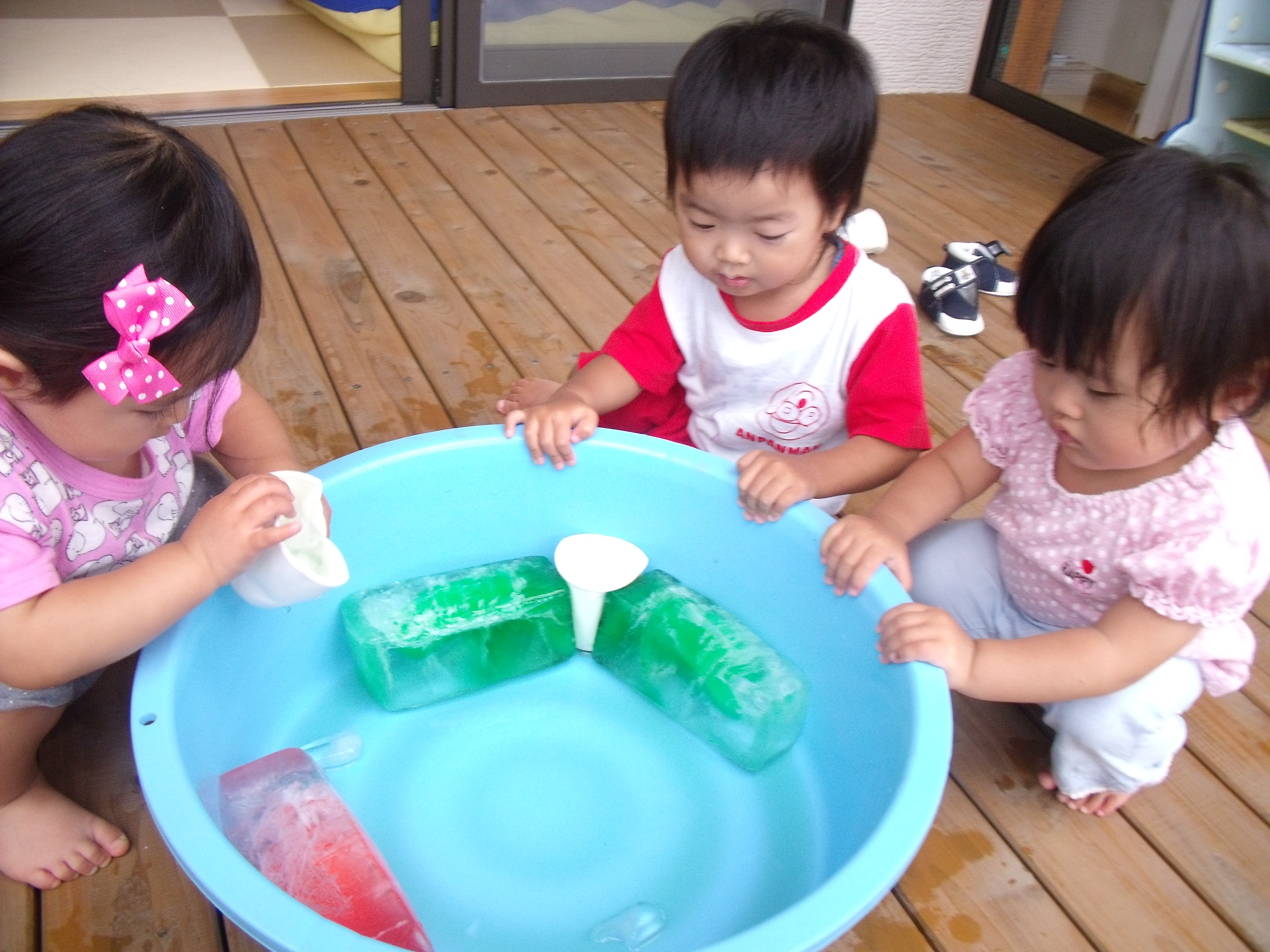 ひよこ組さんは、タライに色のついた大きな氷を入れて遊んでいますよ。