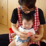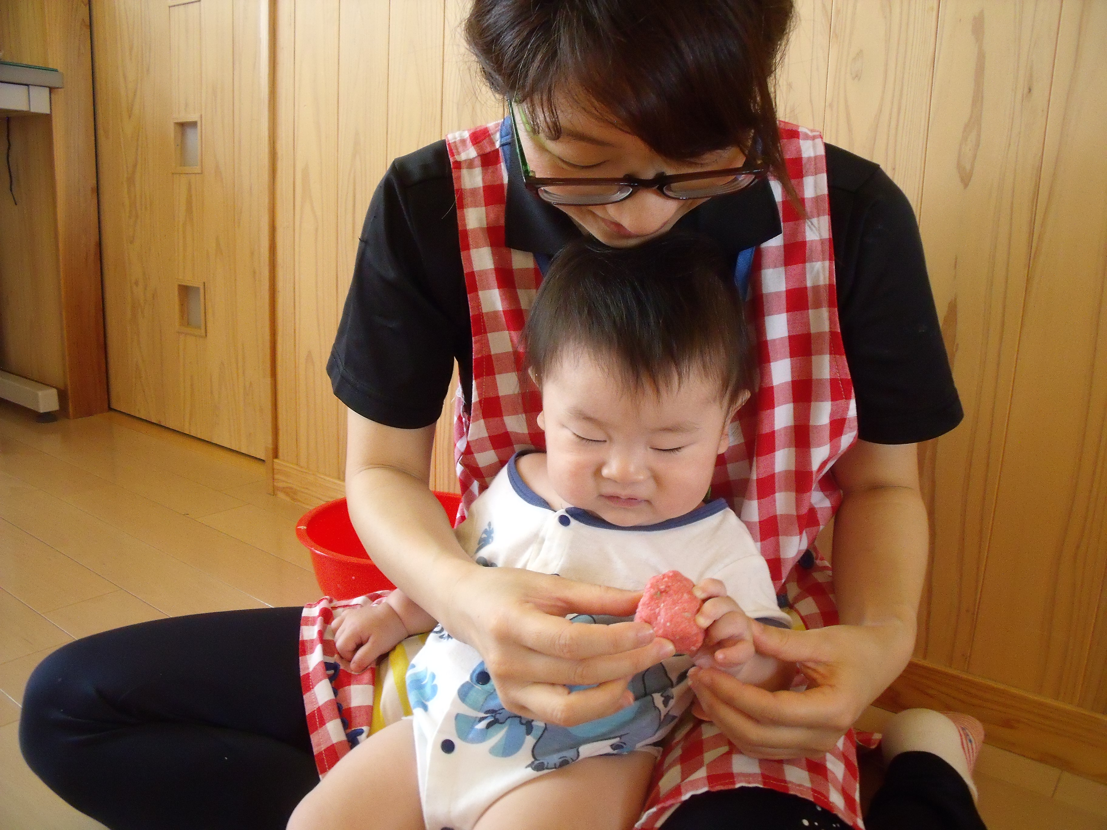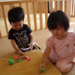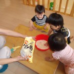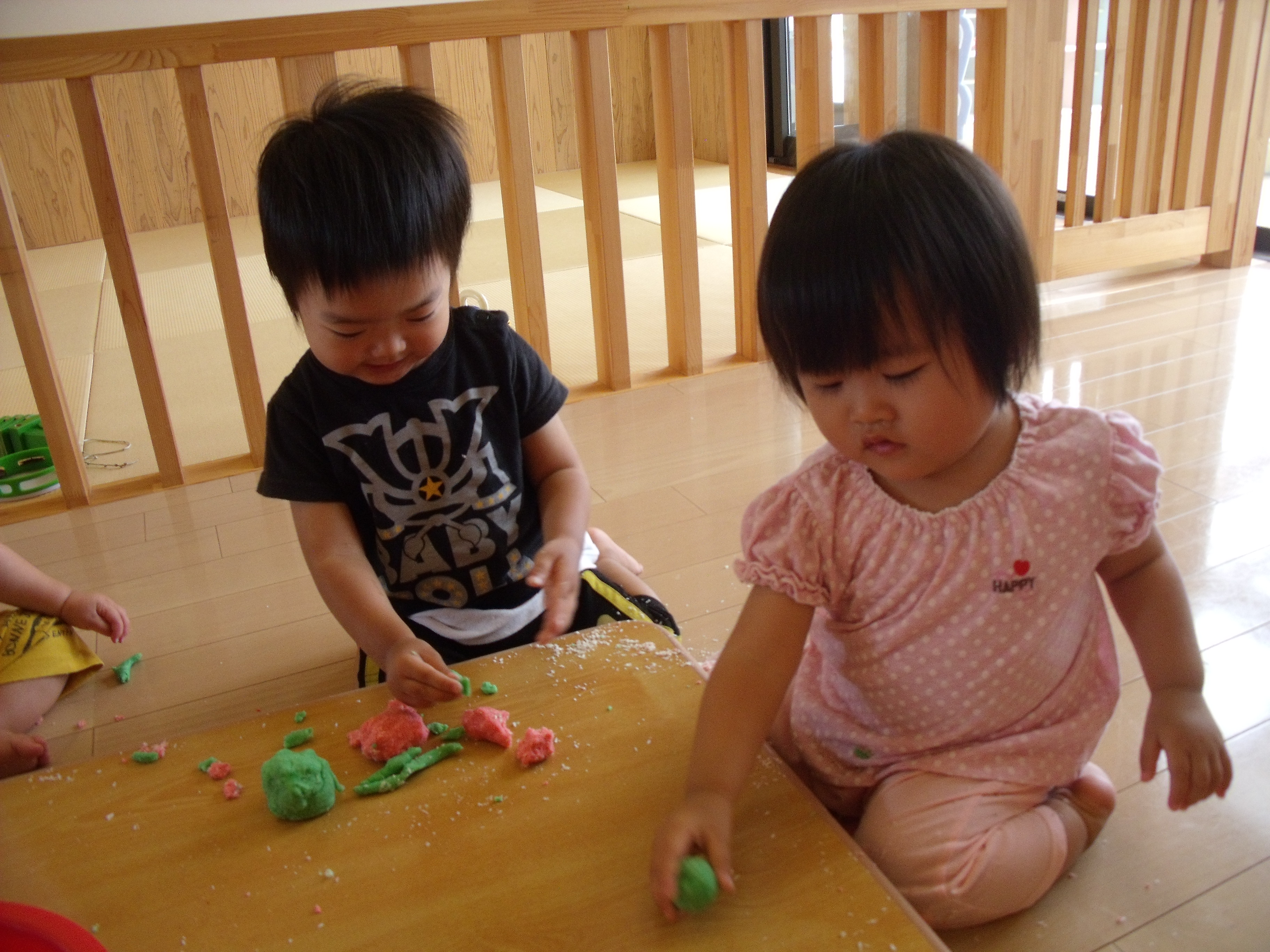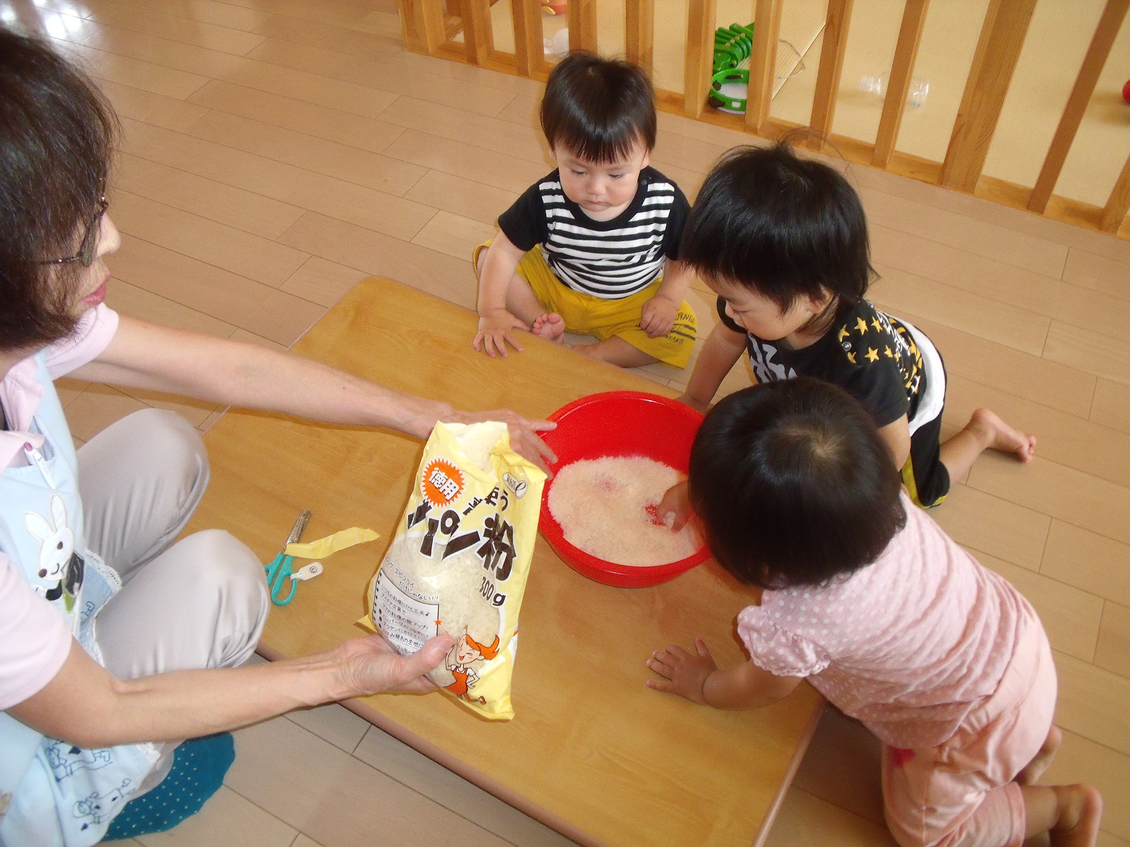 ひよこ組さんが、パン粉粘土あそびを行っています。