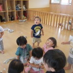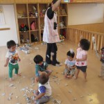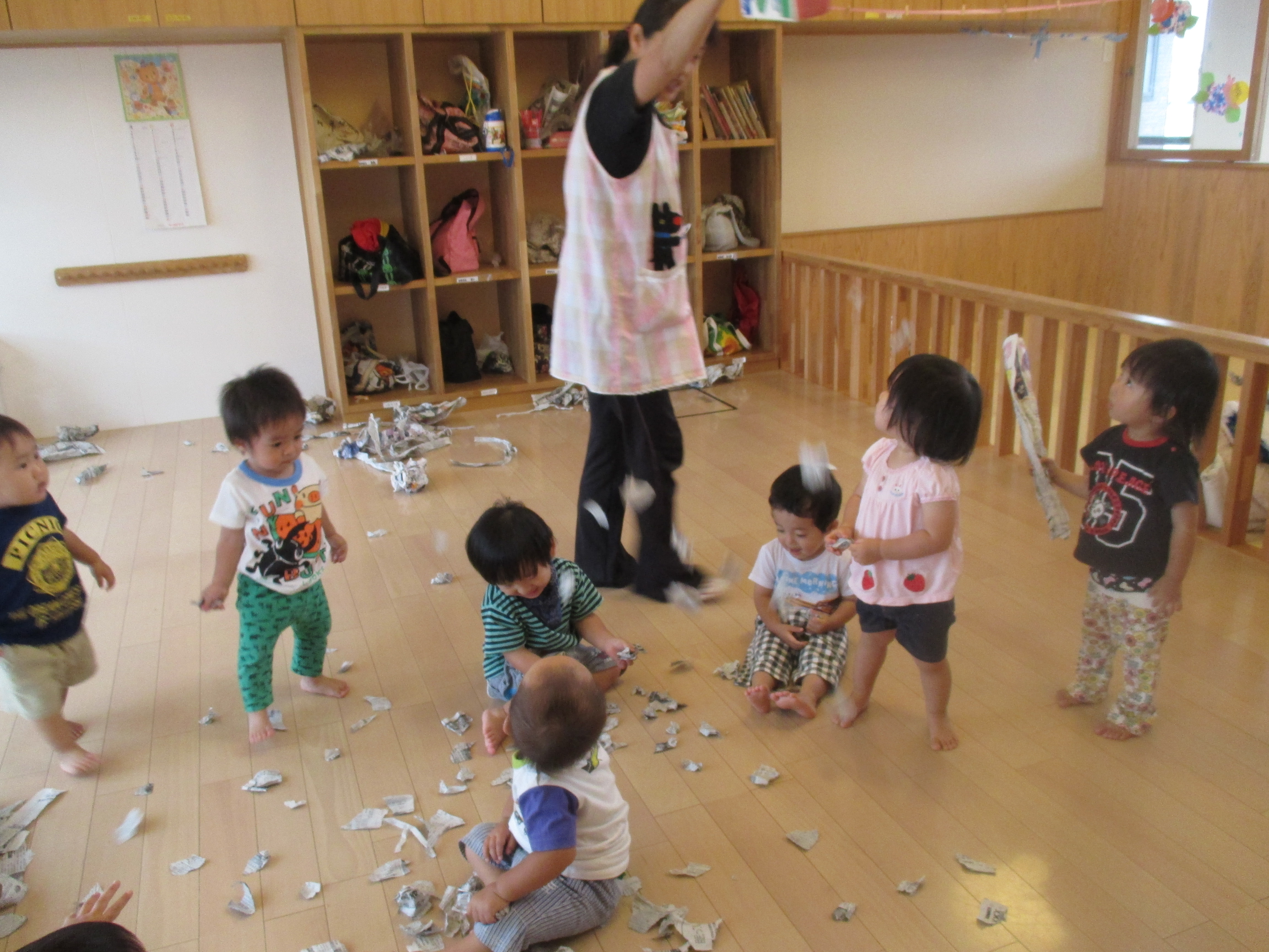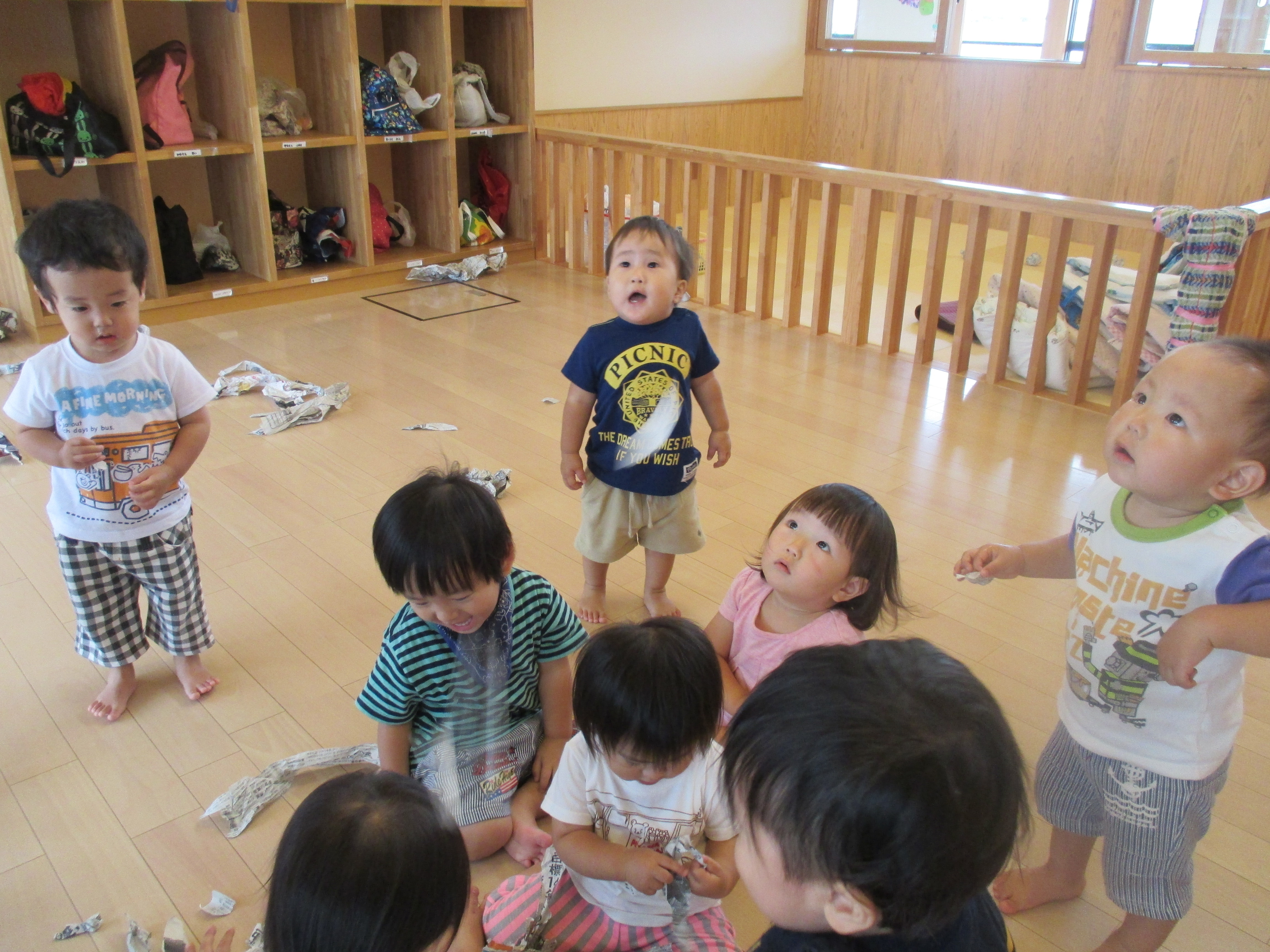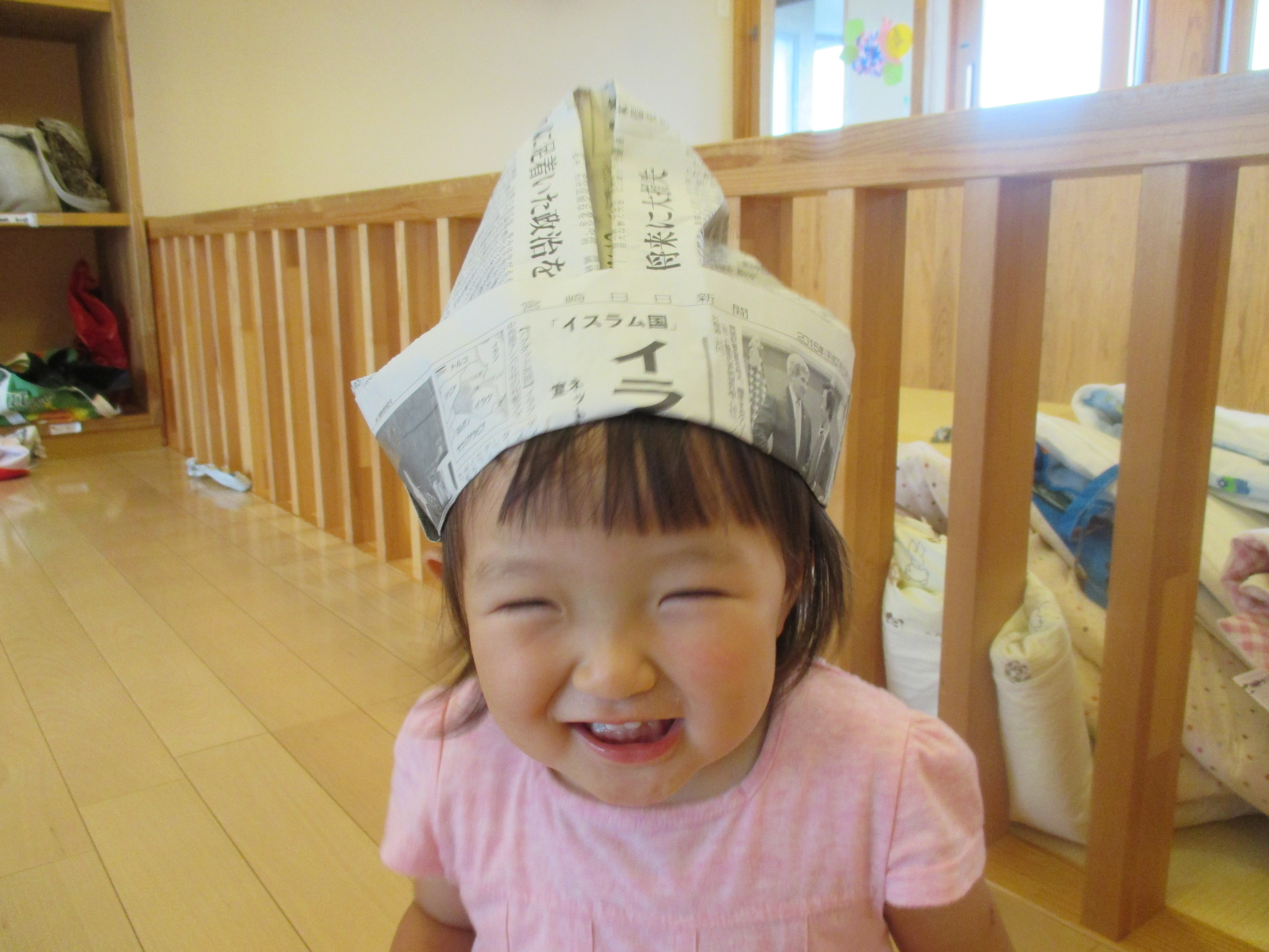 新聞紙あそび 6月15日(月) 雨続きでストレスが溜まりますね~。 りす組さんは、お部屋で新聞紙あそびを行いました。 新聞紙で帽子や洋服を作ったり、ビリビリ破って紙ふぶきで遊んだり・・・。 部屋中に新聞紙をまき散らして、ダイナミックに遊びました。