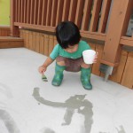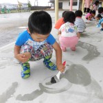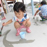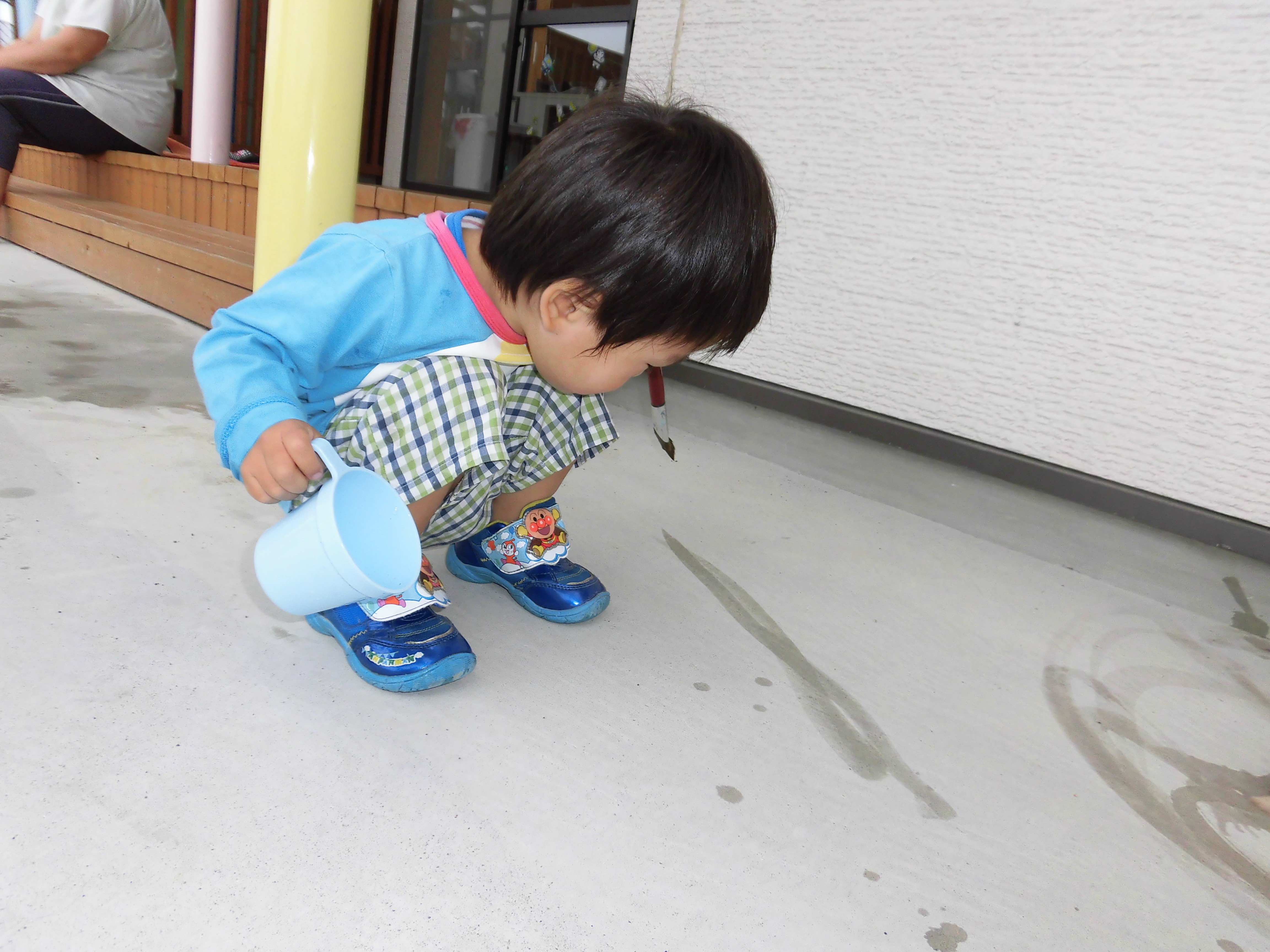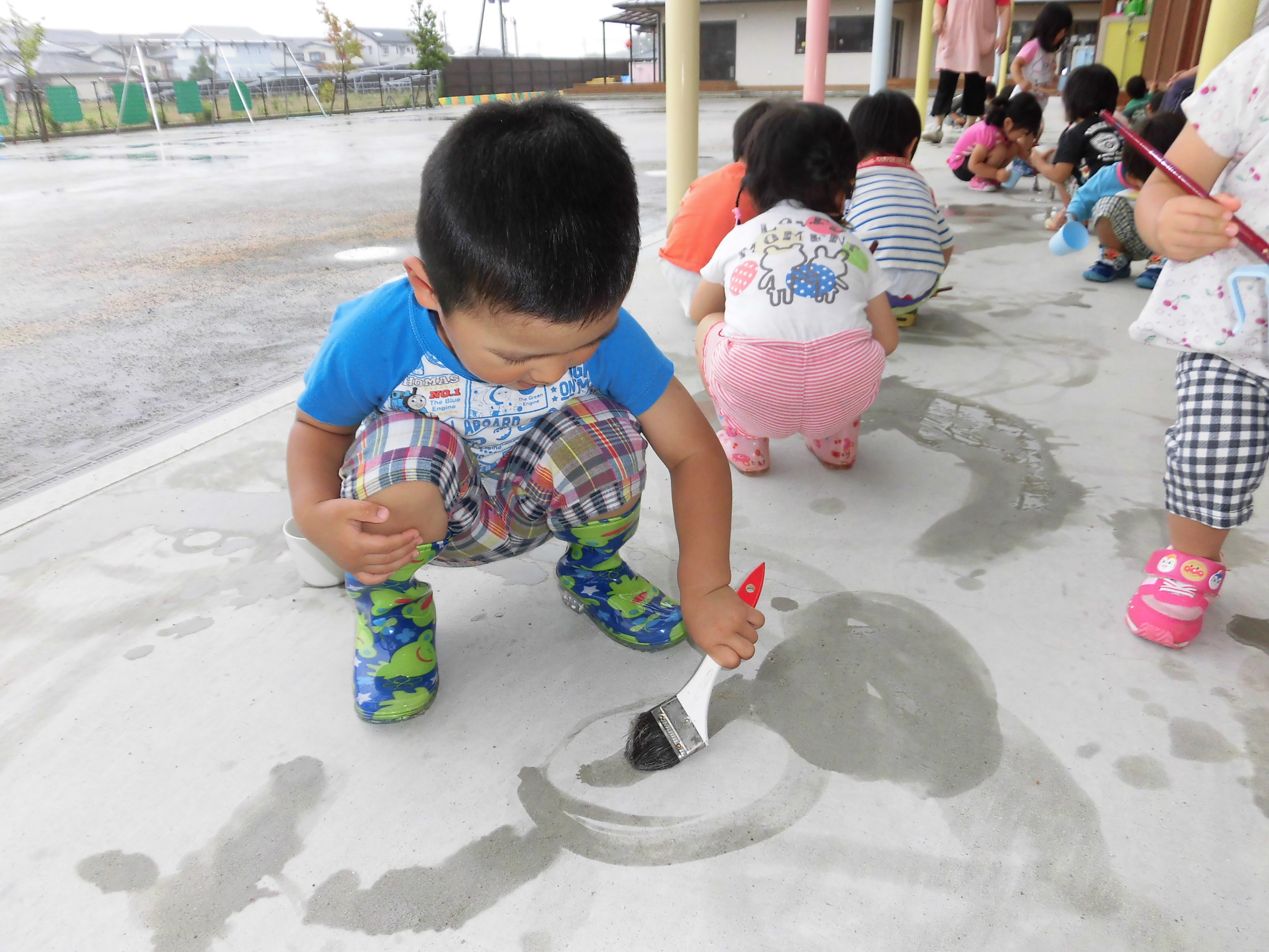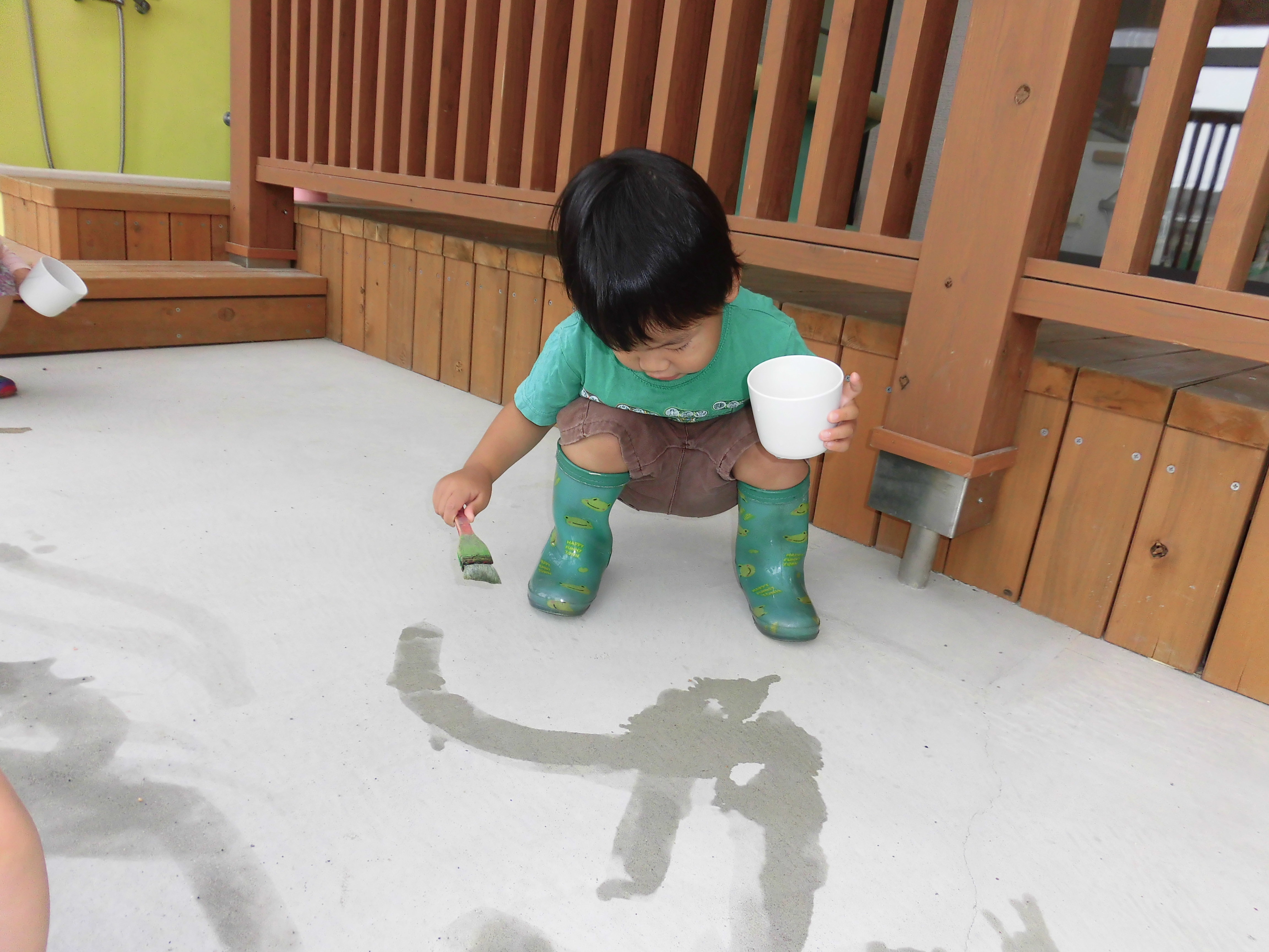 水絵 6月8日(月) 今日も、お外は雨・・・園庭で遊べない日が続きます。 うさぎ組さんは、テラスで水絵あそびを始めました。 画伯達がダイナミックな作品を仕上げましたが、残念ながらコンクリートが乾き幻の作品となりました。