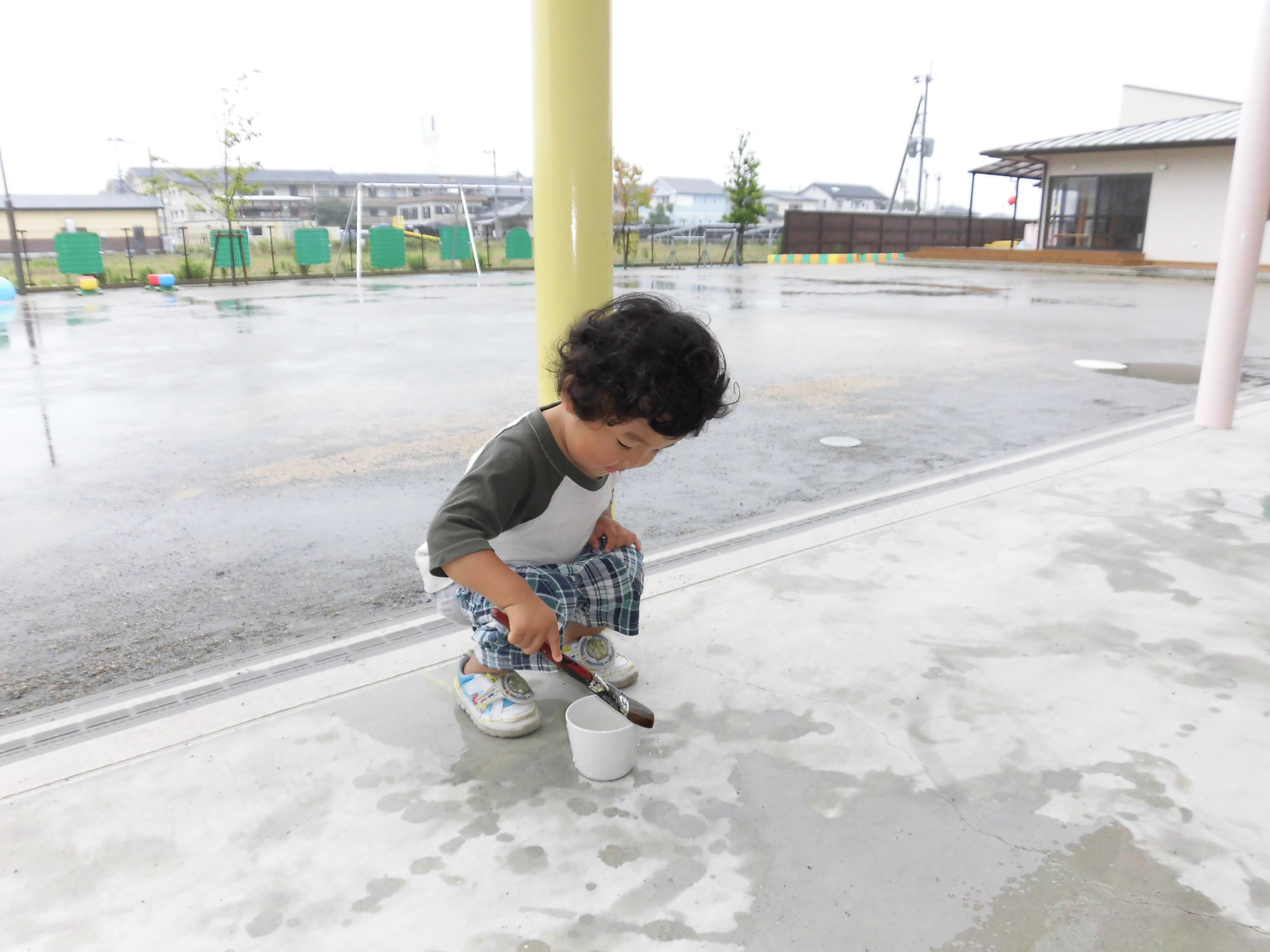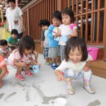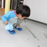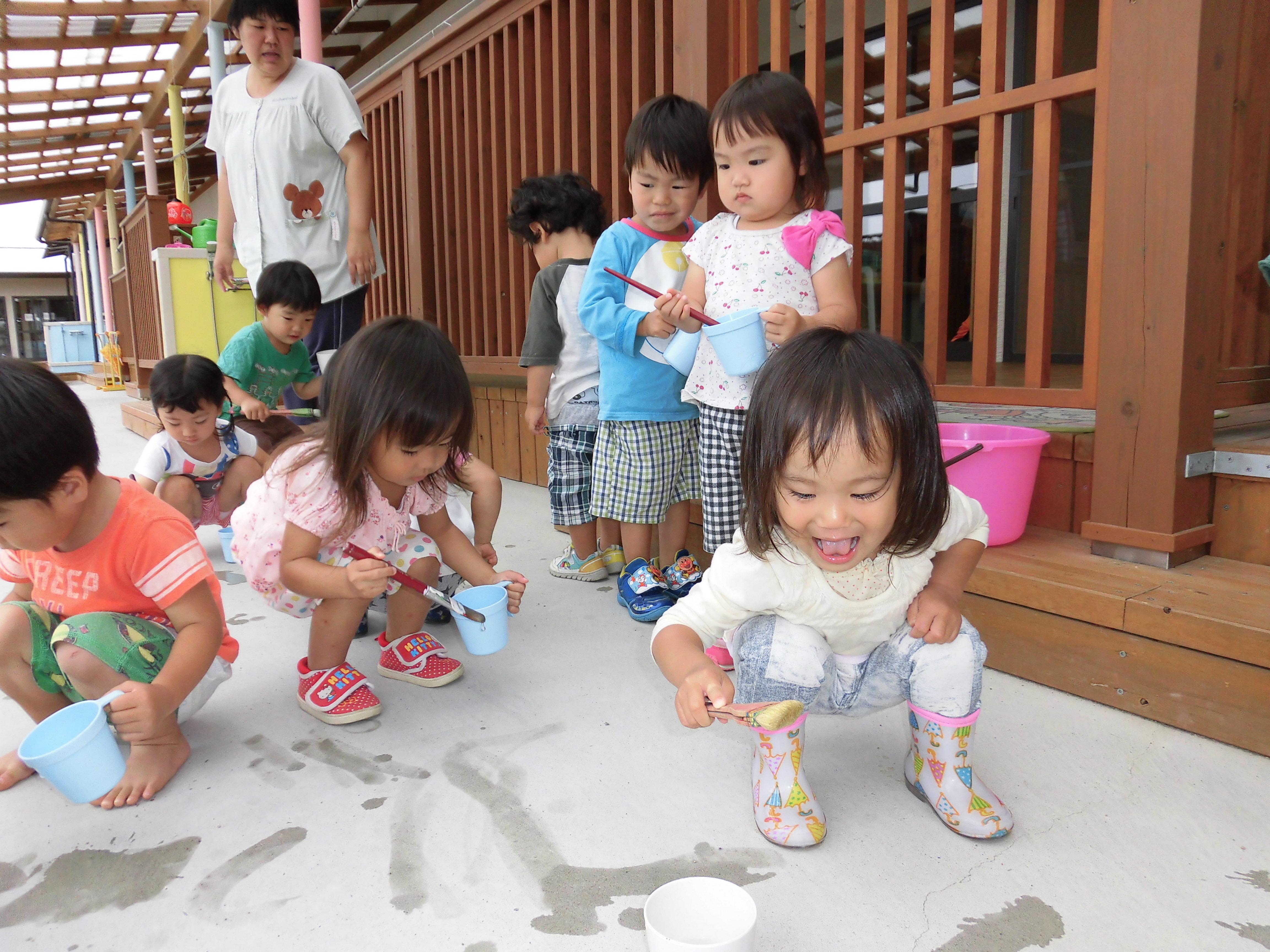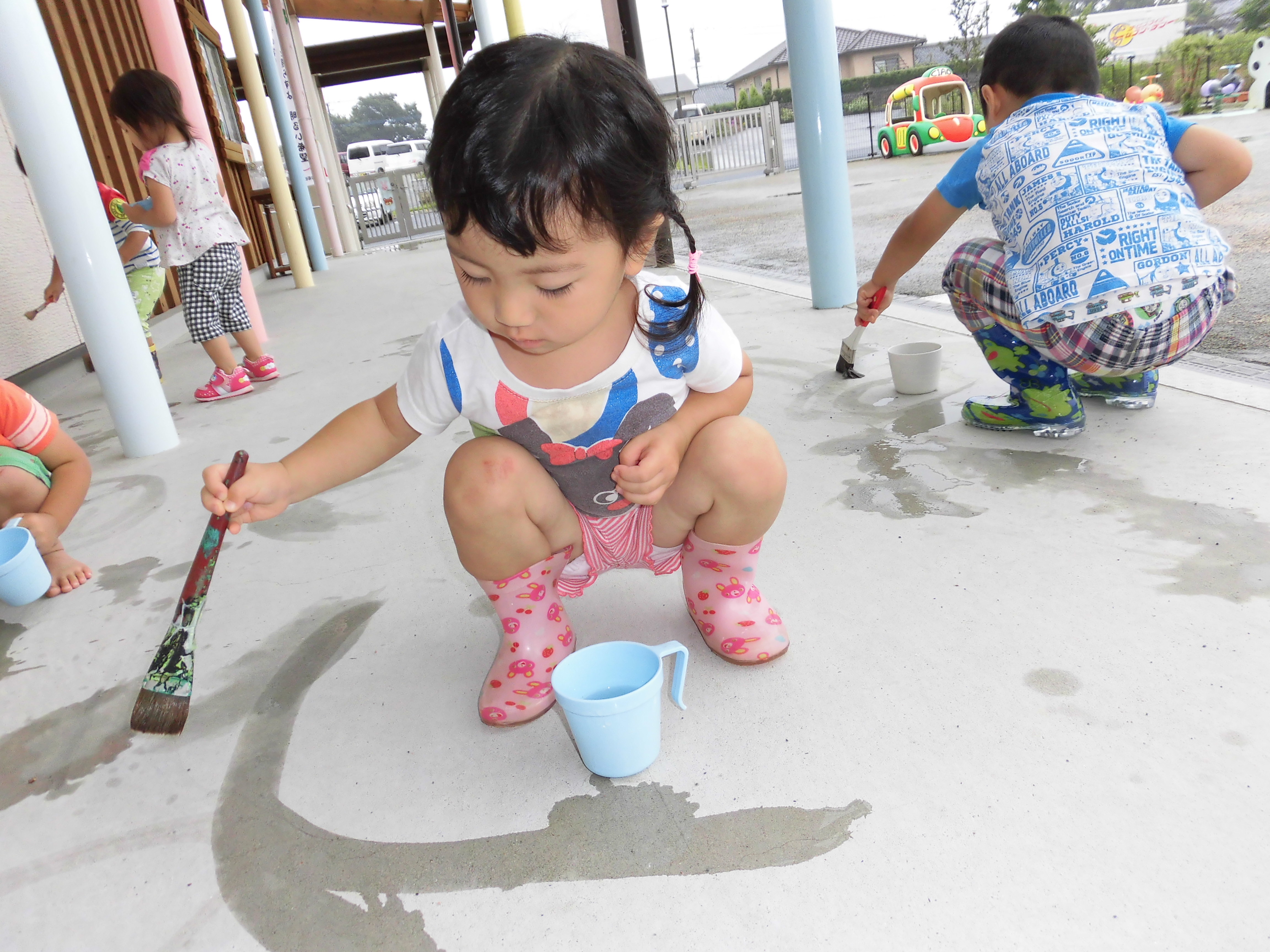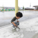 水絵 6月8日(月) 今日も、お外は雨・・・園庭で遊べない日が続きます。 うさぎ組さんは、テラスで水絵あそびを始めました。 画伯達がダイナミックな作品を仕上げましたが、残念ながらコンクリートが乾き幻の作品となりました。