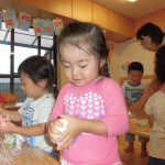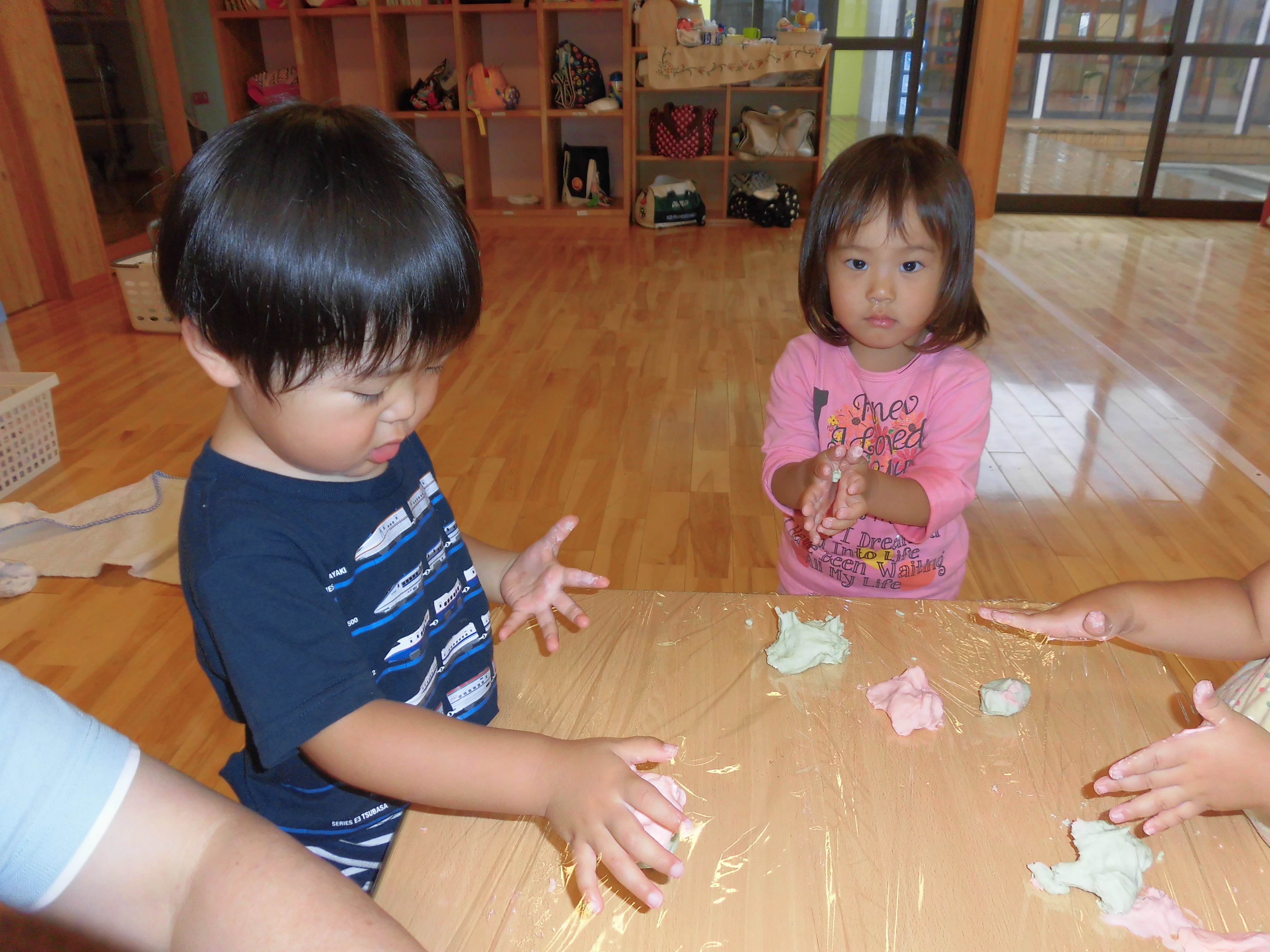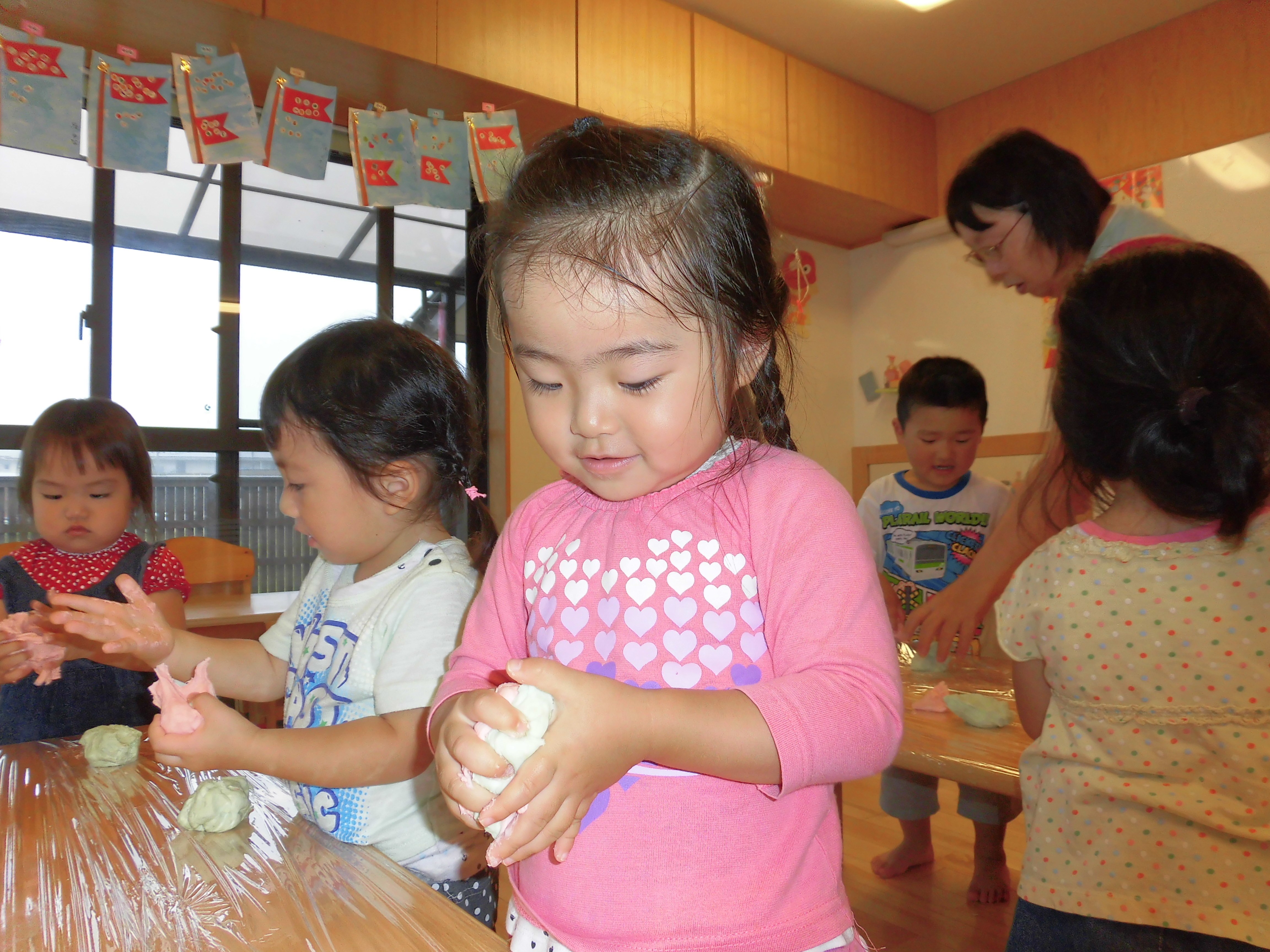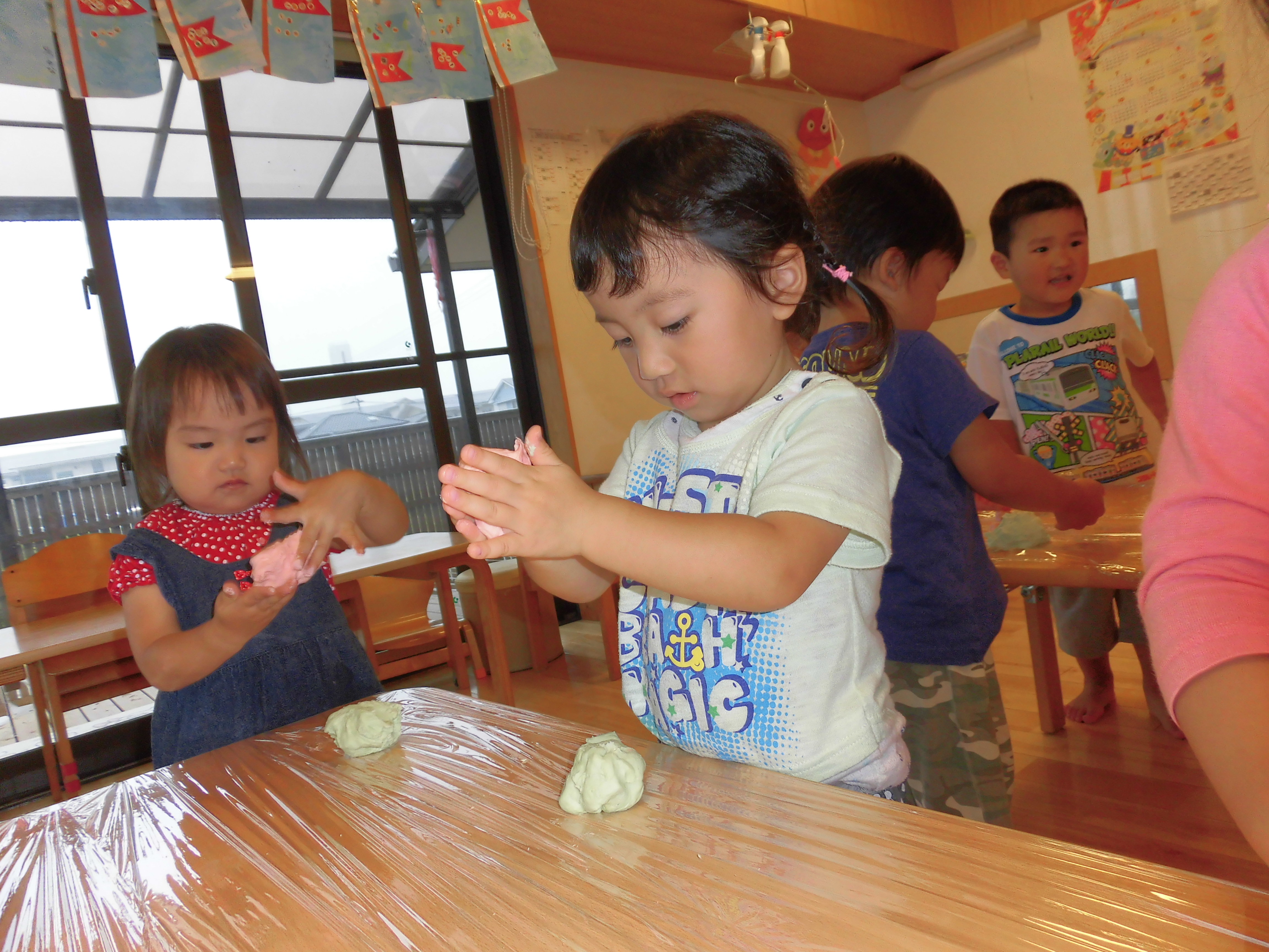 うさぎ組さんが、小麦粉粘土あそびを行っていますよ。