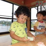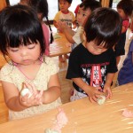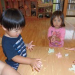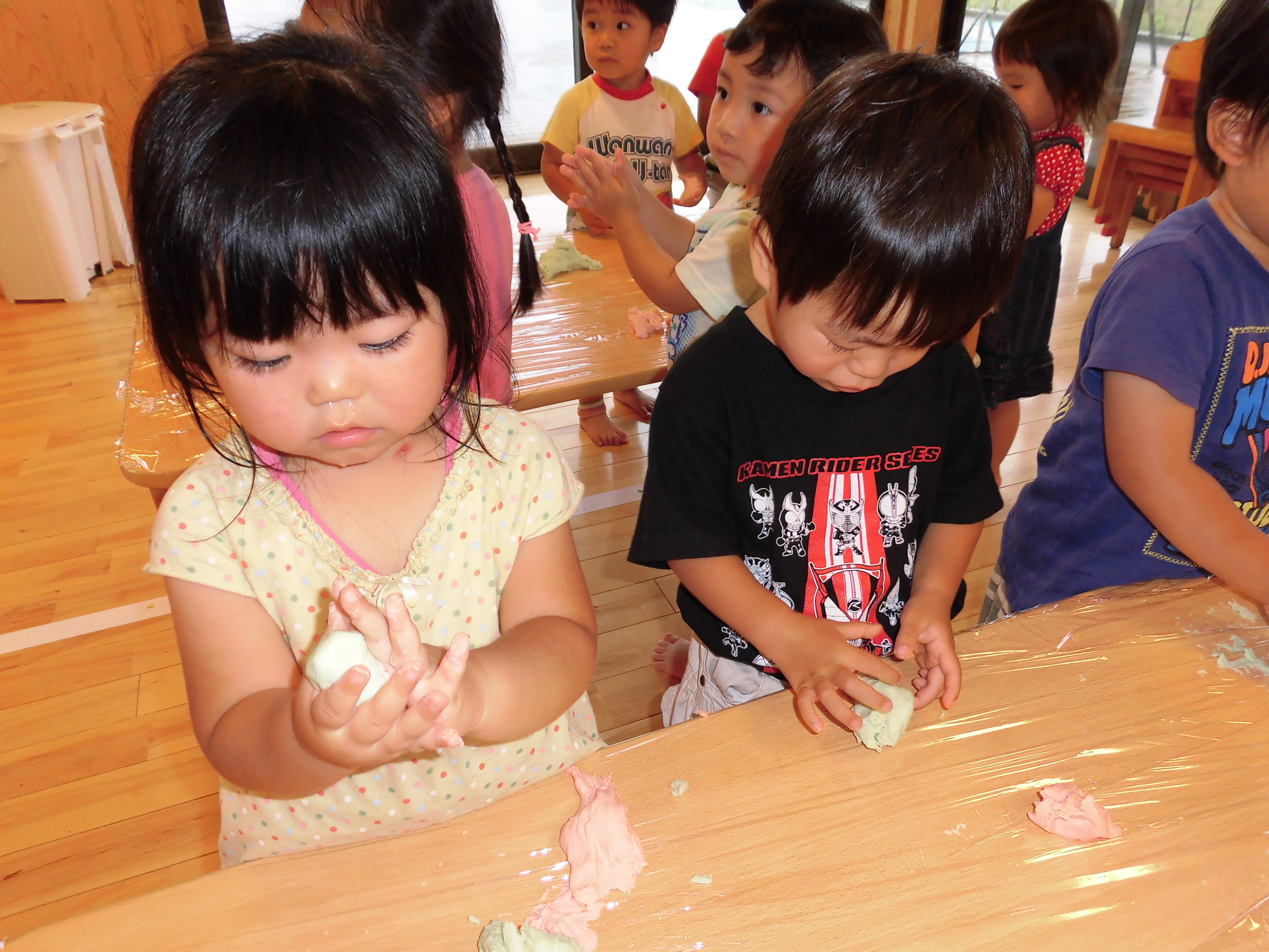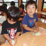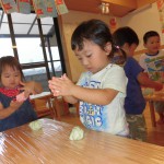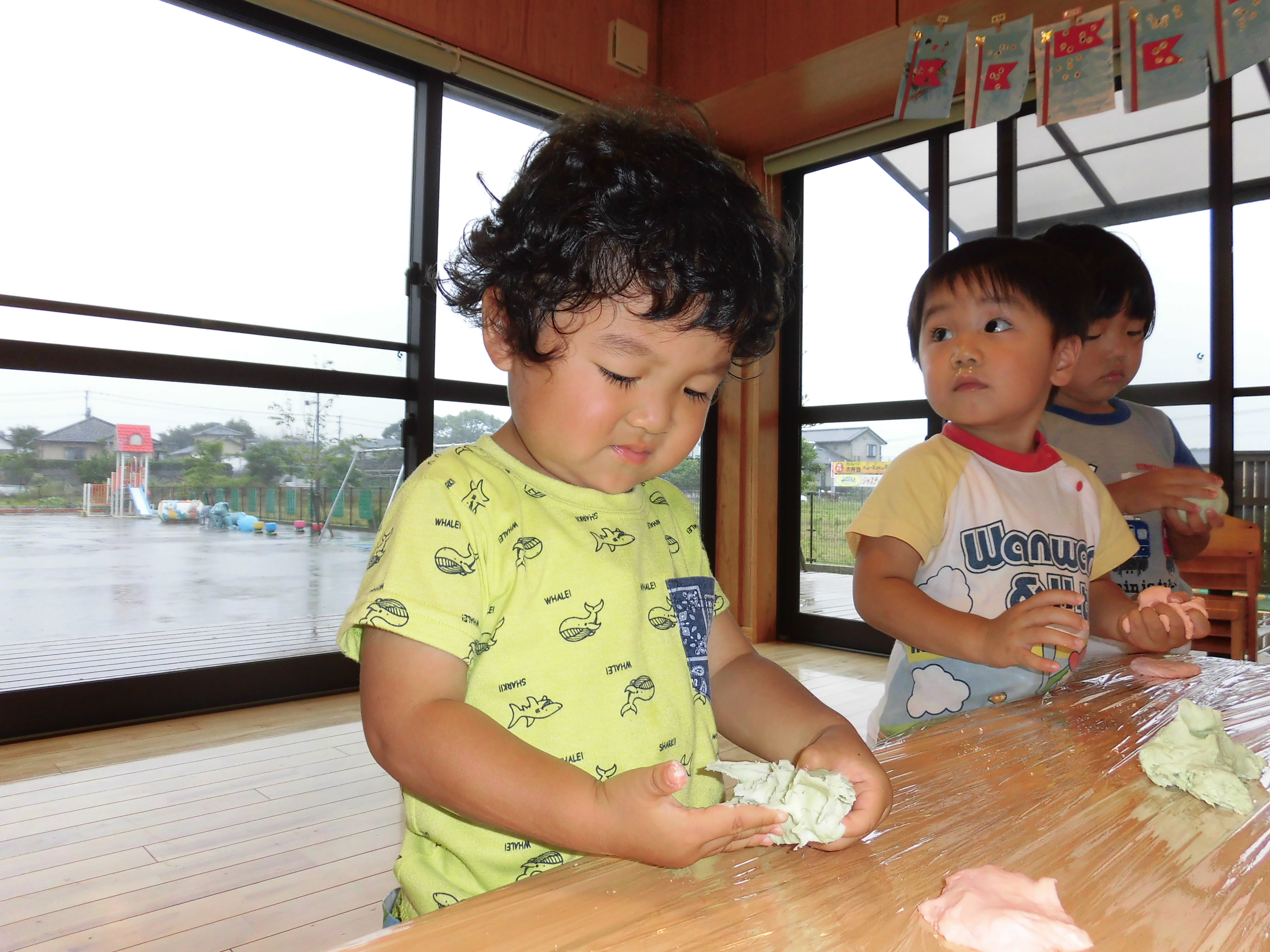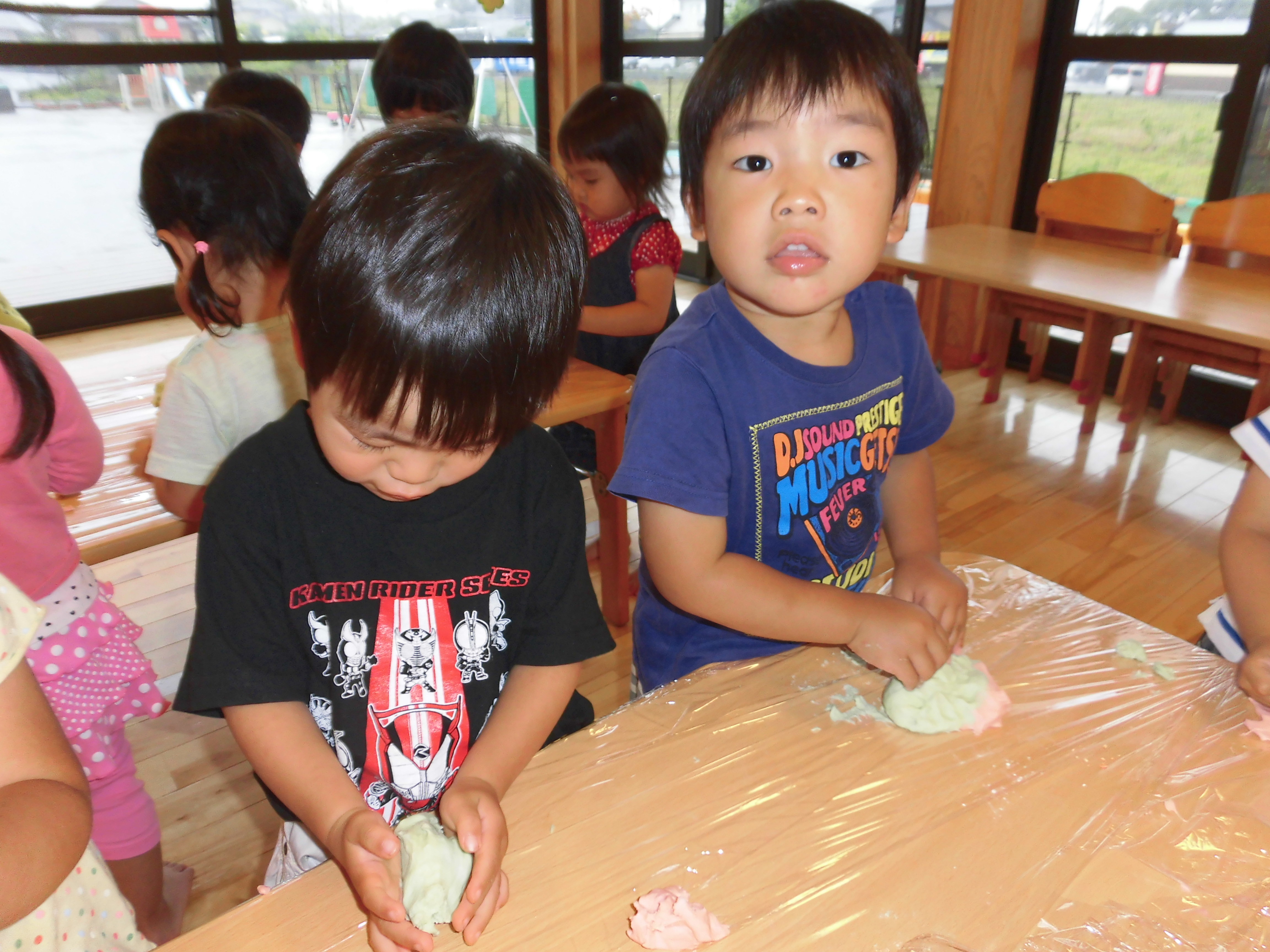 うさぎ組さんが、小麦粉粘土あそびを行っていますよ。