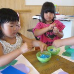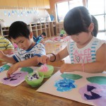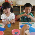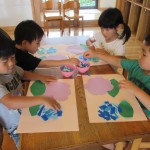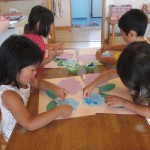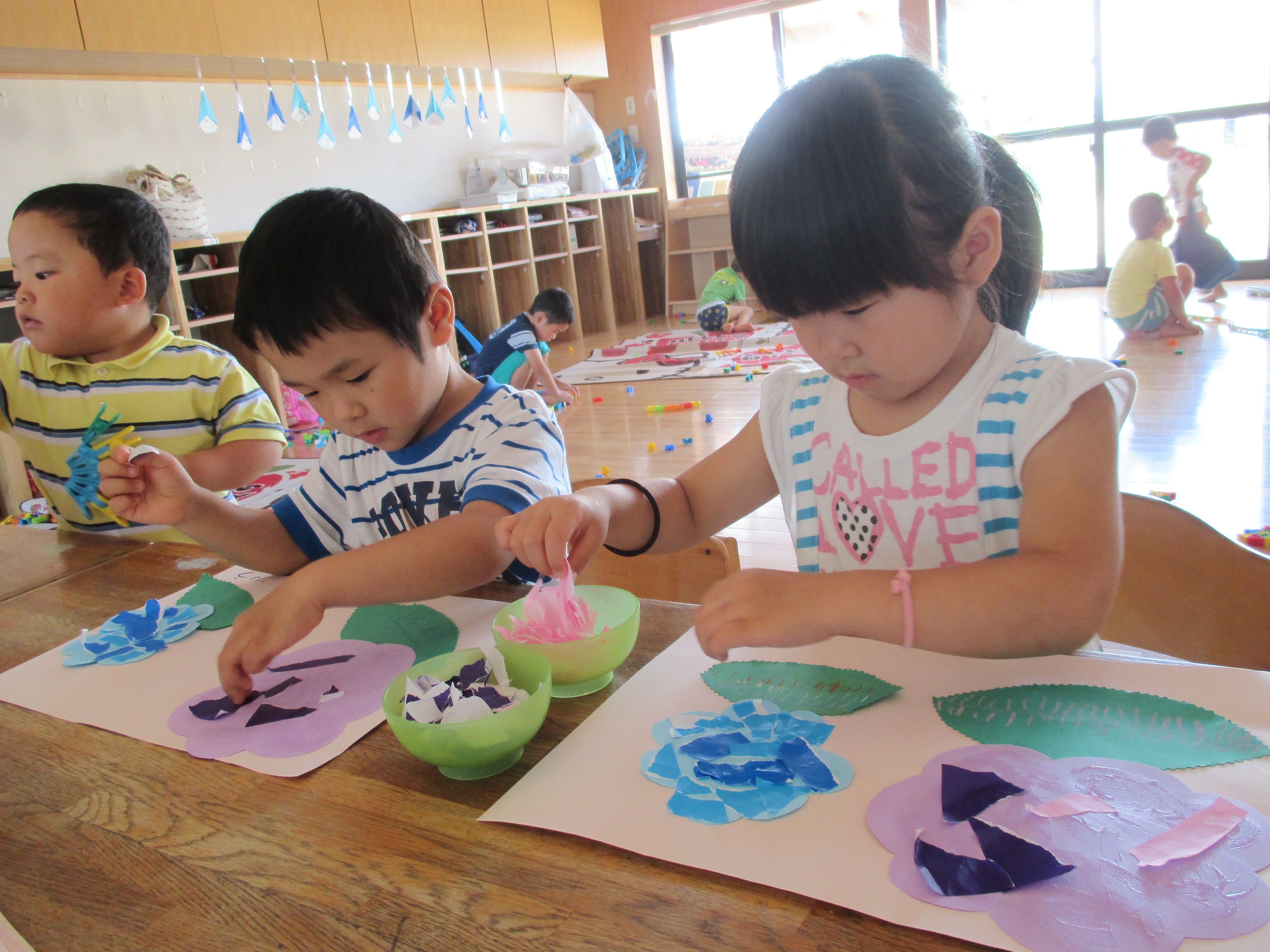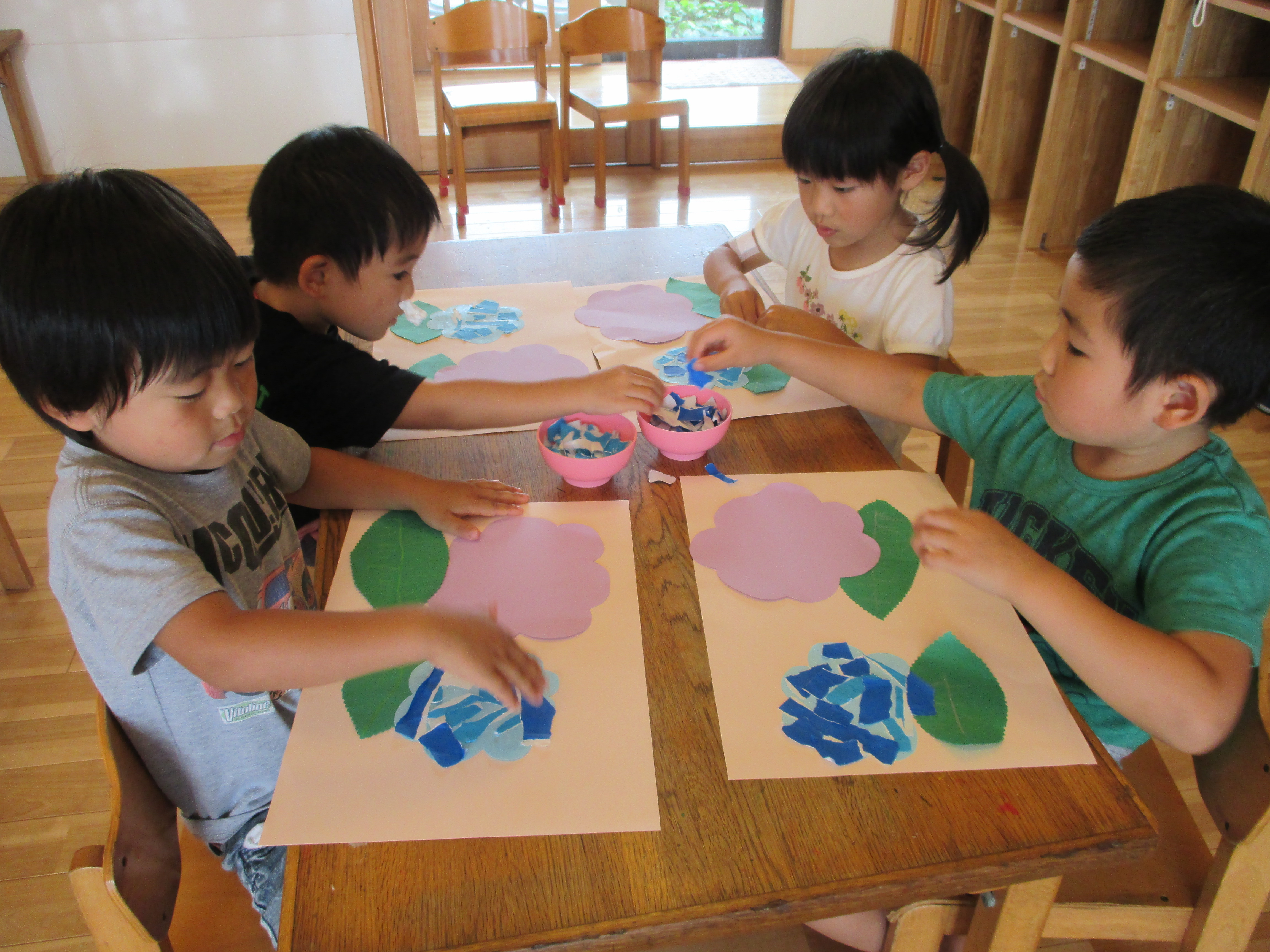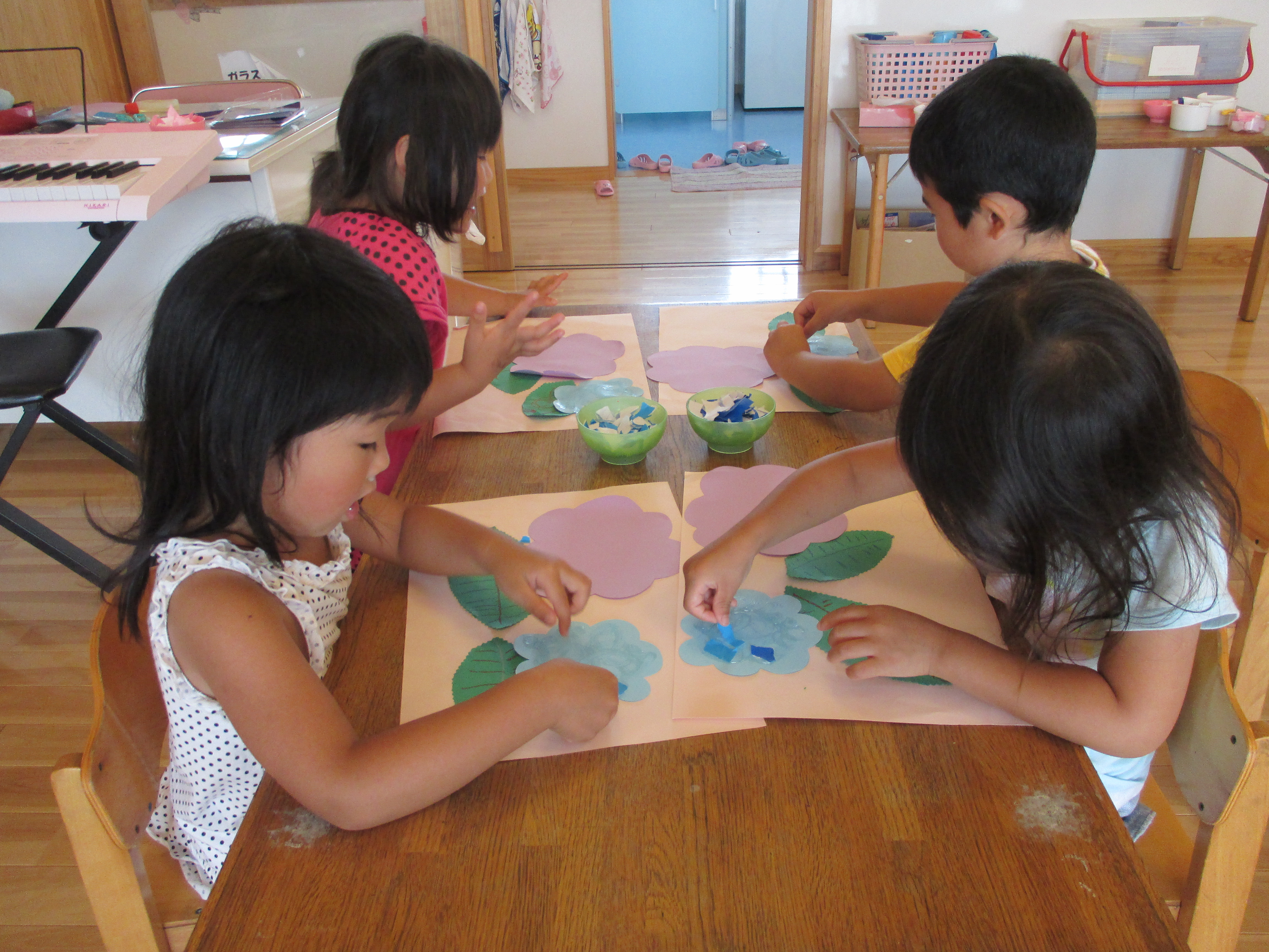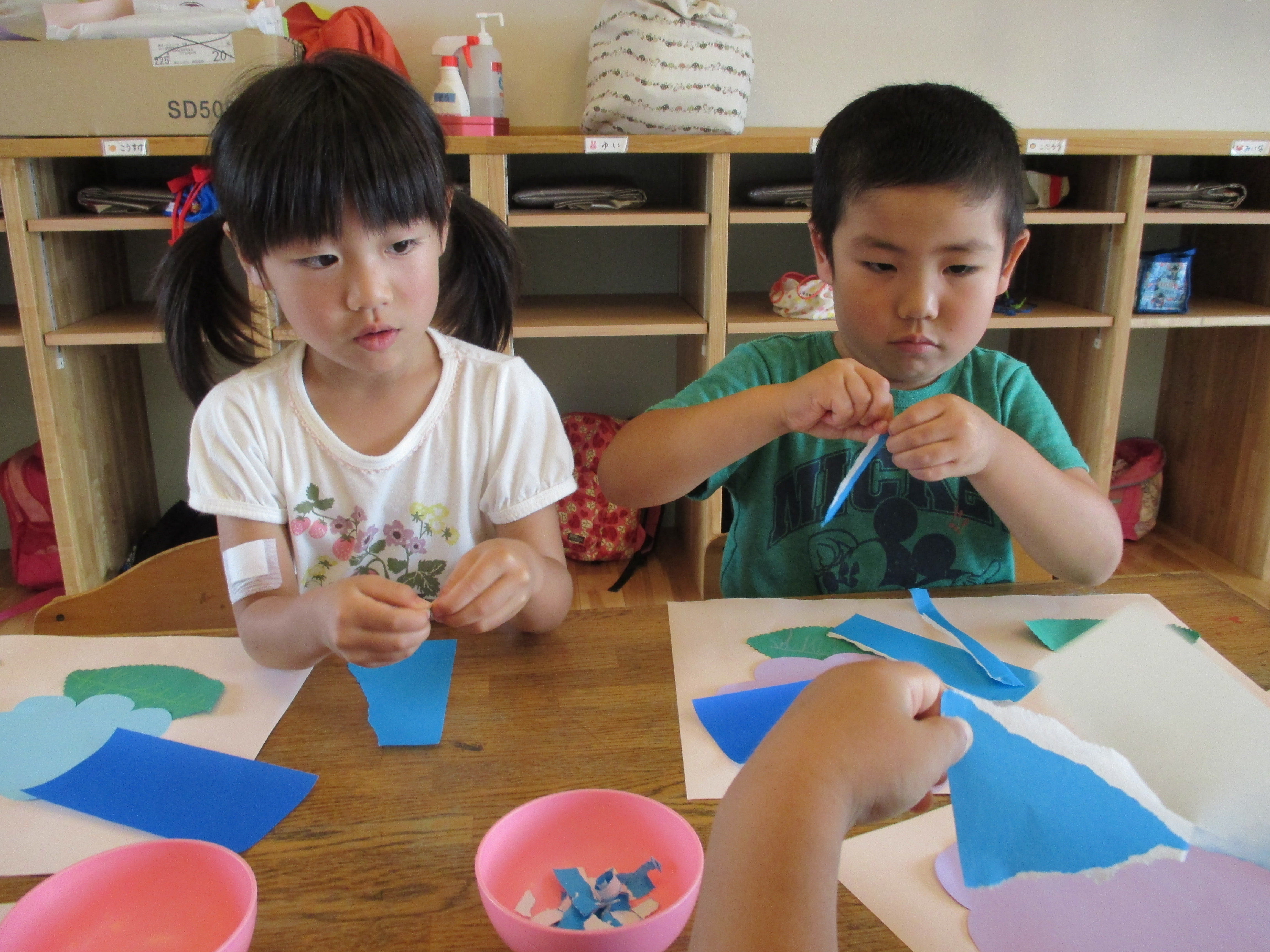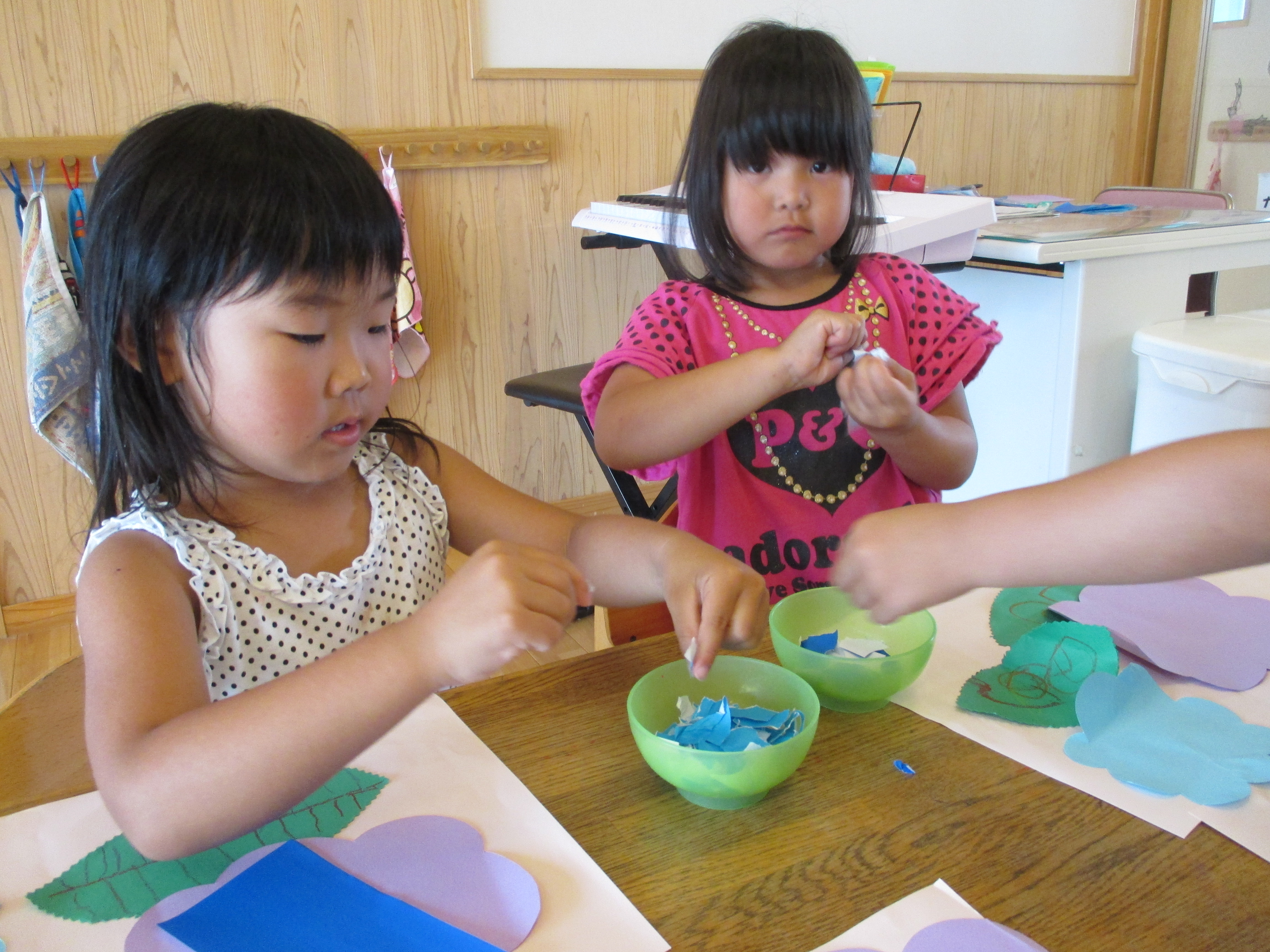 折り紙を細かくちぎって、糊で貼り付けていきます。