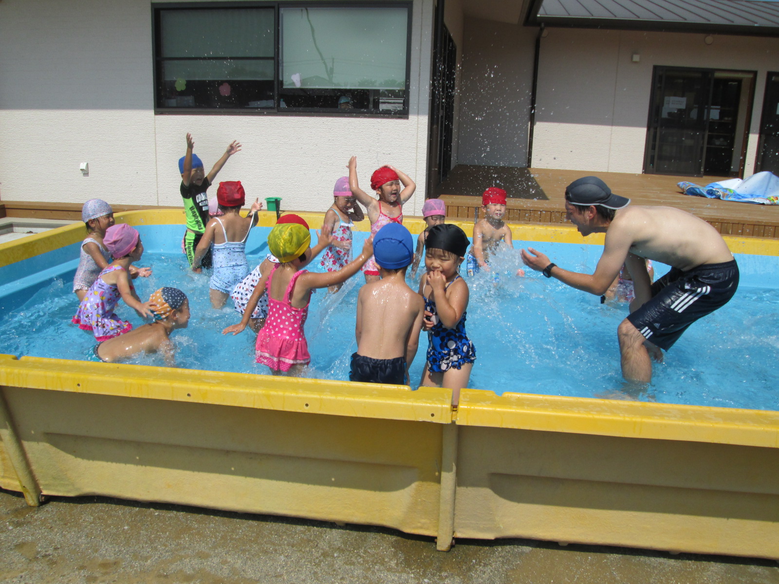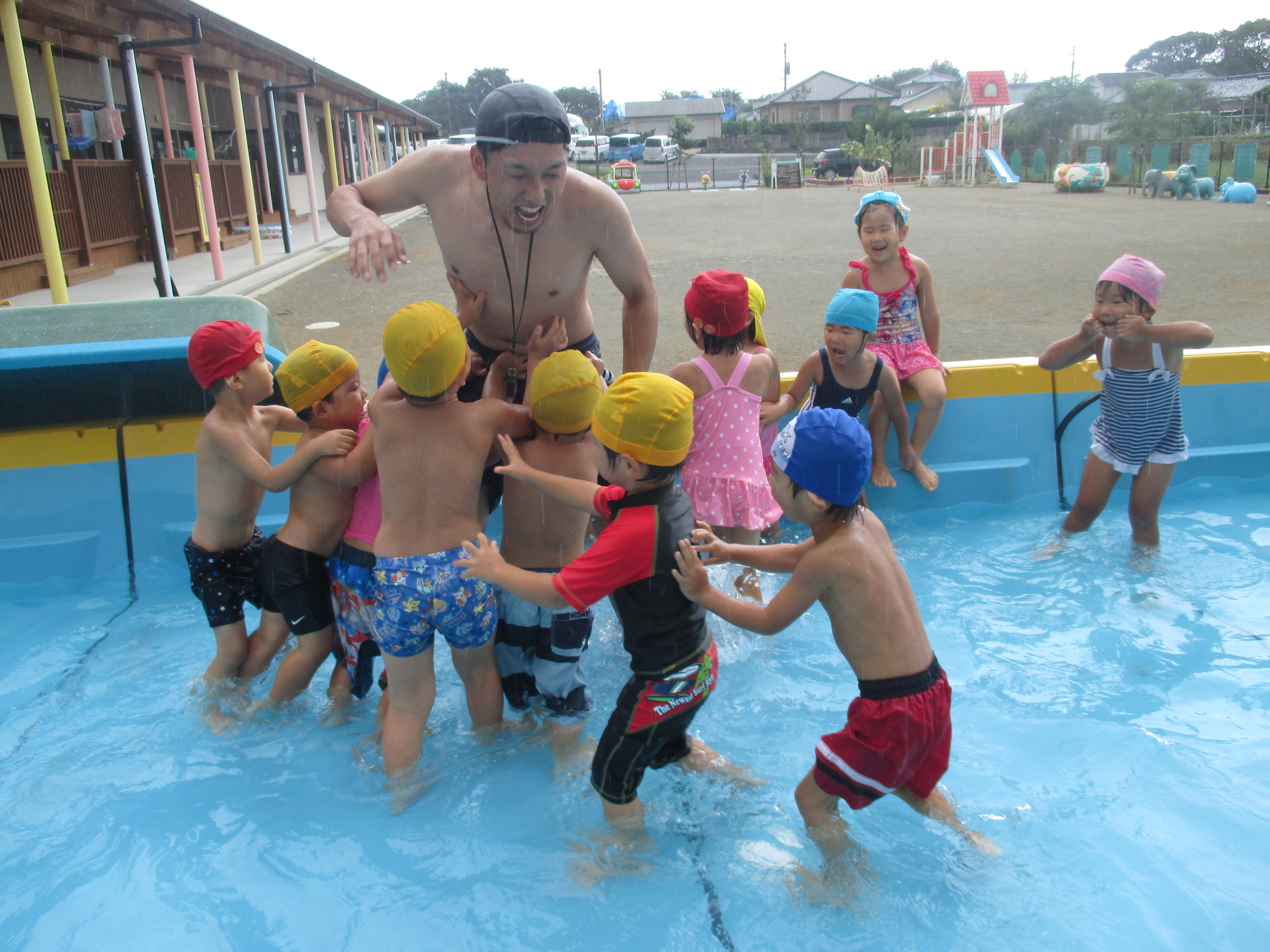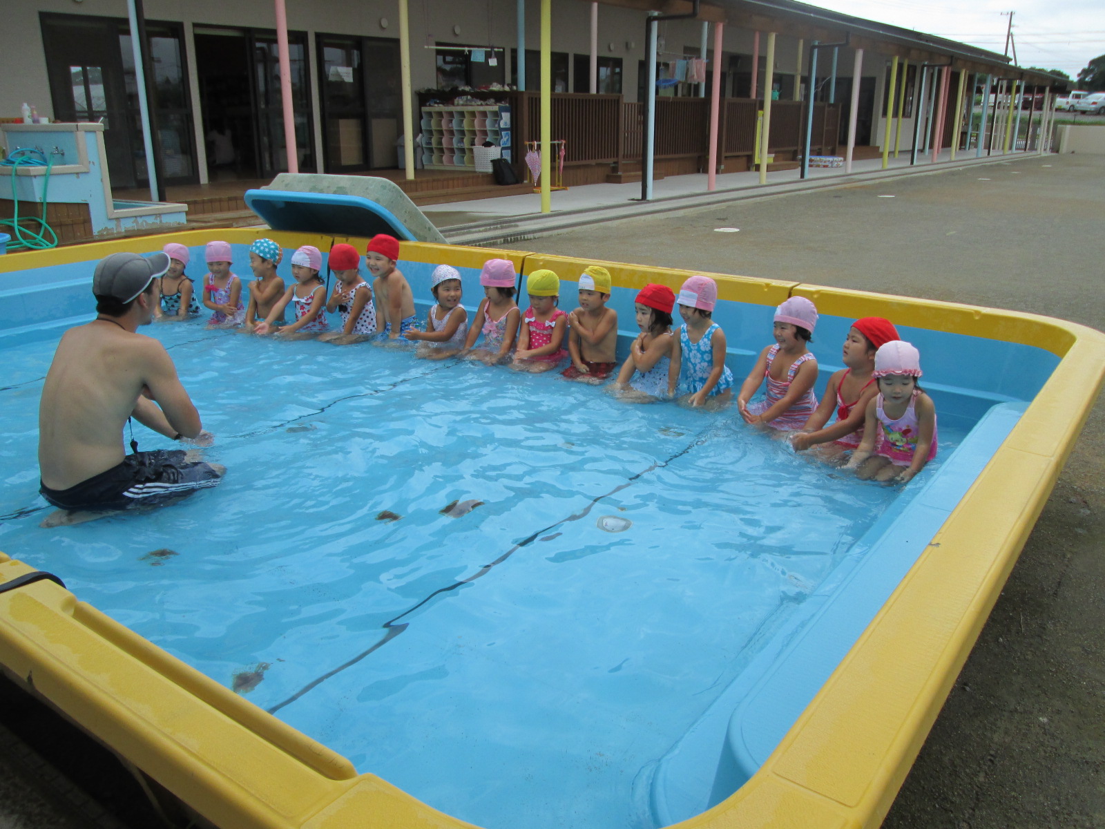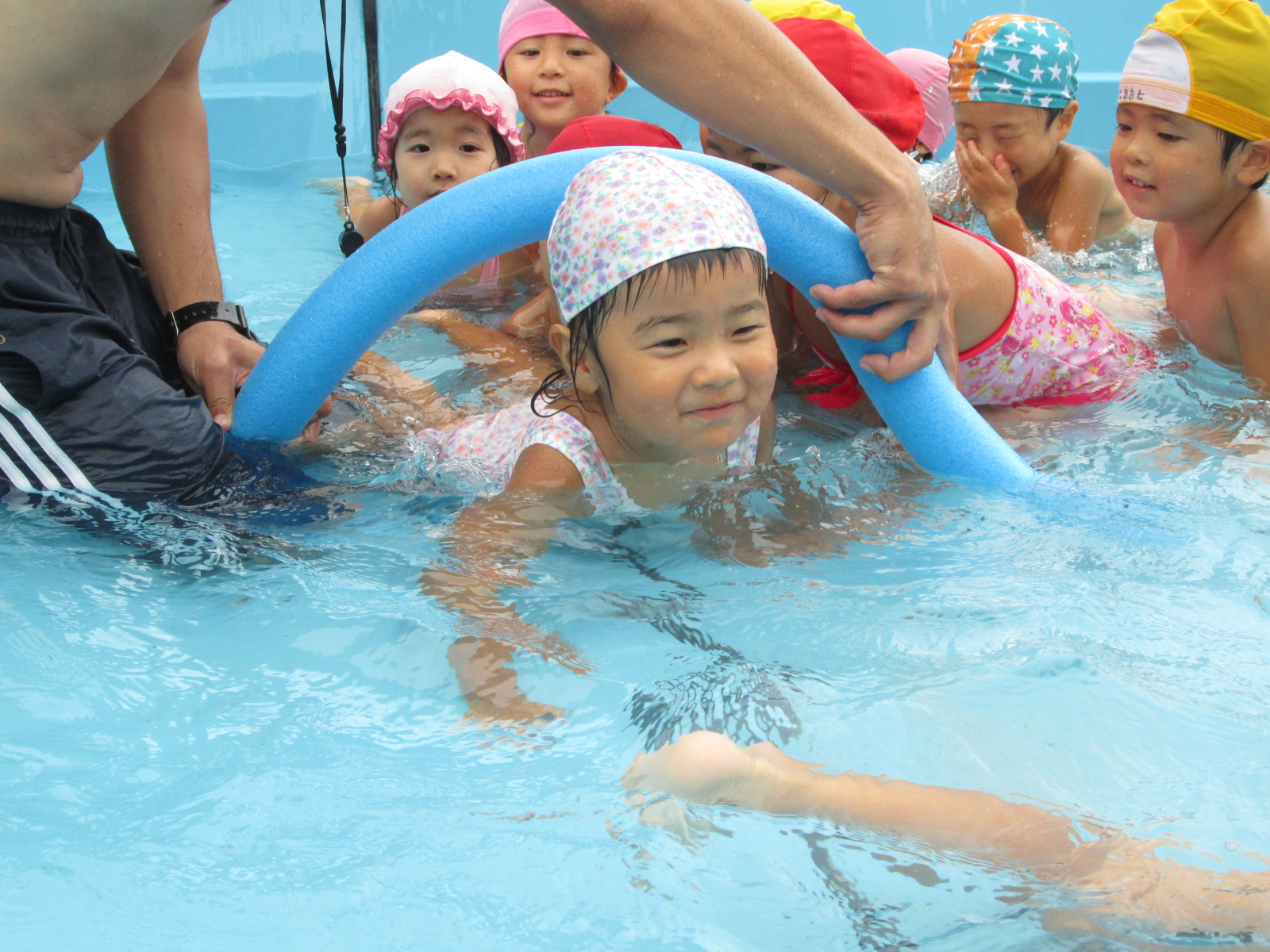 体育レッスン(水遊び編) 8月26日(水) 7月~8月は、体育レッスンの内容も水遊びにかわります。 肩まで水の中につかってワニ歩きをしたり、水しぶきをかけられても動かないお地蔵さんに変身したりと、楽しく遊びながら水に慣れていきます。 水の中に顔をつけたり、潜ることもできるようになってきましたよ。