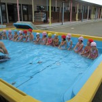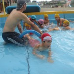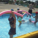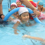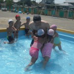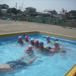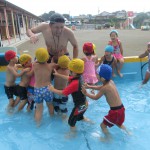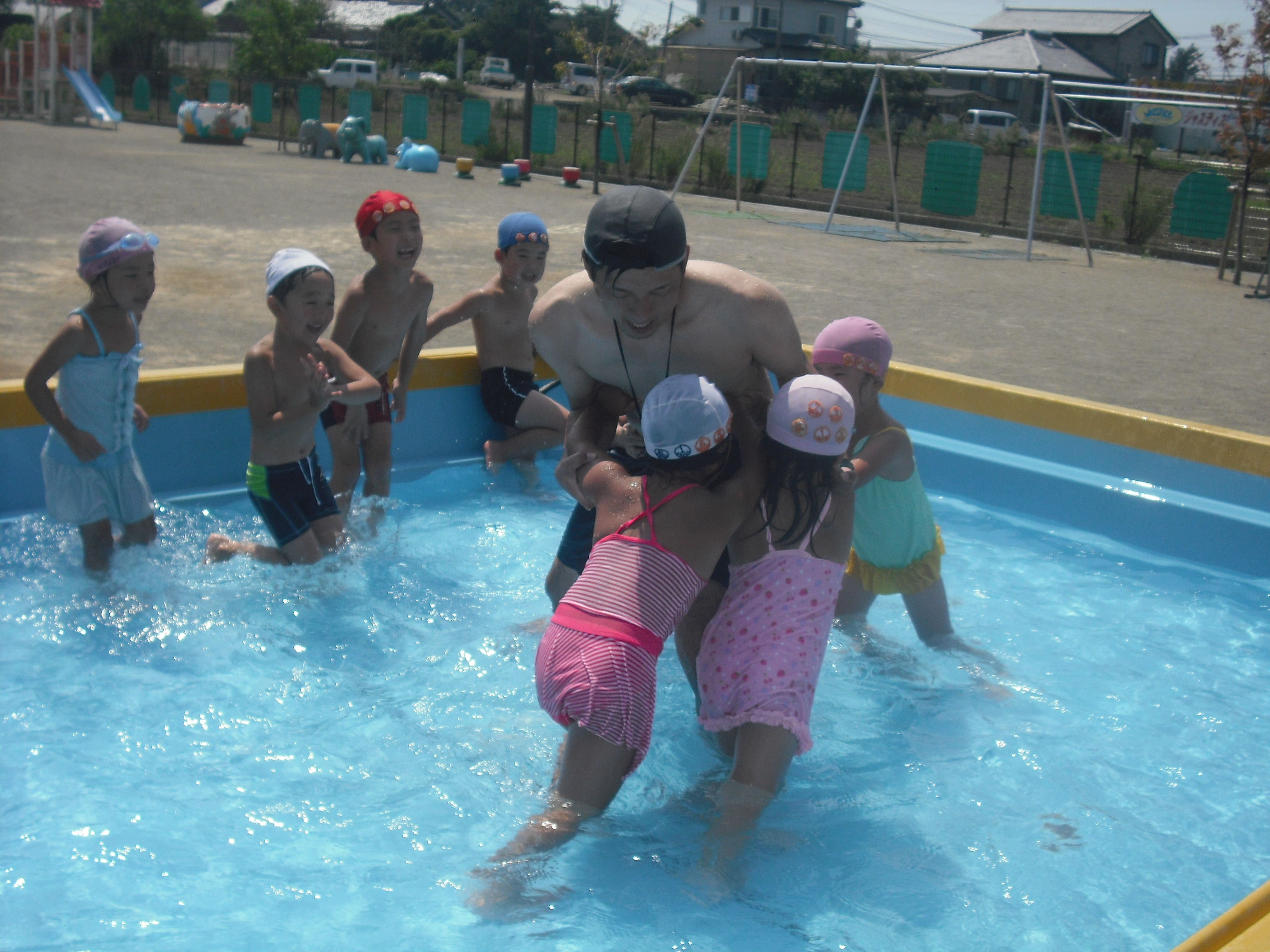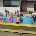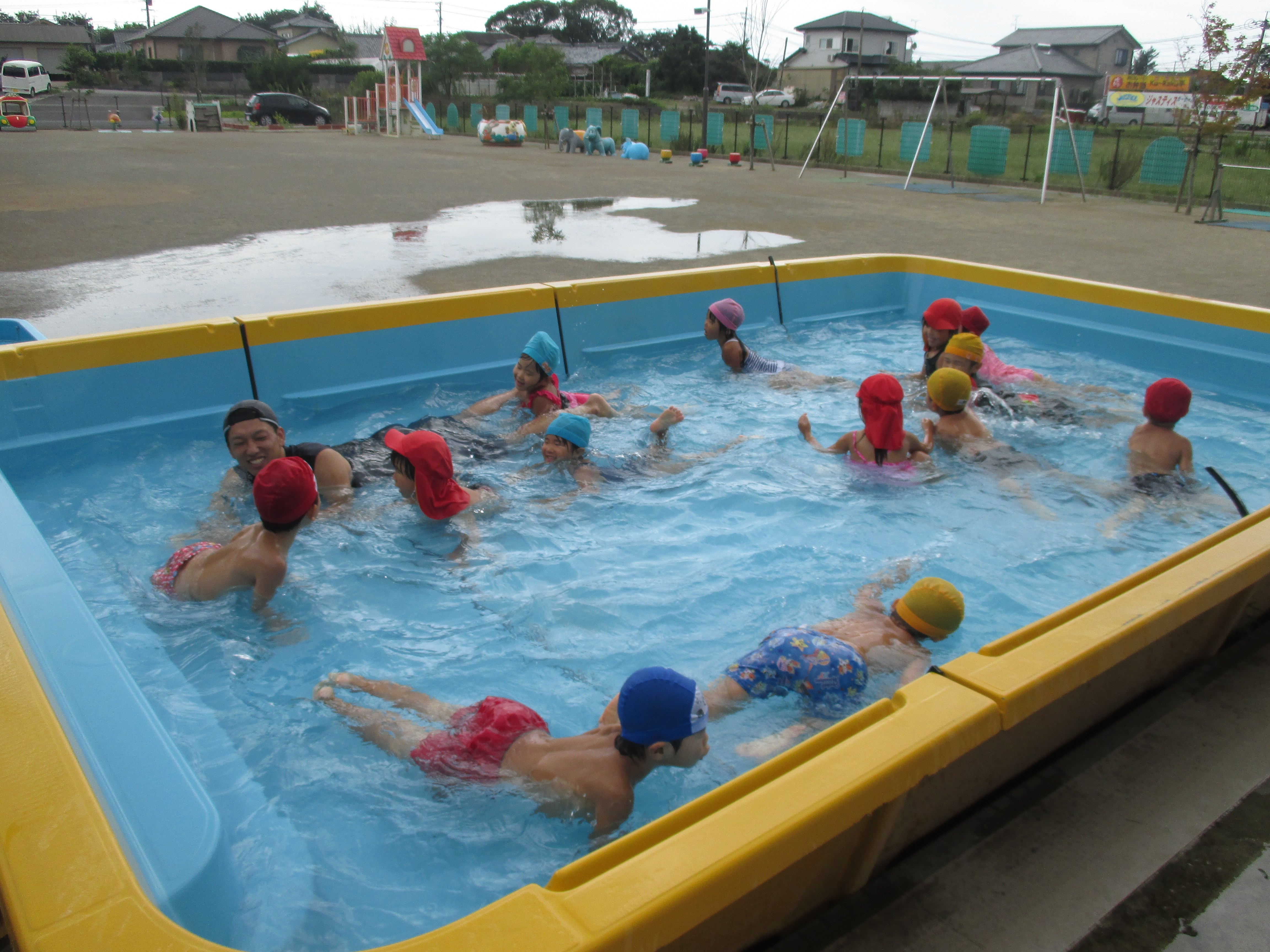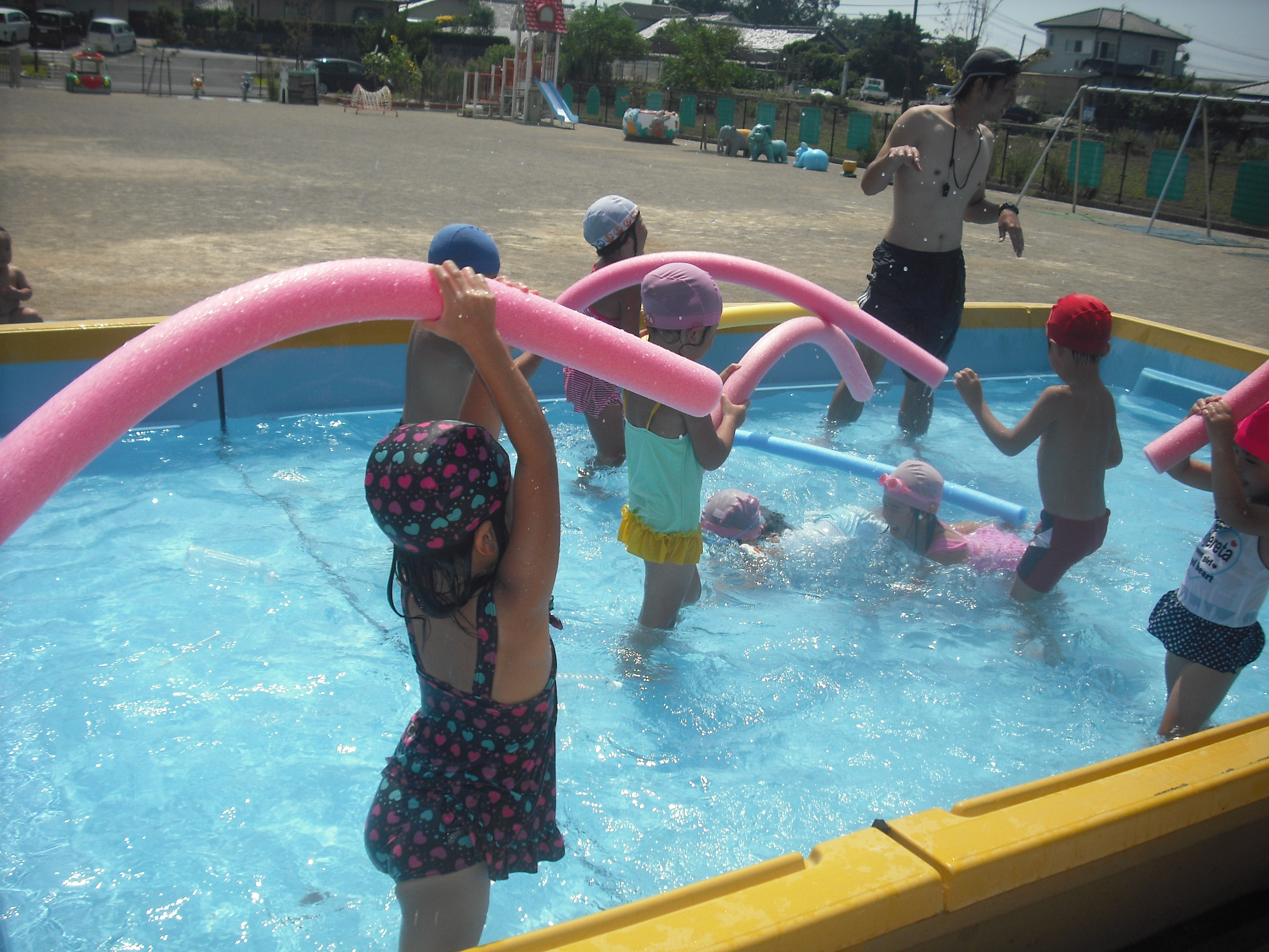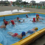 体育レッスン(水遊び編) 8月26日(水) 7月~8月は、体育レッスンの内容も水遊びにかわります。 肩まで水の中につかってワニ歩きをしたり、水しぶきをかけられても動かないお地蔵さんに変身したりと、楽しく遊びながら水に慣れていきます。 水の中に顔をつけたり、潜ることもできるようになってきましたよ。