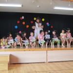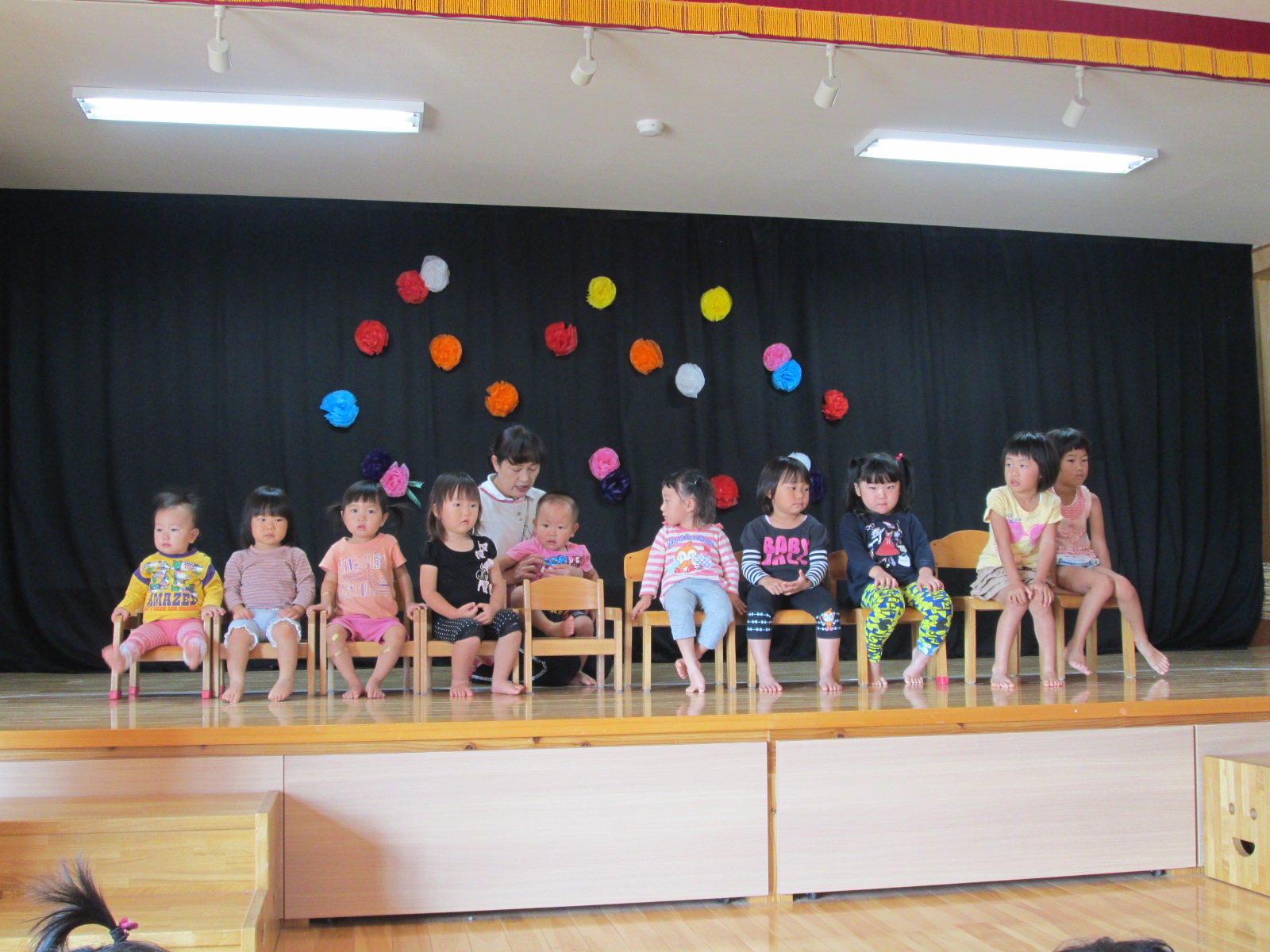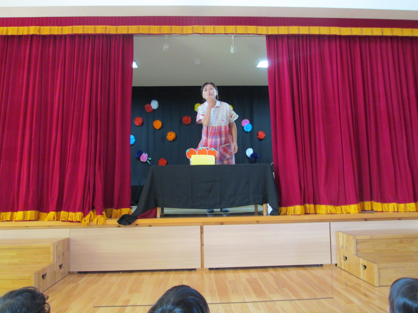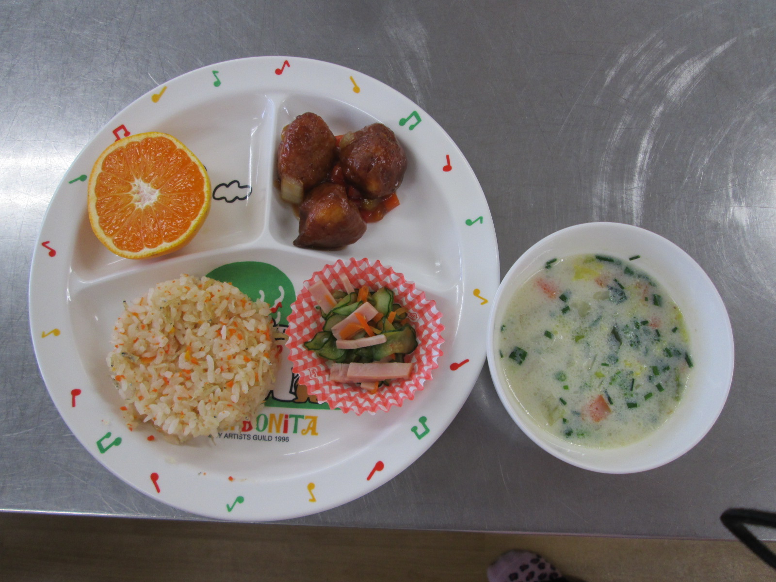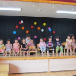 10月誕生会 10月21日(水) 今月は、10名の誕生児が勢ぞろいし賑やかな会となりました。 芸達者な先生達の出し物は『浦島太郎』。子ども達も毎回楽しみにしています。 誕生会メニューも楽しみの一つ。今月は、キャロットライス・フィッシュボールの甘酢あん・胡瓜とハムのサラダ・豆乳スープ・みかんでした。