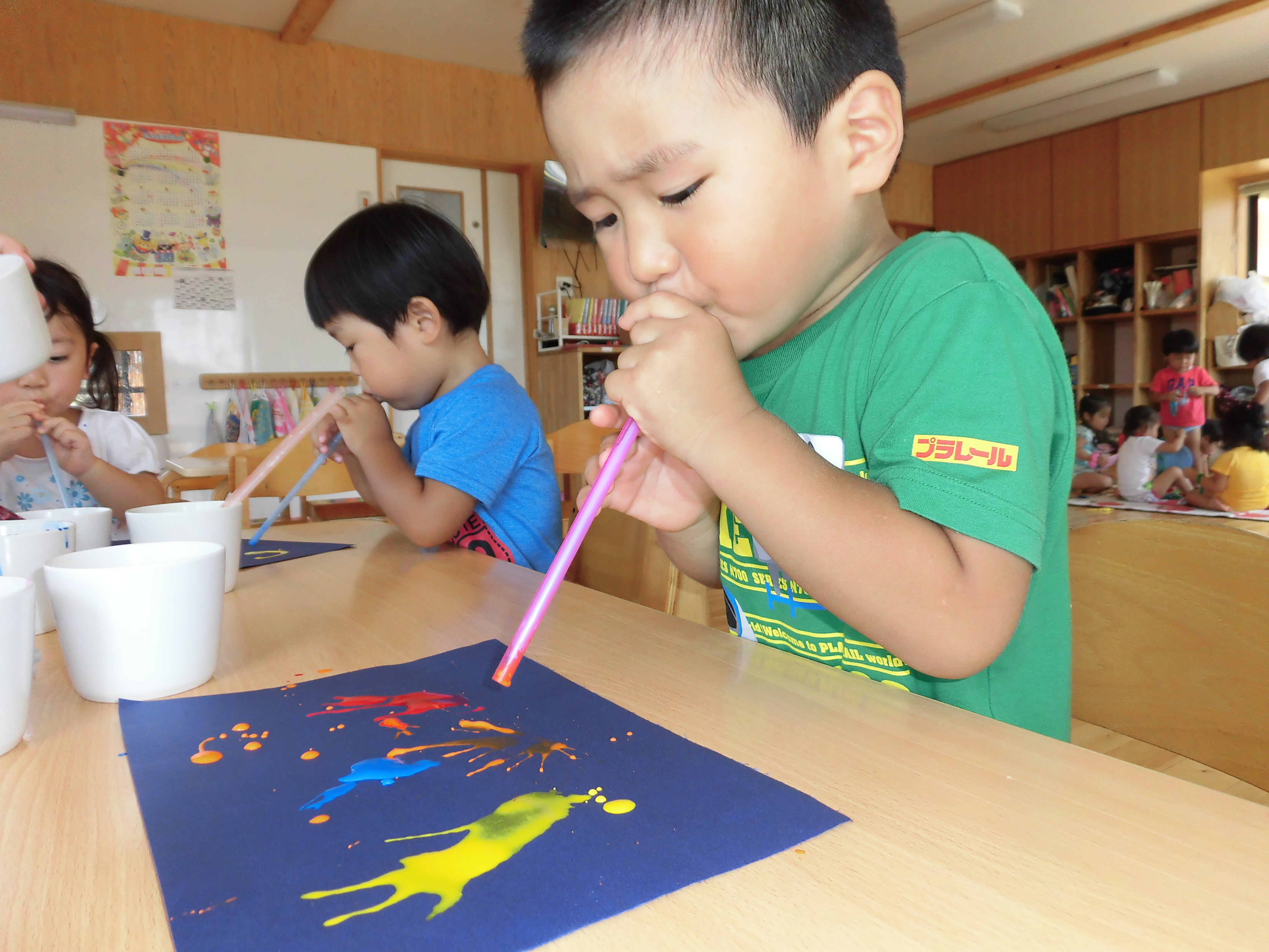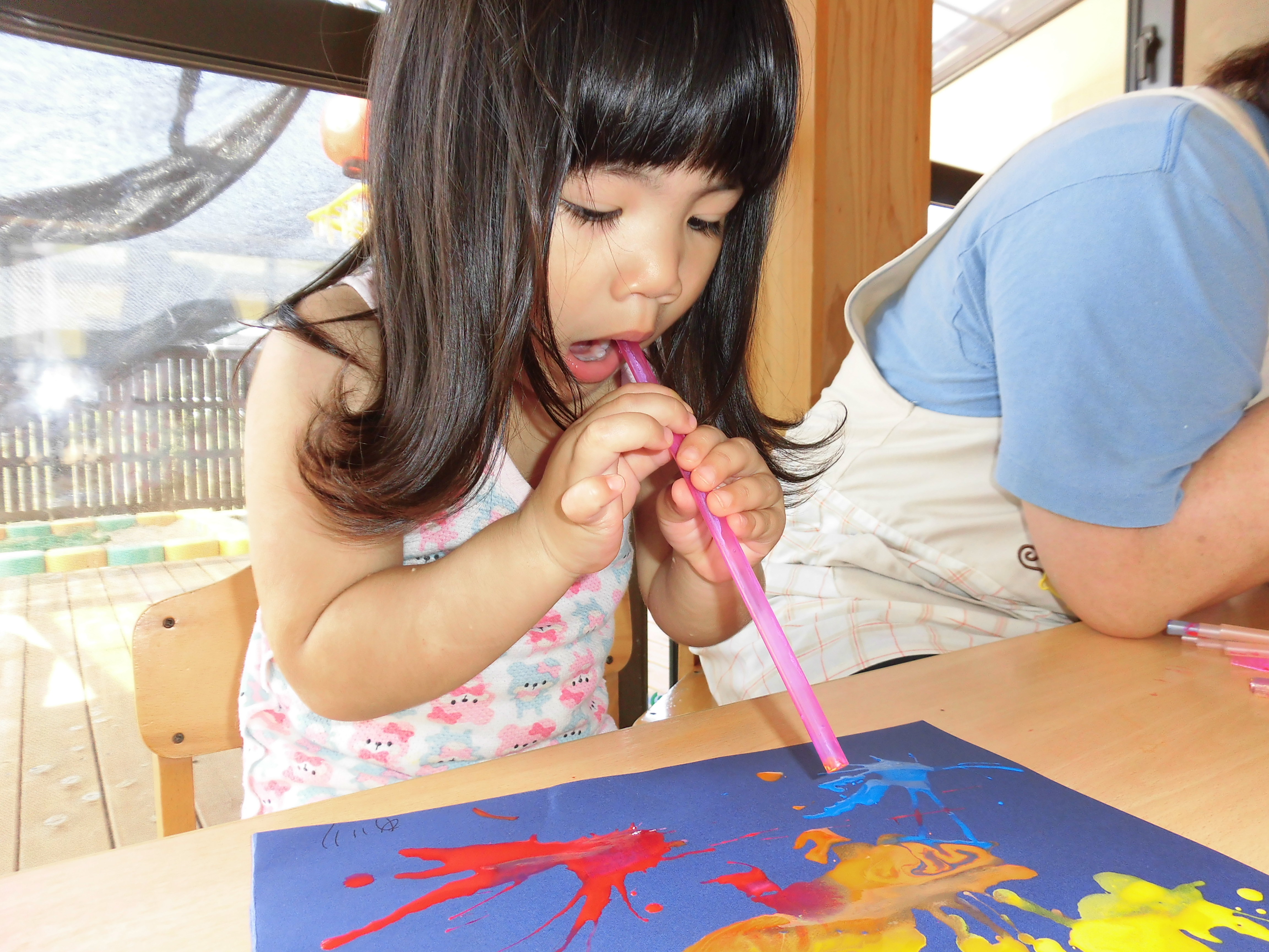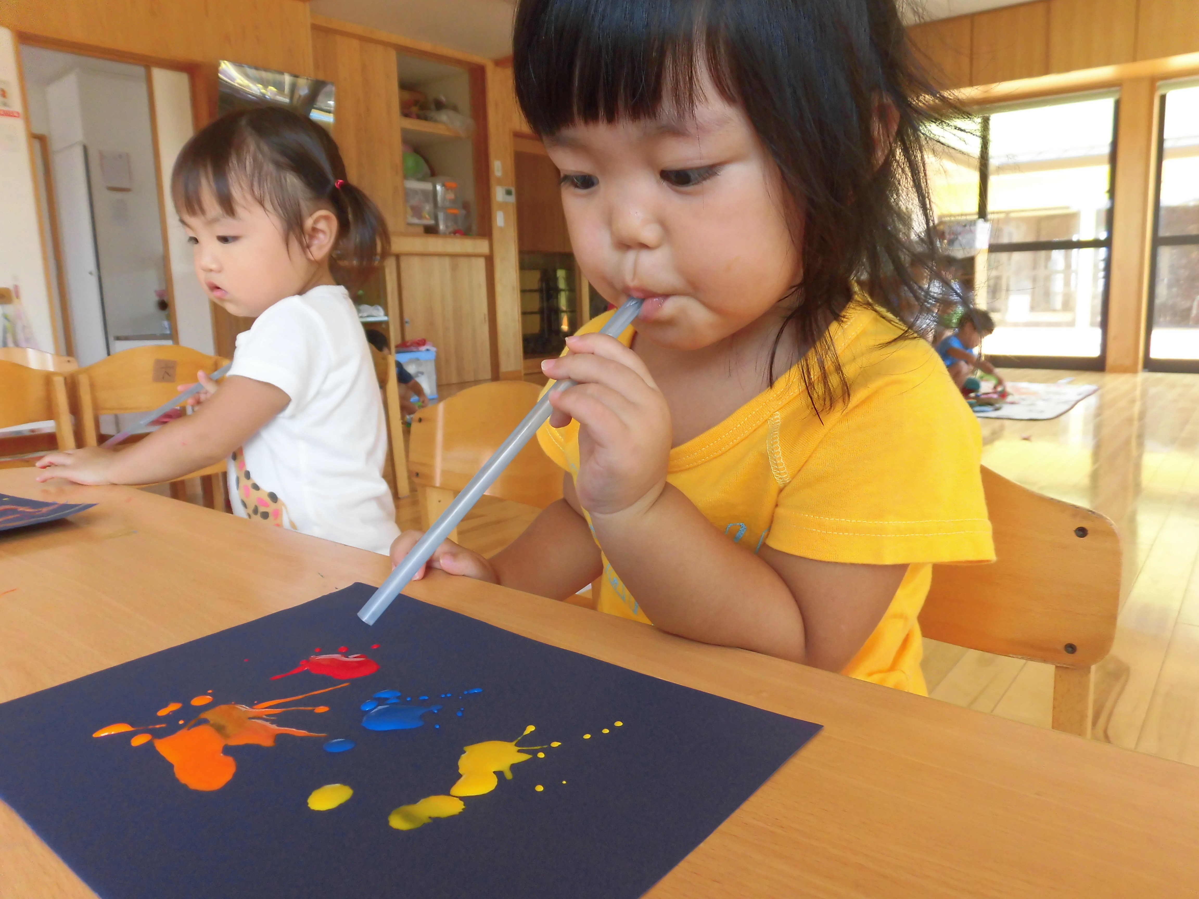 吹き絵(うさぎ) 8月5日(水) うさぎ組さんが、吹き絵に挑戦しました。 ストローをくわえて息を吹き込みます。 『フ~、プ~』 吹く力が弱くて絵の具がなかなか広がりません。 大きく息を吸い込んで・・・だんだん要領がつかめてきましたよ。 色とりどりの花火が紙面いっぱいに打ちあがりました。
