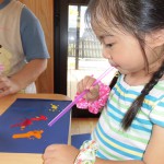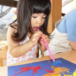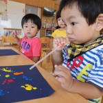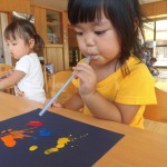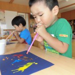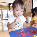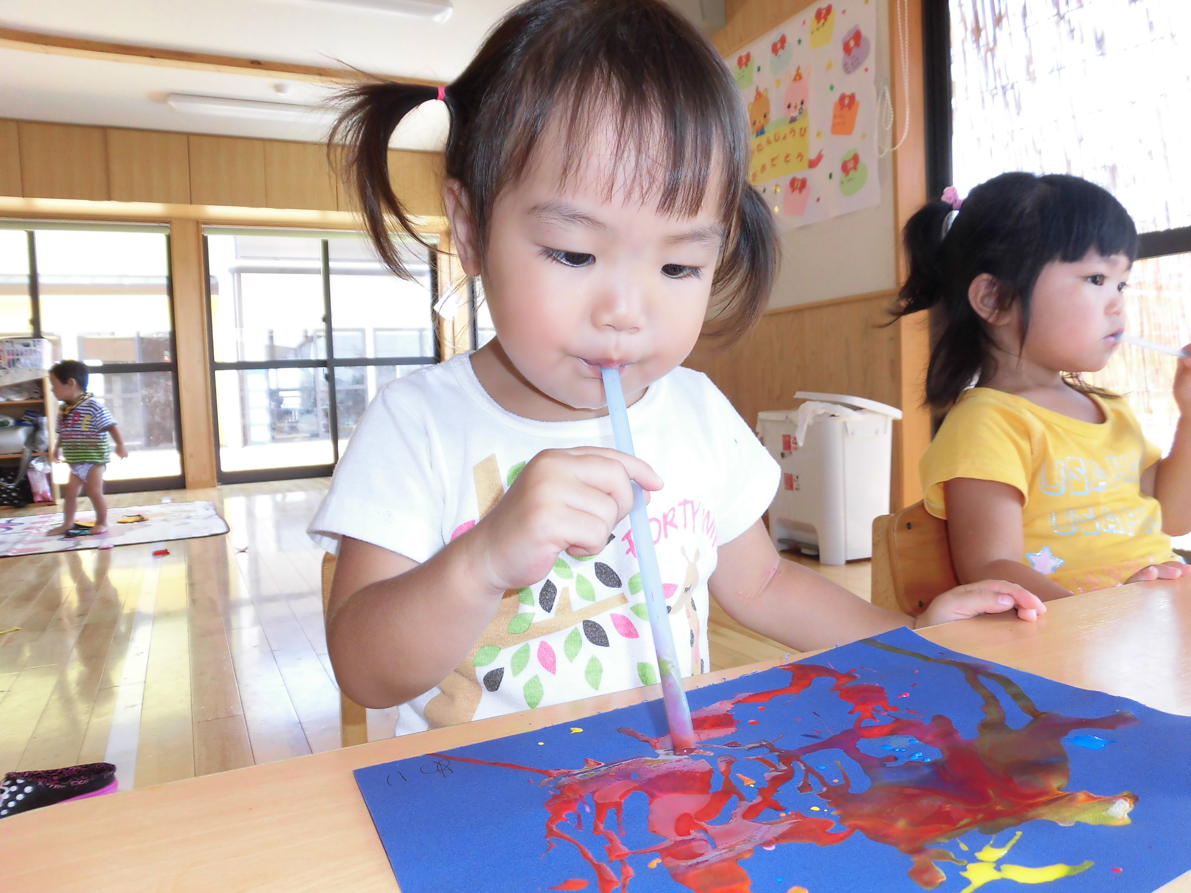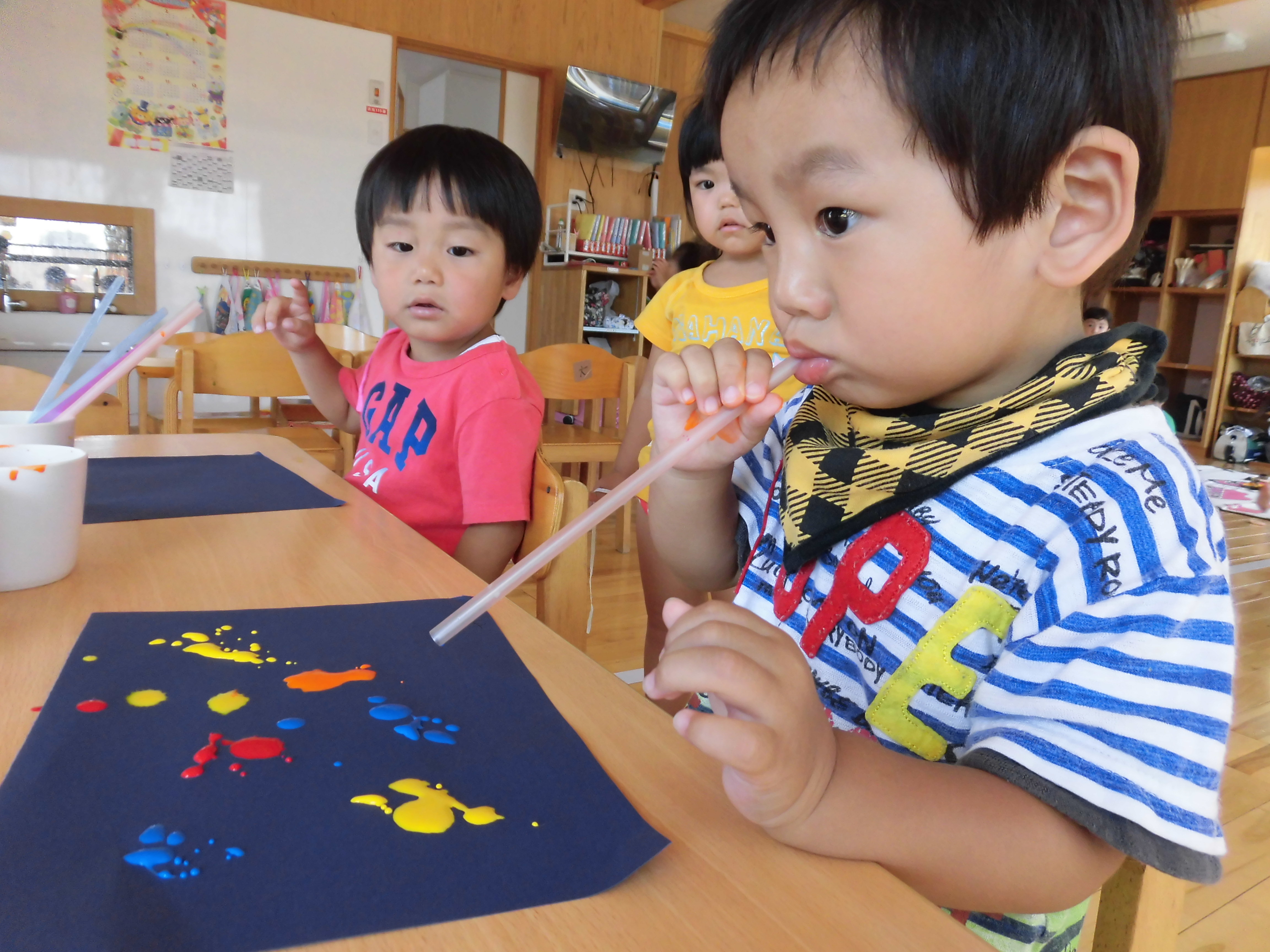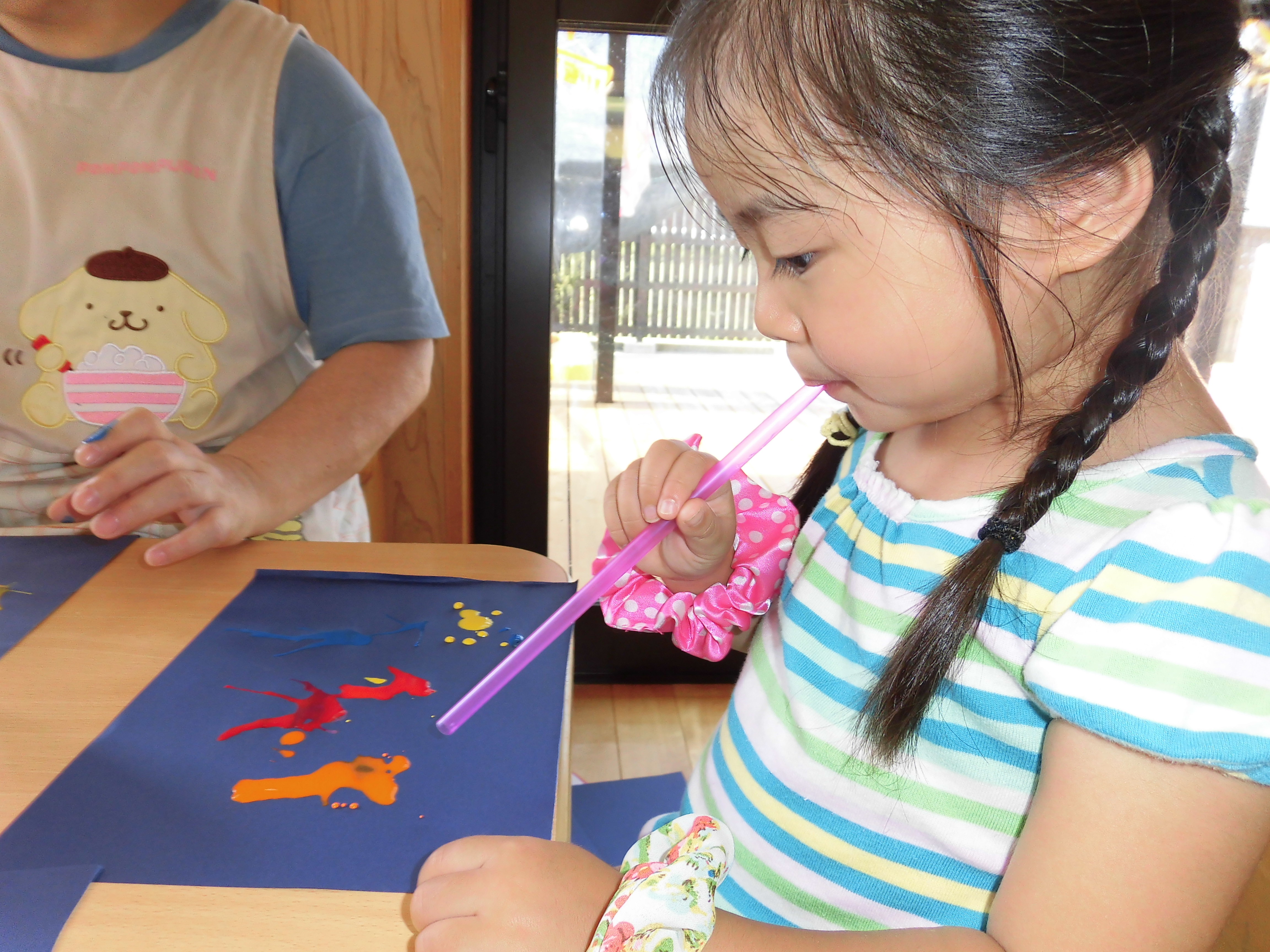 吹き絵(うさぎ) 8月5日(水) うさぎ組さんが、吹き絵に挑戦しました。 ストローをくわえて息を吹き込みます。 『フ~、プ~』 吹く力が弱くて絵の具がなかなか広がりません。 大きく息を吸い込んで・・・だんだん要領がつかめてきましたよ。 色とりどりの花火が紙面いっぱいに打ちあがりました。