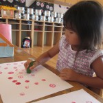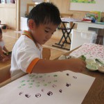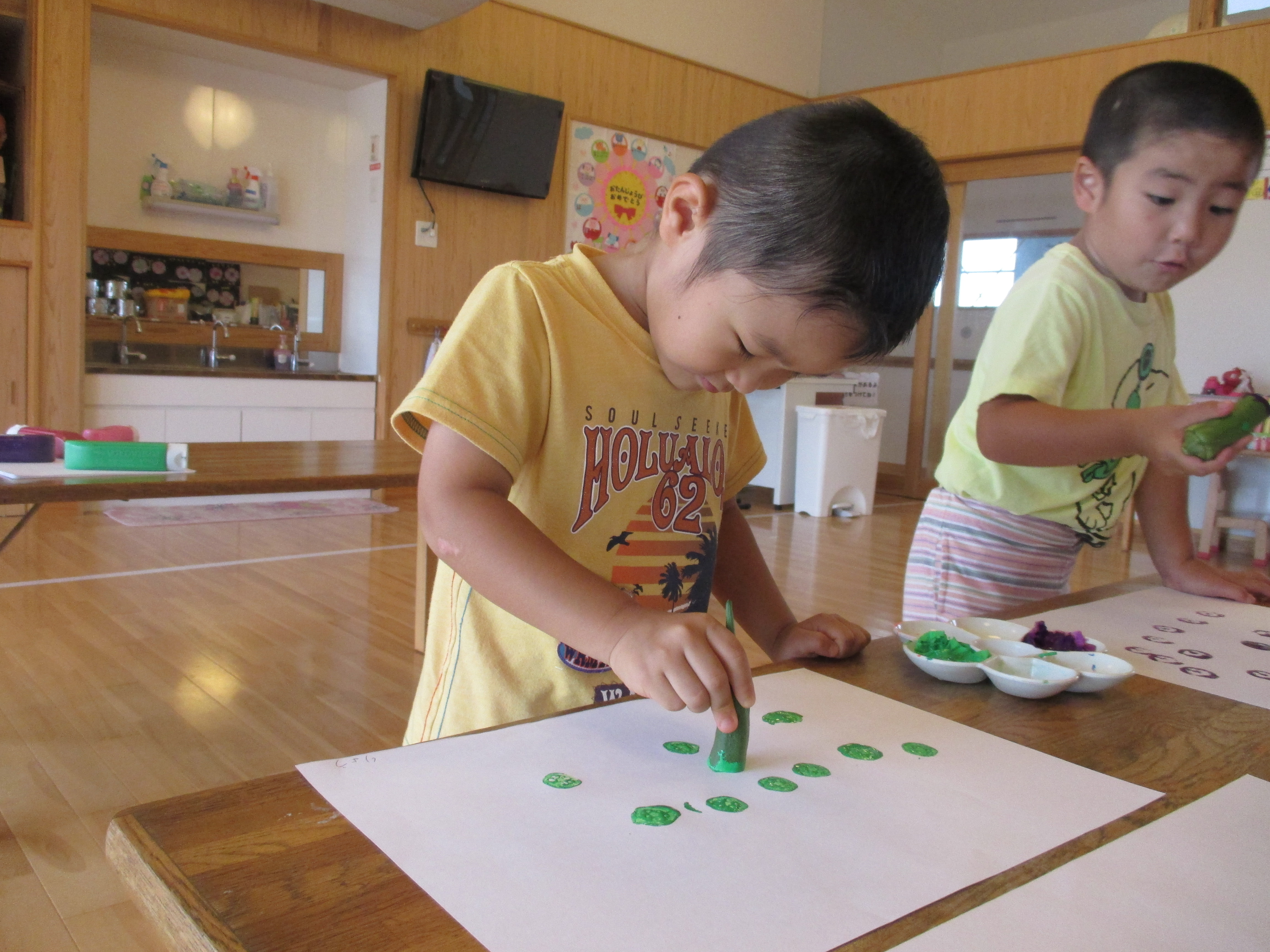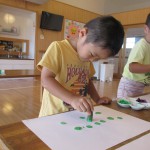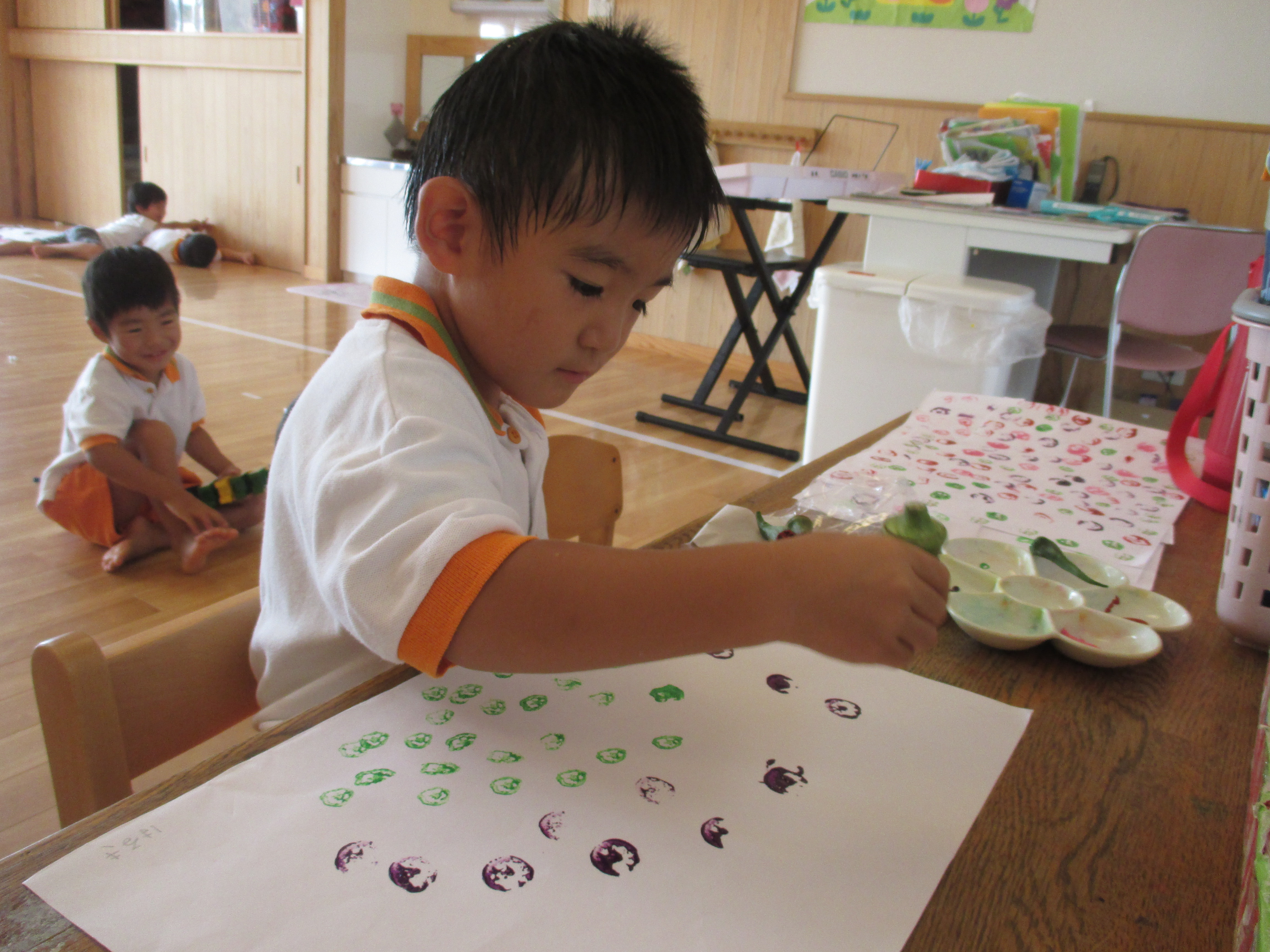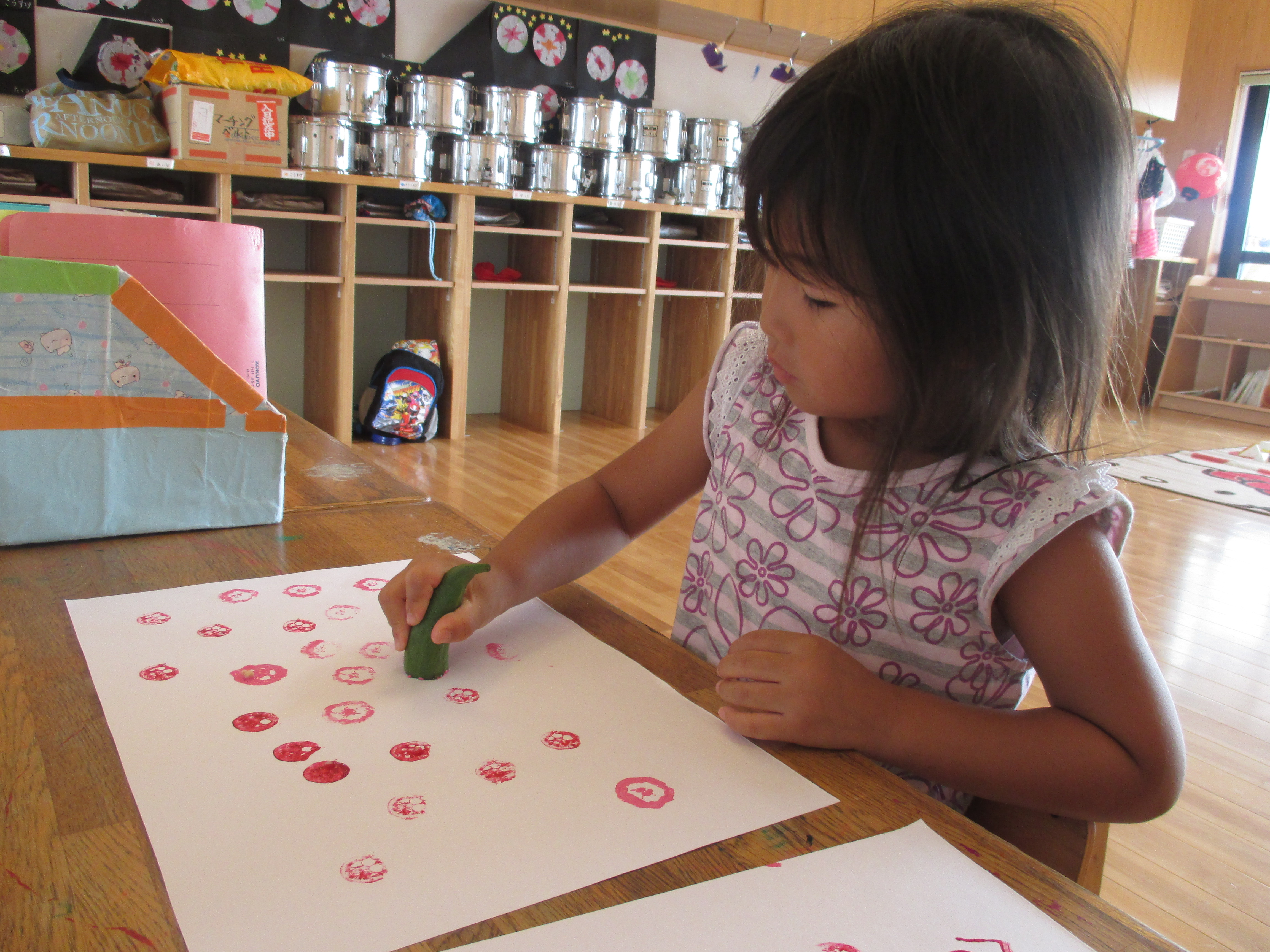 野菜スタンプ 8月25日(火) ぞう組さんは夏野菜のオクラを観察した後に、輪切りにして野菜スタンプあそびを行いました。 『お星様みたいだね~』 『お花みたい』 紙面いっぱいにオクラのスタンプを押して遊びました。