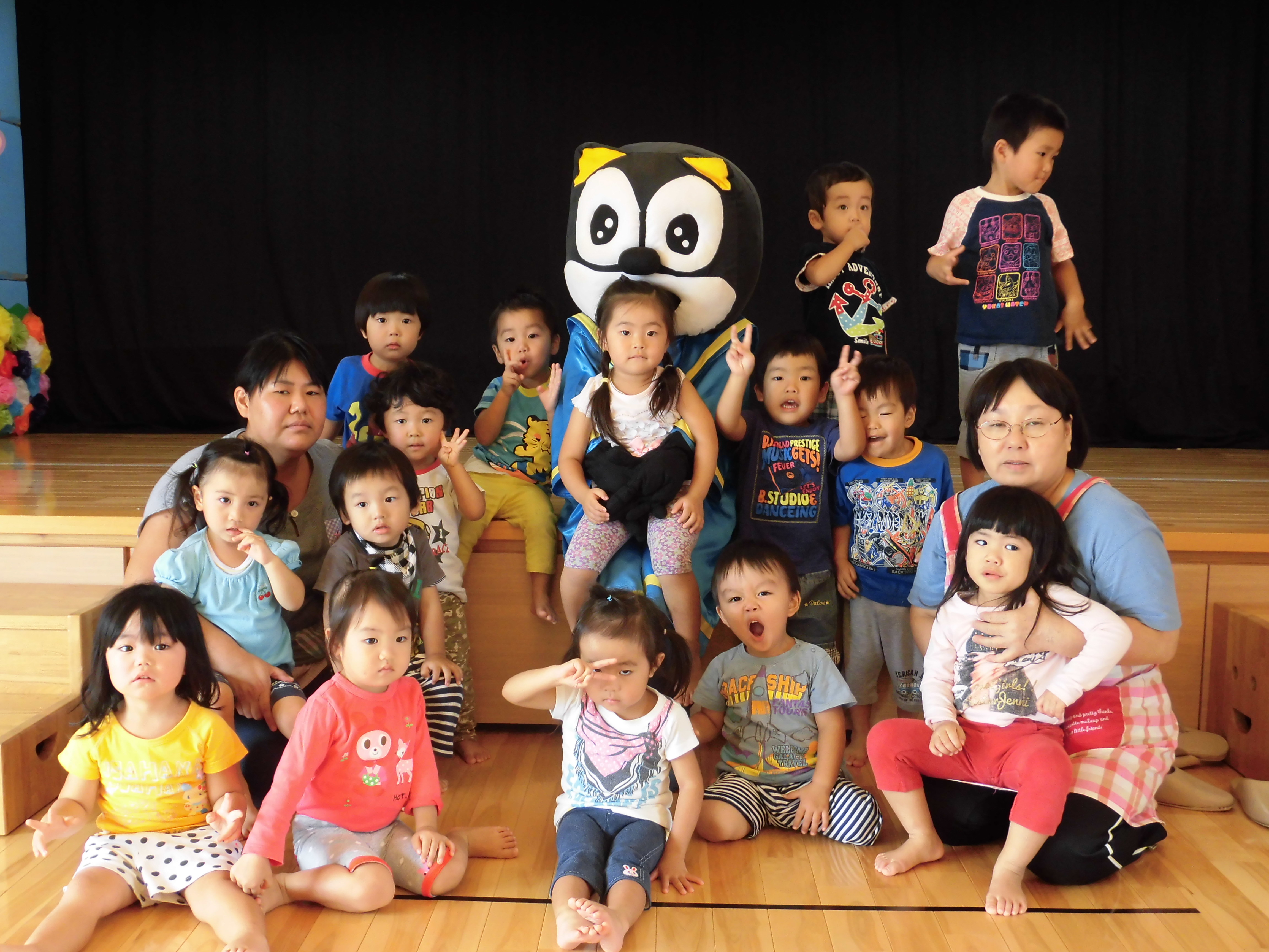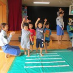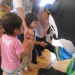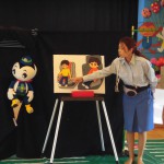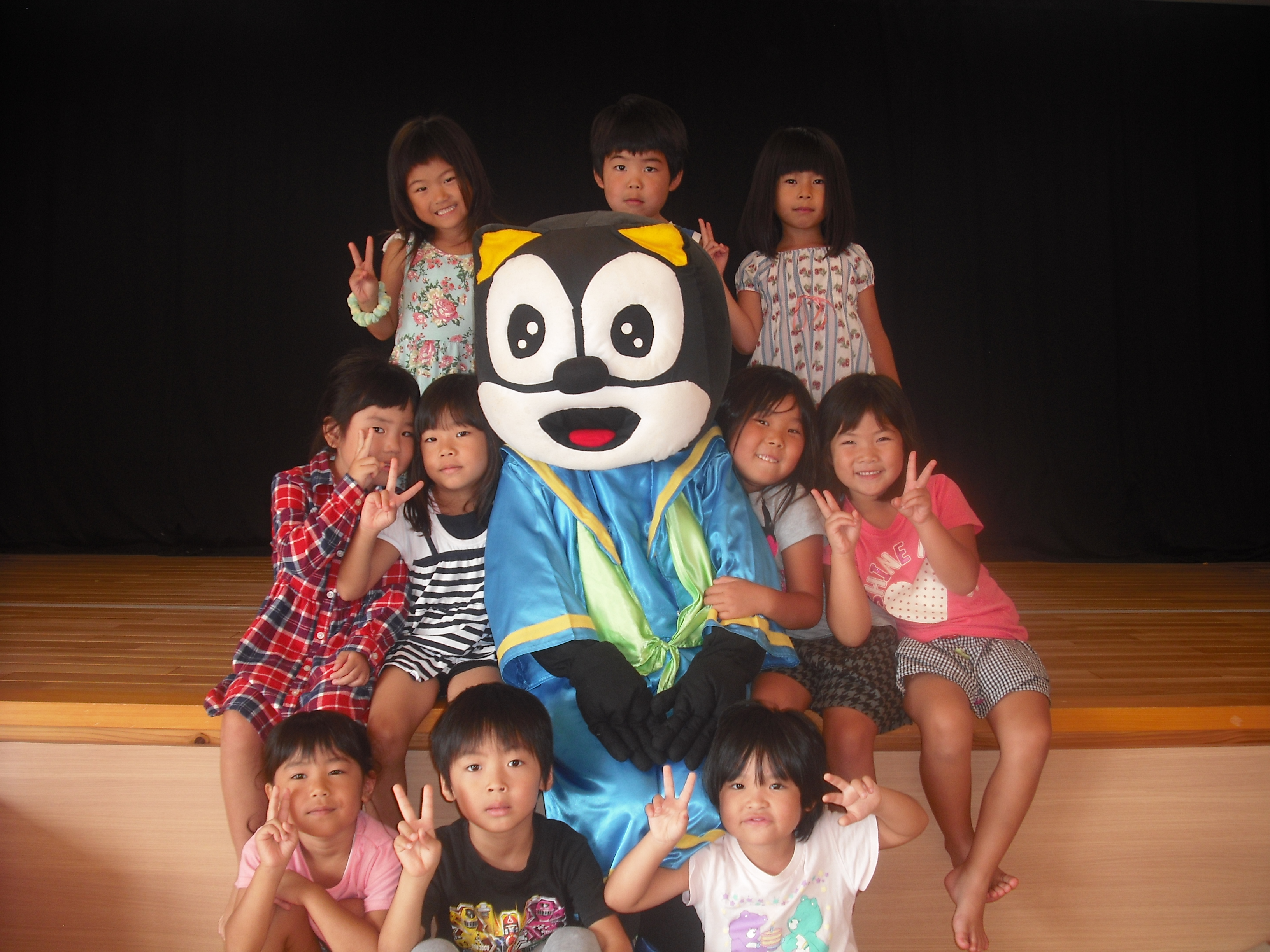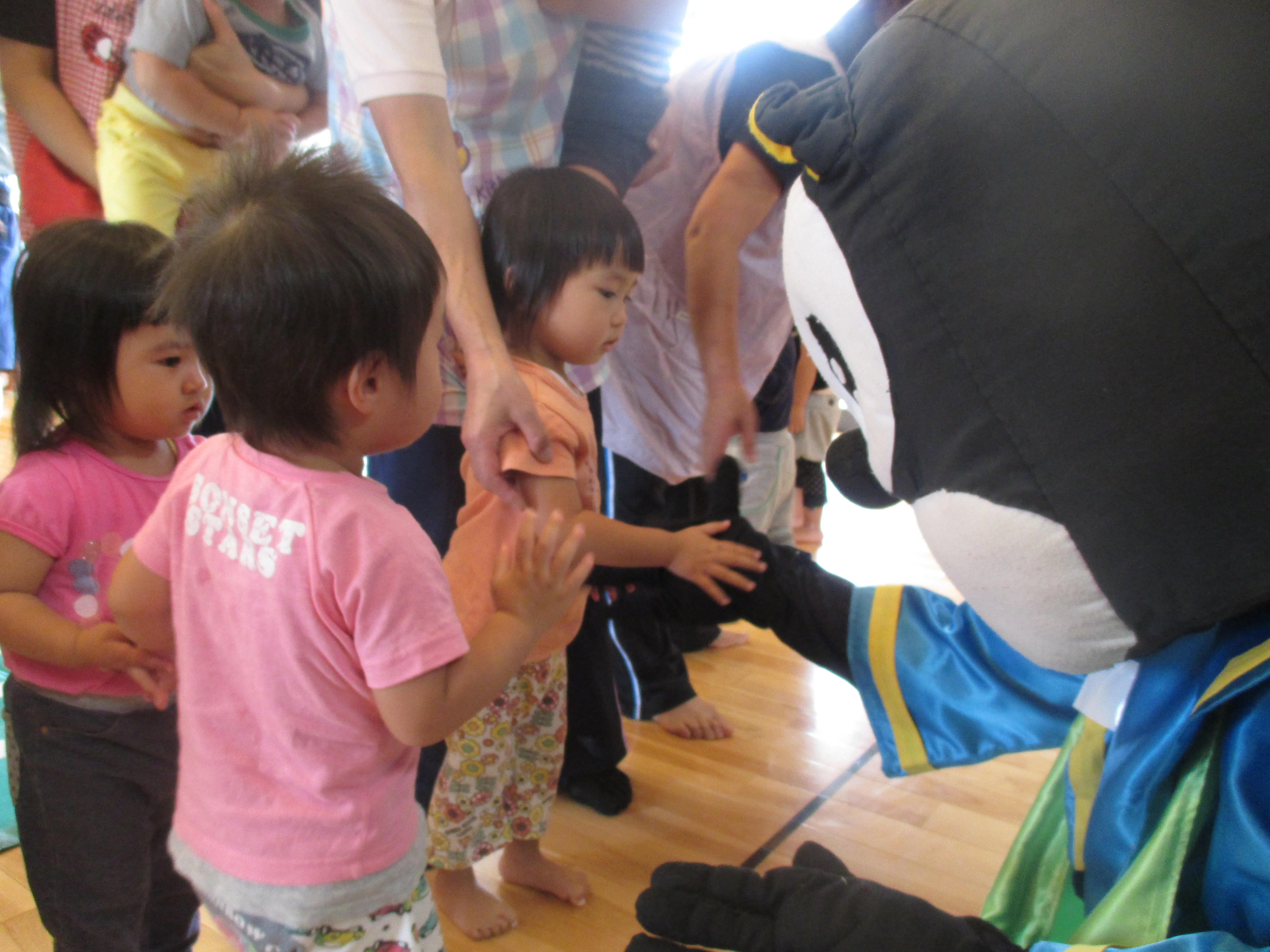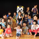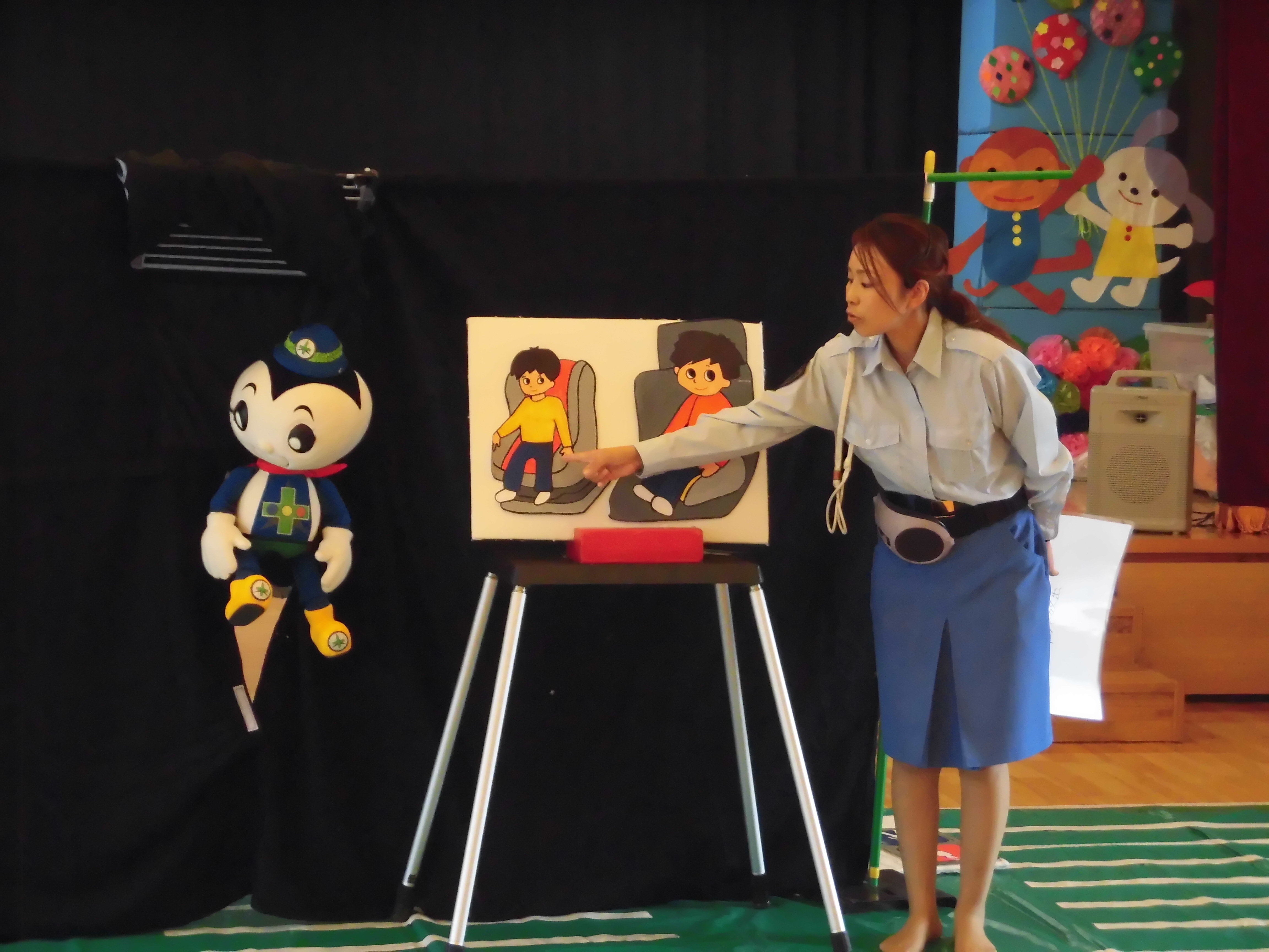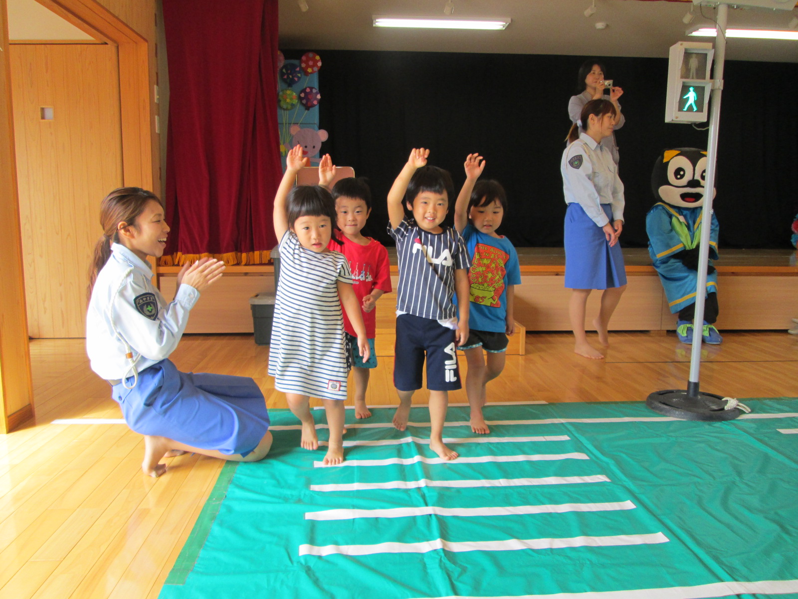 交通指導 10月1日(木) 今年も残念ながら雨になり、室内での交通指導となりました。 『まもりん』が信号やシートベルトについてわかりやすく教えてくれた後は、『ラッキー君』と一緒に横断歩道を渡る練習をしました。 手をあげて右左右・・・しっかり確認して横断歩道を渡ります。上手に渡れたら『ラッキー君』と握手! 交通ルールを守れるようにお約束をしましたよ。