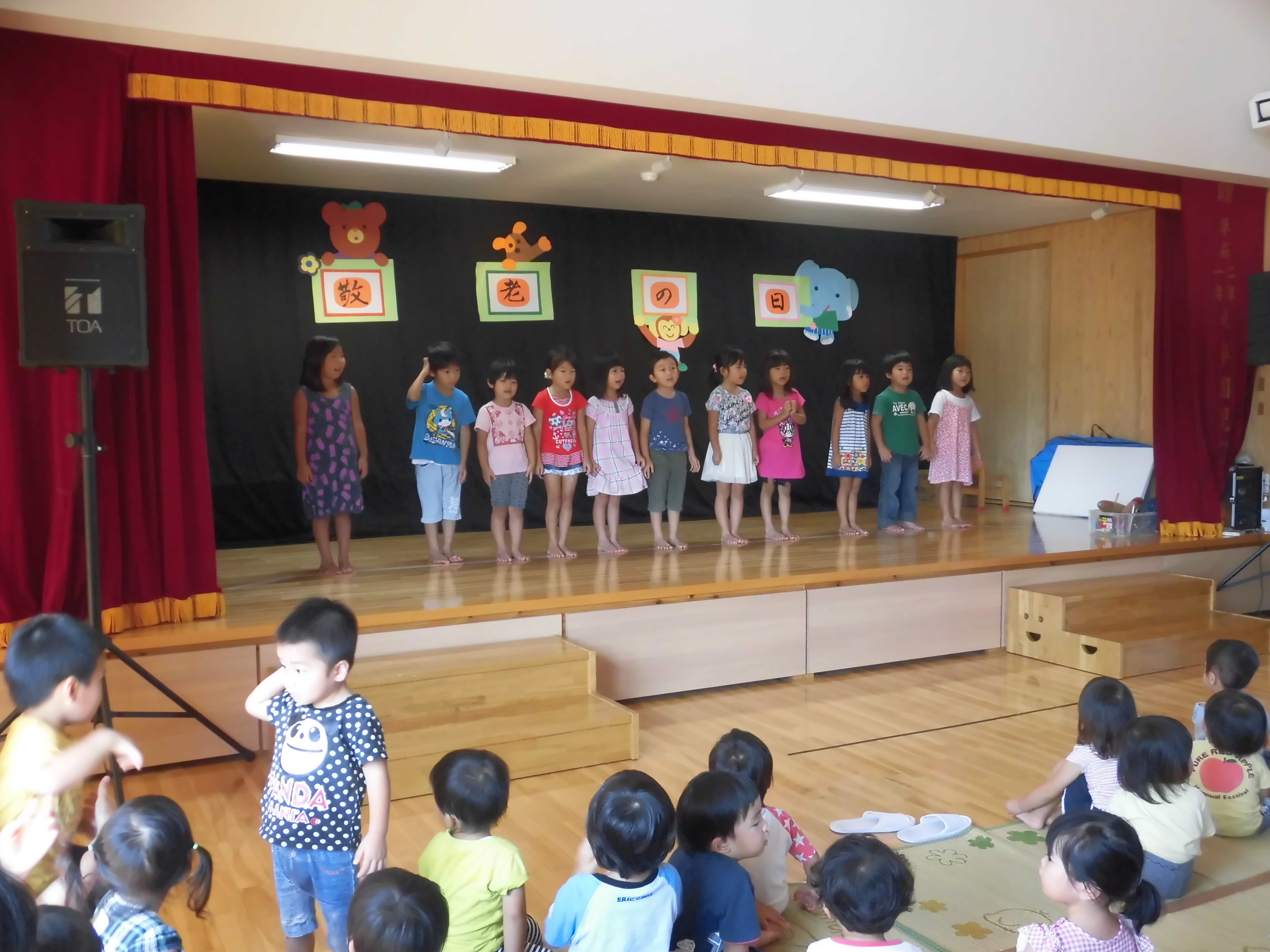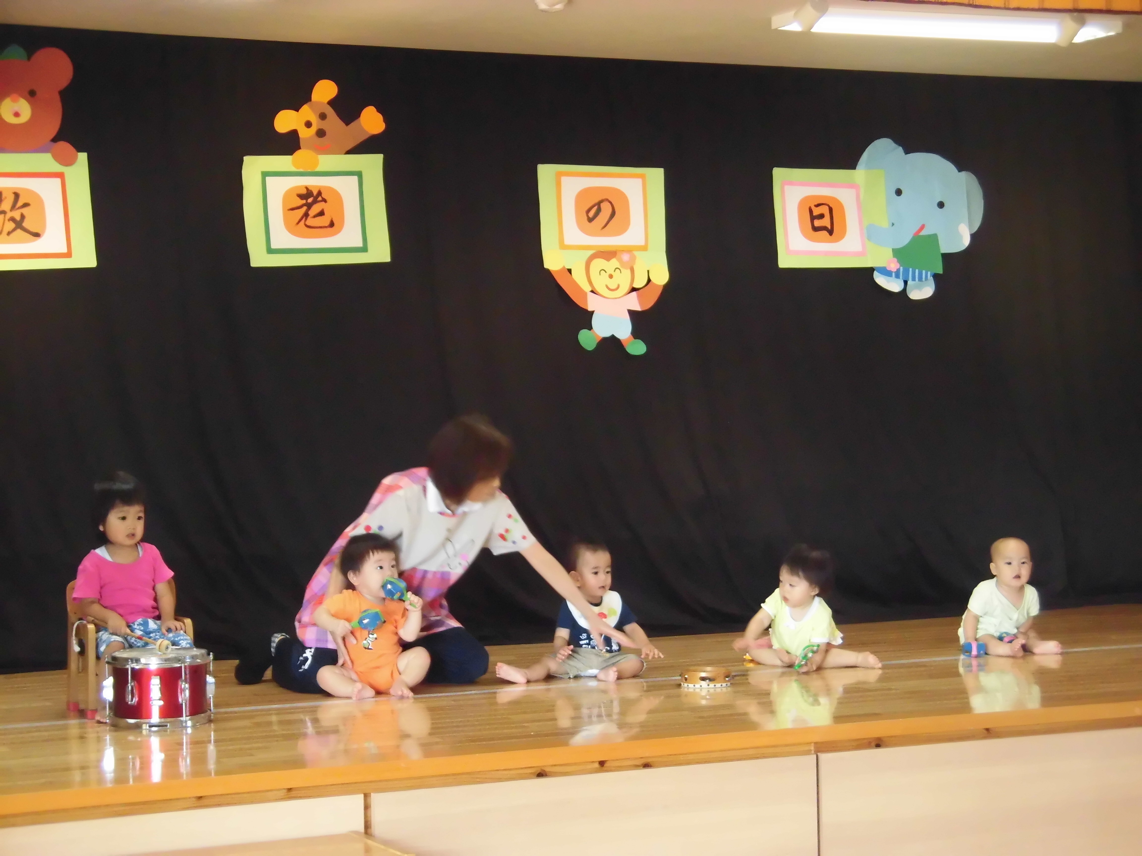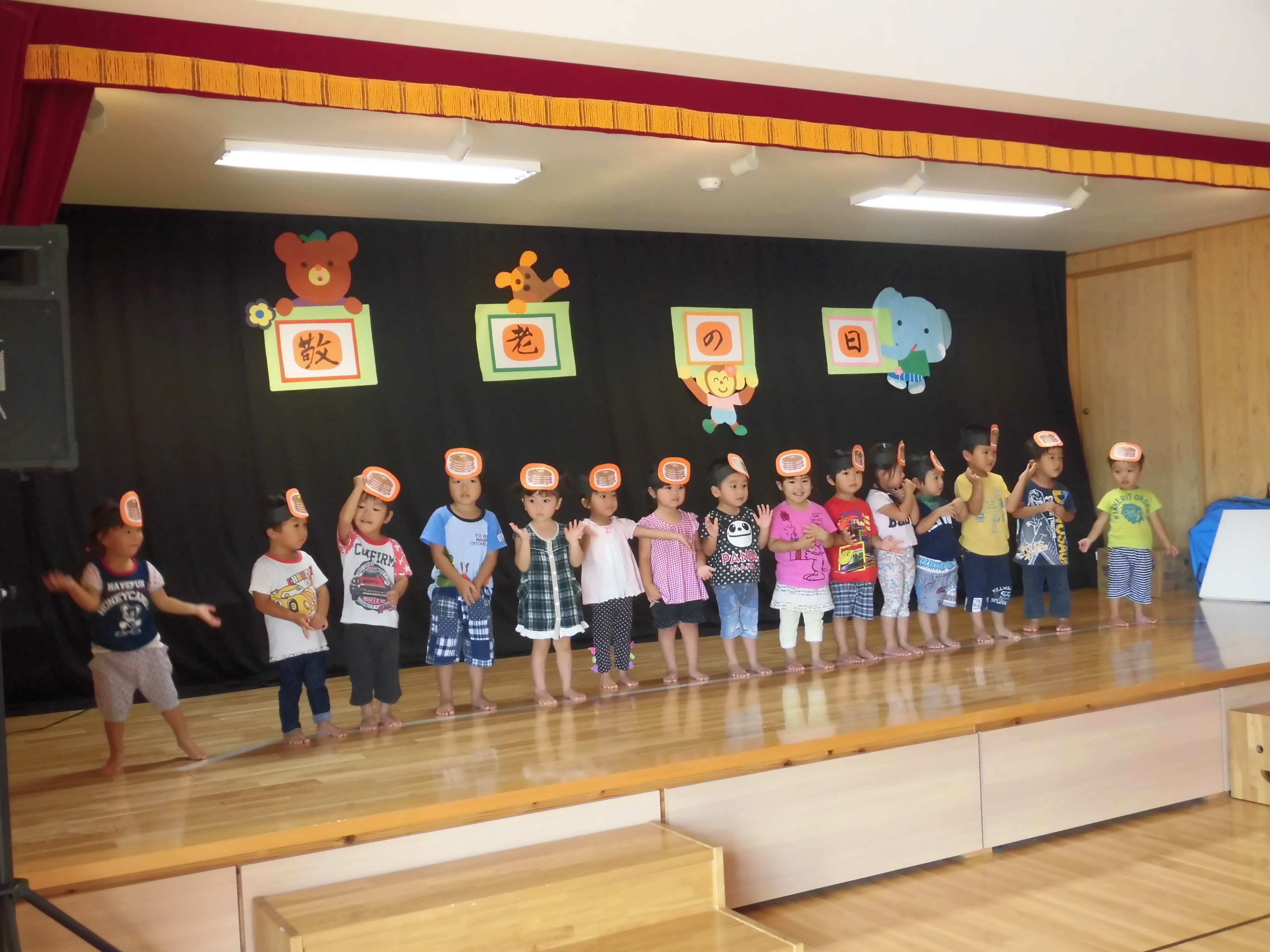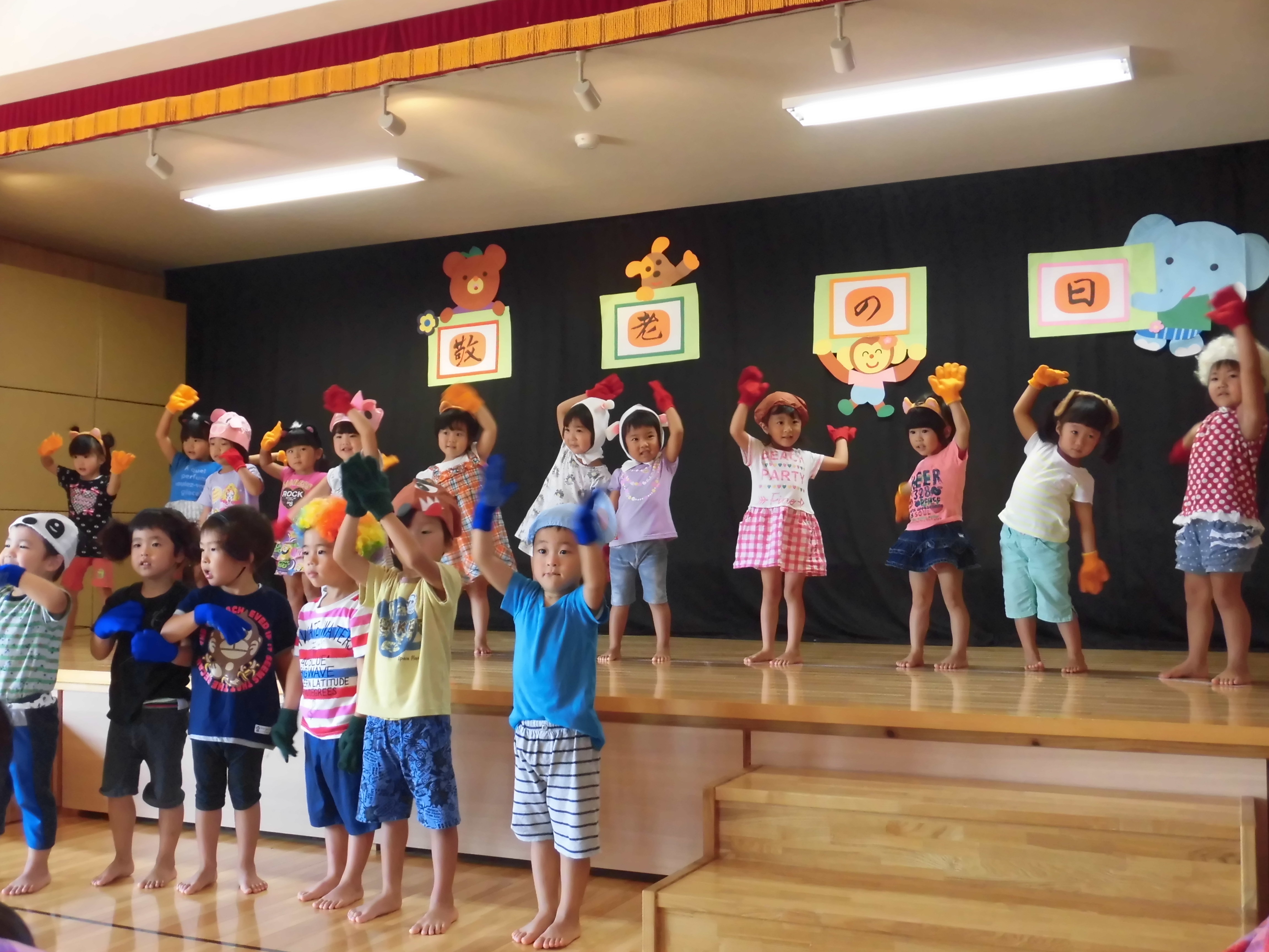 敬老祝い 9月18日(金) 今日は、おじいちゃん・おばあちゃんを招いて敬老祝いを行いました。 歌やダンス、劇に踊りなどを披露したり、触れ合い遊びを楽しんだりと保育園での様子を見ていただきました。 活動の後は一緒に給食を食べ、楽しいひと時を過ごしました。