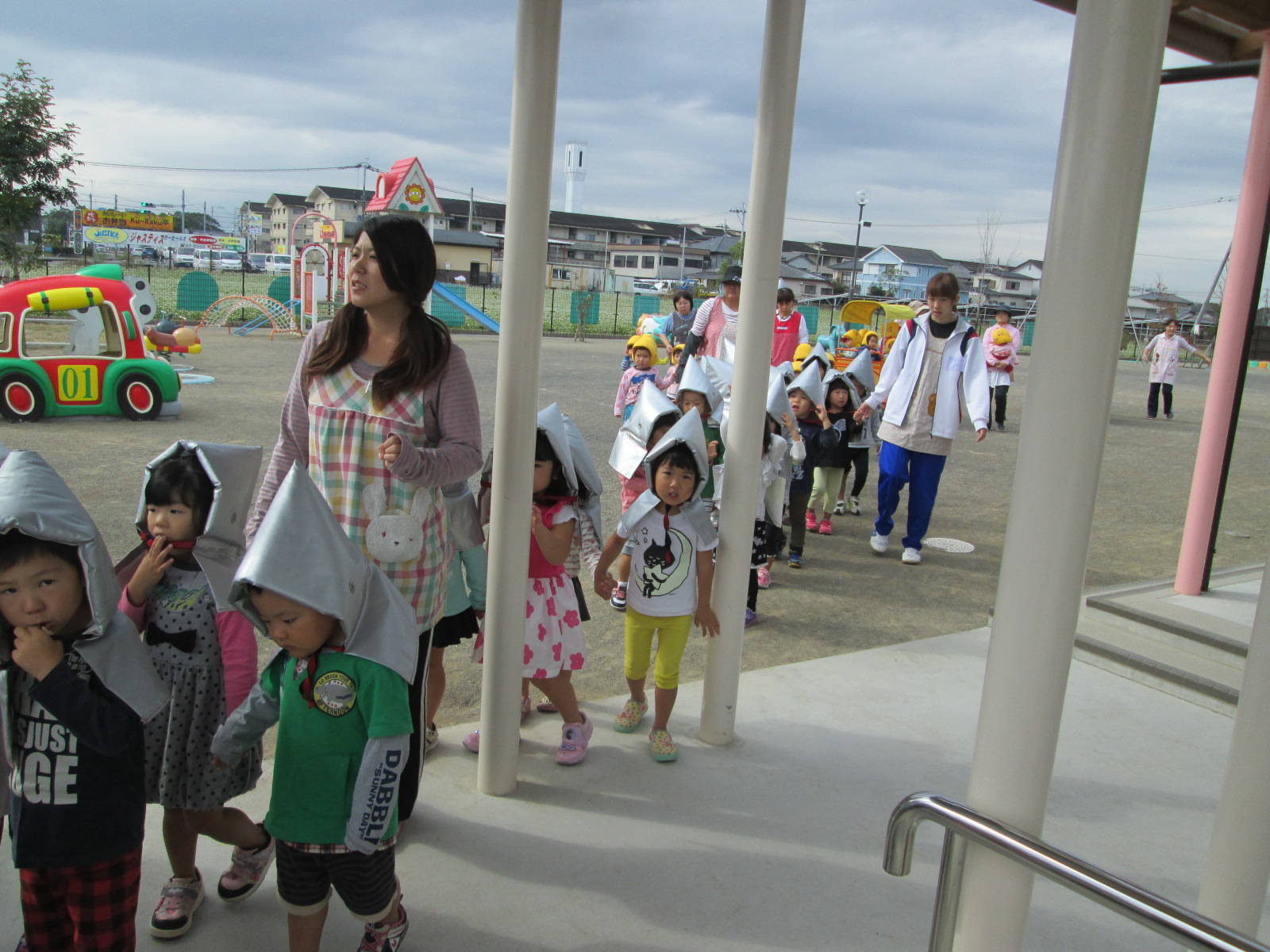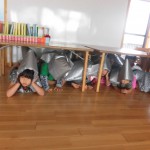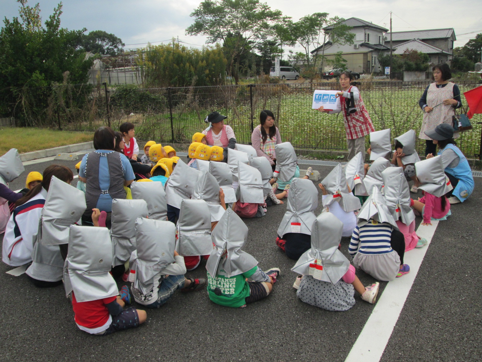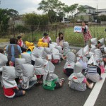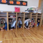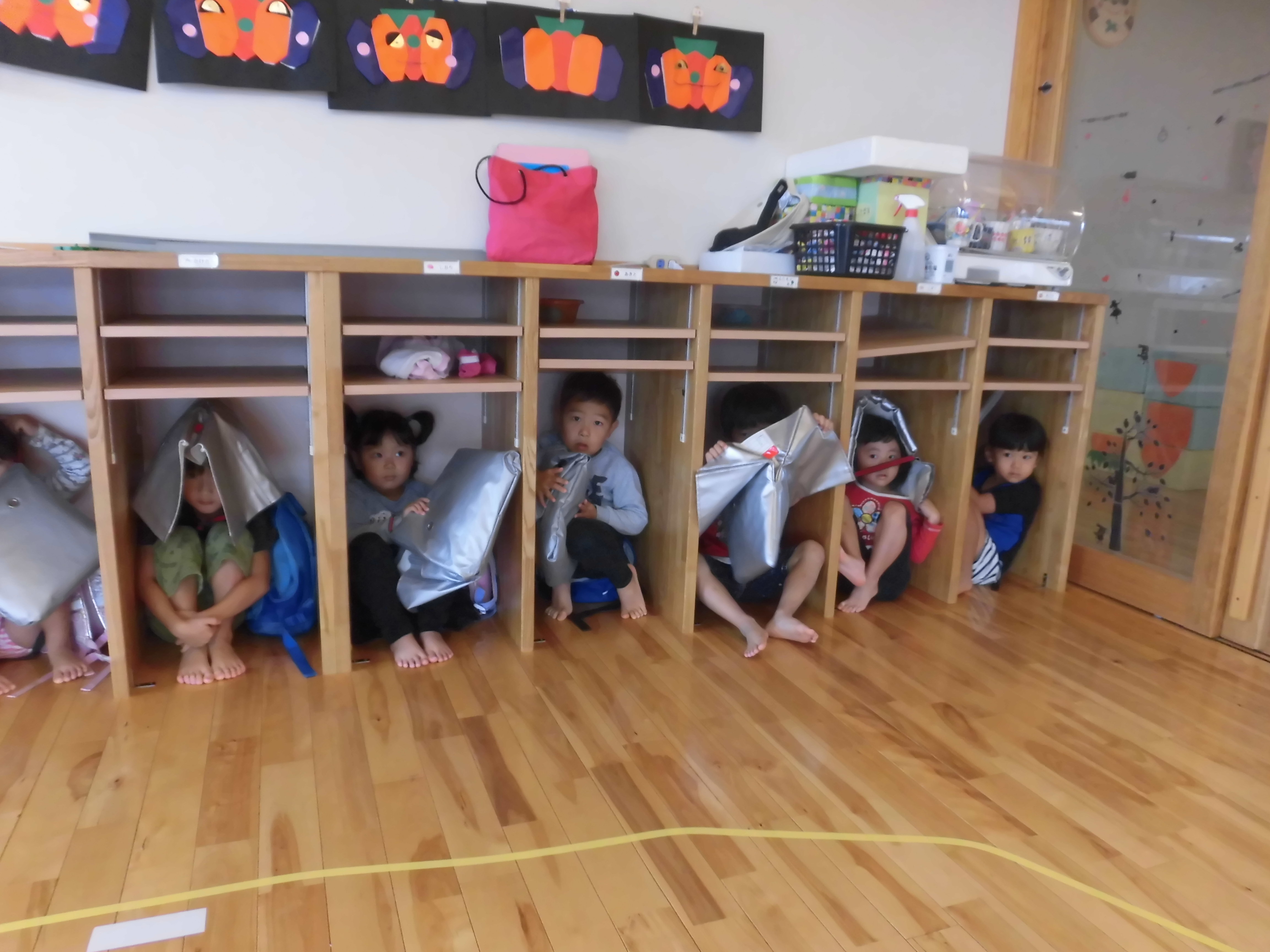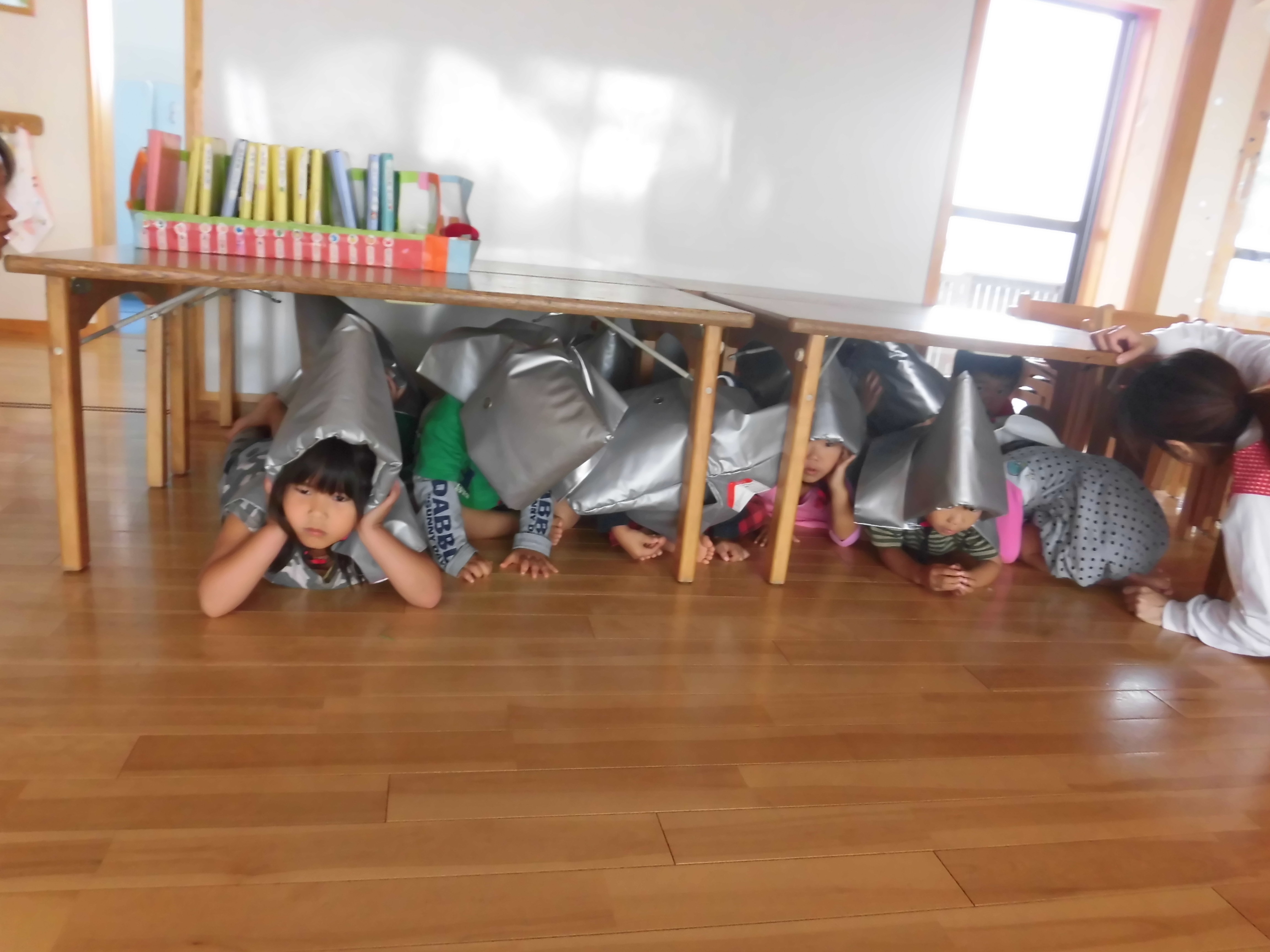 みやざきシェイクアウト 11月5日(木) 今日は、『津波防災の日』です。そして、『みやざきシェイクアウト』の日でした。 午前10時に、南海トラフ巨大地震が発生したとの想定で避難訓練を行いました。 地震の知らせを聞くと、子ども達はロッカーや机の下に急いで避難。揺れがおさまった放送後に、1次避難と2次避難を行いました。 自らの身は自らで守るということで、安全確保行動(まず低く・頭を守り・動かない)を学び、地震が発生したときにはどのような行動をとるのか、津波がきたら何処に逃げるのか再確認を行いました。