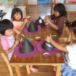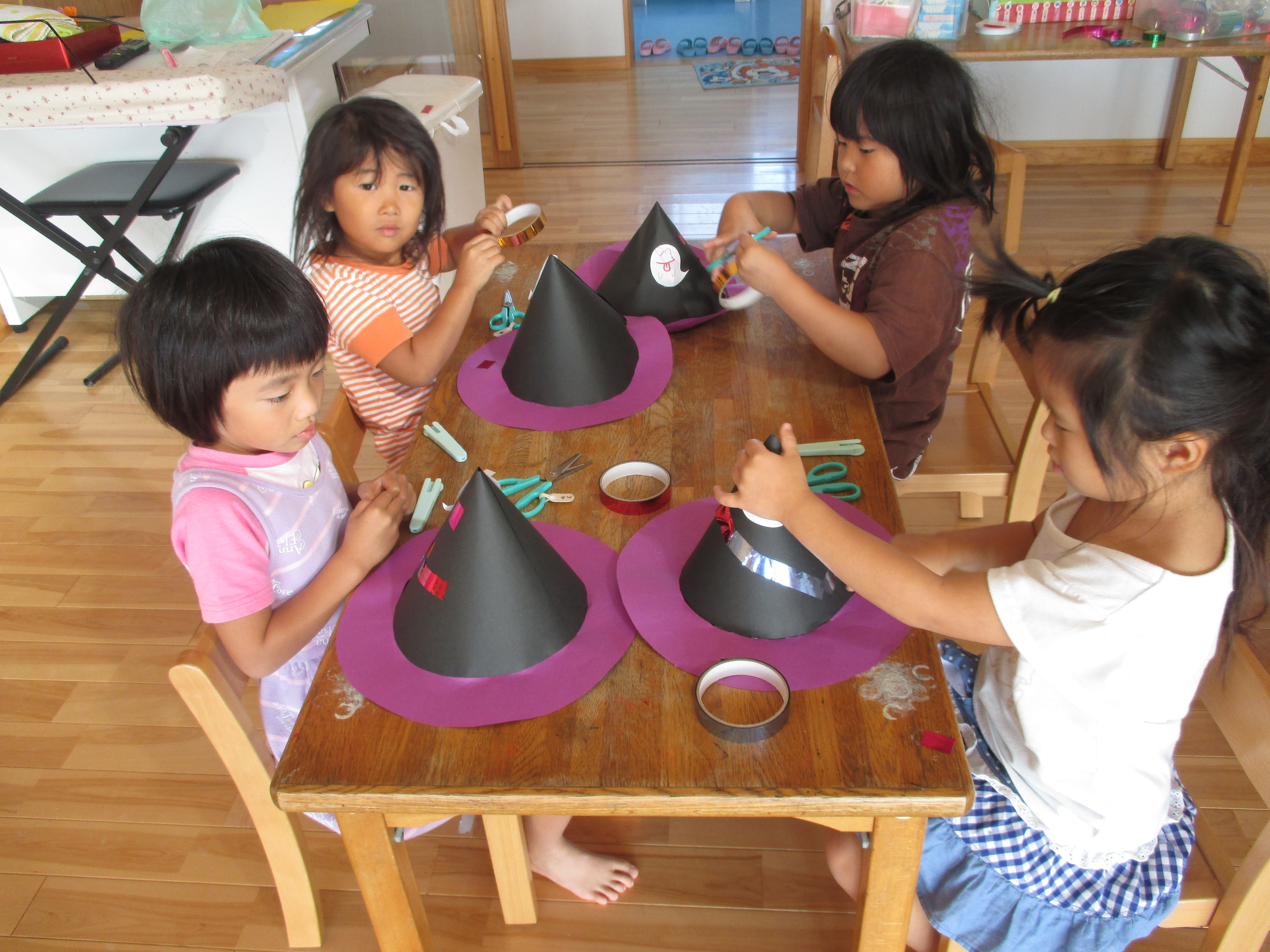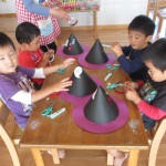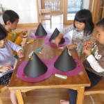 ぞう組さんは、ハロウィンに向けて帽子を製作中。