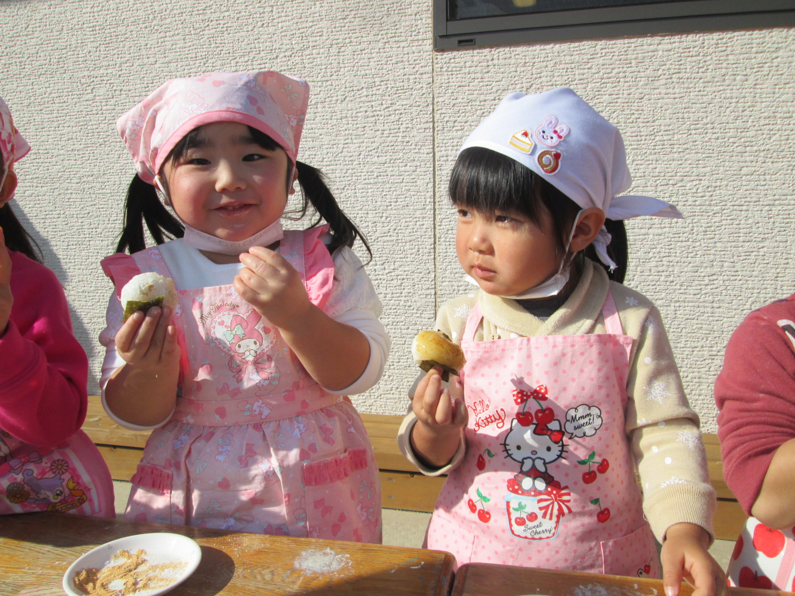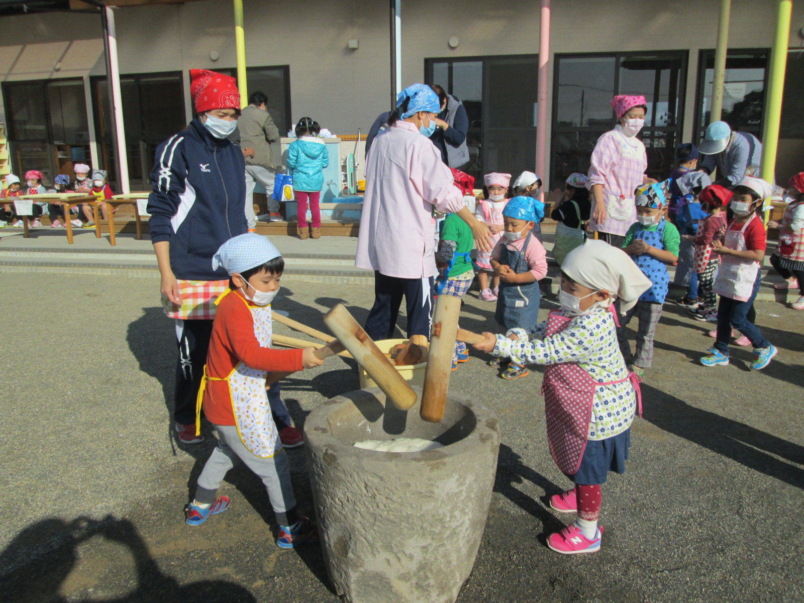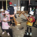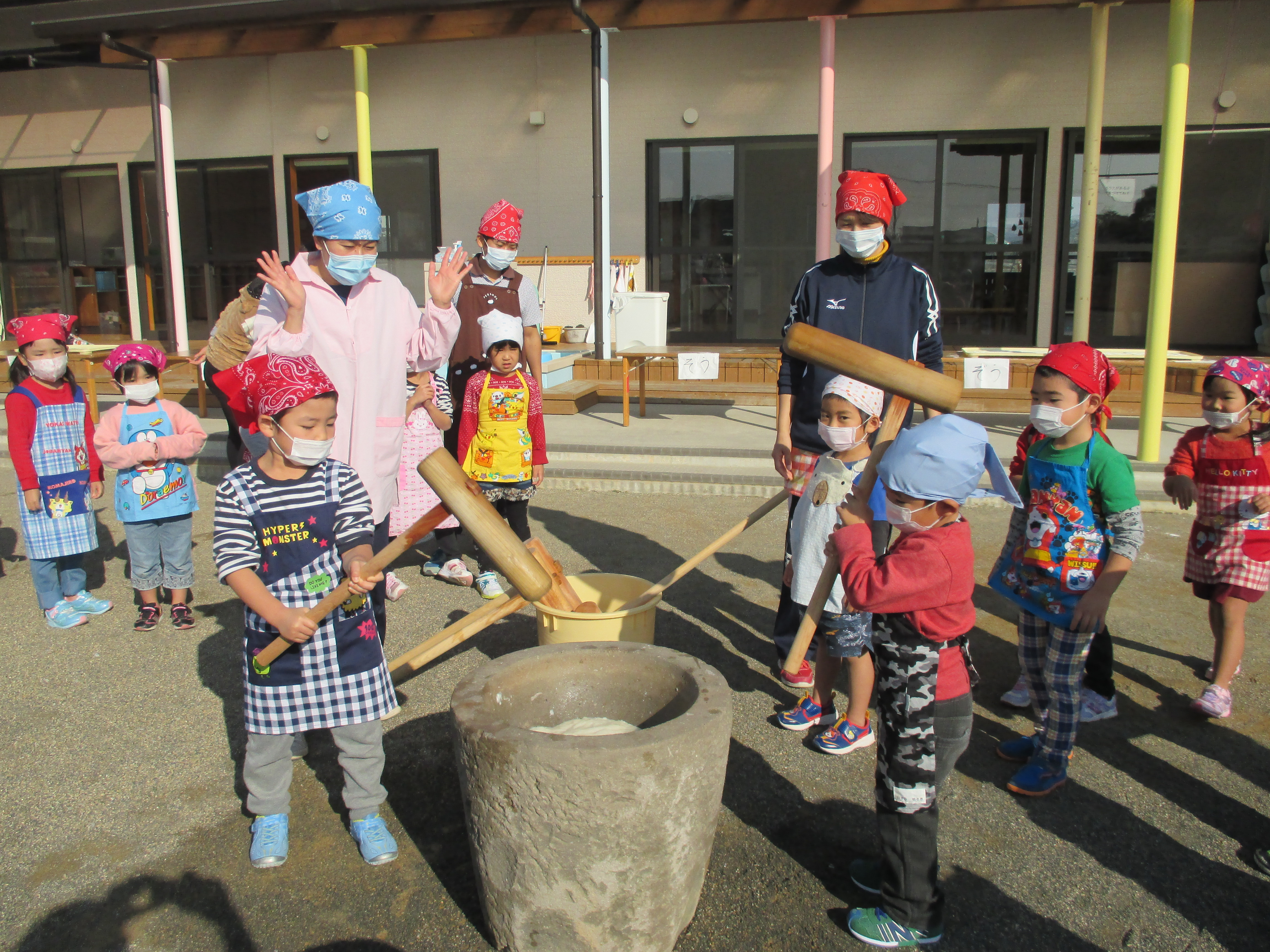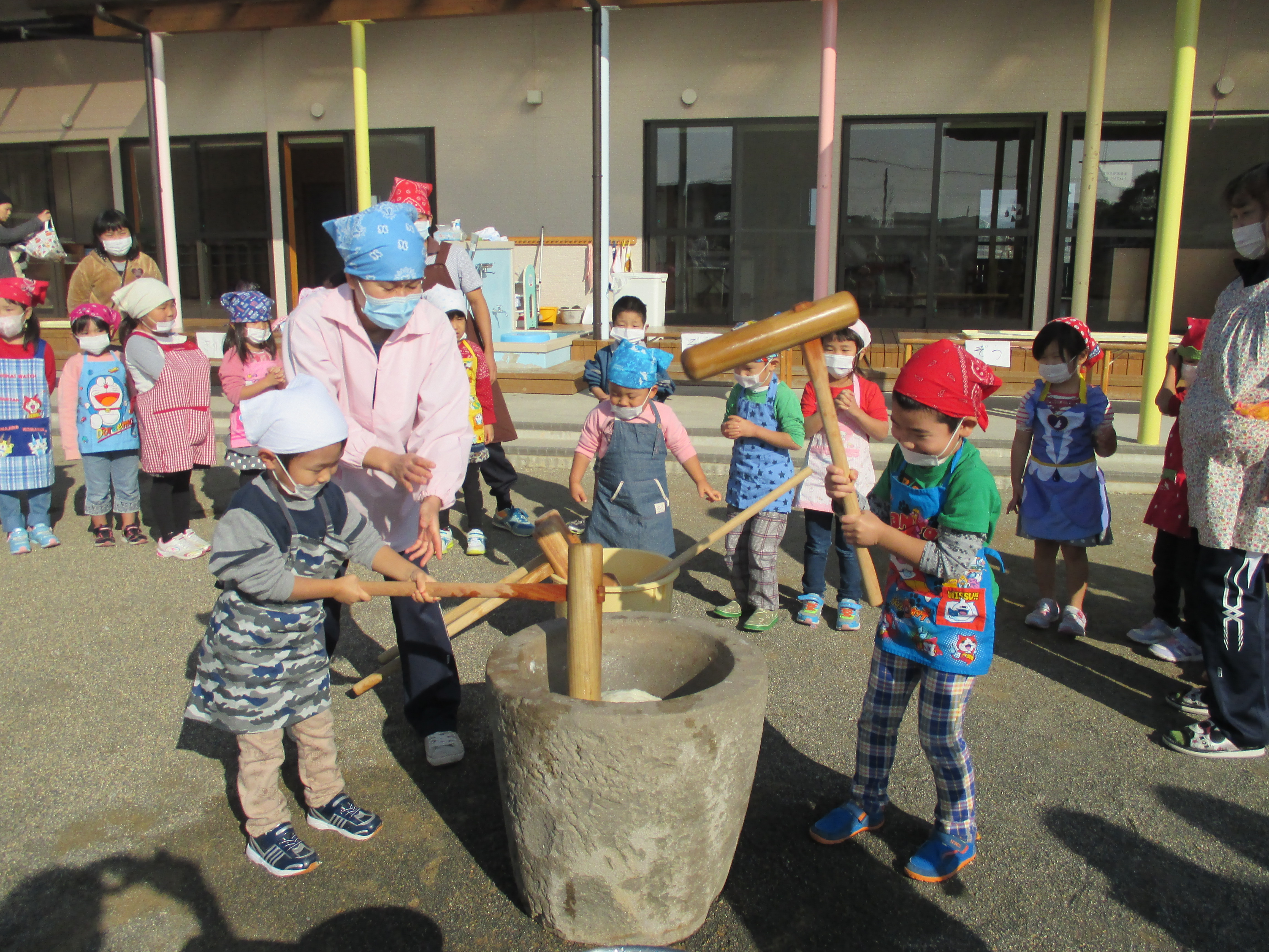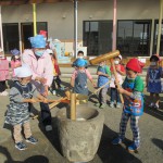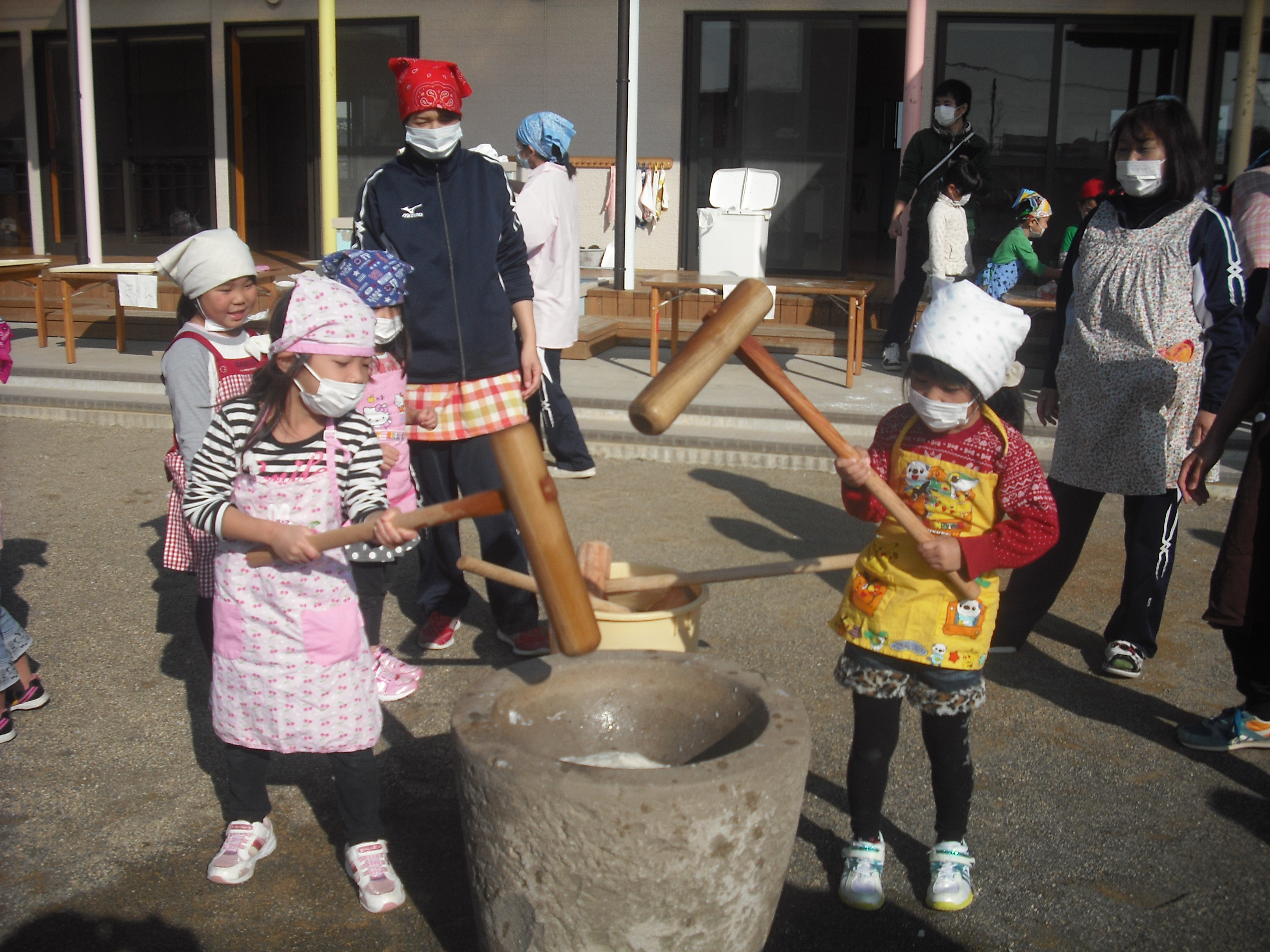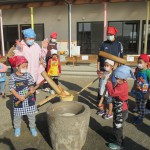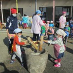 もちつき大会 12月26日(土) 恒例の『もちつき大会』が行われました。 未満児さんは、小麦粉粘土を使って餅つきあそびを楽しみました。 以上児さんは、杵を持ち上げペッタンコ~♪ 息を合わせて交互についていきます。 丸めたお餅を焼いてもらい、お腹一杯食べましたよ~。