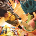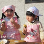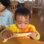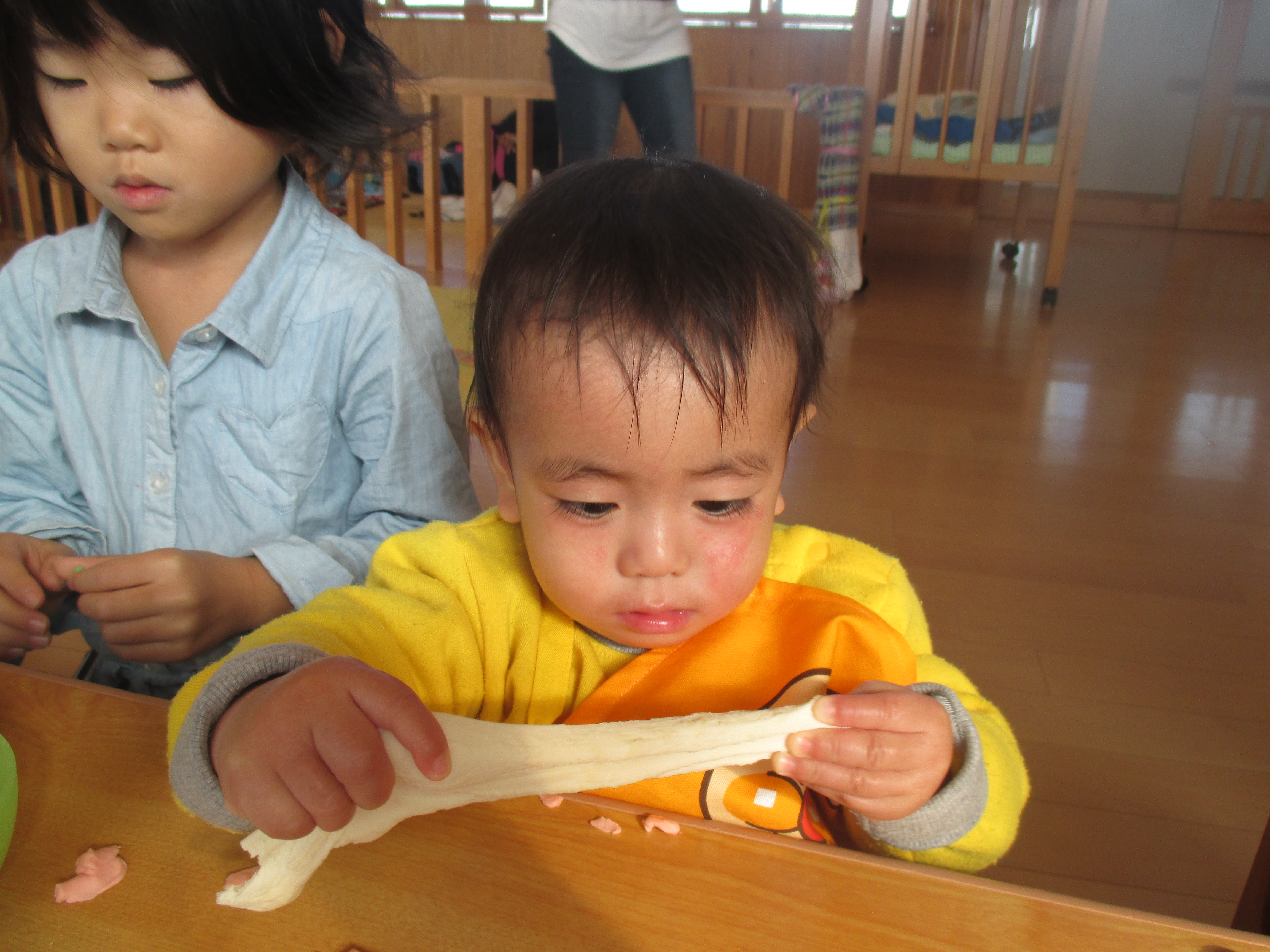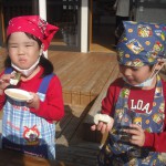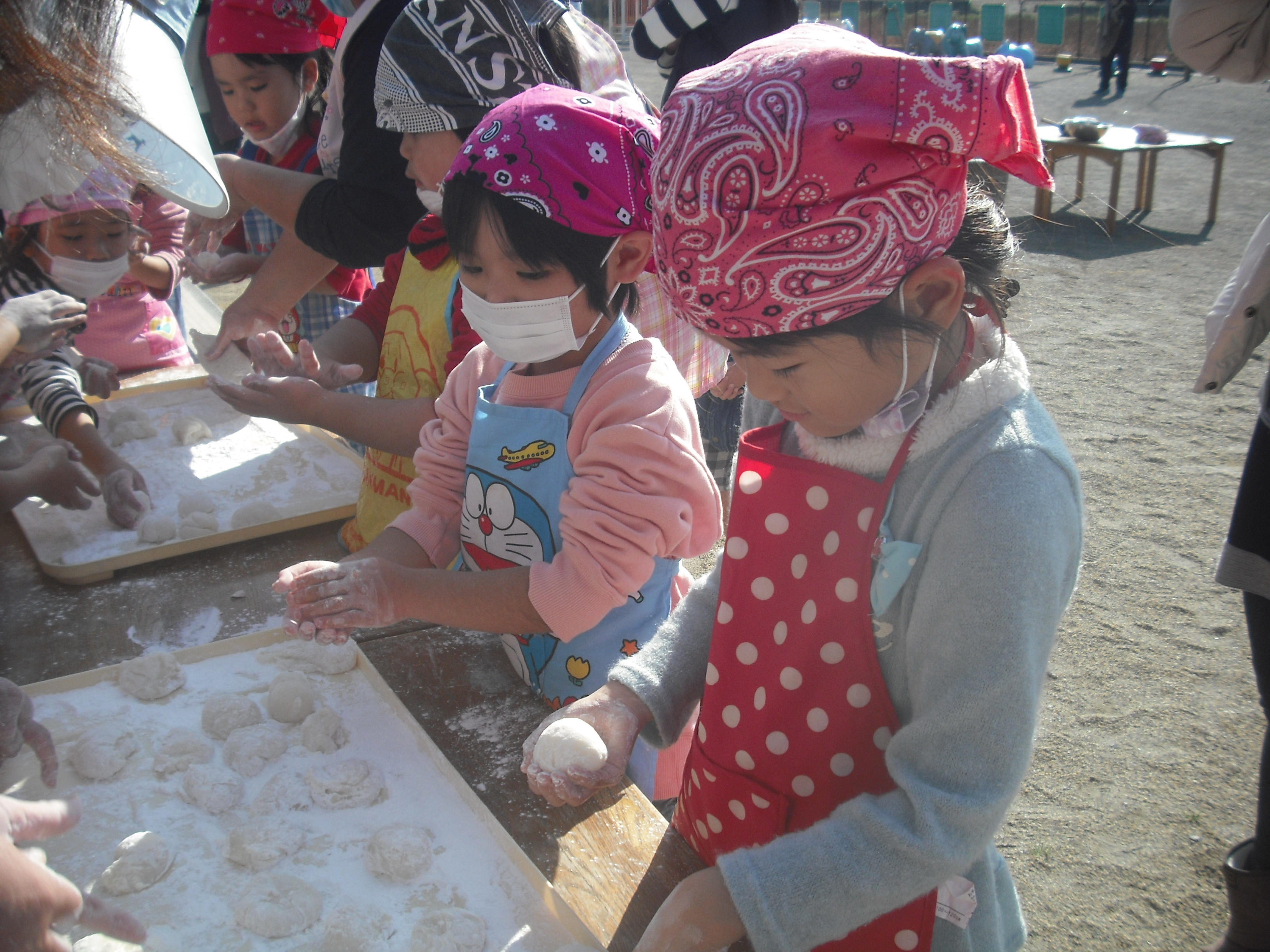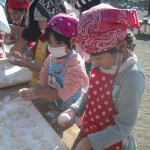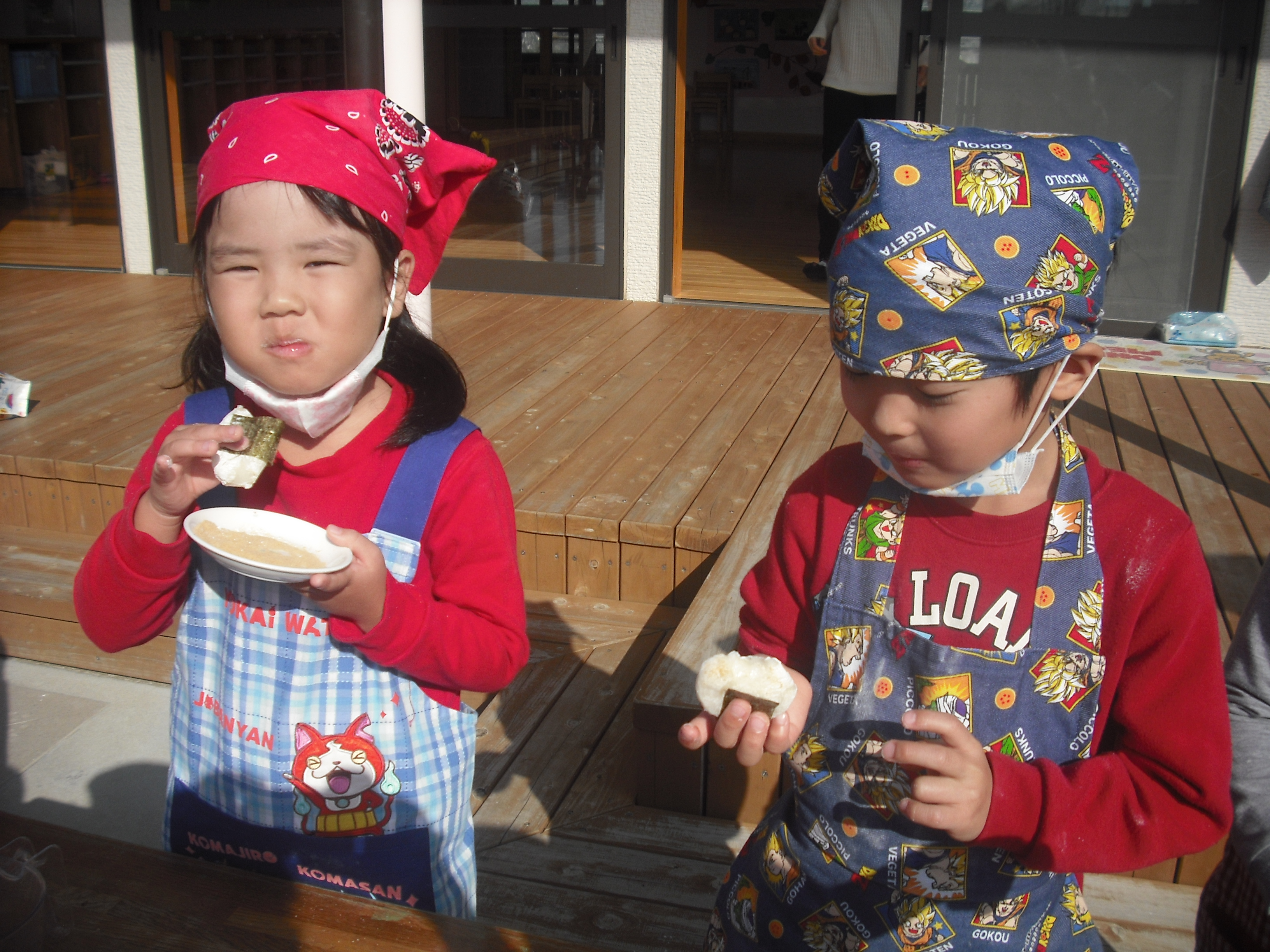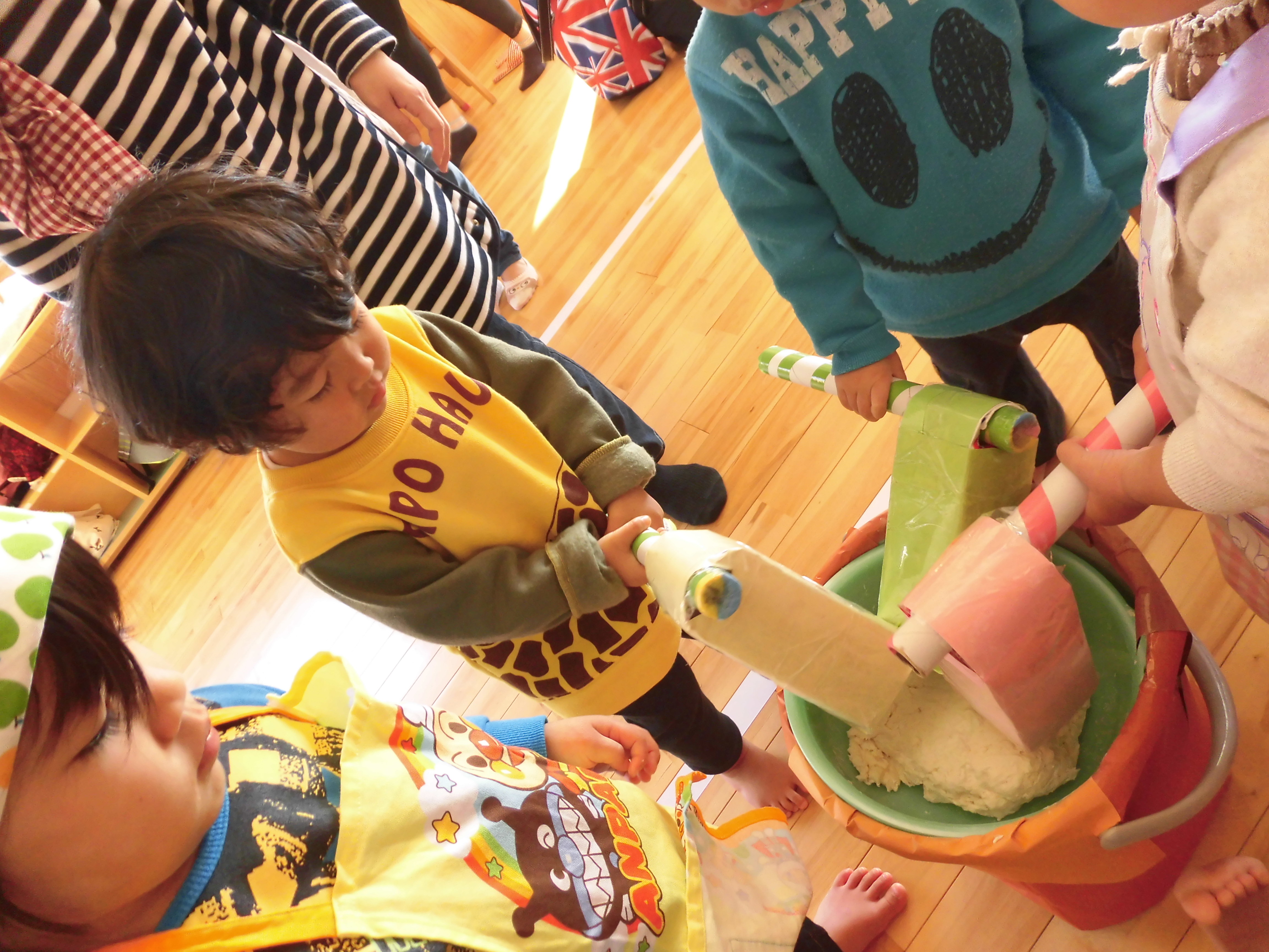 もちつき大会 12月26日(土) 恒例の『もちつき大会』が行われました。 未満児さんは、小麦粉粘土を使って餅つきあそびを楽しみました。 以上児さんは、杵を持ち上げペッタンコ~♪ 息を合わせて交互についていきます。 丸めたお餅を焼いてもらい、お腹一杯食べましたよ~。