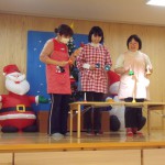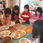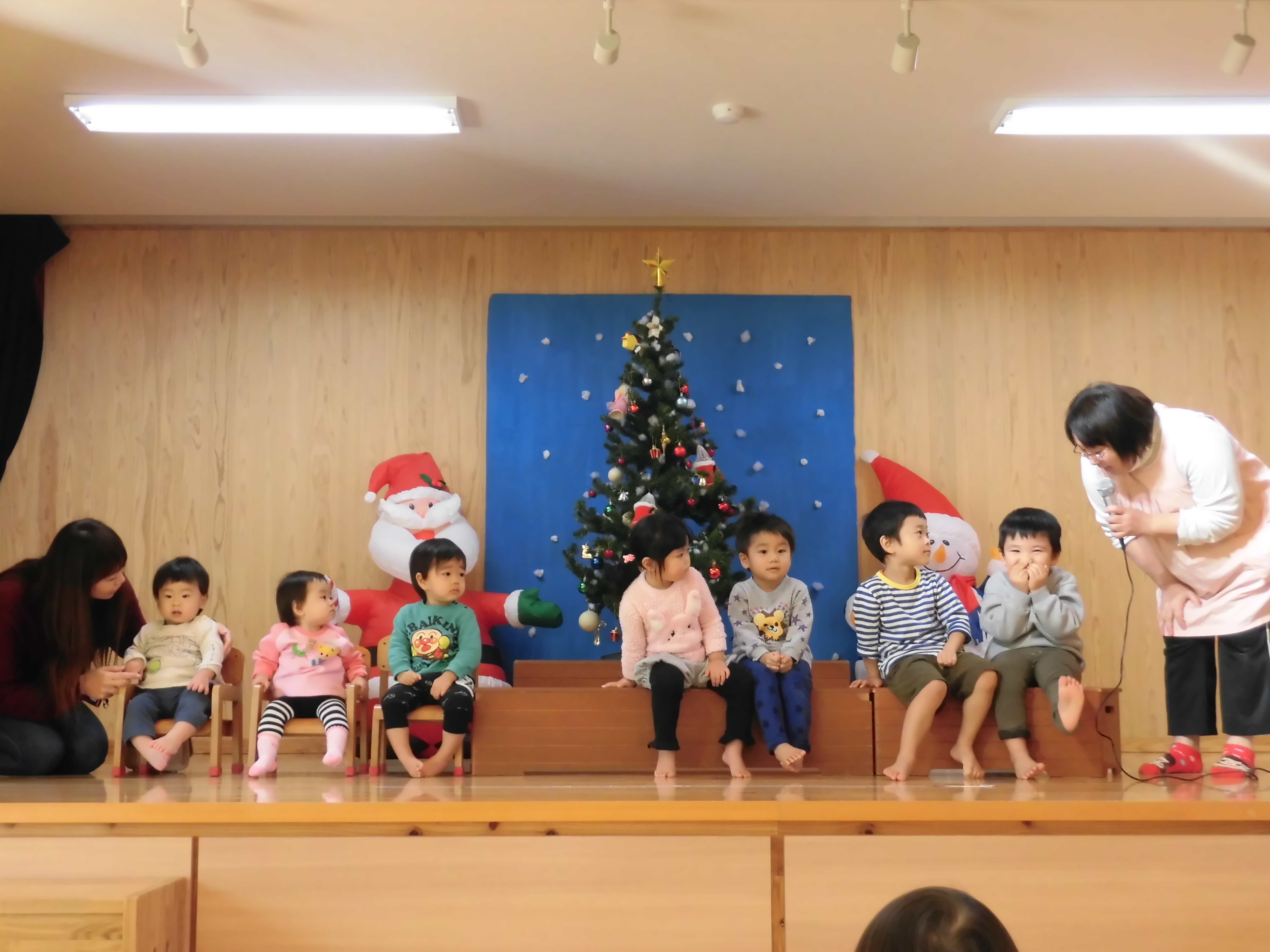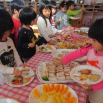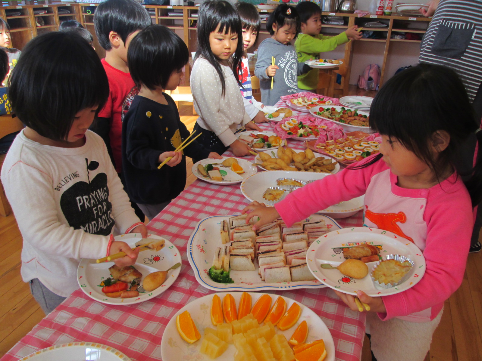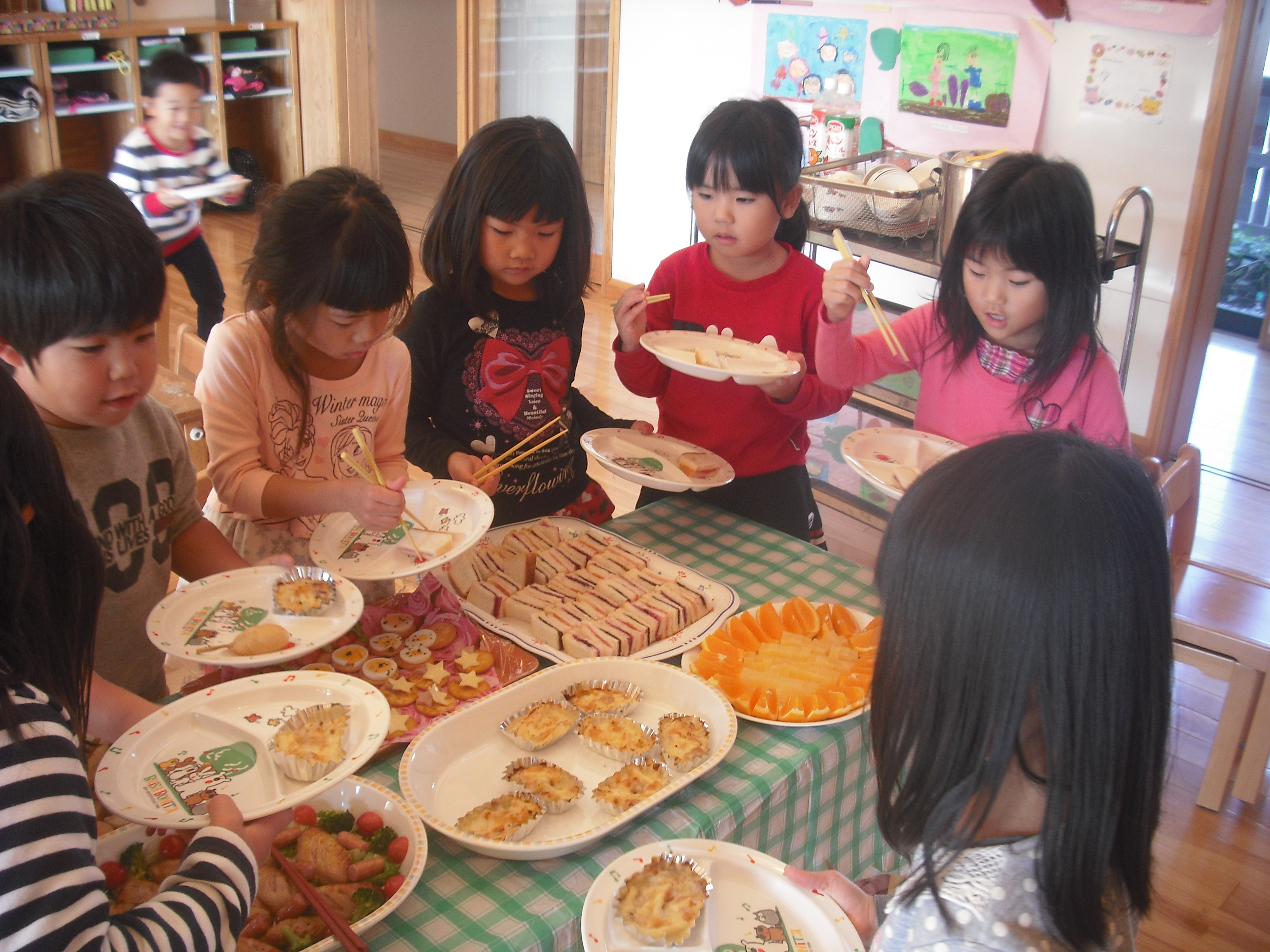 クリスマス会&12月誕生会 12月25日(金) 今日は、クリスマス会&誕生会ということで、ご馳走がいっぱい! サンドイッチ、マカロニグラタン、ローストチキン、アメリカンドッグ、ポテトフライ、カナッペ、コーンスープ、フルーツ盛り合わせetc・・・。 以上児さん達は、ビュッフェスタイルでランチを楽しみました♪
