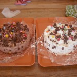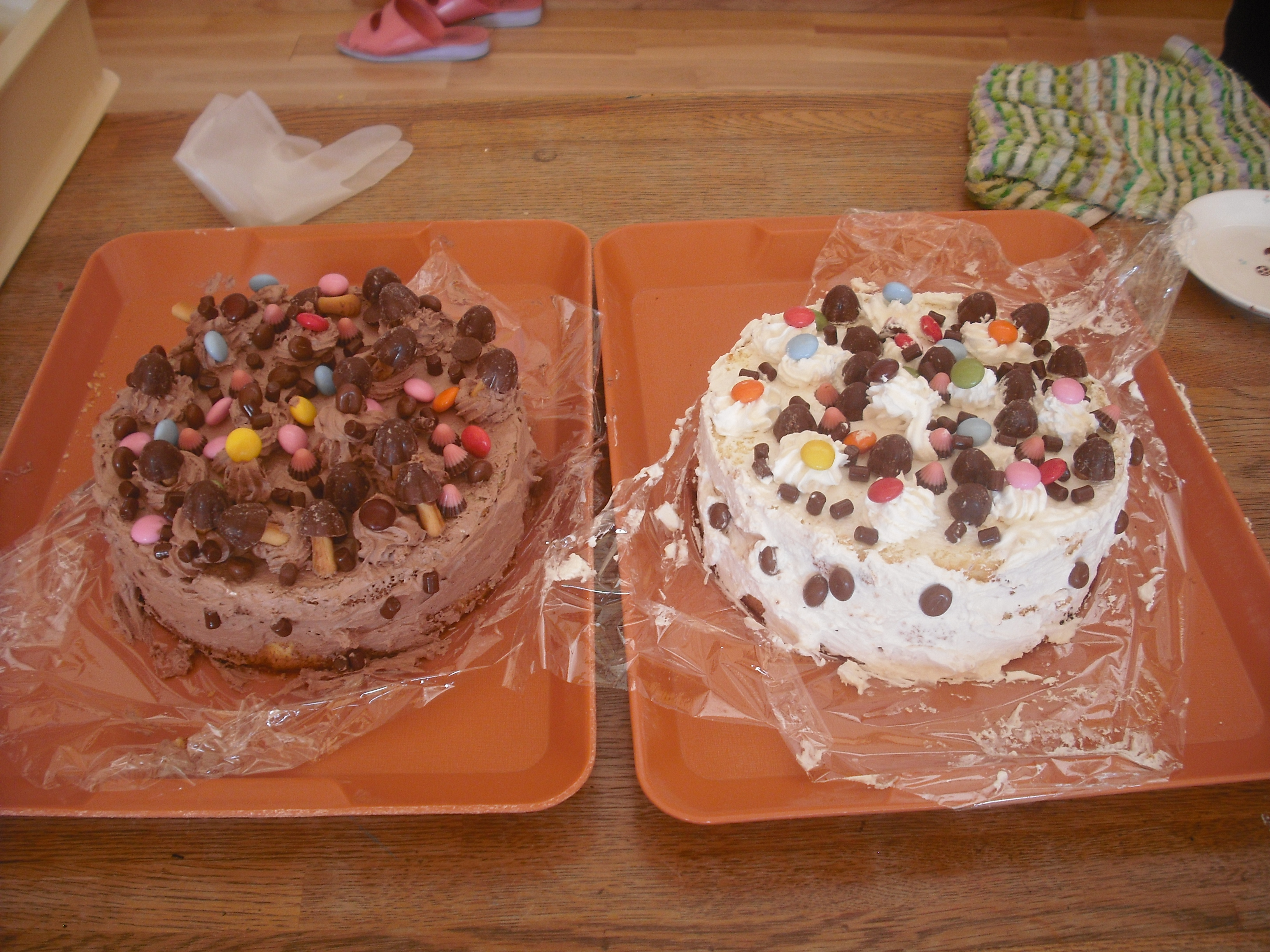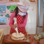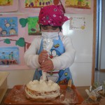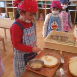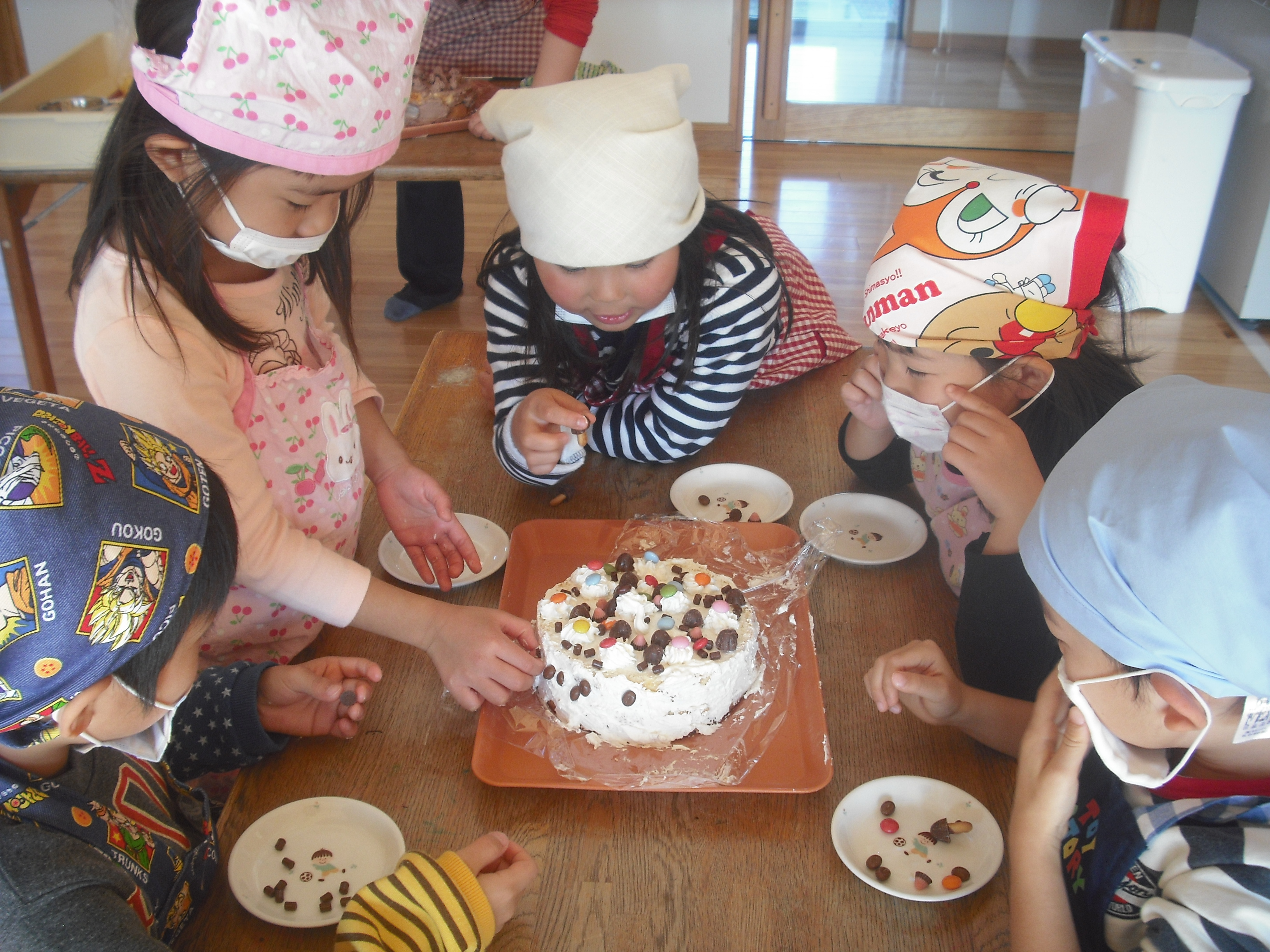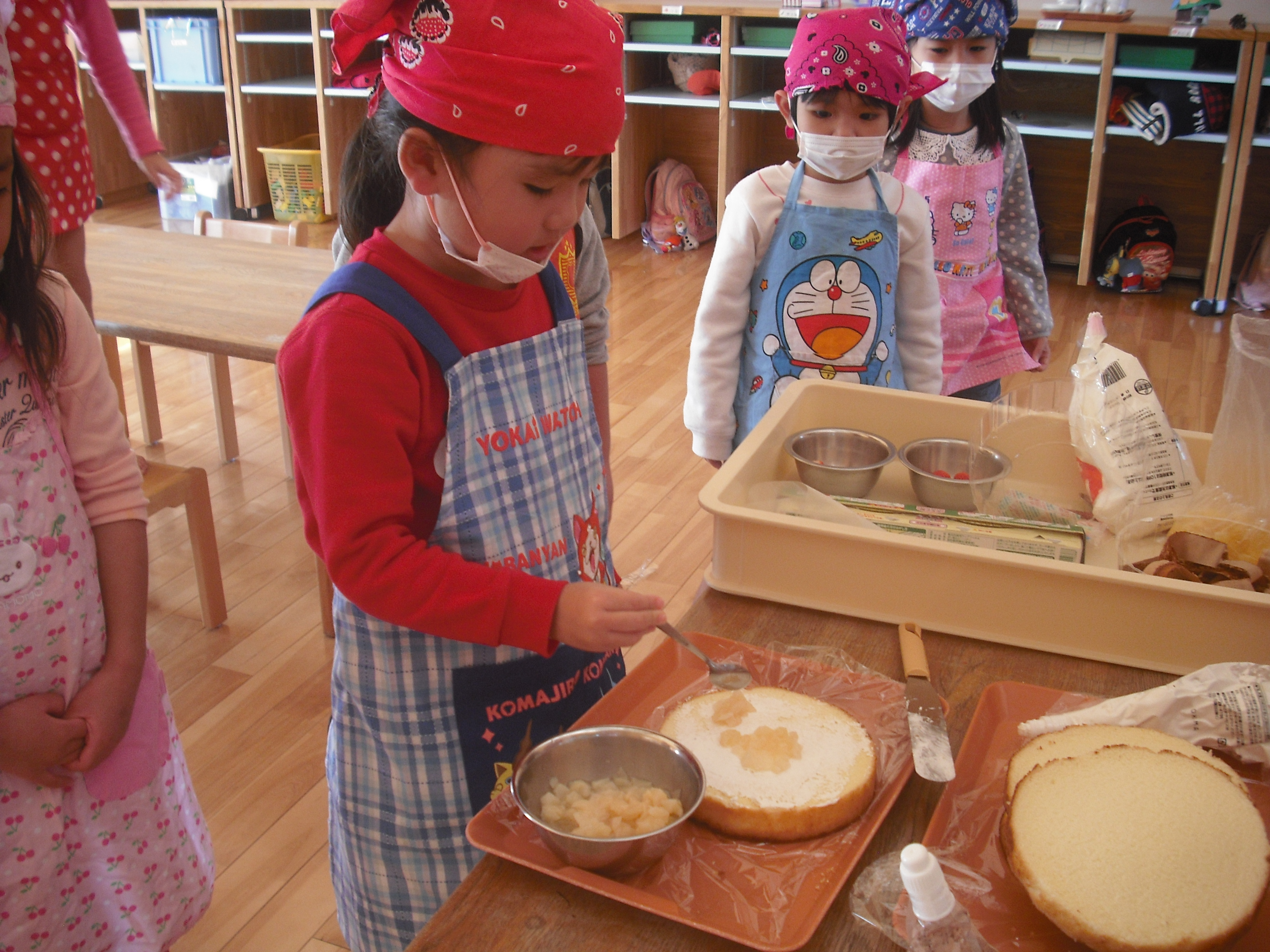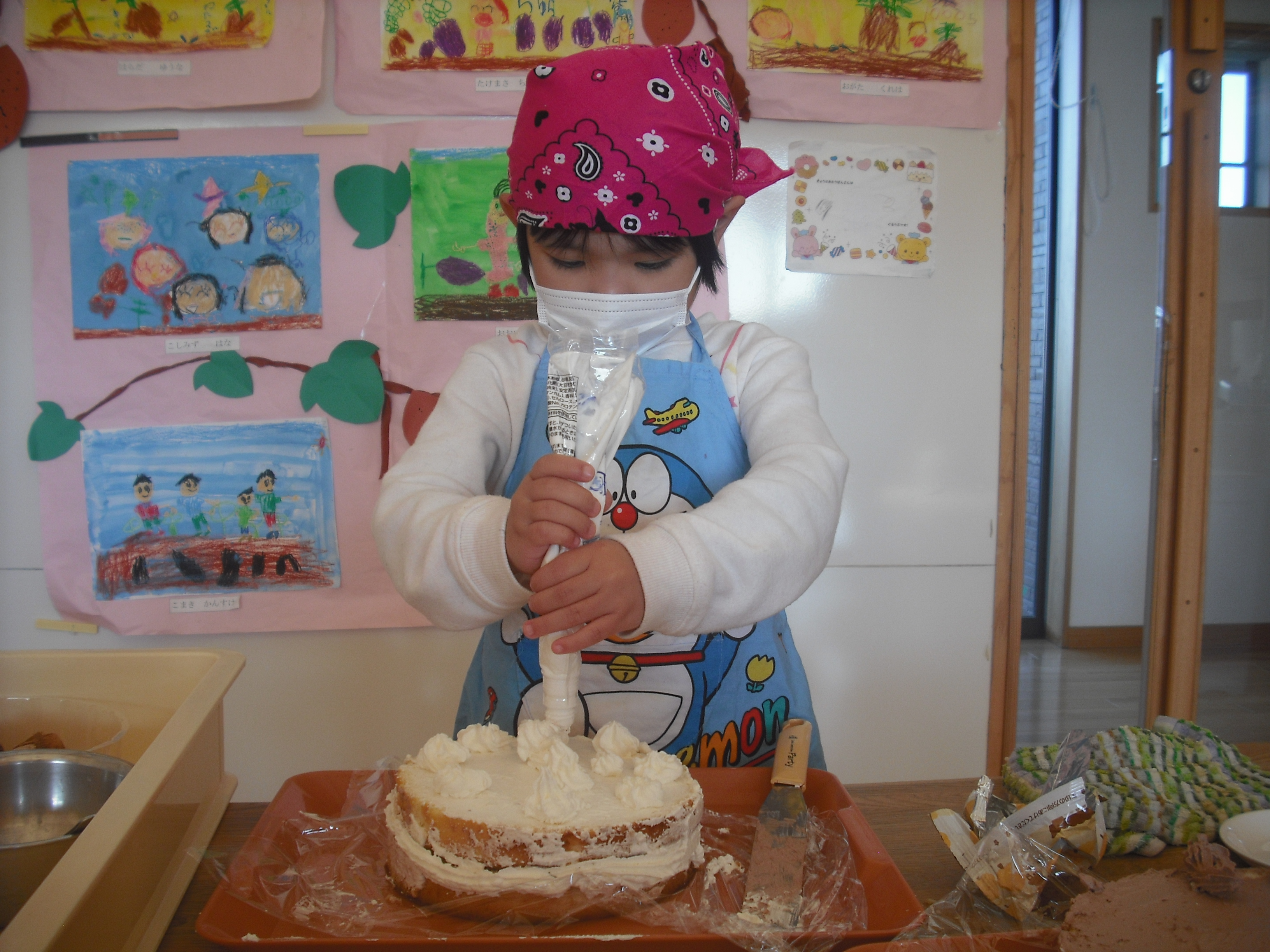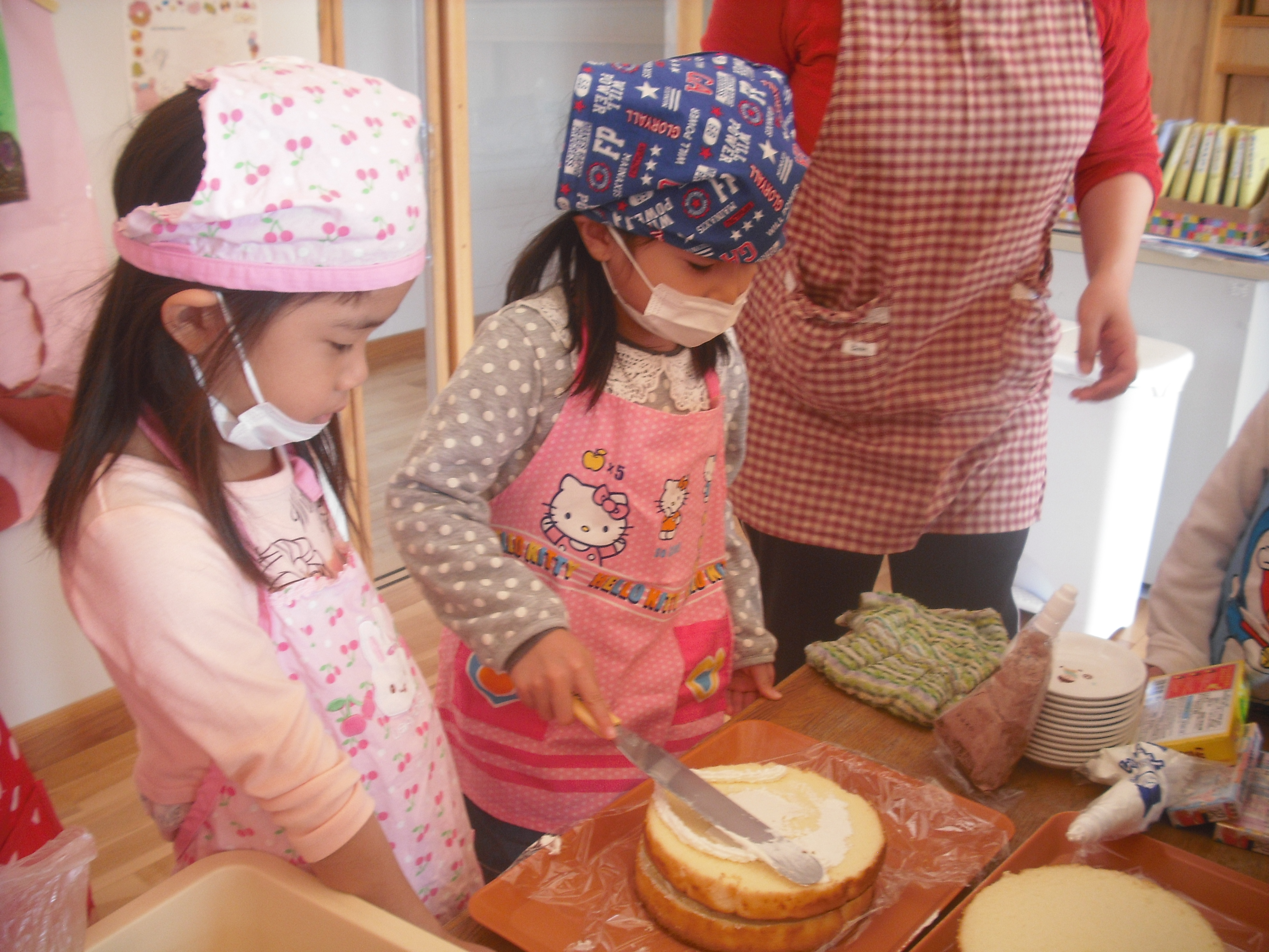 ケーキ作り 12月25日(金) きりん組さんが、『ケーキ作り』を行いました。 スポンジに生クリームとチョコクリームをぬっていきます。 間にフルーツを挟んだり、マーブルチョコやアポロをトッピング! きりん組のパティシエ達によるクリスマスケーキの完成です。