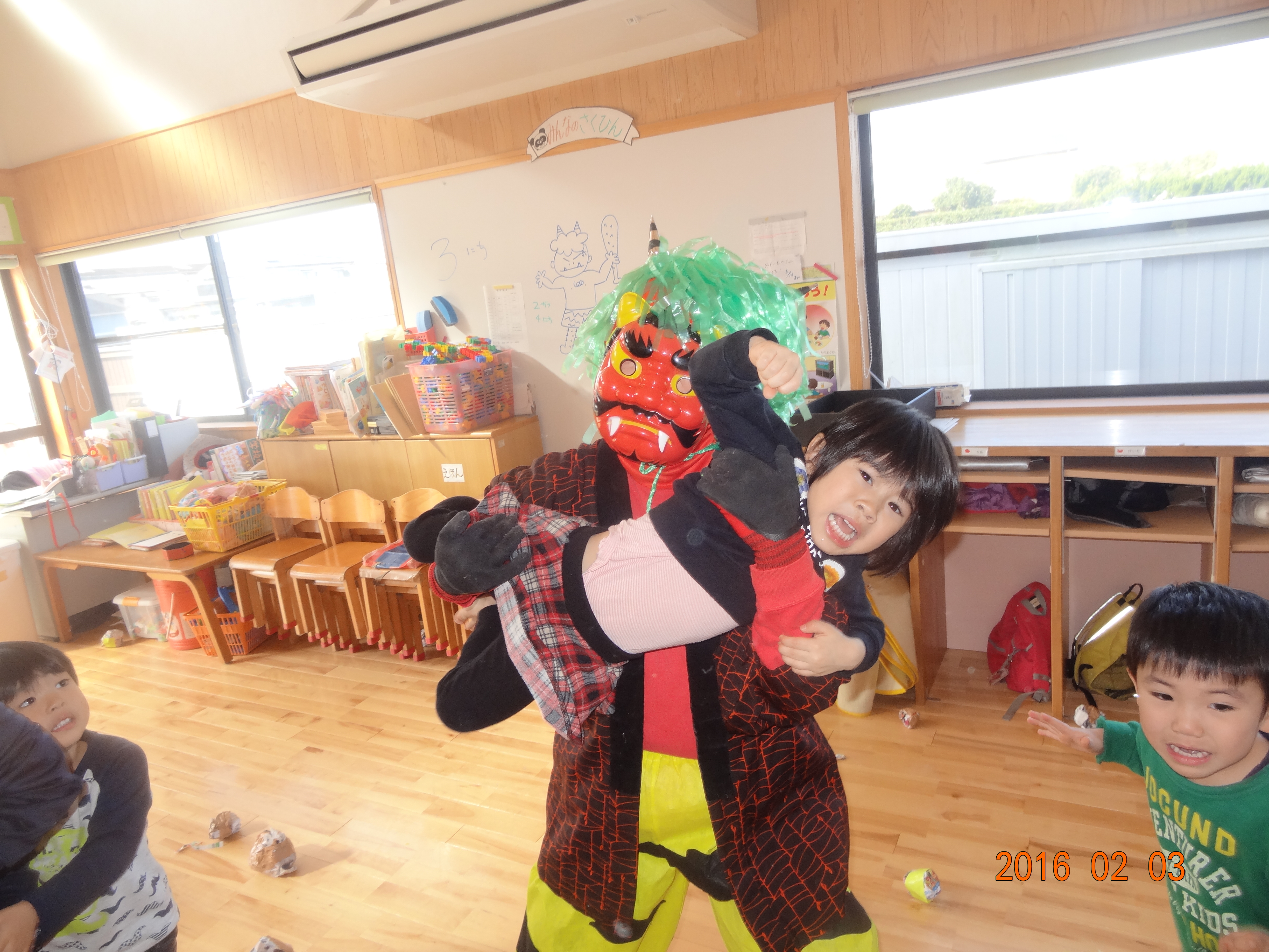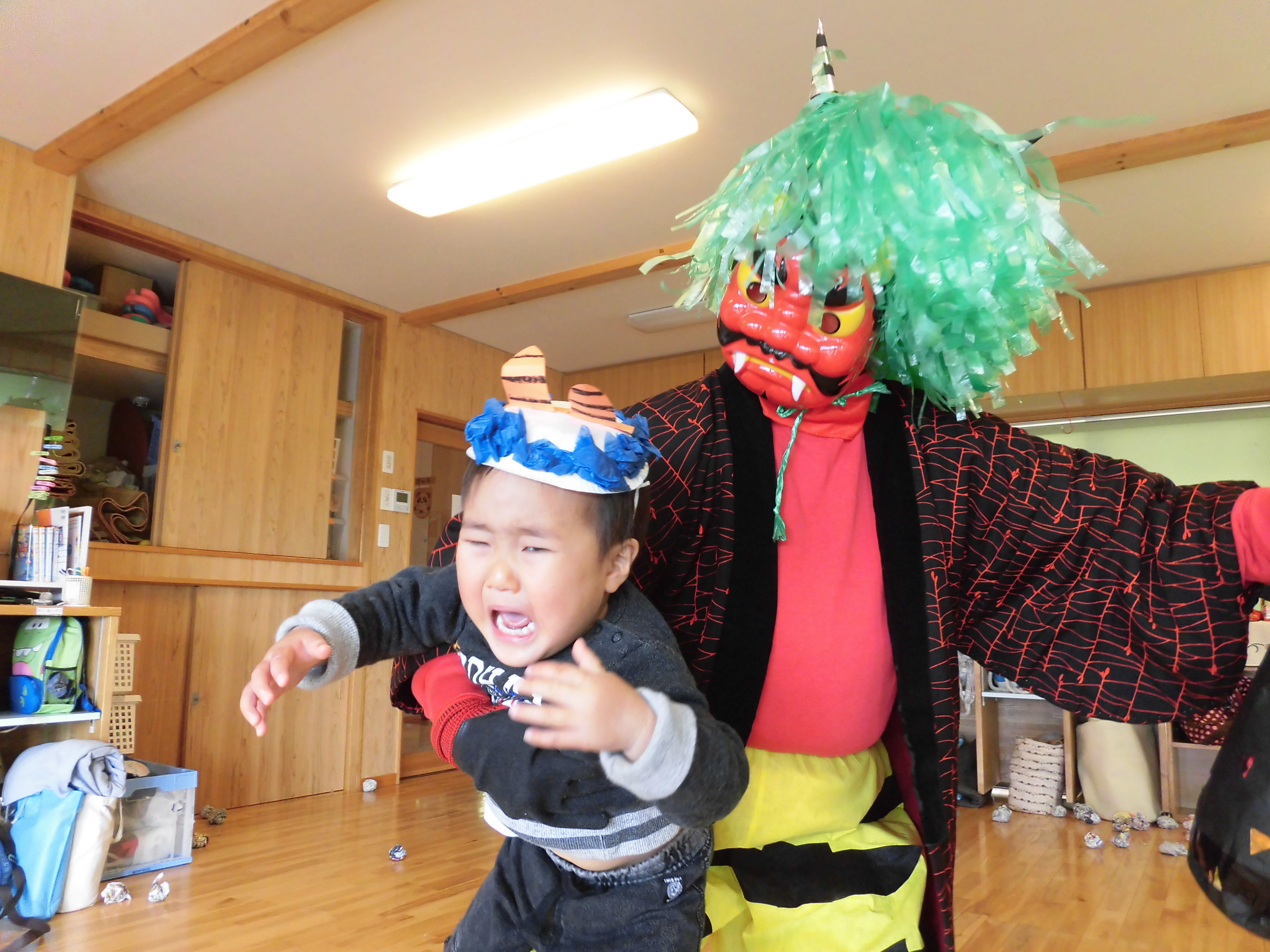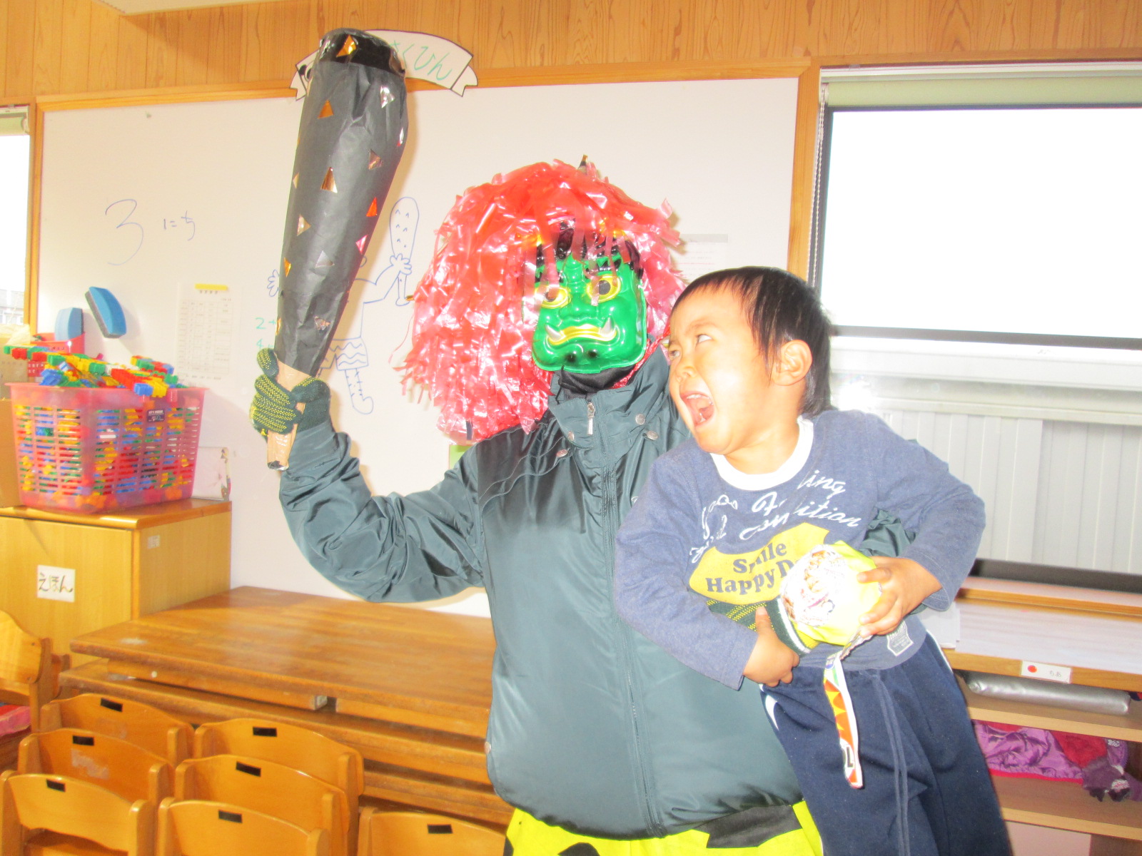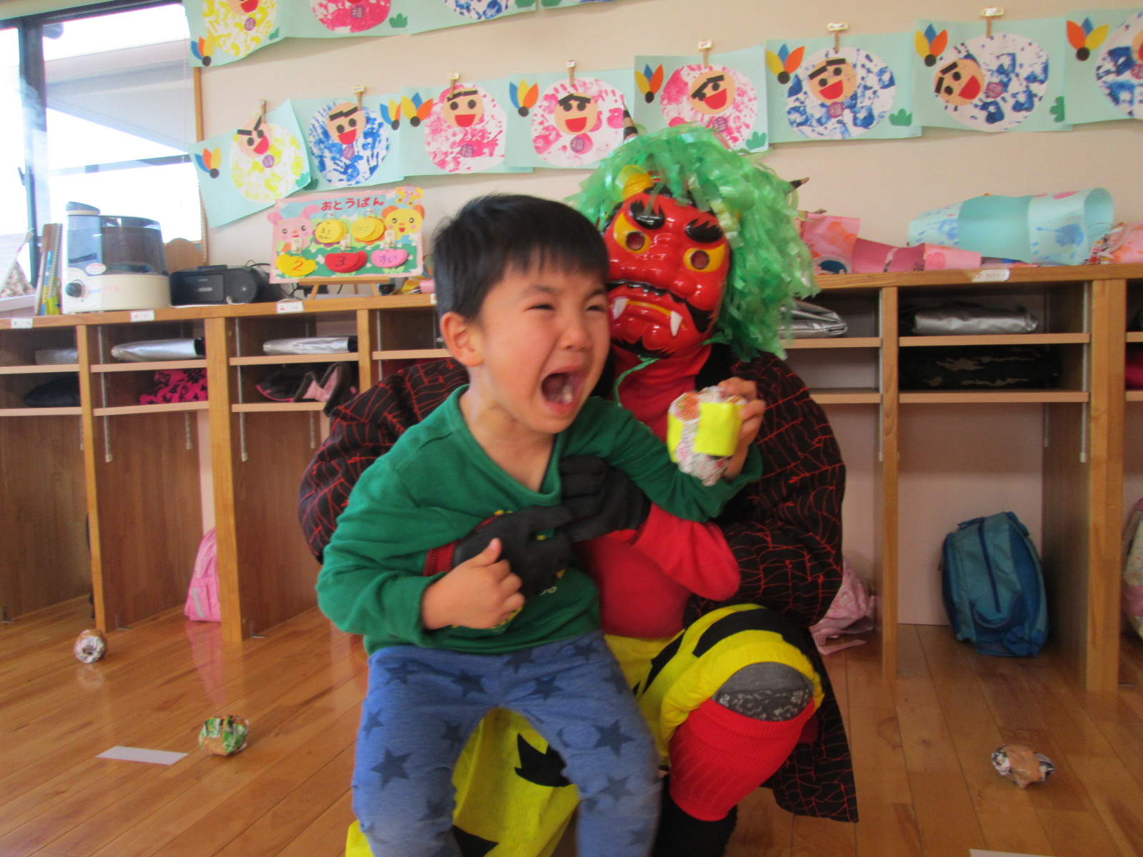 豆まき 2月3日(水) なんと今年は、赤鬼さん・青鬼さん・緑鬼さんがやってきた~! 鬼の勢いに圧倒され、豆を投げることができず逃げ回る子ども達・・・次々とつかまってしまい大泣きです。 鬼さん達は一緒に遊びたかったみたいですね~。握手をしたり一緒に太鼓を叩いたり、最後は園庭の遊具で遊んで帰っていきました。