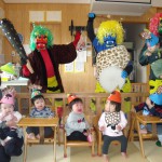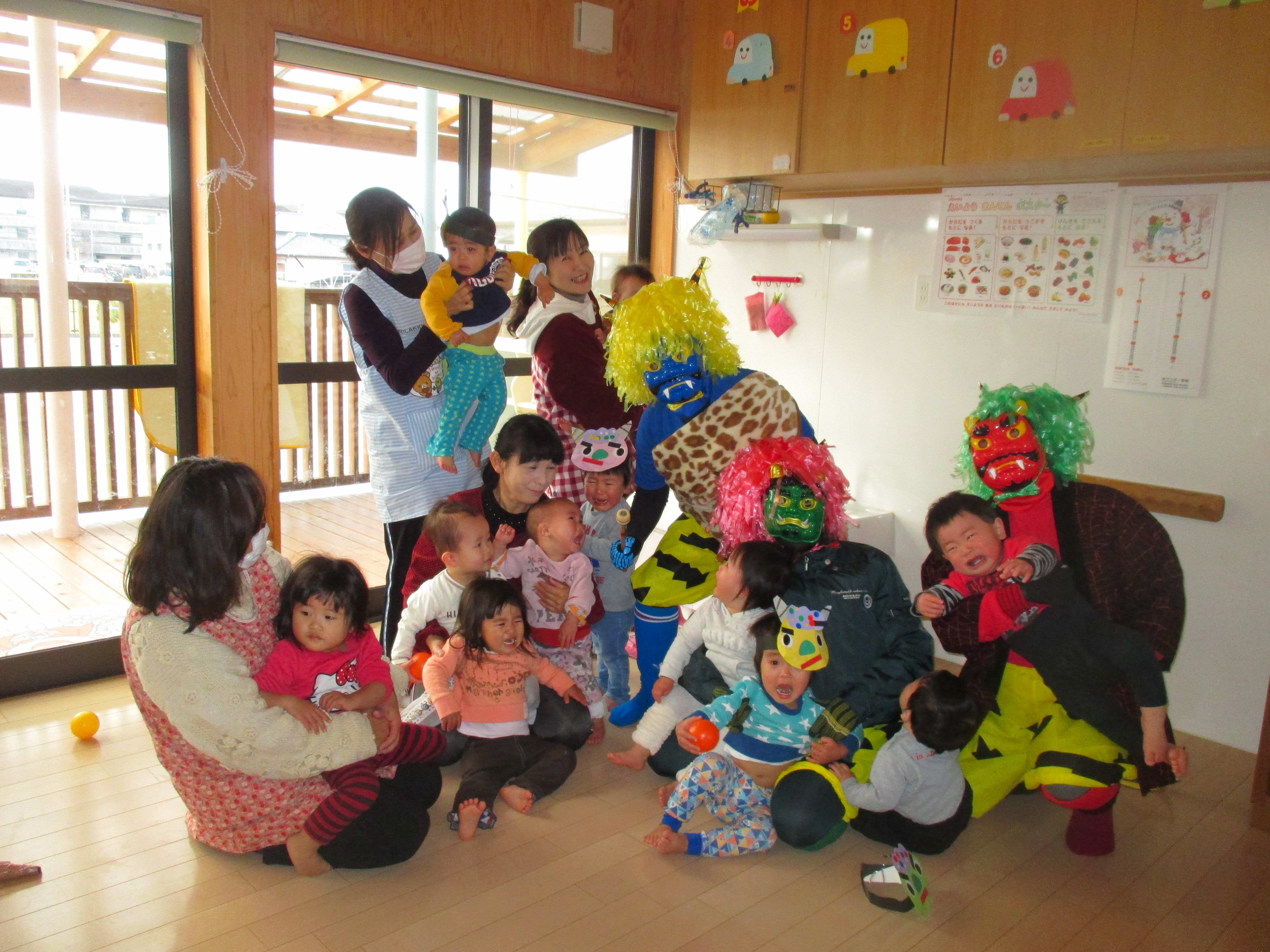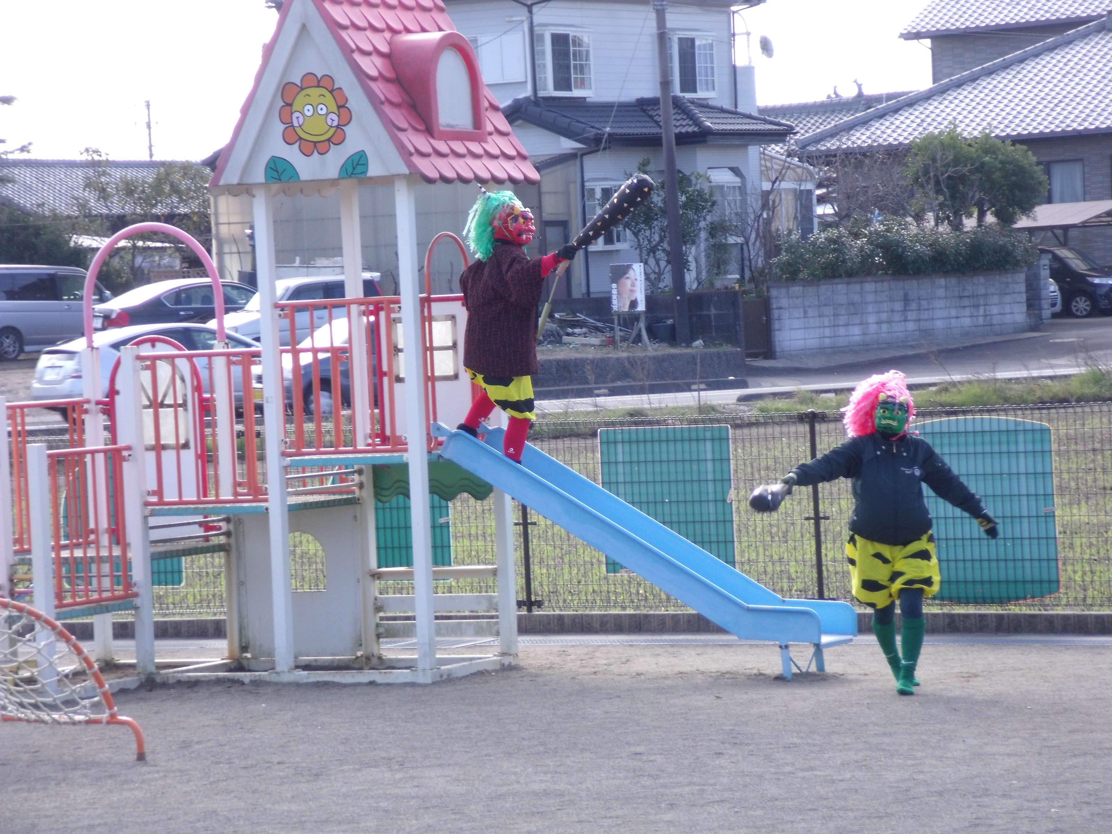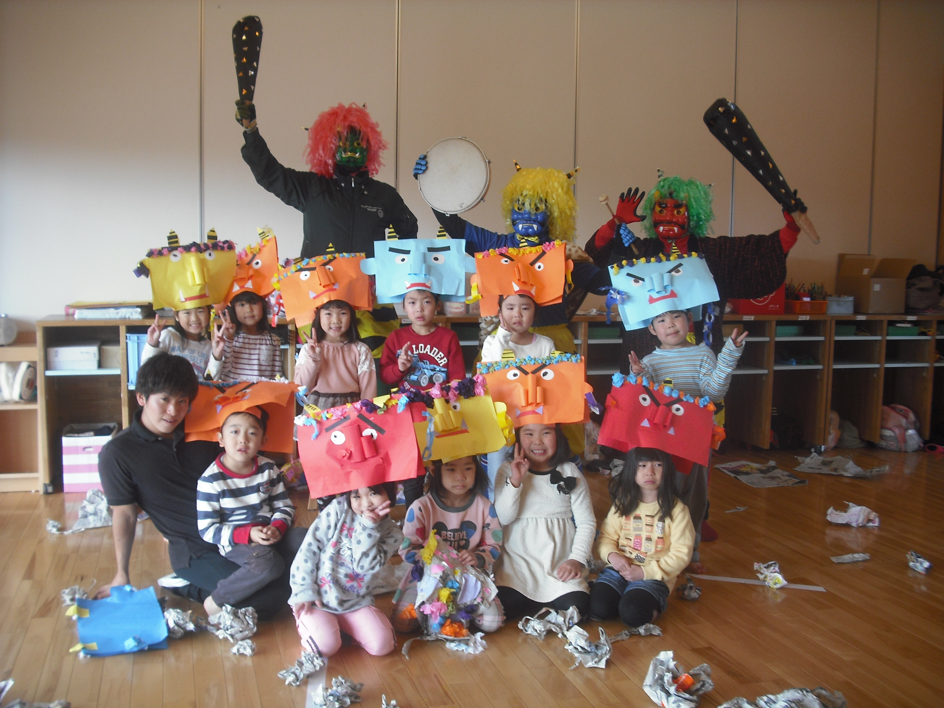 豆まき 2月3日(水) なんと今年は、赤鬼さん・青鬼さん・緑鬼さんがやってきた~! 鬼の勢いに圧倒され、豆を投げることができず逃げ回る子ども達・・・次々とつかまってしまい大泣きです。 鬼さん達は一緒に遊びたかったみたいですね~。握手をしたり一緒に太鼓を叩いたり、最後は園庭の遊具で遊んで帰っていきました。