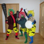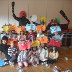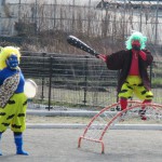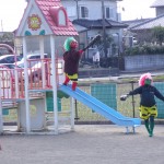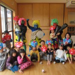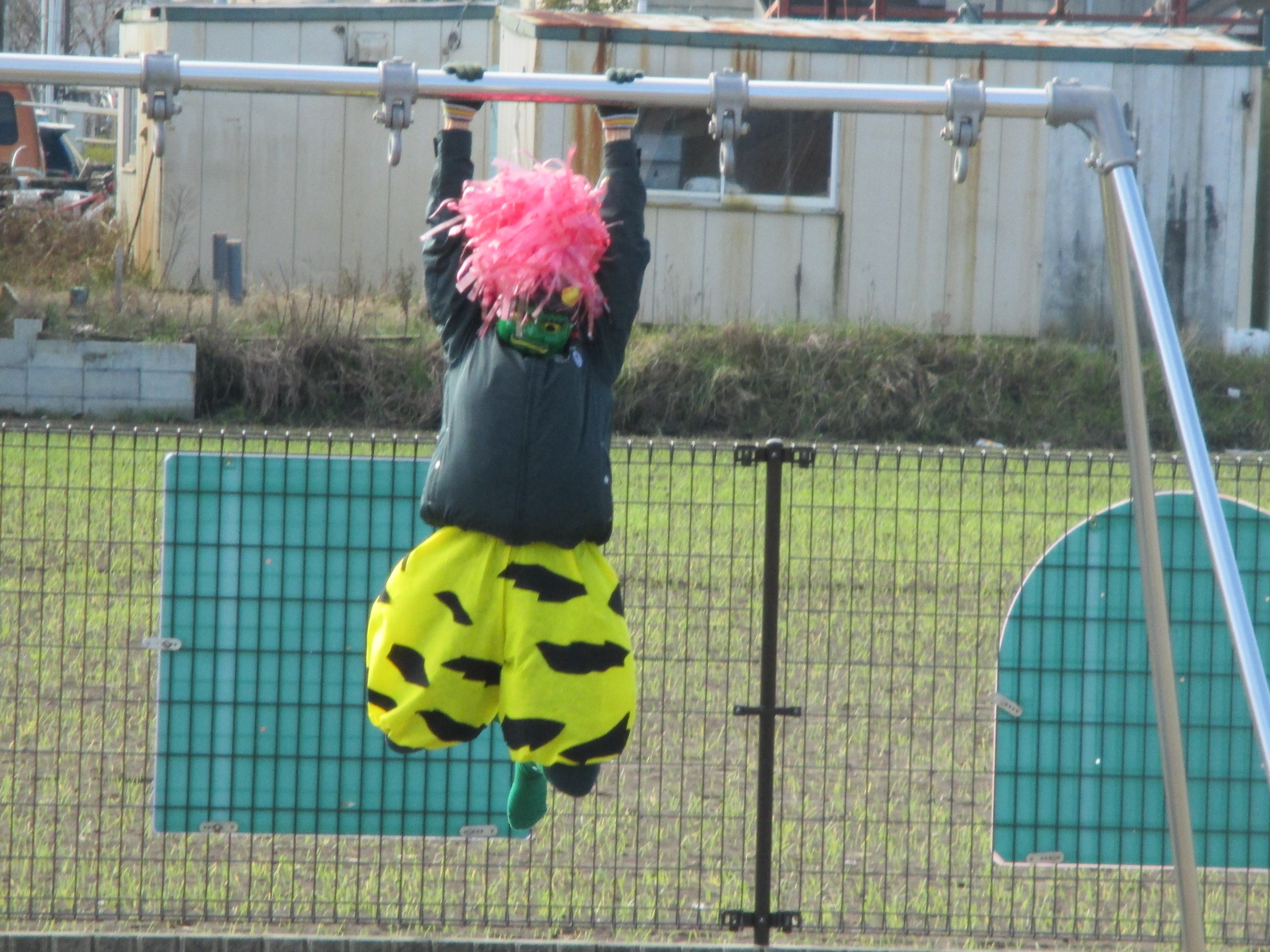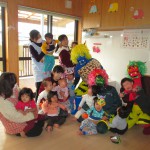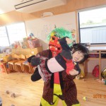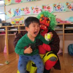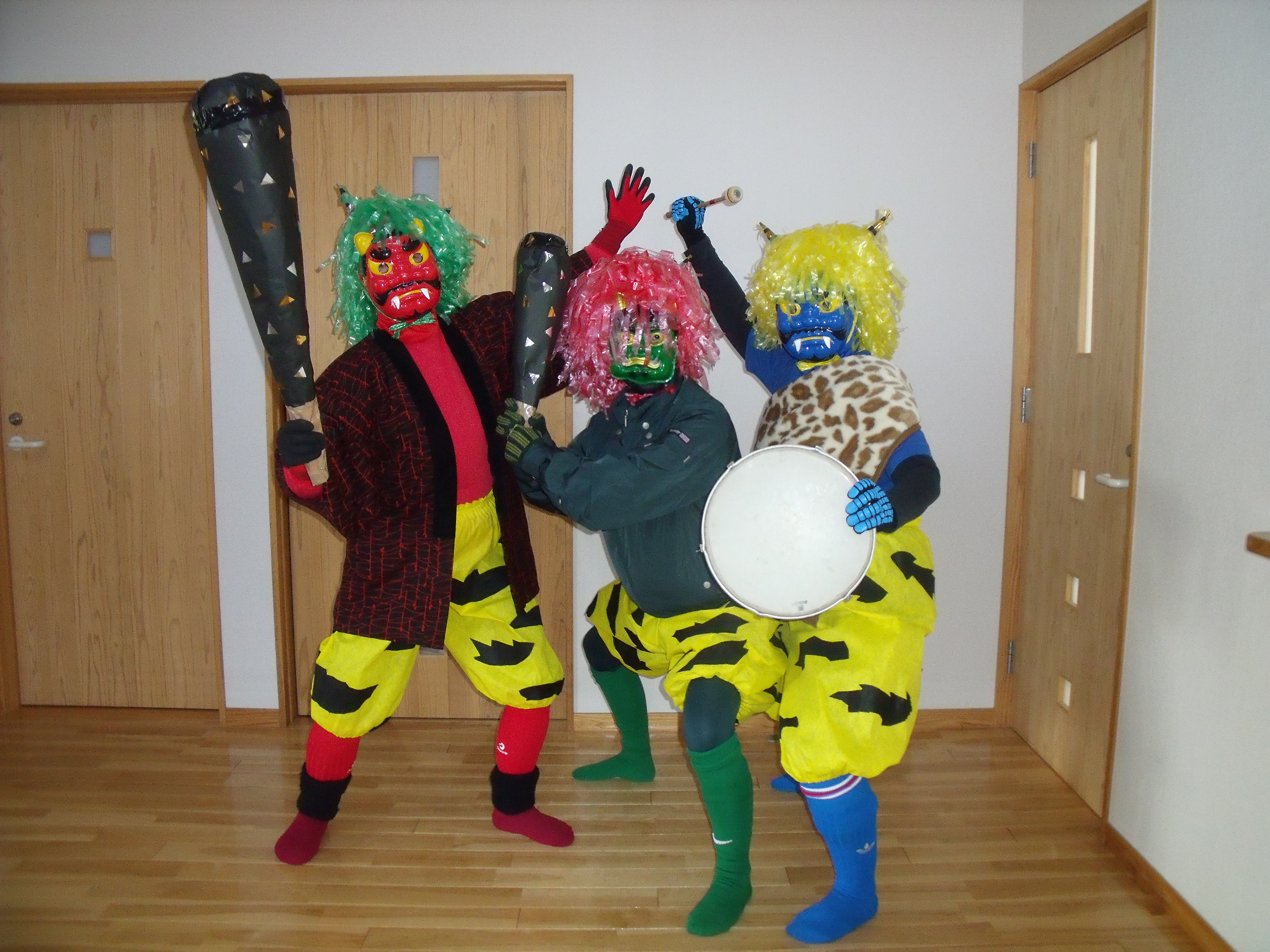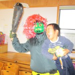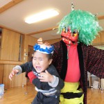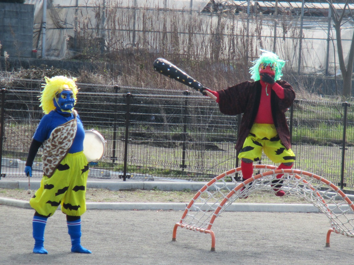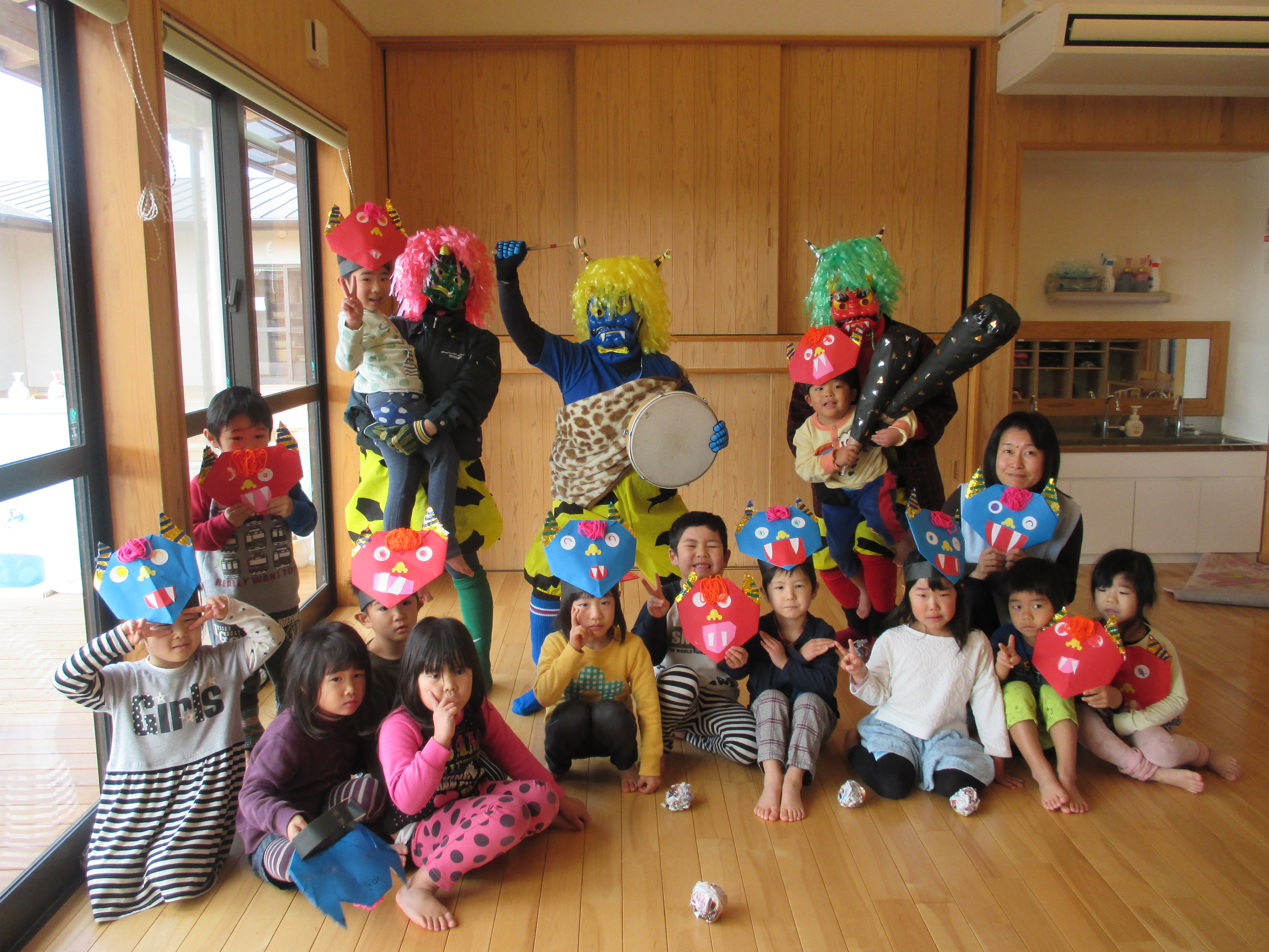 豆まき 2月3日(水) なんと今年は、赤鬼さん・青鬼さん・緑鬼さんがやってきた~! 鬼の勢いに圧倒され、豆を投げることができず逃げ回る子ども達・・・次々とつかまってしまい大泣きです。 鬼さん達は一緒に遊びたかったみたいですね~。握手をしたり一緒に太鼓を叩いたり、最後は園庭の遊具で遊んで帰っていきました。