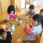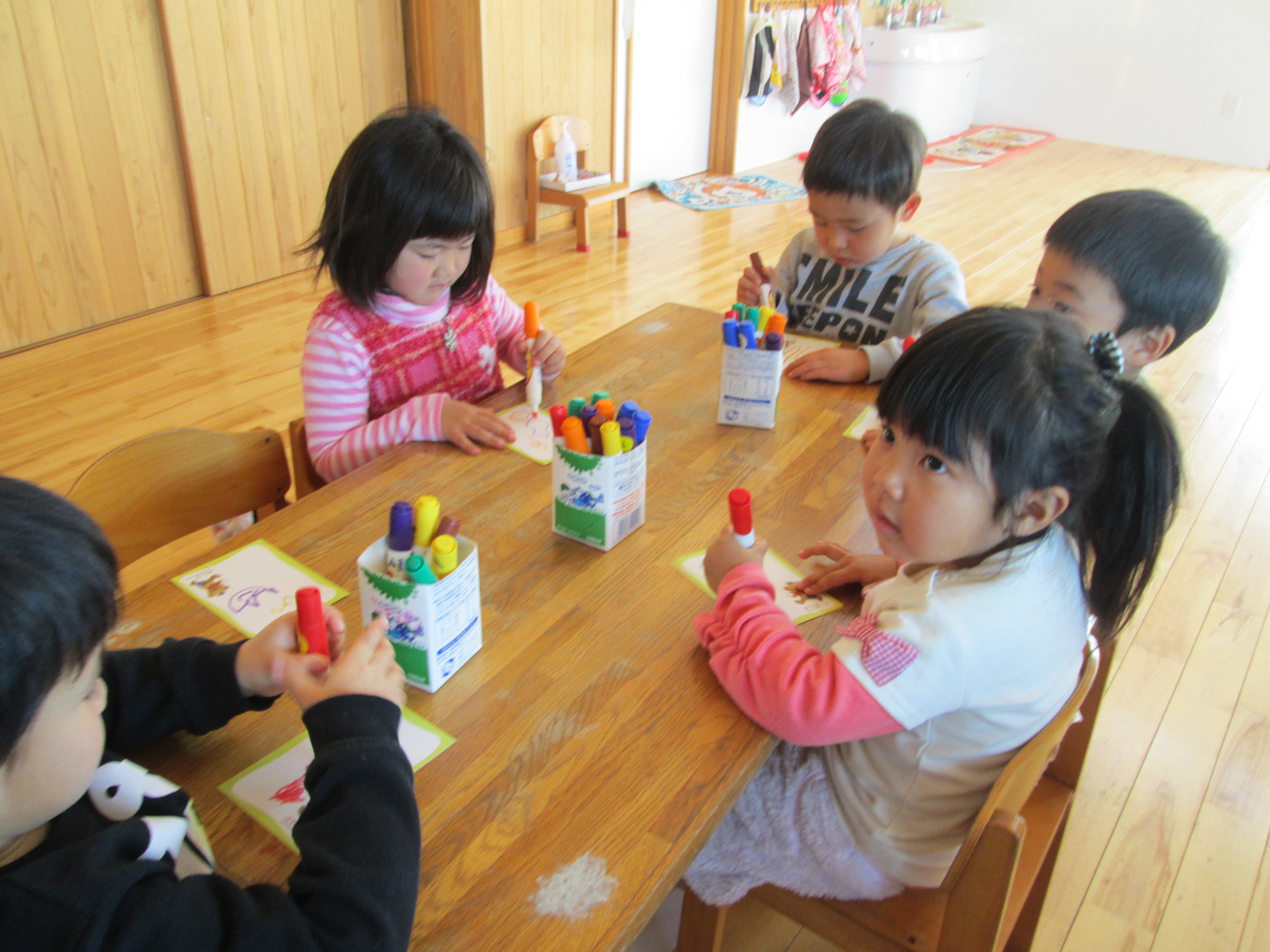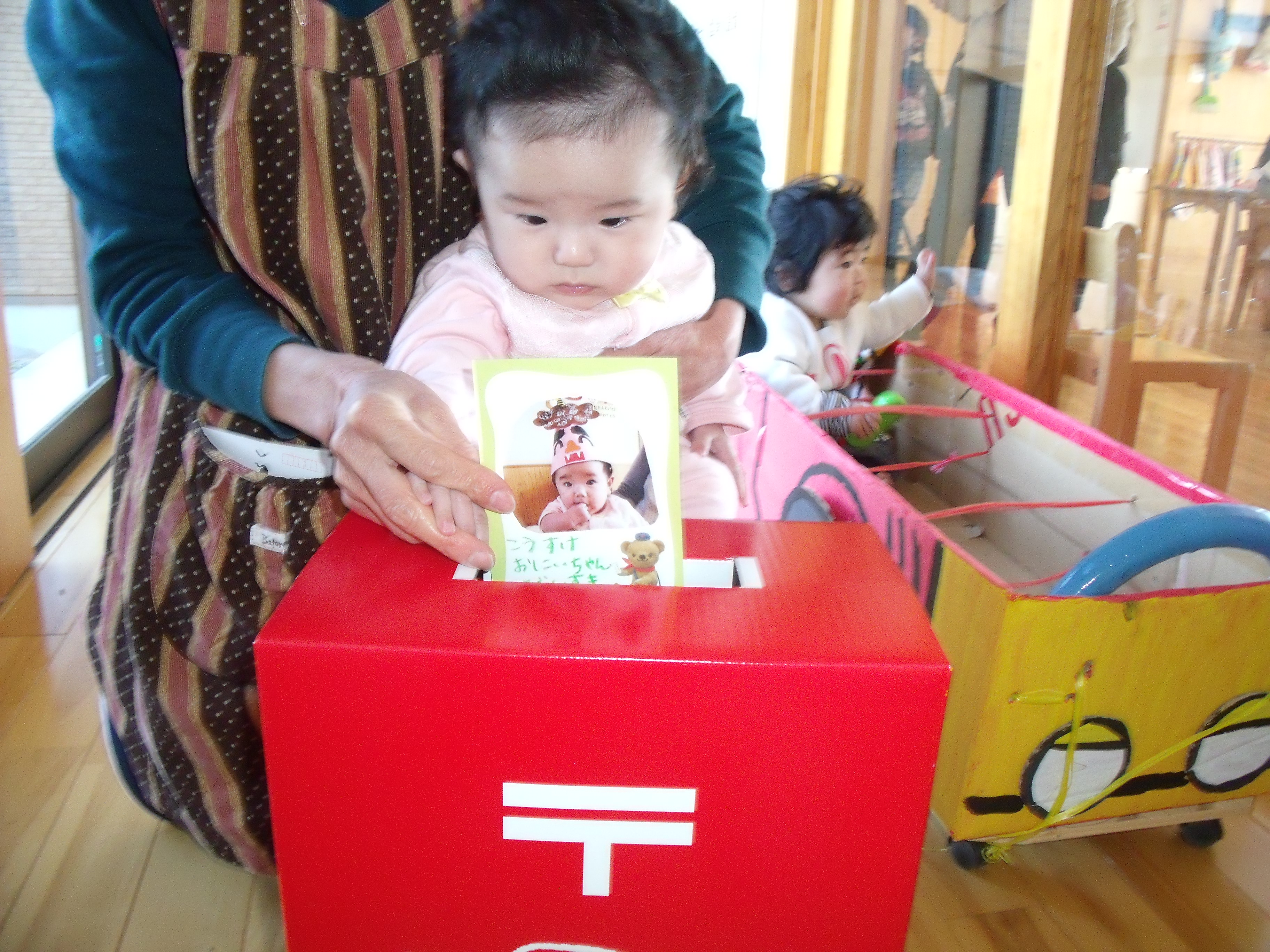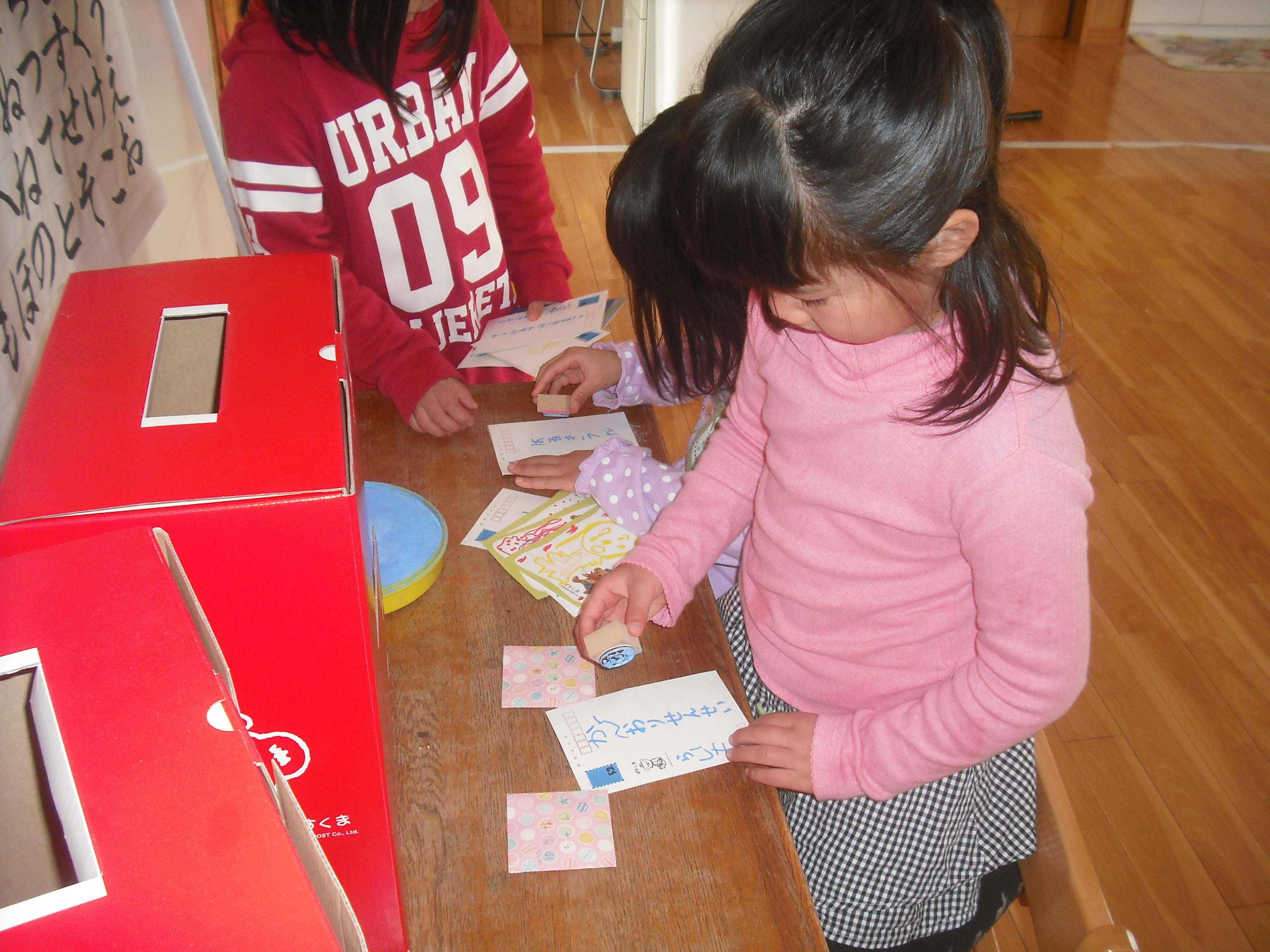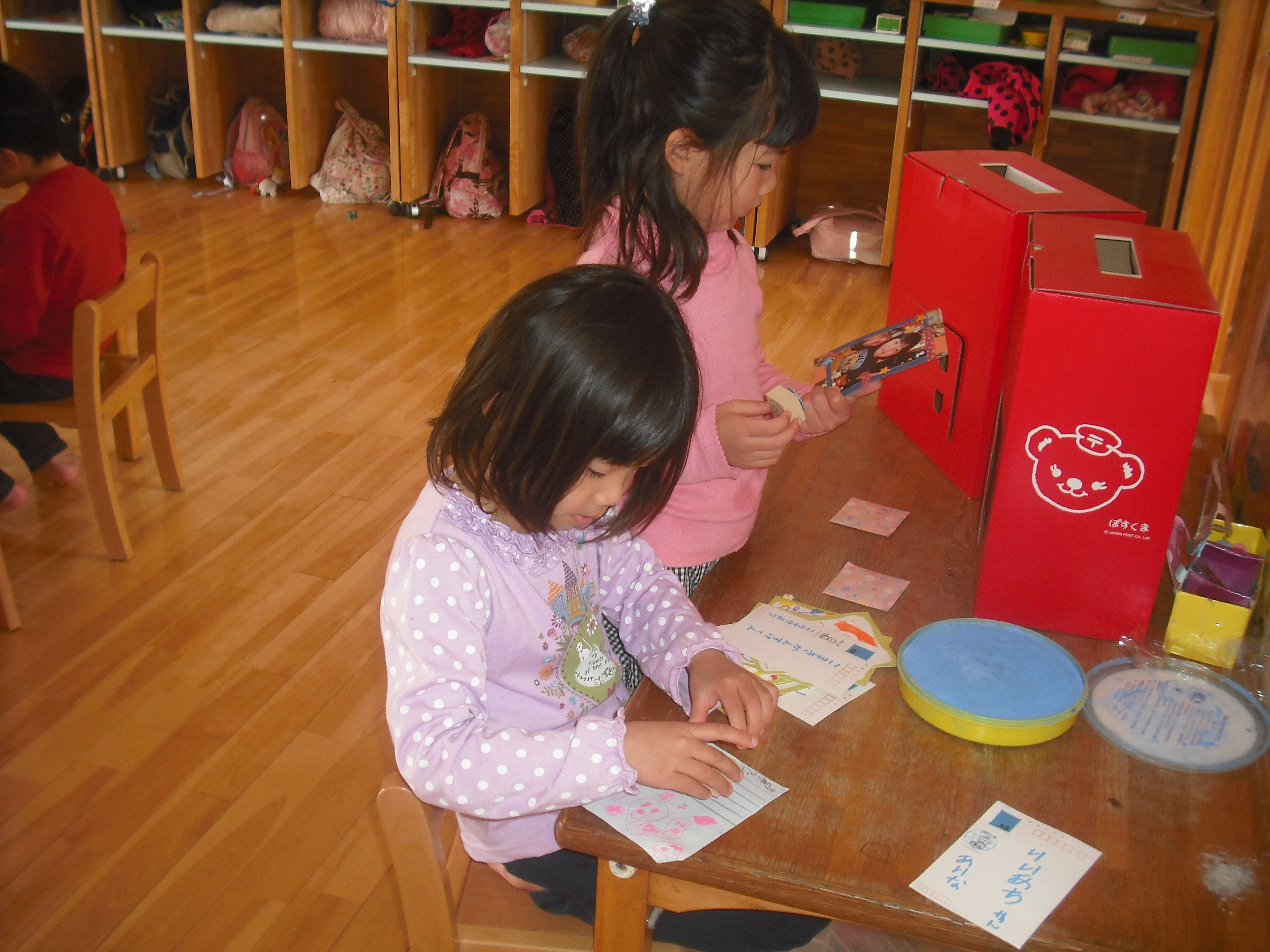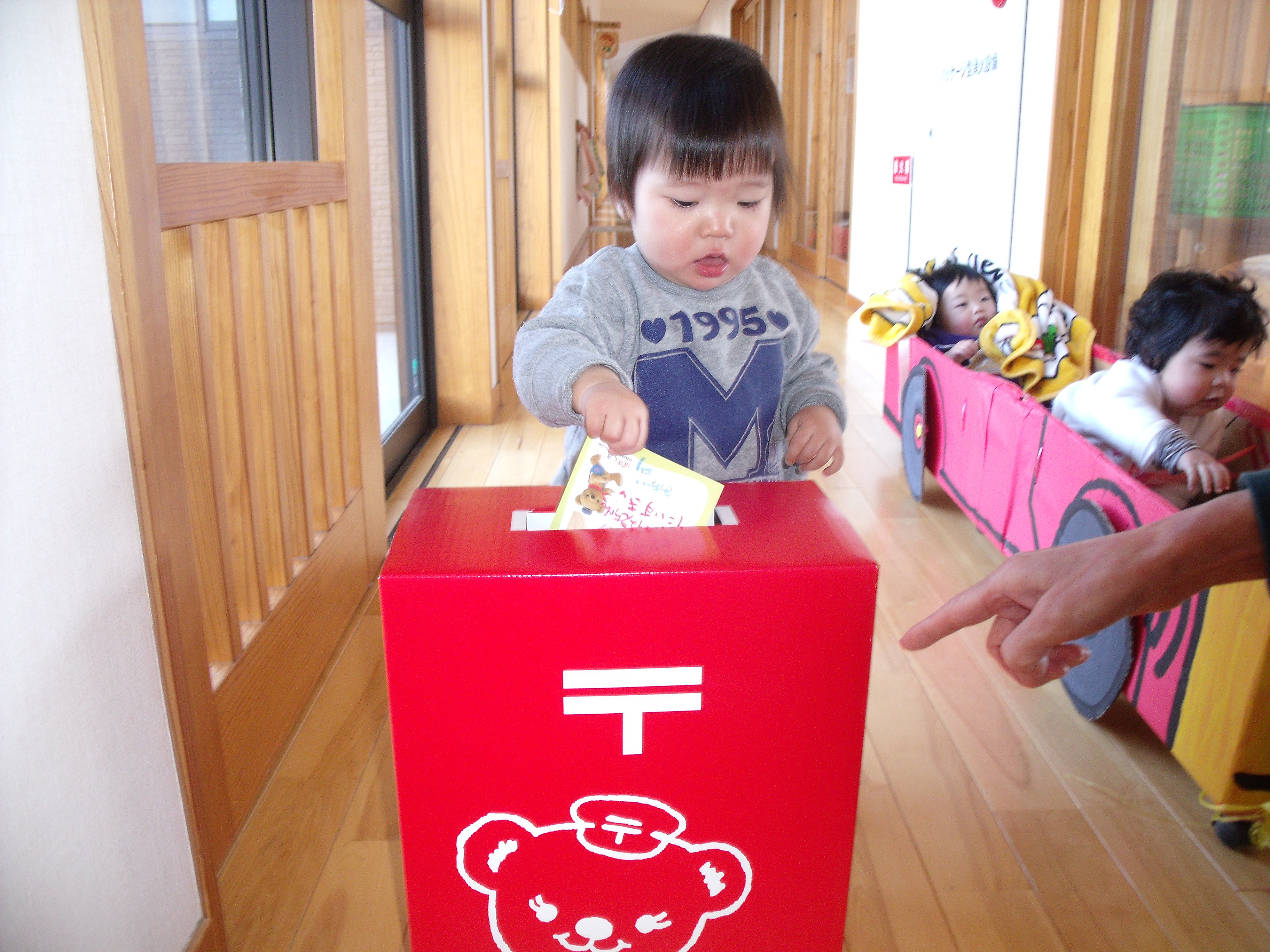 ぽすくま 2月8日(月) 日本郵便株式会社様より、『ぽすくまのお手紙ごっこ遊び』支援キットをいただきました。 各クラスで、お友達や先生に手紙を書いてポストに投函します。 手紙の収集と配達は、年長さんのお仕事です。 切手に消印スタンプを押して、『郵便で~す♪』と届けてくれましたよ。