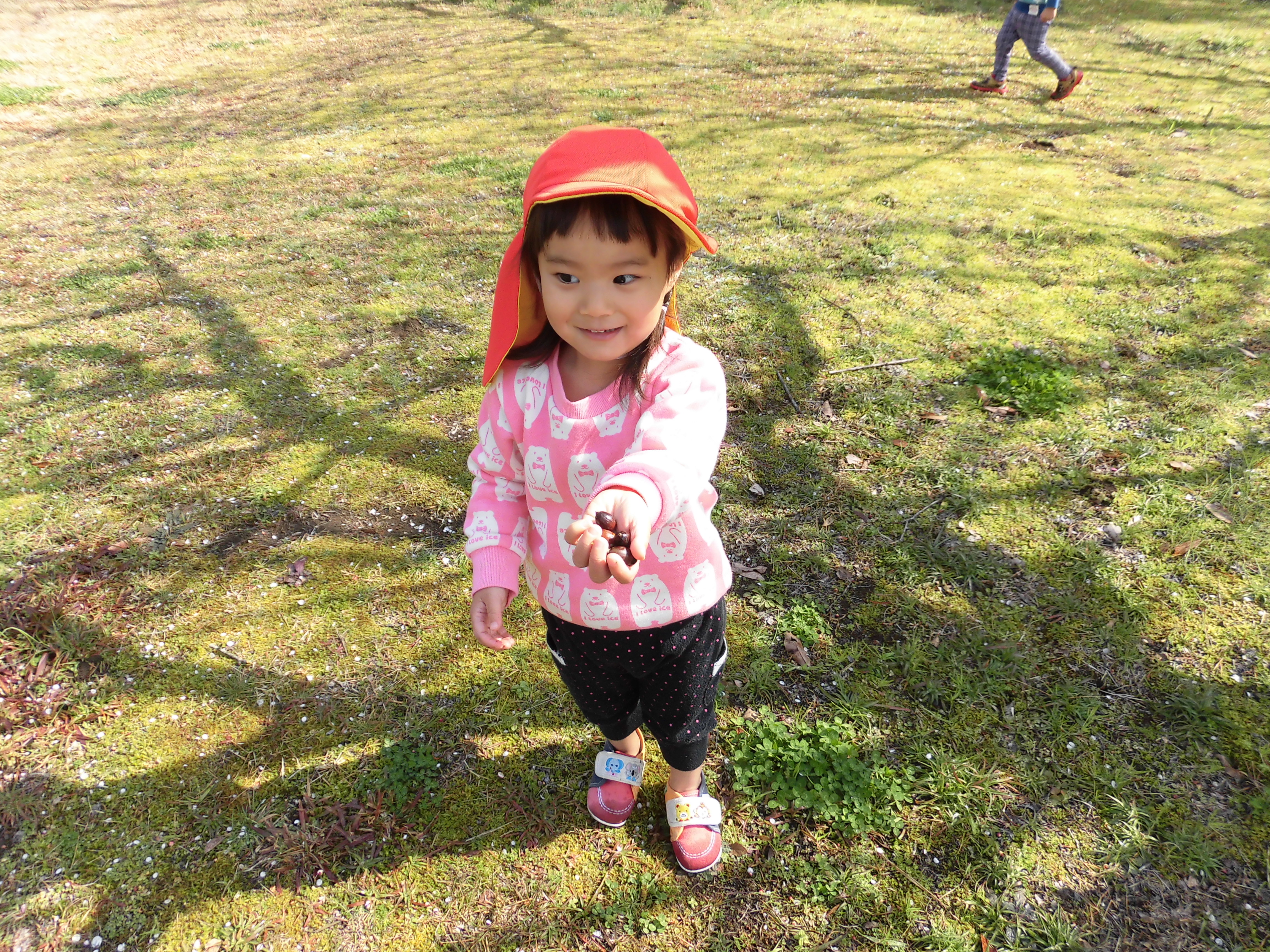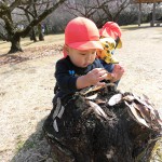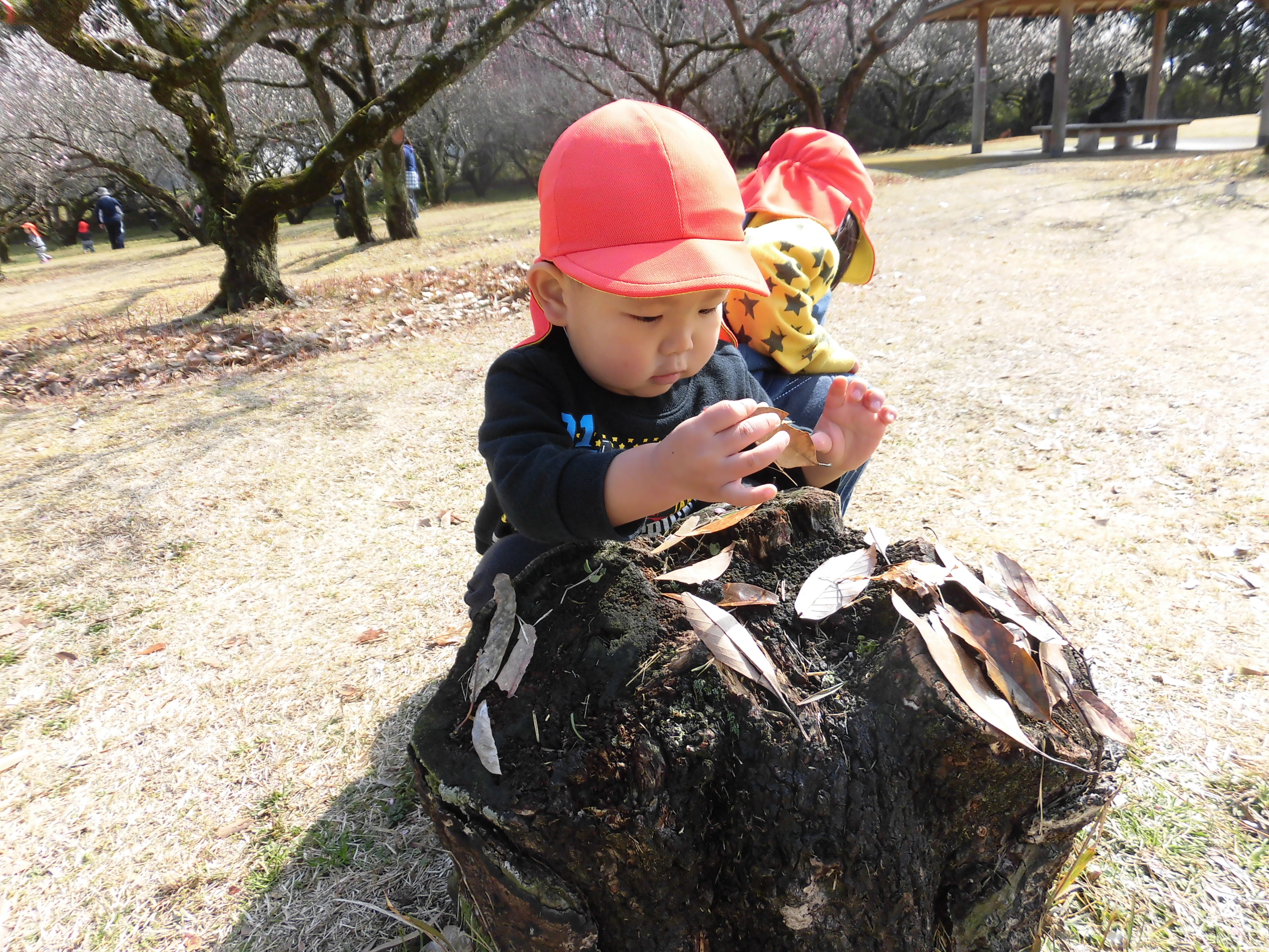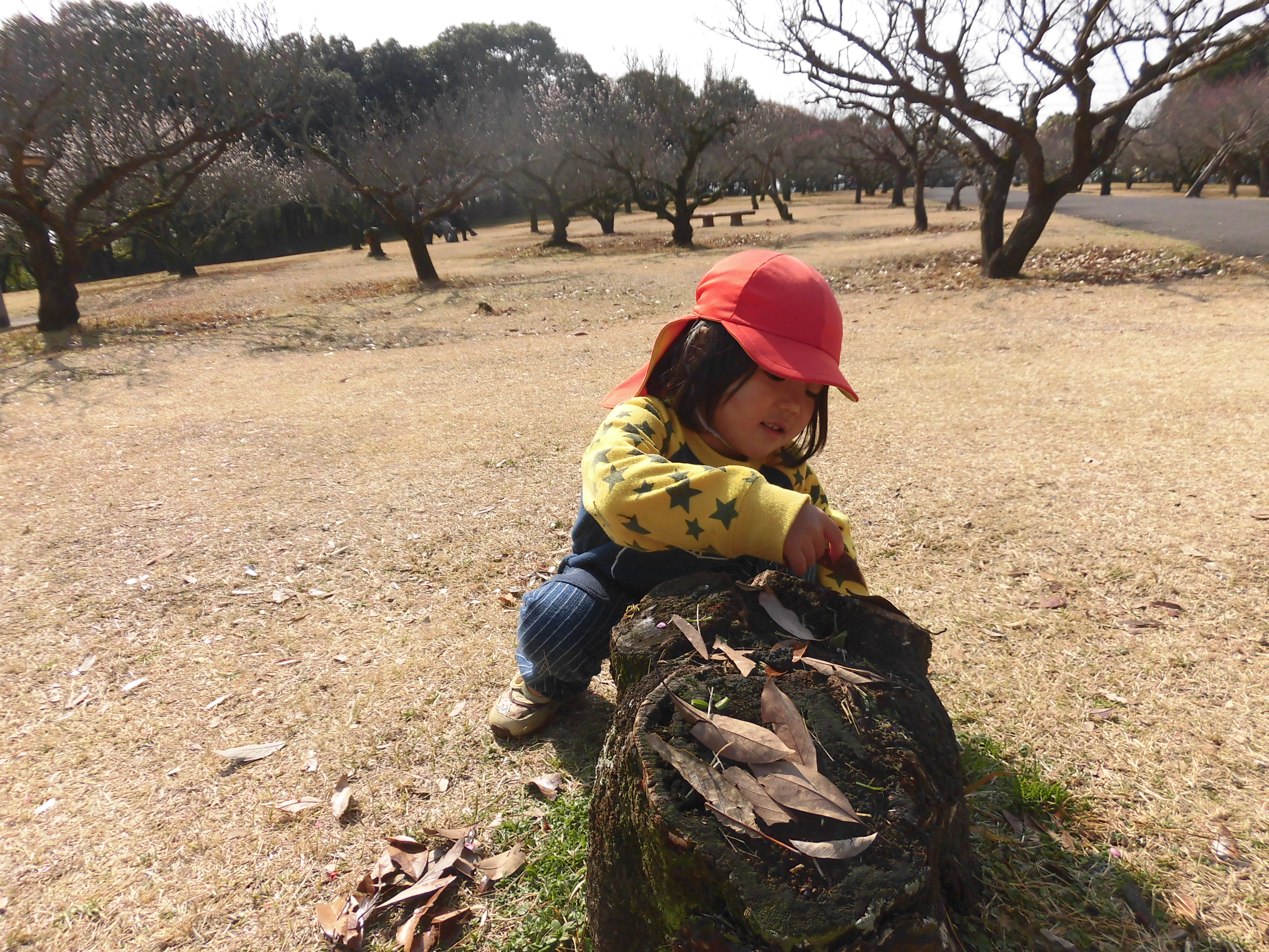 散歩 2月24日(水) うさぎ組さんは、市民の森に散歩に行きました。 切り株を見つけた子ども達、落ち葉を並べて『焼肉ですよ~♪』と、ままごと遊びが始まりました。 どんぐりを見つけたり、木の枝を拾ったり・・・自然物を使って楽しく遊びました。